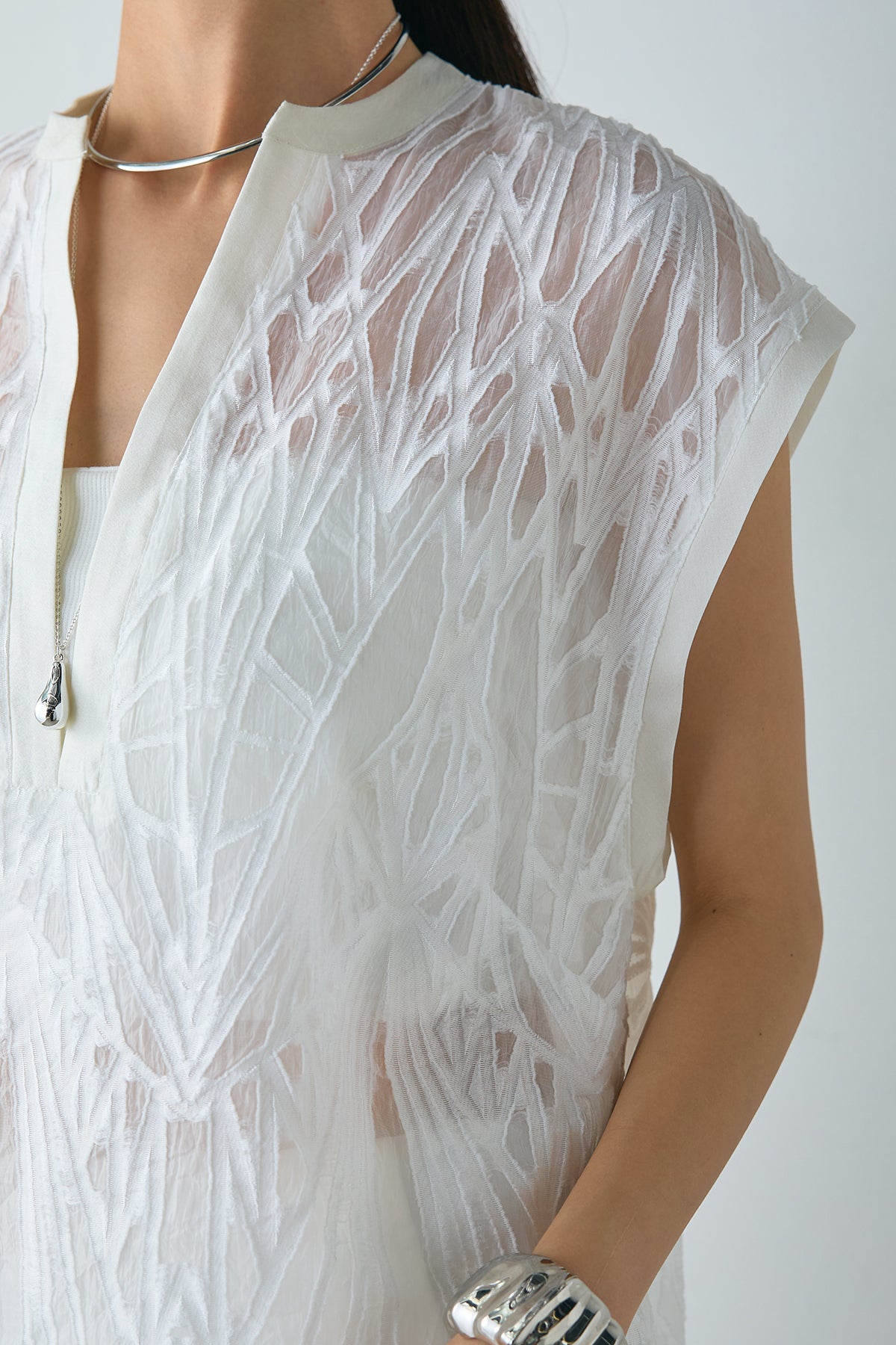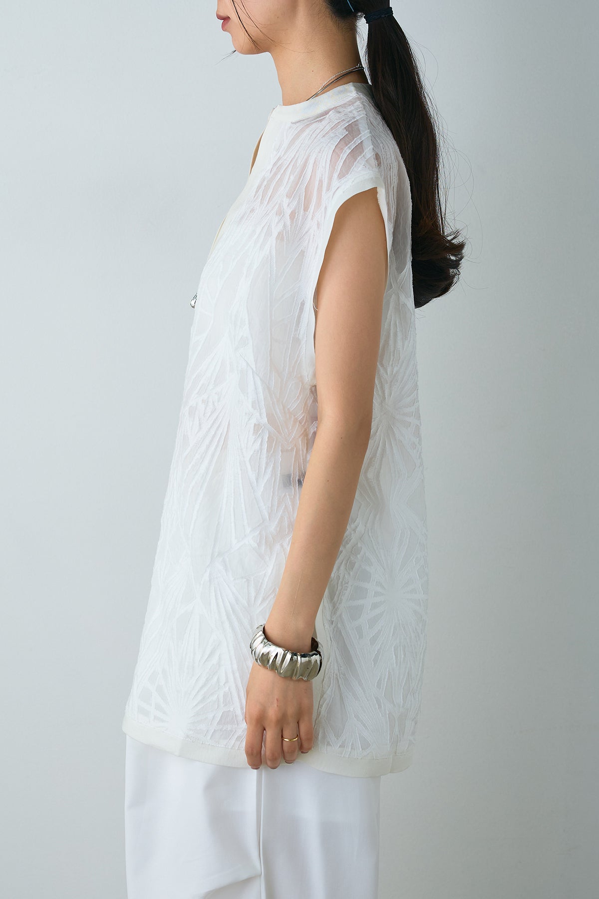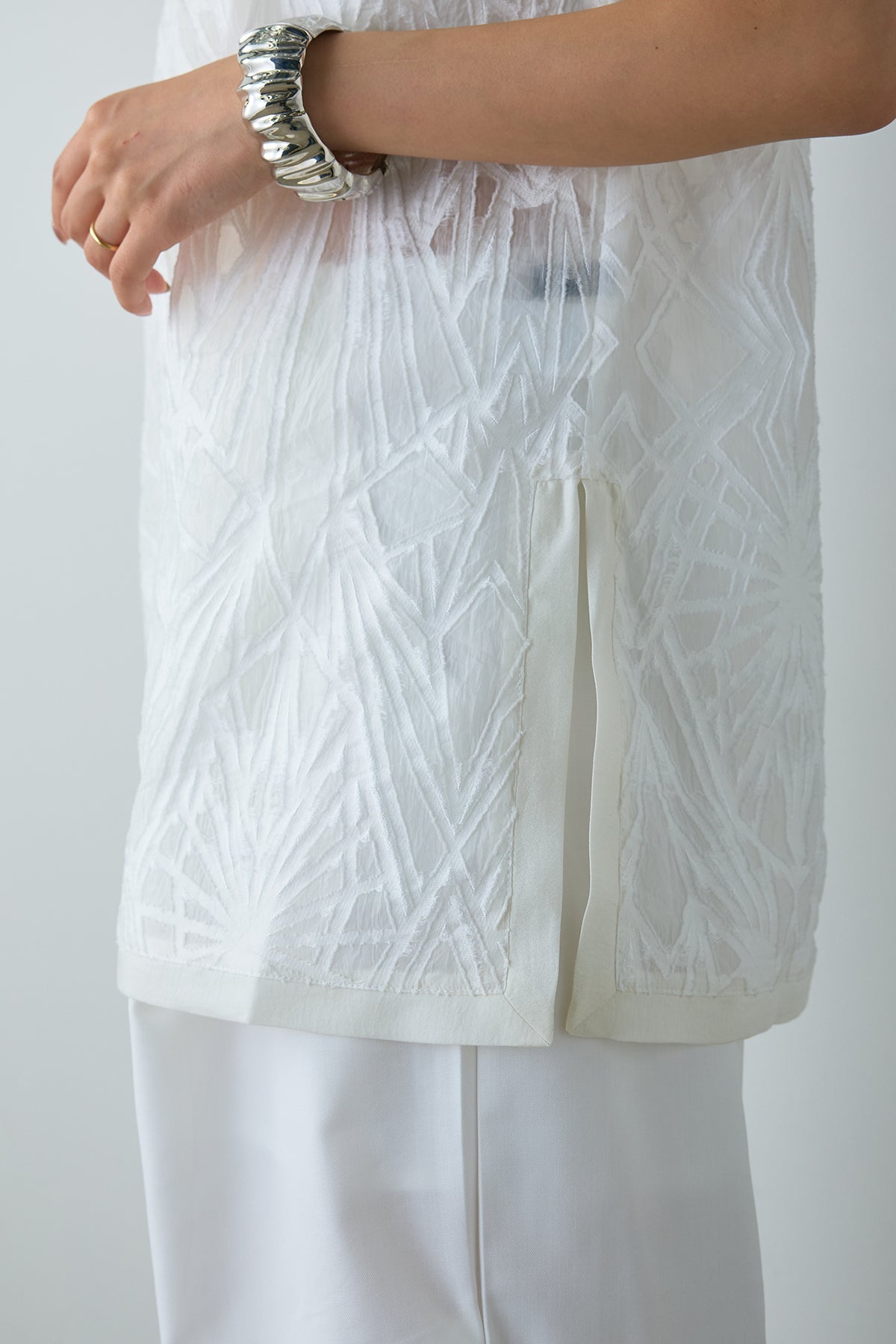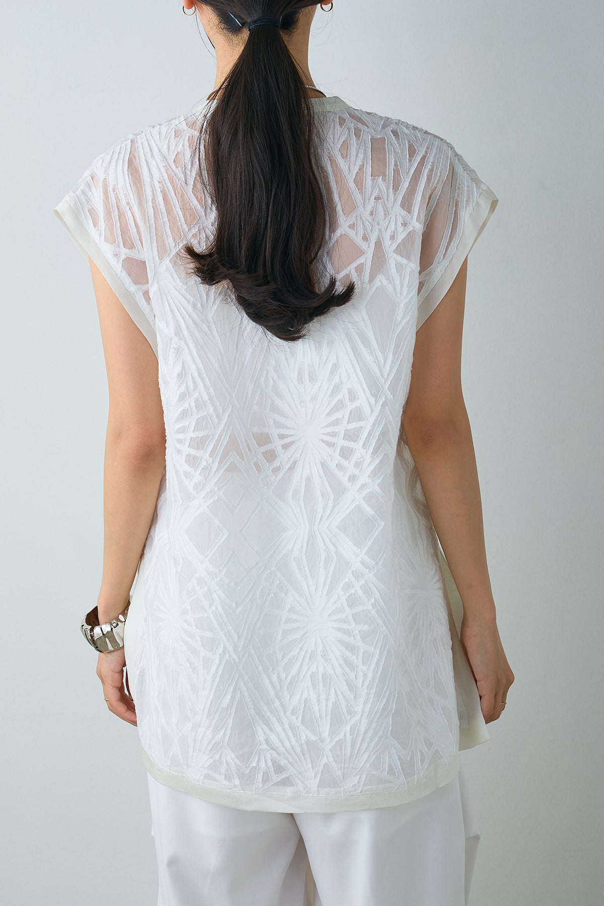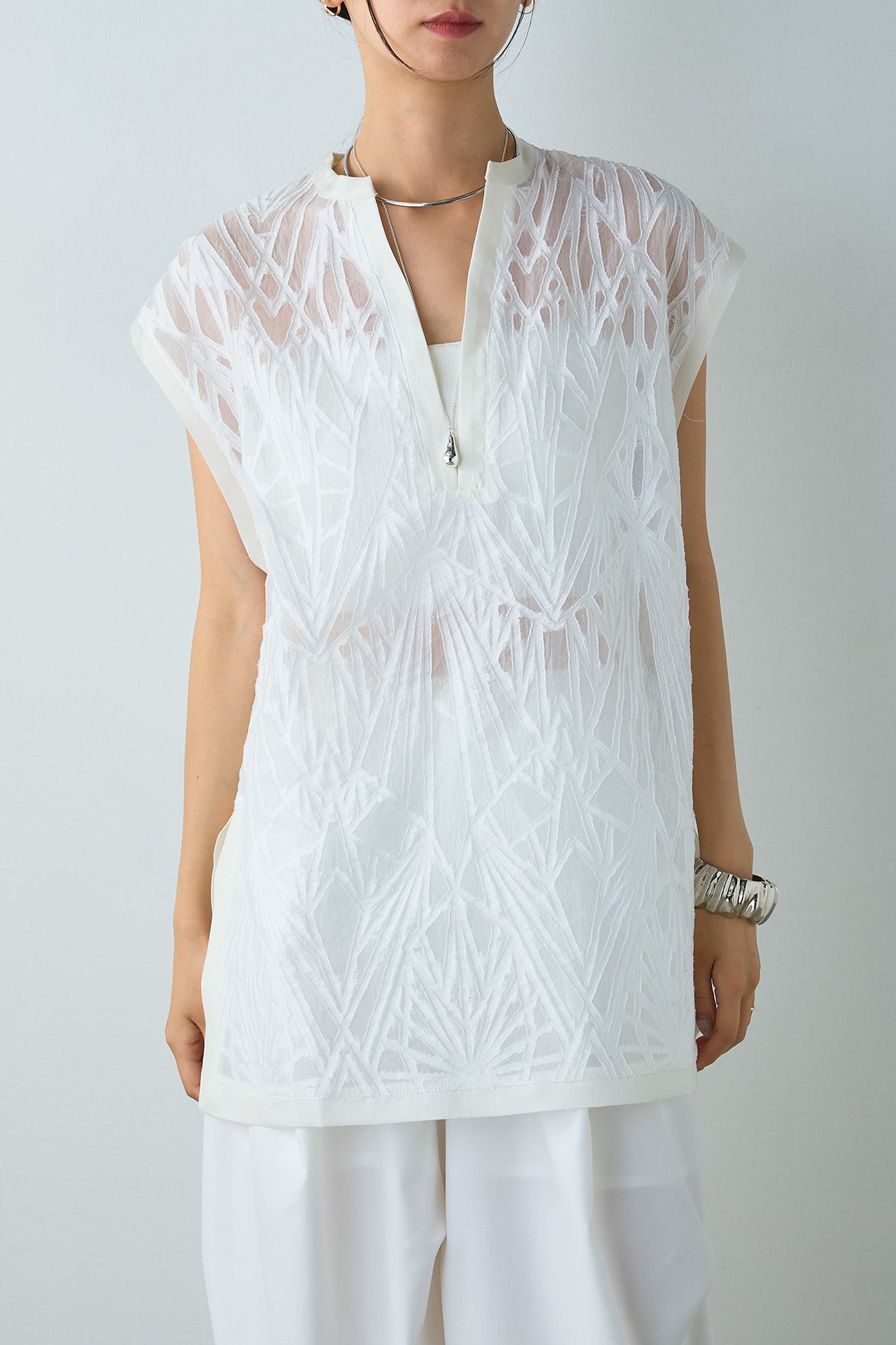 幾何学的なレース柄が印象的なVネックプルオーバー。 ほんのり透けるシアー感が抜け感をプラスし、軽やかな着心地に。 ヒップが隠れる長めの丈感で、ボトムスを選ばずスタイリングできます。