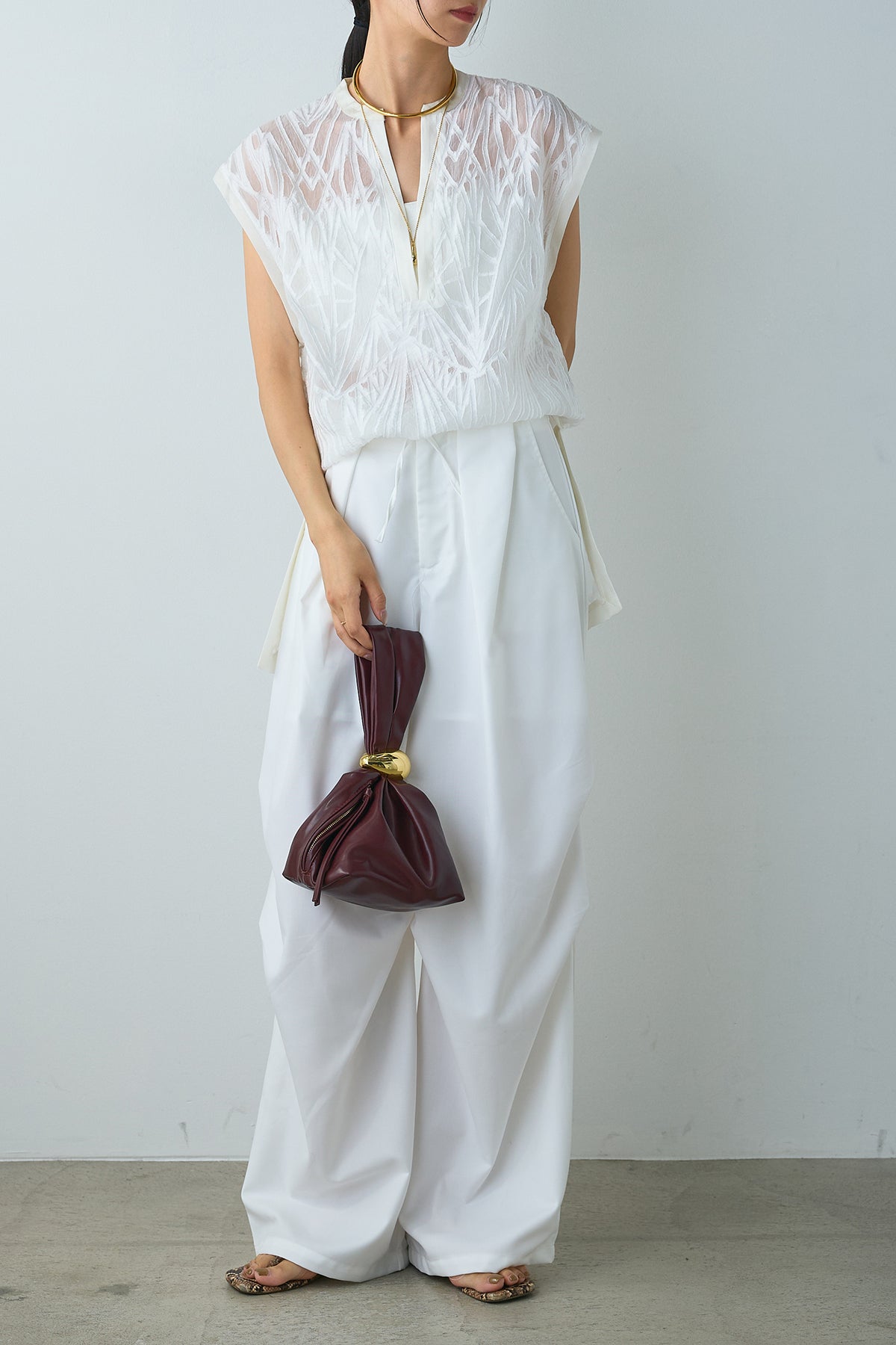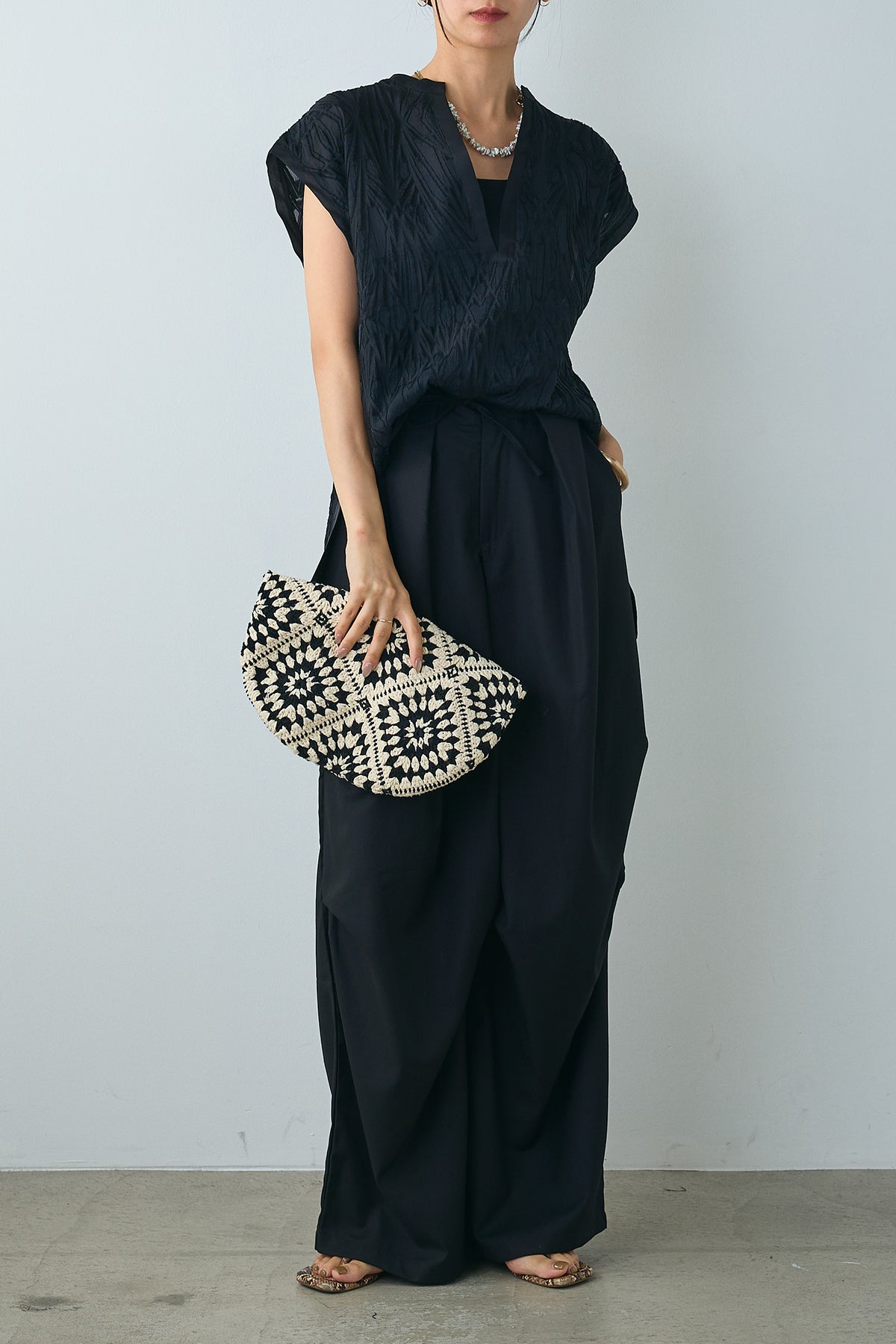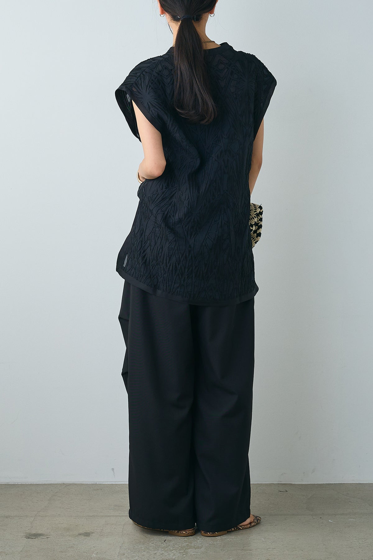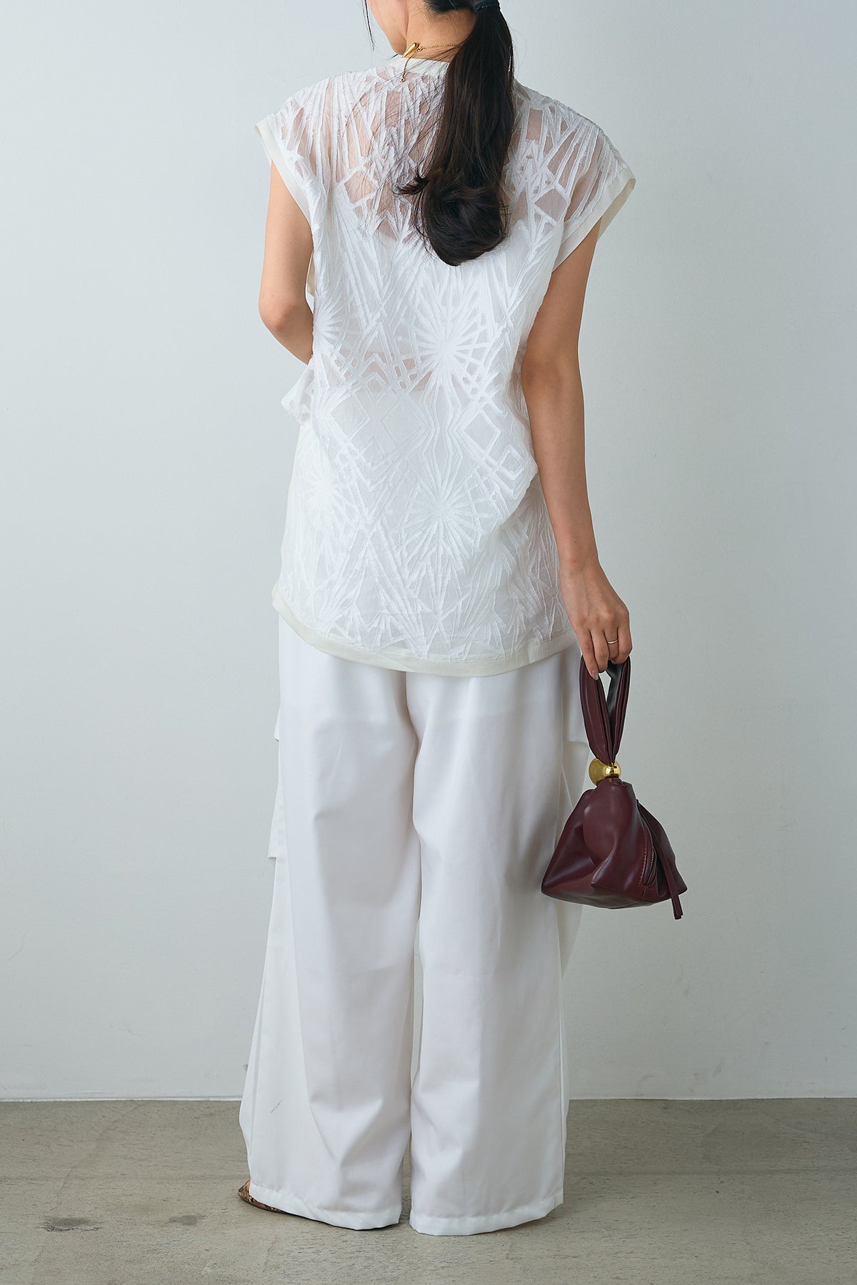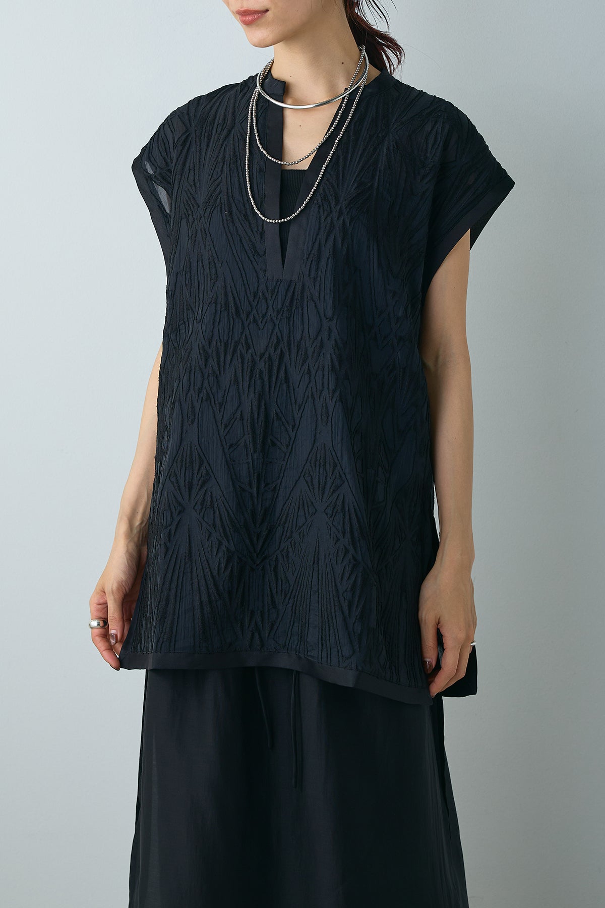 幾何学的なレース柄が印象的なVネックプルオーバー。 ほんのり透けるシアー感が抜け感をプラスし、軽やかな着心地に。 ヒップが隠れる長めの丈感で、ボトムスを選ばずスタイリングできます。