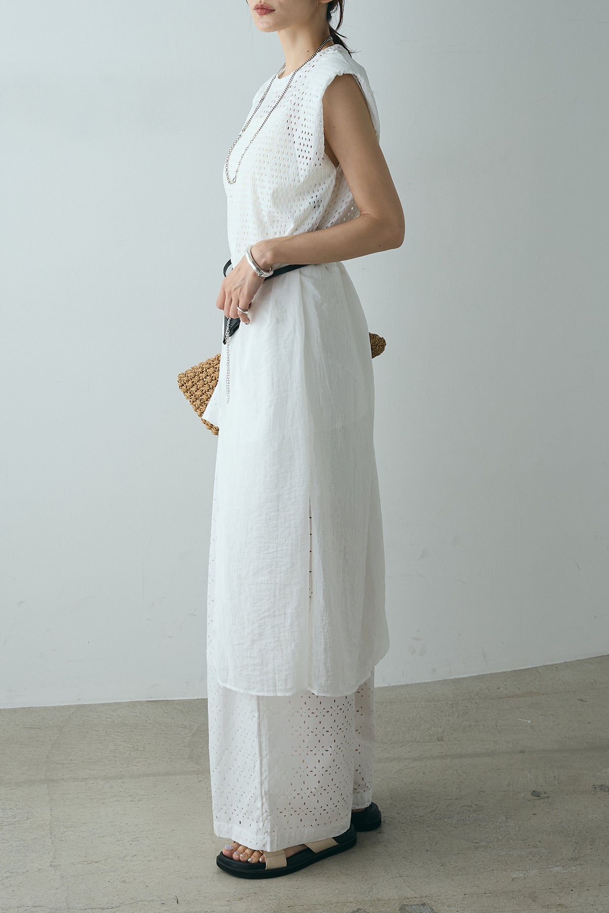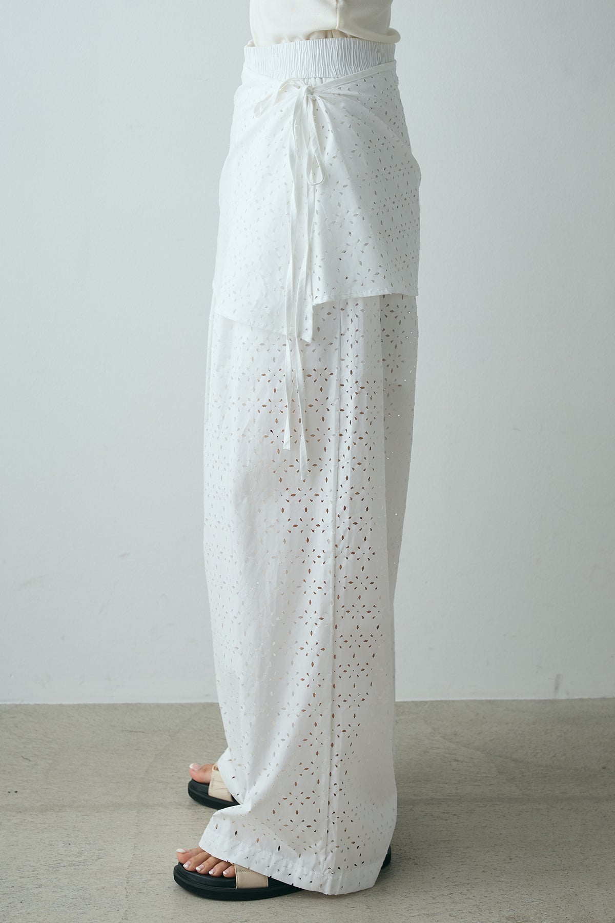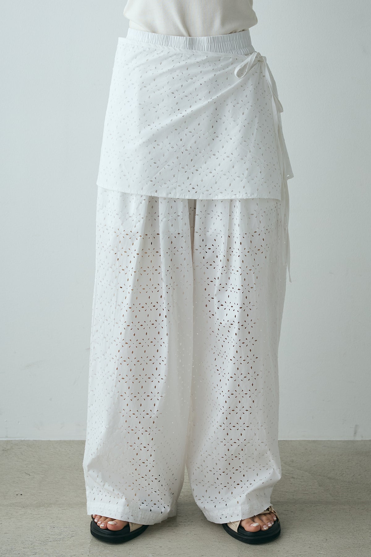 スカートを重ねたようなデザインが印象的なレイヤードワイドパンツ。繊細な透かし柄が軽やかな抜け感を添え、動くたびに揺れるシルエットが魅力。ウエストはゴム仕様でリラクシーな着心地もポイントです。