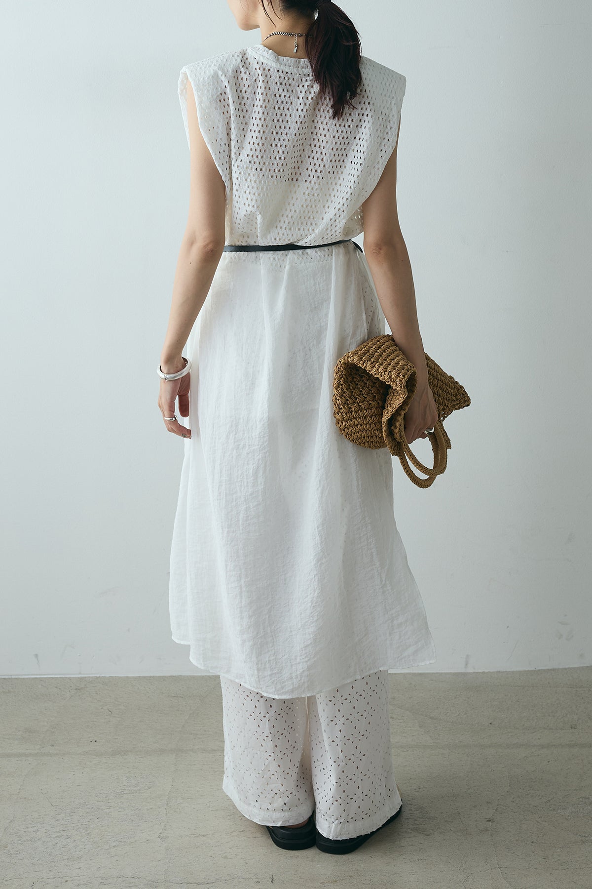 清涼感のあるメッシュ素材を使ったワンピース。透け感のある部分と、しっかりとした生地が絶妙に切り替わり、軽やかな印象を与えます。ウエストにベルトをあしらい、シルエットにメリハリをプラス。カジュアルでありながら、洗練されたデザインで、夏のおしゃれにぴったりのアイテムです。