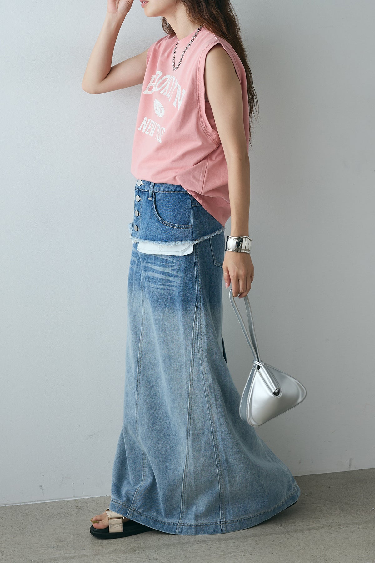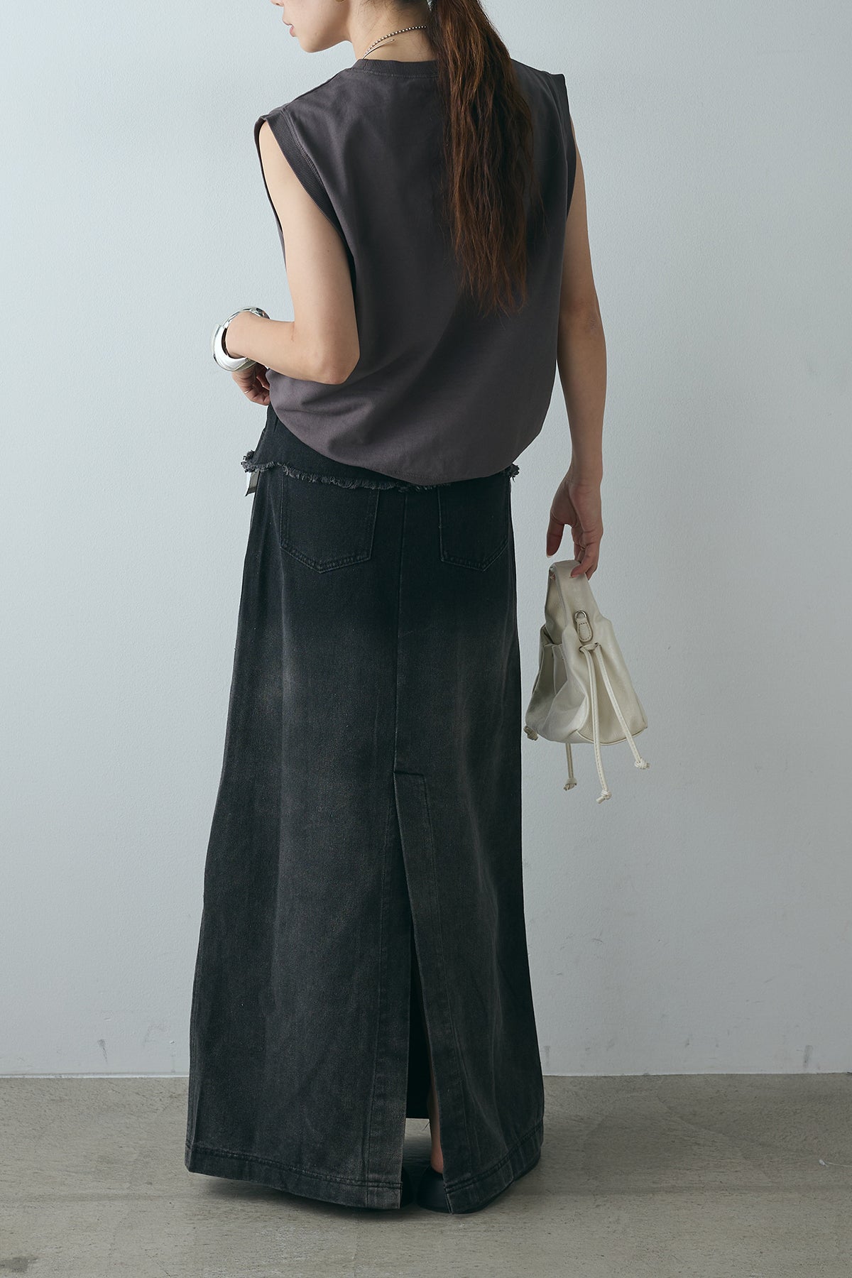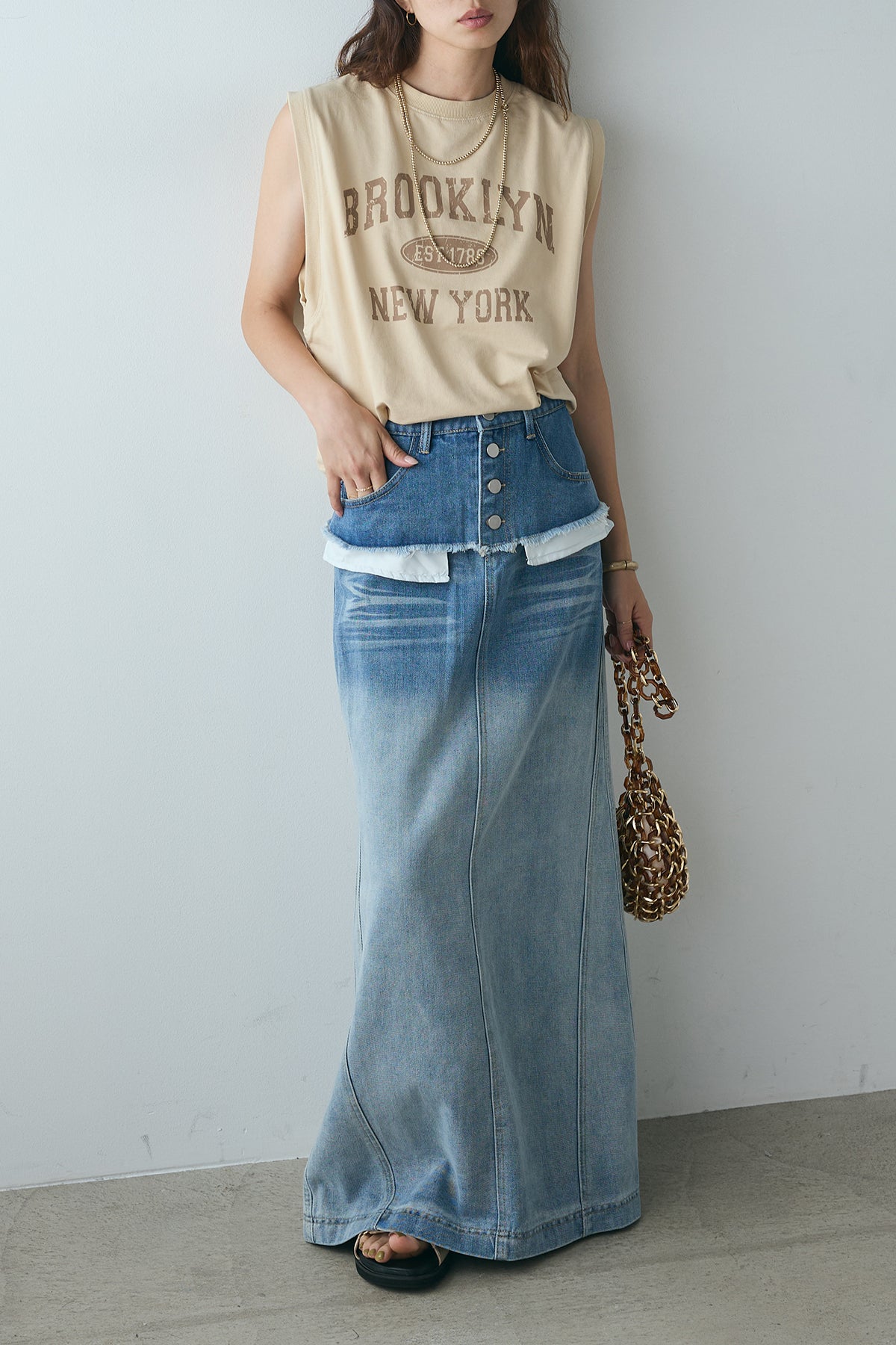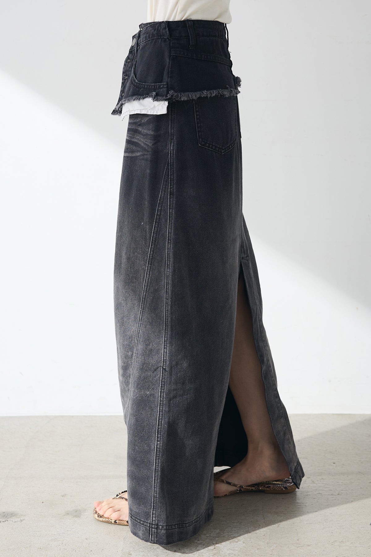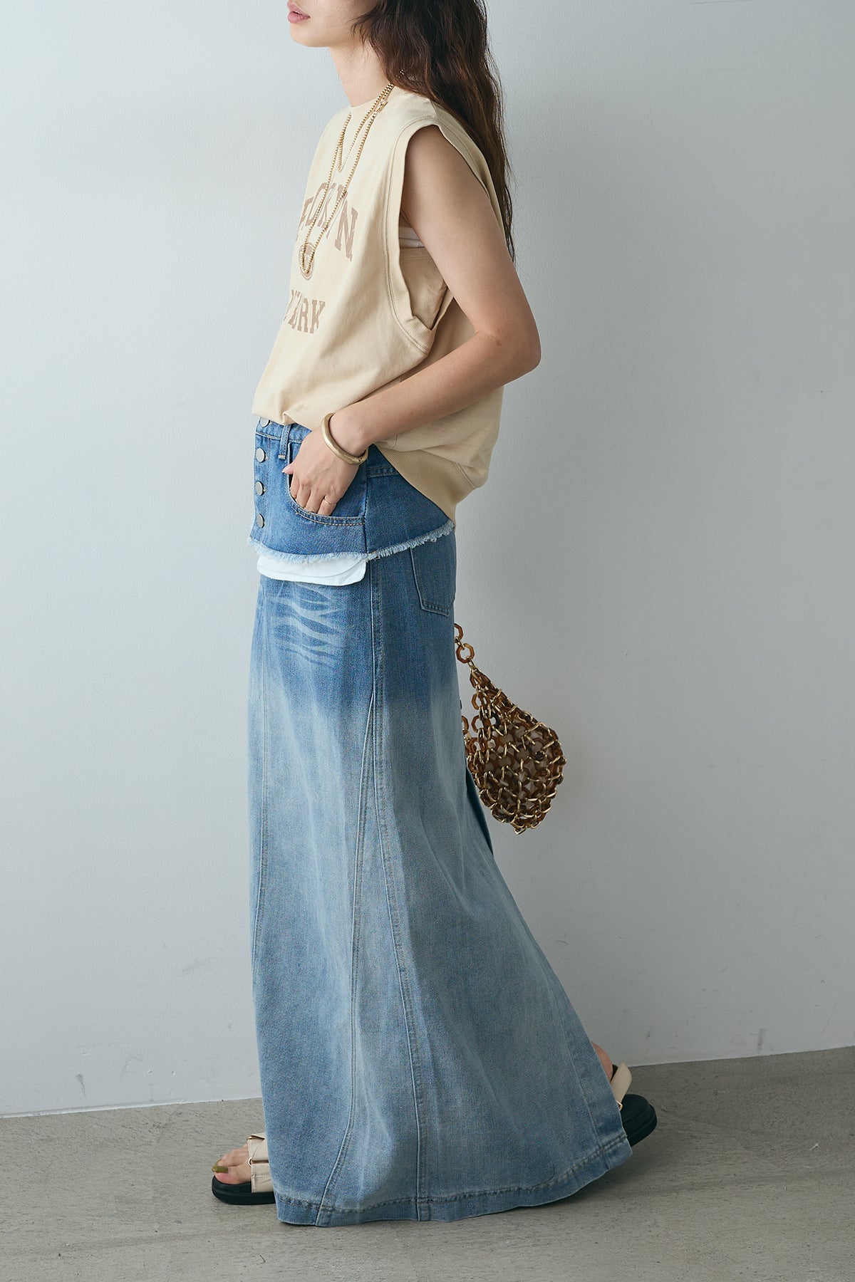 ラフな風合いが魅力のデニムロングスカート。程よくフェード感のあるウォッシュ加工がこなれた印象を与え、バックのスリットが抜け感をプラス。裾にはさりげないレイヤードデザインを取り入れ、シンプルな中に個性を効かせた一枚。足さばきも良く、フラットシューズでもバランス良くまとまる丈感で、デイリーに活躍する万能ボトムです。