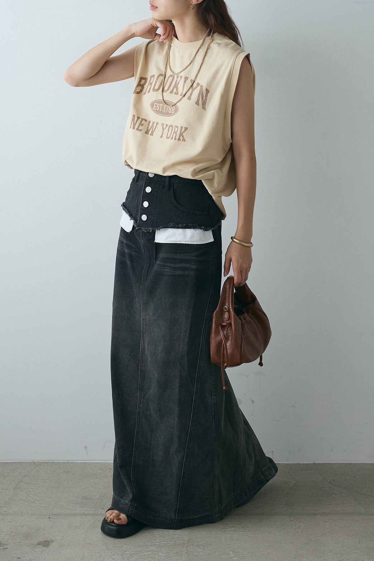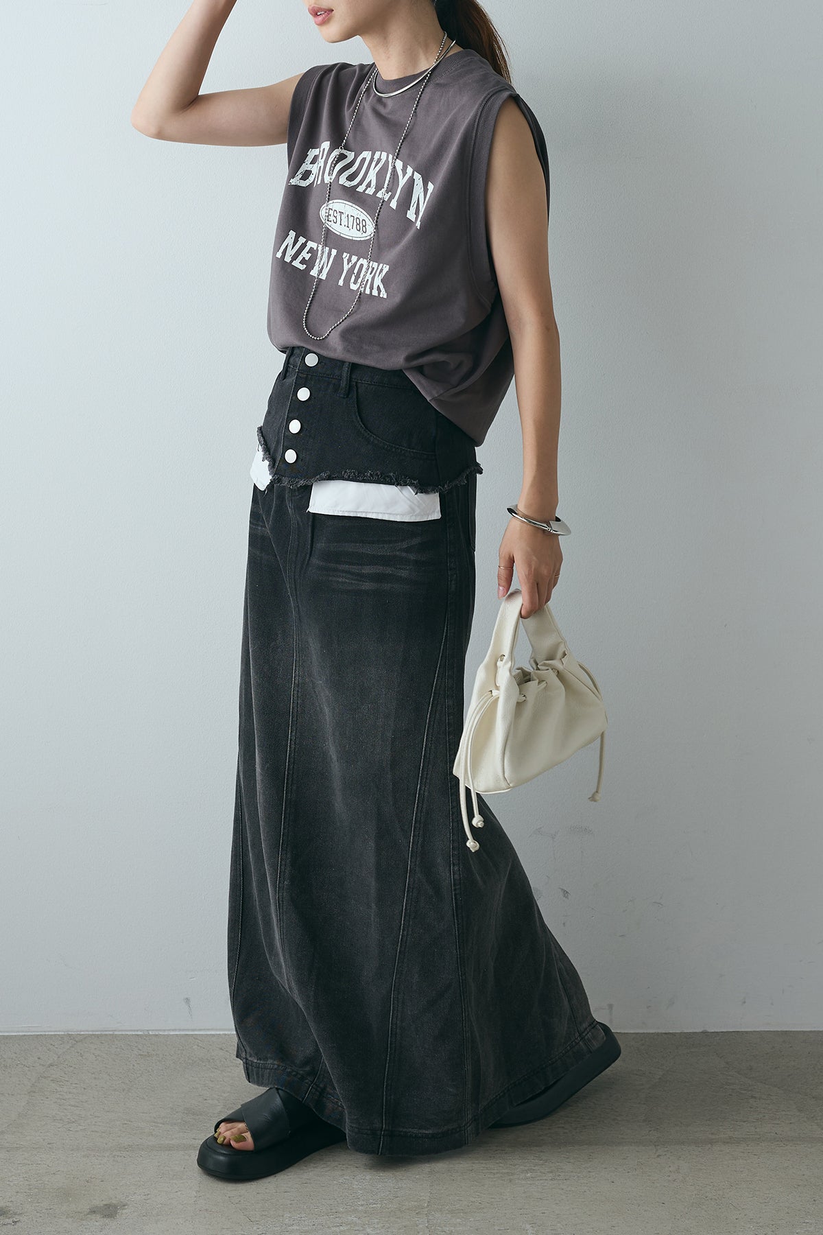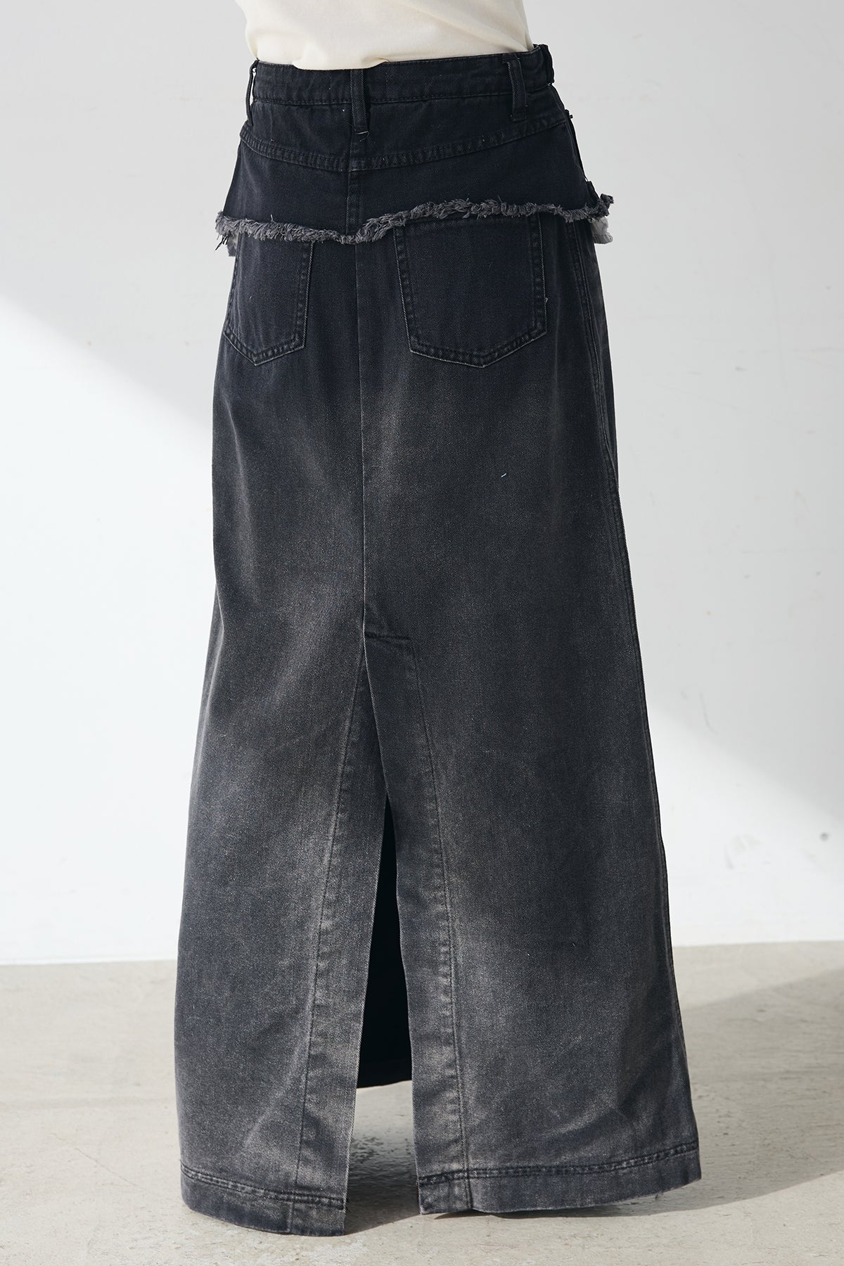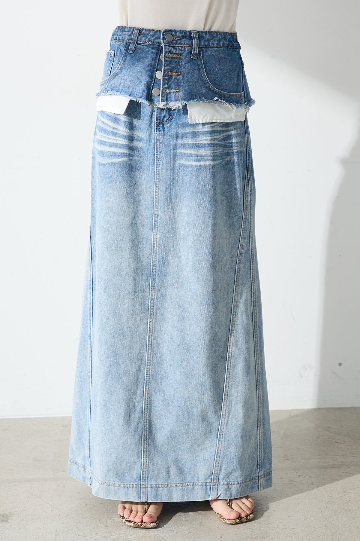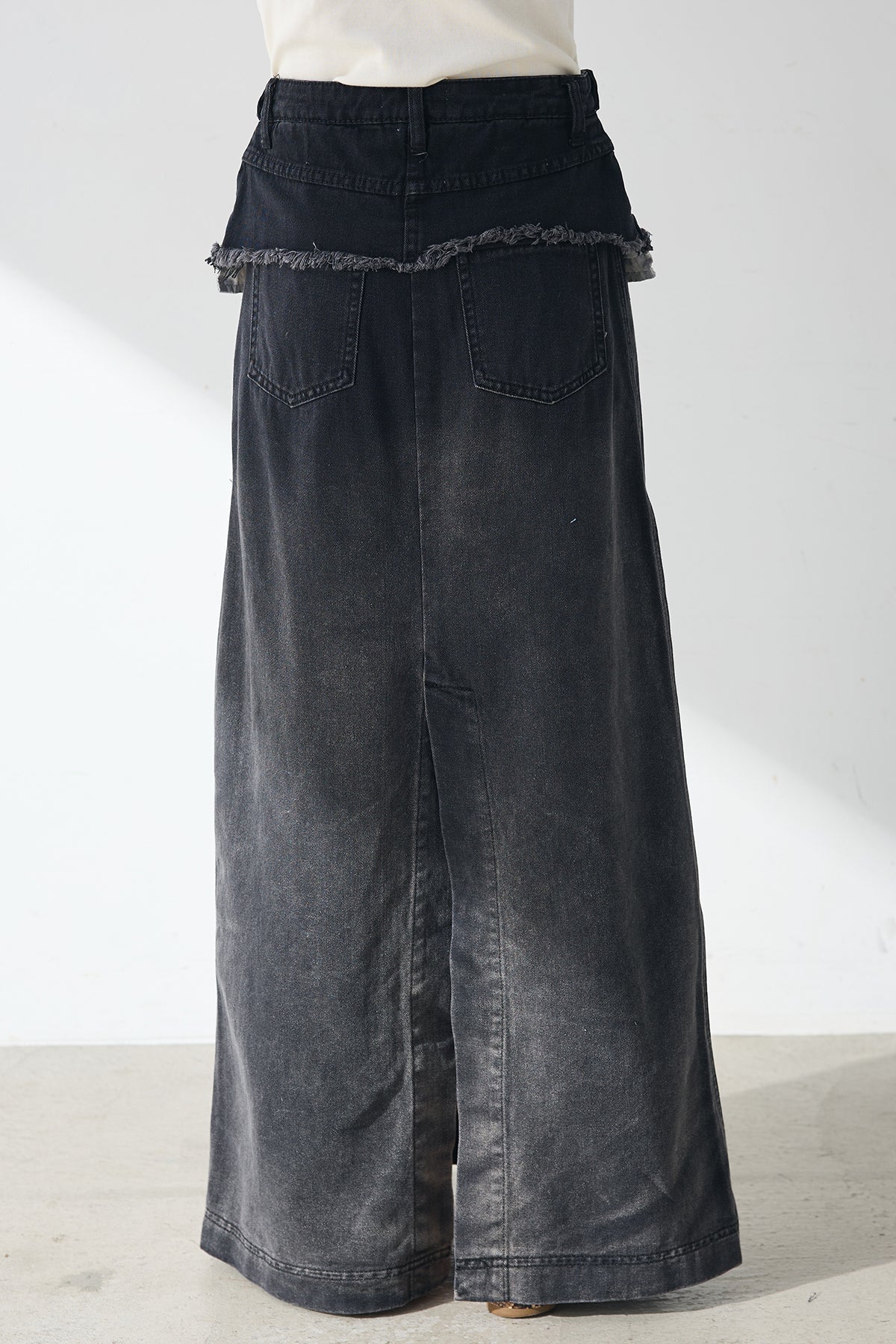 ラフな風合いが魅力のデニムロングスカート。程よくフェード感のあるウォッシュ加工がこなれた印象を与え、バックのスリットが抜け感をプラス。裾にはさりげないレイヤードデザインを取り入れ、シンプルな中に個性を効かせた一枚。足さばきも良く、フラットシューズでもバランス良くまとまる丈感で、デイリーに活躍する万能ボトムです。