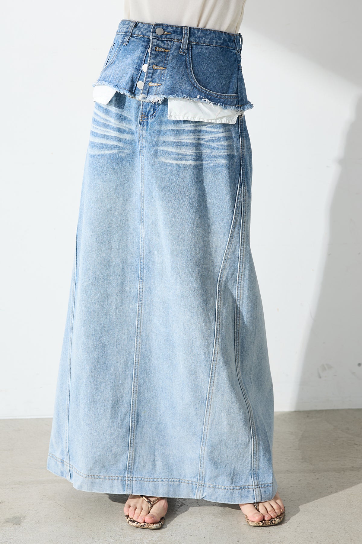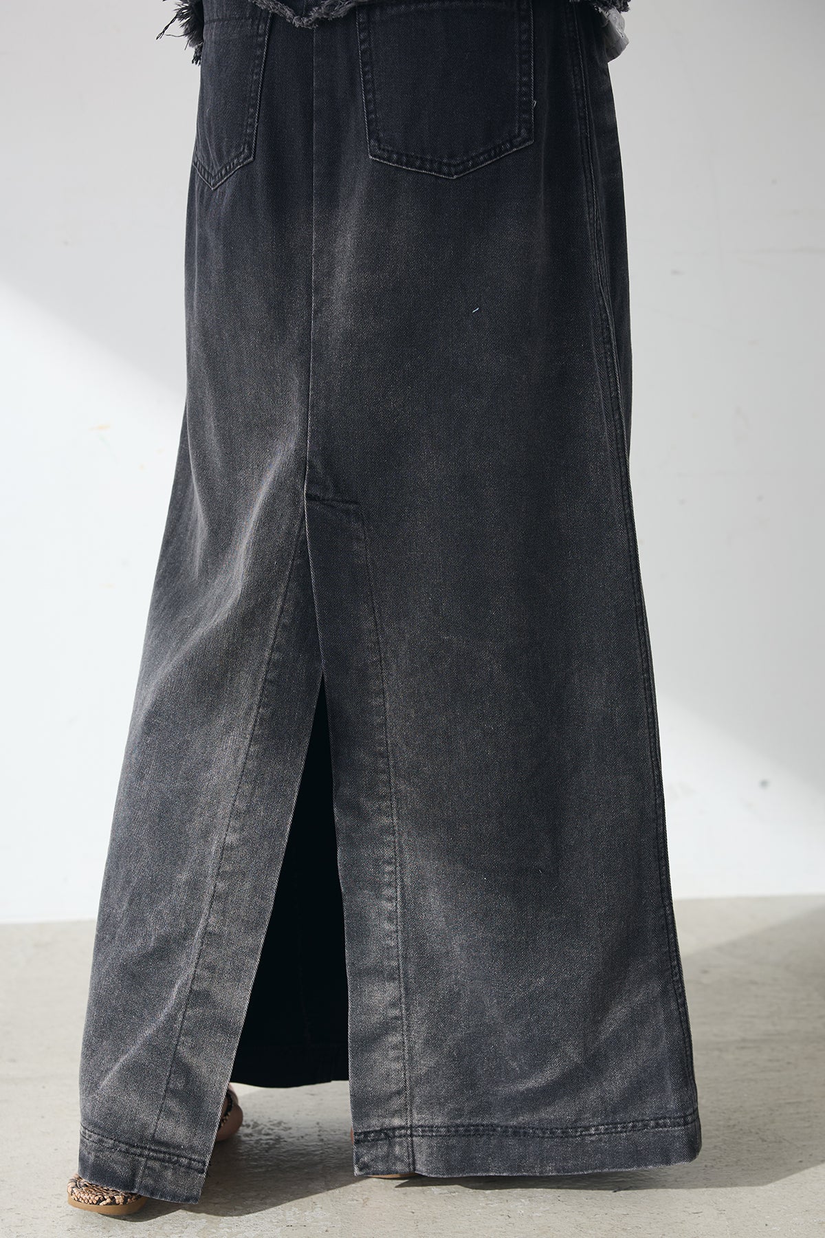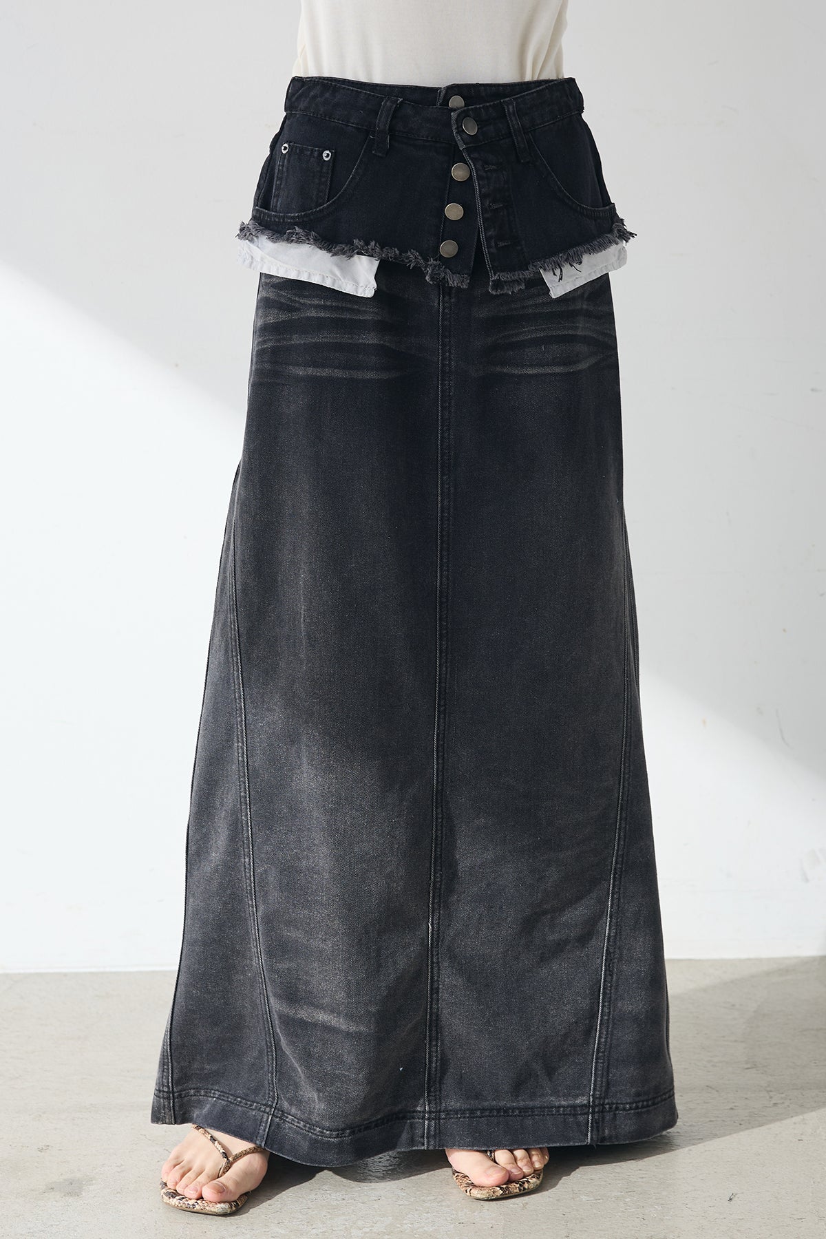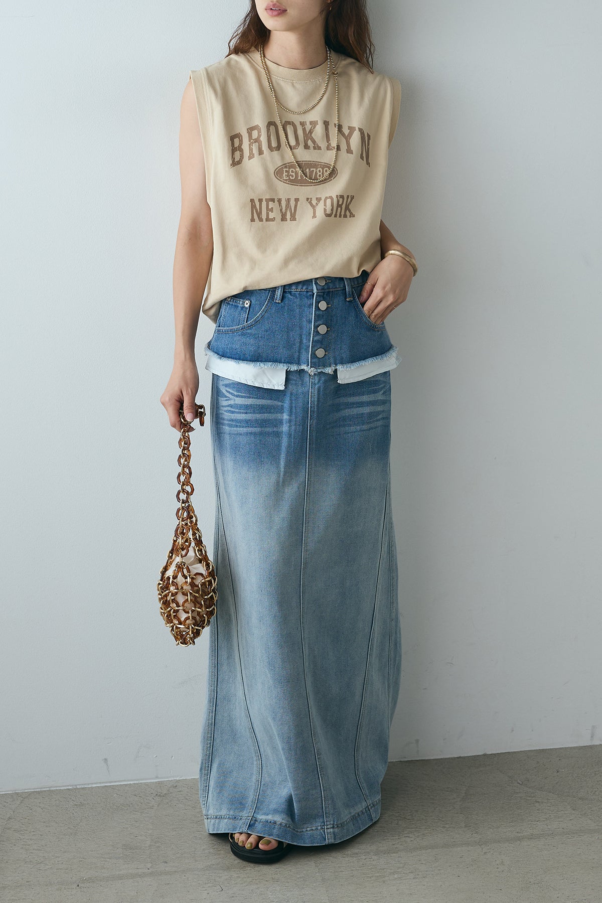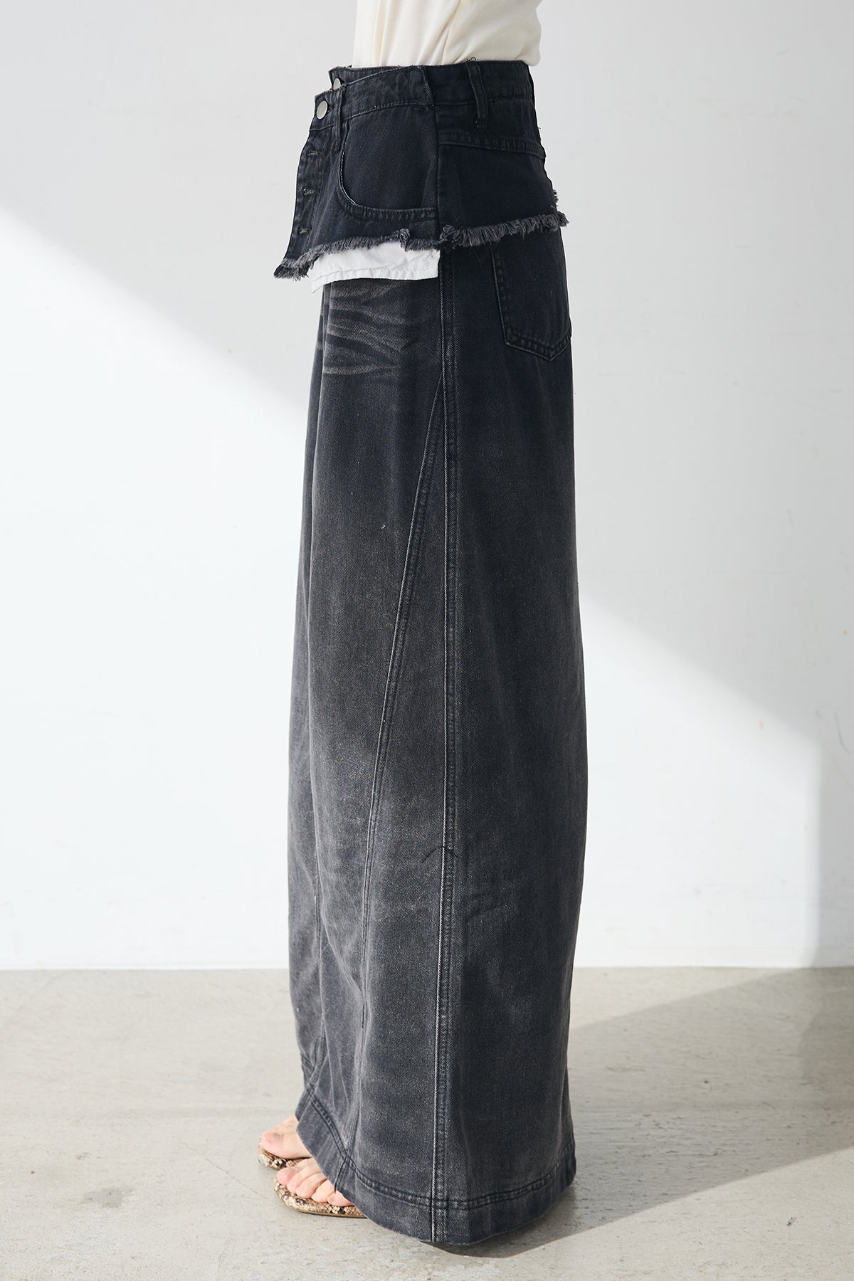 ラフな風合いが魅力のデニムロングスカート。程よくフェード感のあるウォッシュ加工がこなれた印象を与え、バックのスリットが抜け感をプラス。裾にはさりげないレイヤードデザインを取り入れ、シンプルな中に個性を効かせた一枚。足さばきも良く、フラットシューズでもバランス良くまとまる丈感で、デイリーに活躍する万能ボトムです。