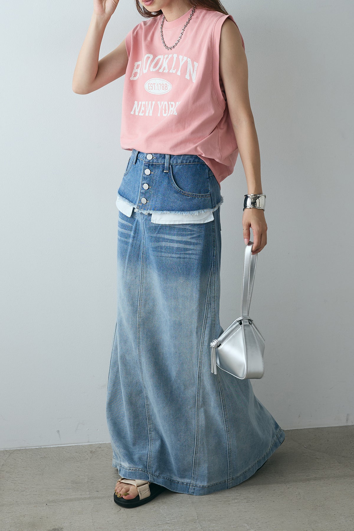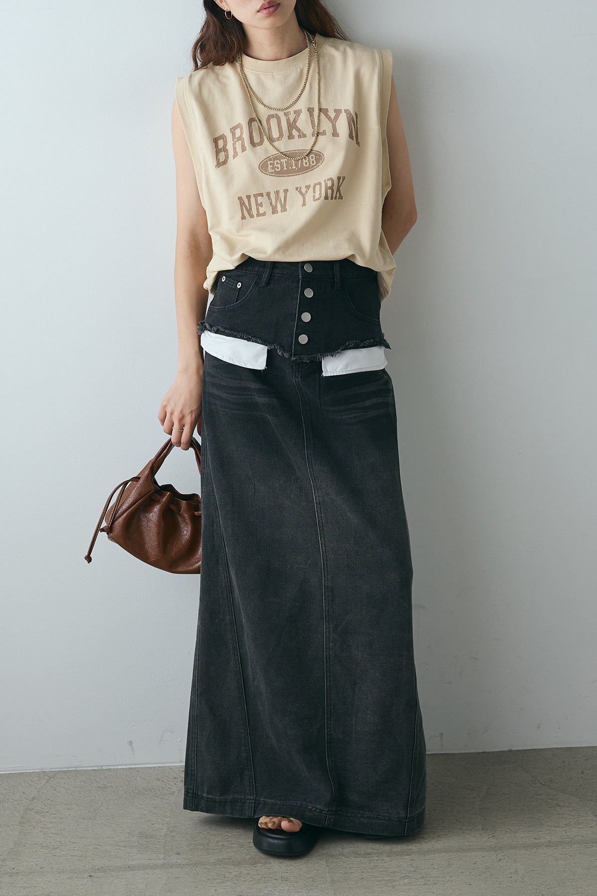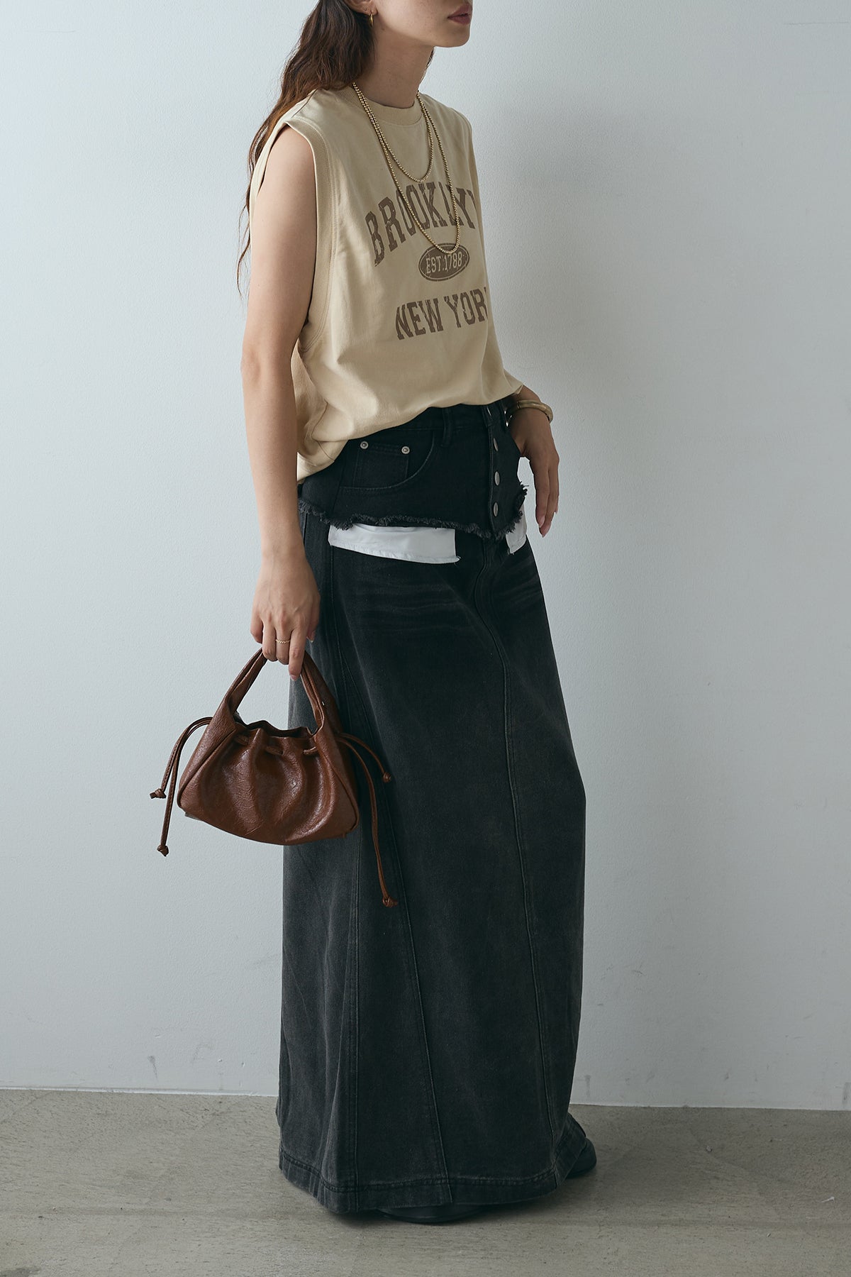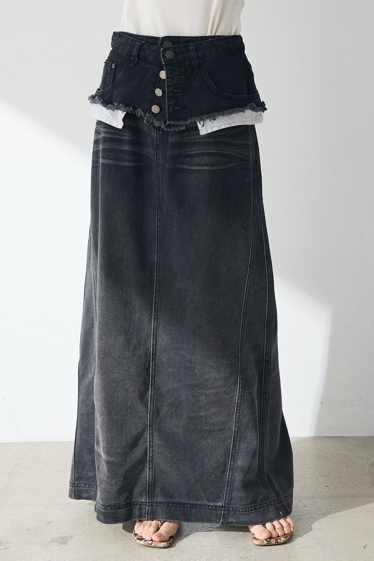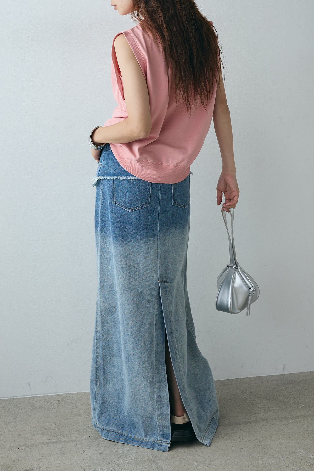 ラフな風合いが魅力のデニムロングスカート。程よくフェード感のあるウォッシュ加工がこなれた印象を与え、バックのスリットが抜け感をプラス。裾にはさりげないレイヤードデザインを取り入れ、シンプルな中に個性を効かせた一枚。足さばきも良く、フラットシューズでもバランス良くまとまる丈感で、デイリーに活躍する万能ボトムです。
