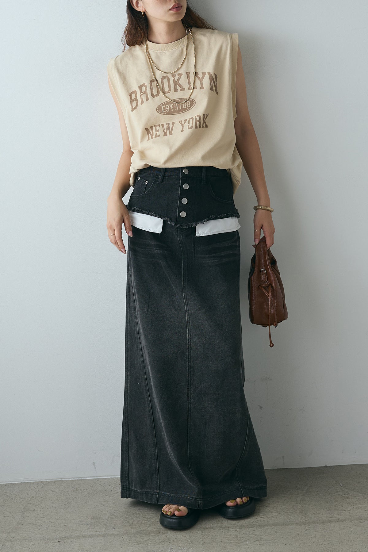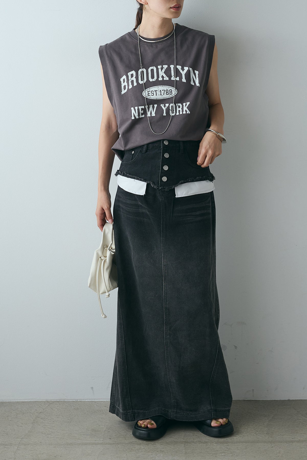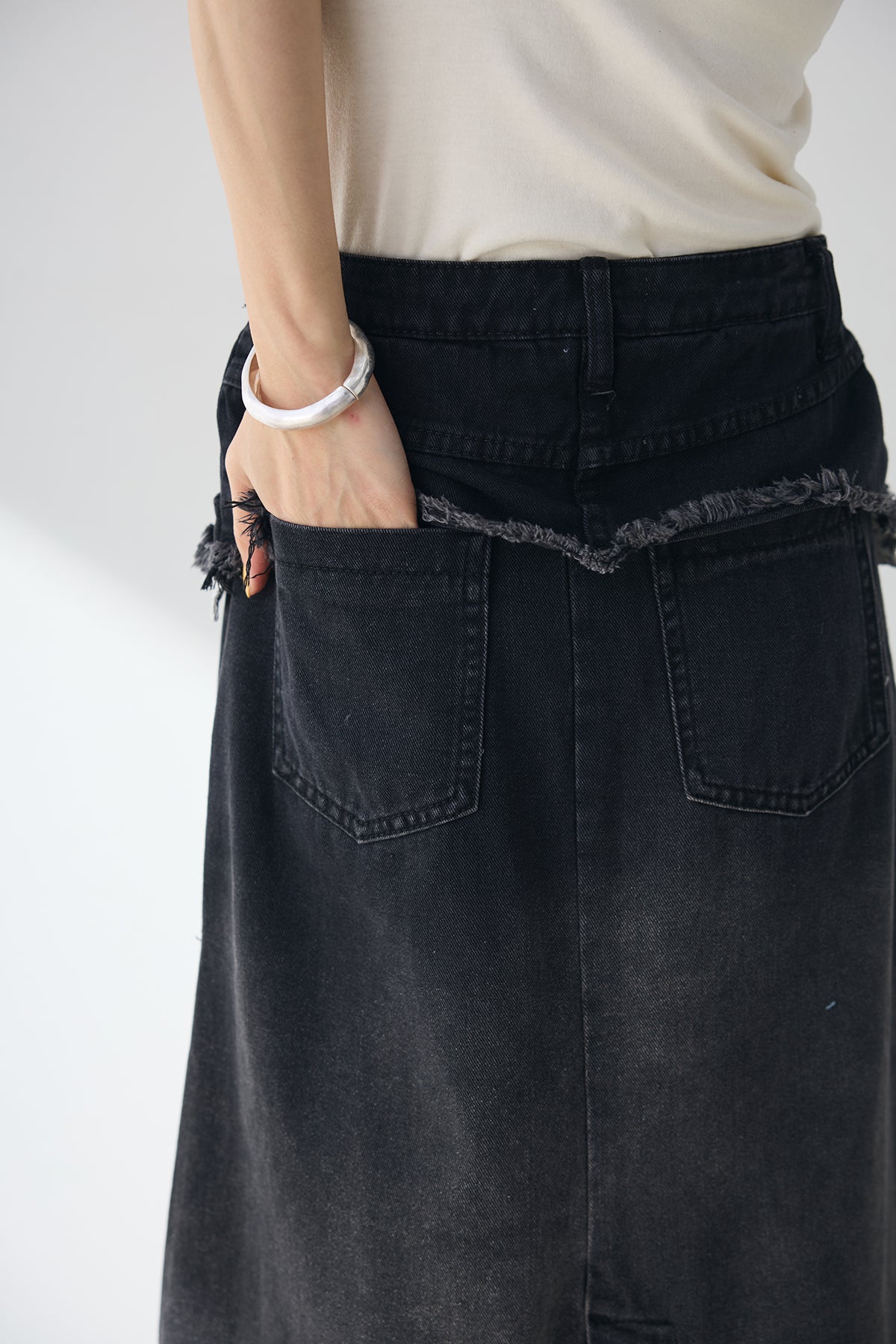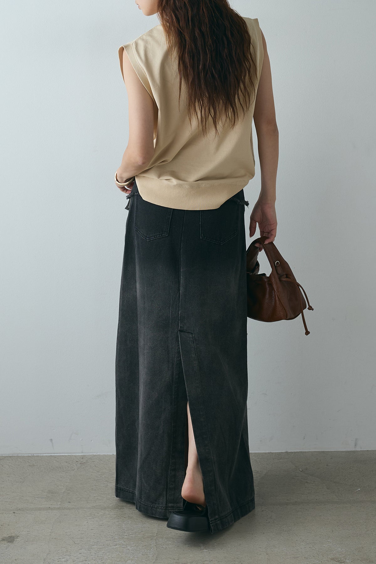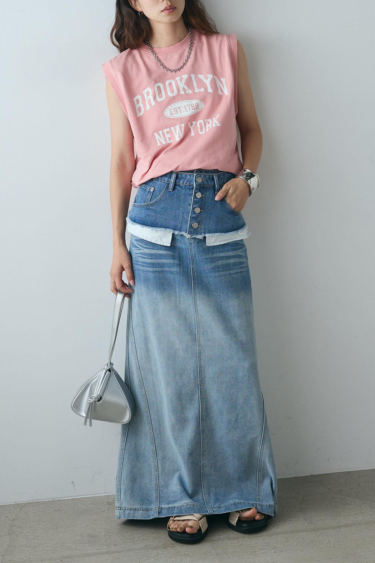 ラフな風合いが魅力のデニムロングスカート。程よくフェード感のあるウォッシュ加工がこなれた印象を与え、バックのスリットが抜け感をプラス。裾にはさりげないレイヤードデザインを取り入れ、シンプルな中に個性を効かせた一枚。足さばきも良く、フラットシューズでもバランス良くまとまる丈感で、デイリーに活躍する万能ボトムです。