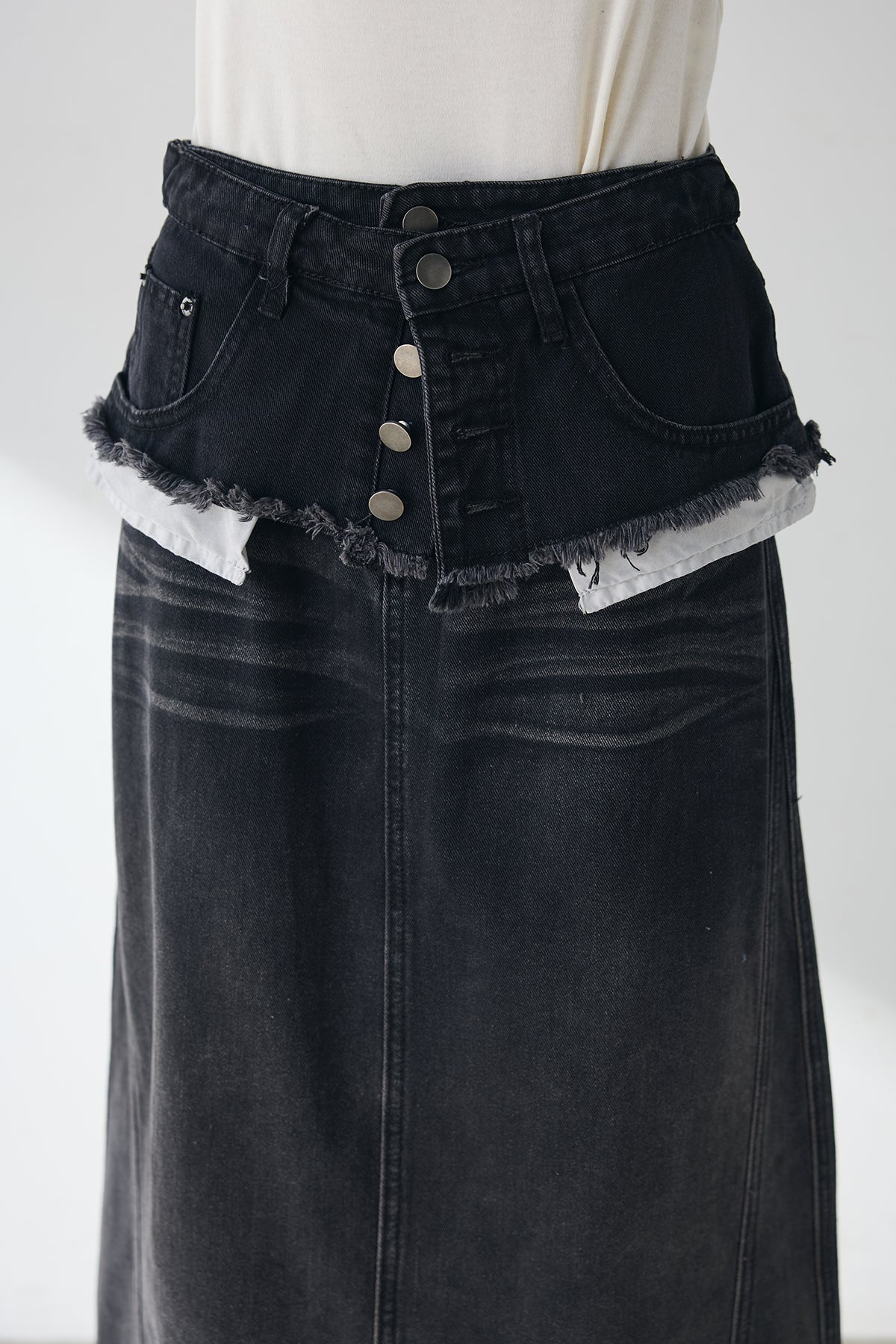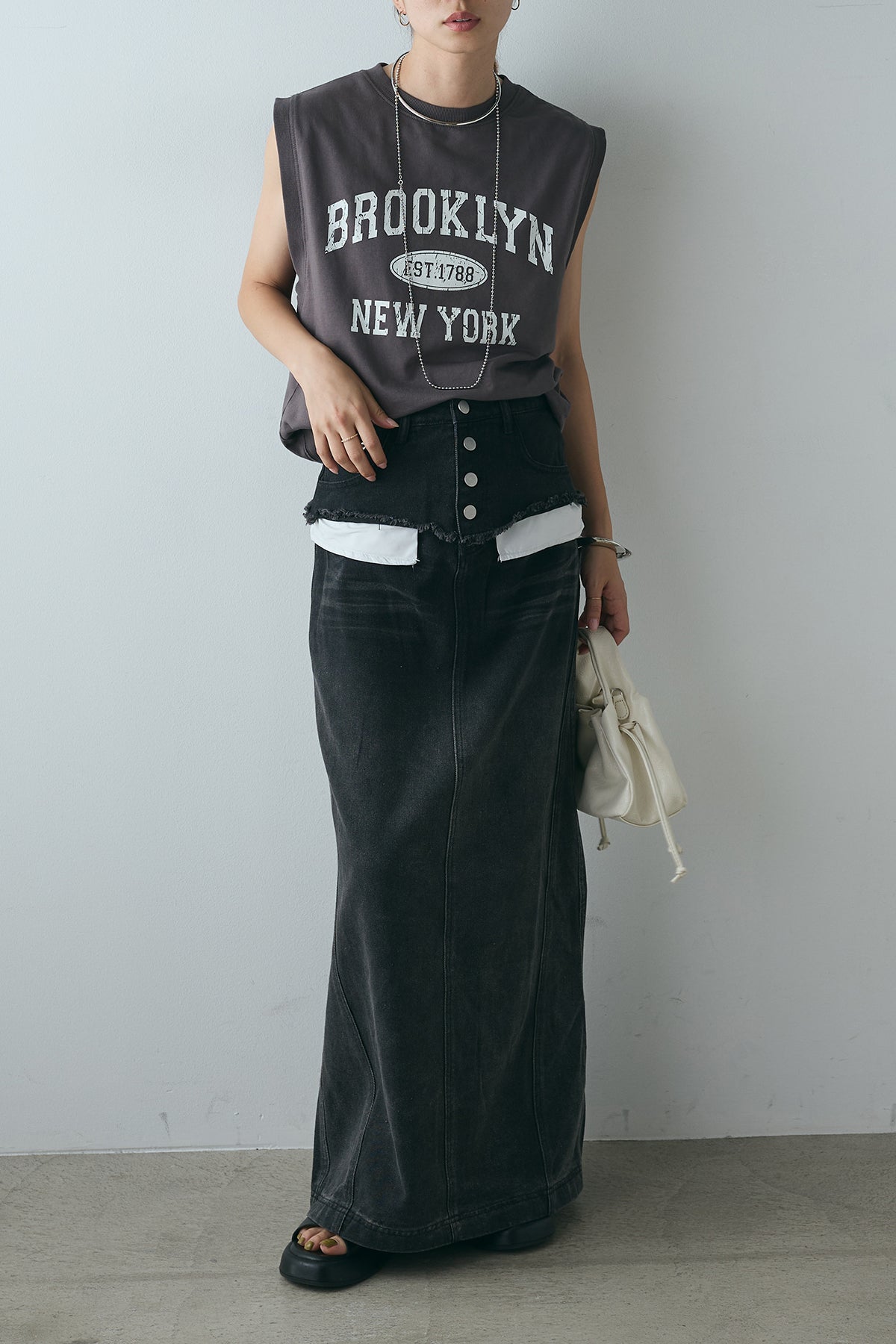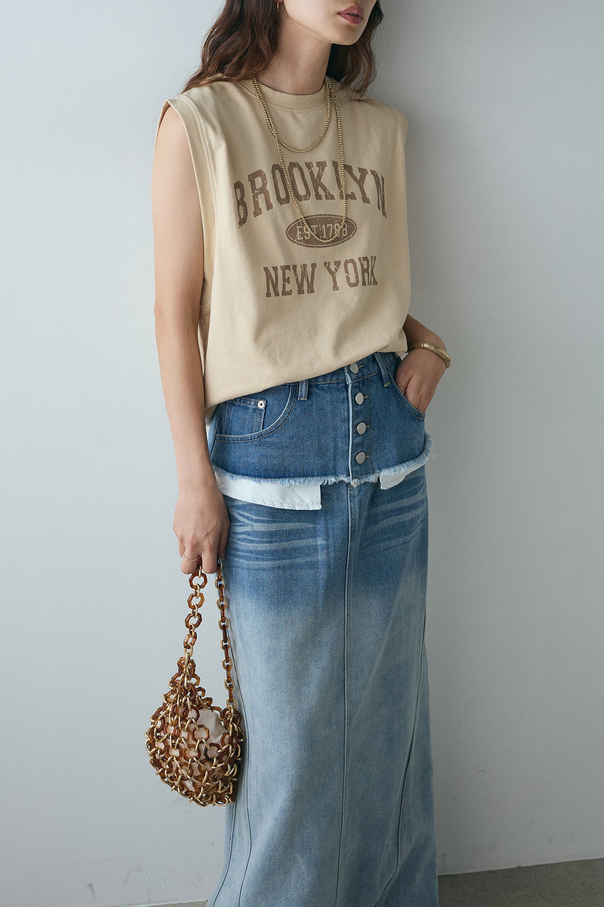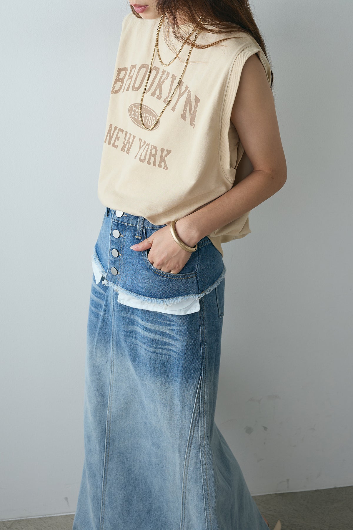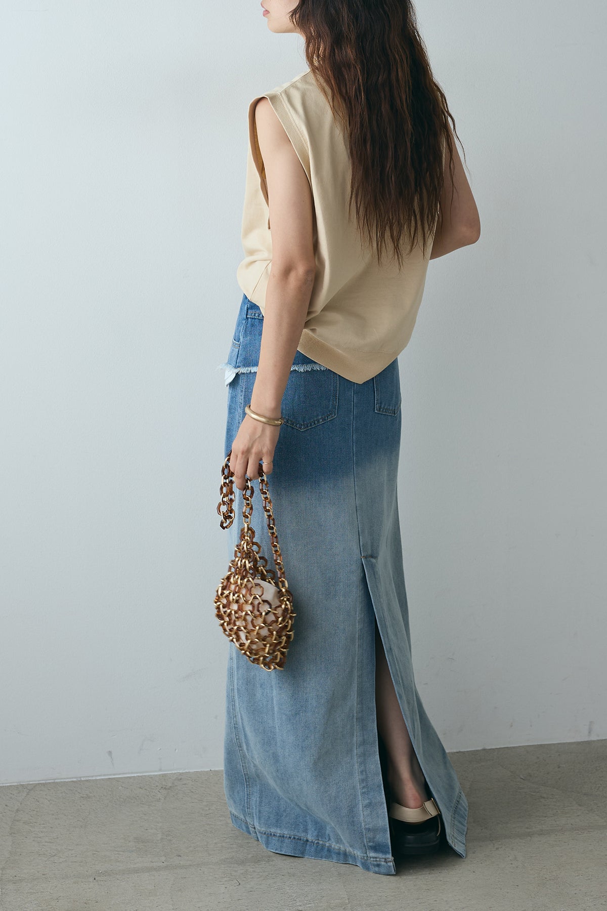 ラフな風合いが魅力のデニムロングスカート。程よくフェード感のあるウォッシュ加工がこなれた印象を与え、バックのスリットが抜け感をプラス。裾にはさりげないレイヤードデザインを取り入れ、シンプルな中に個性を効かせた一枚。足さばきも良く、フラットシューズでもバランス良くまとまる丈感で、デイリーに活躍する万能ボトムです。