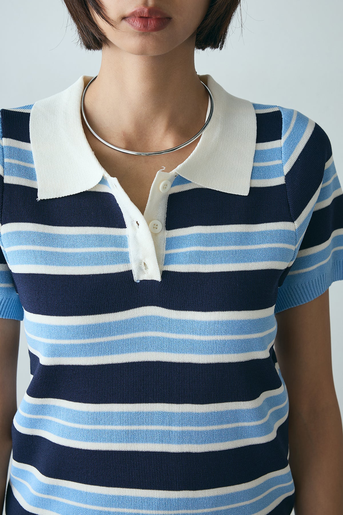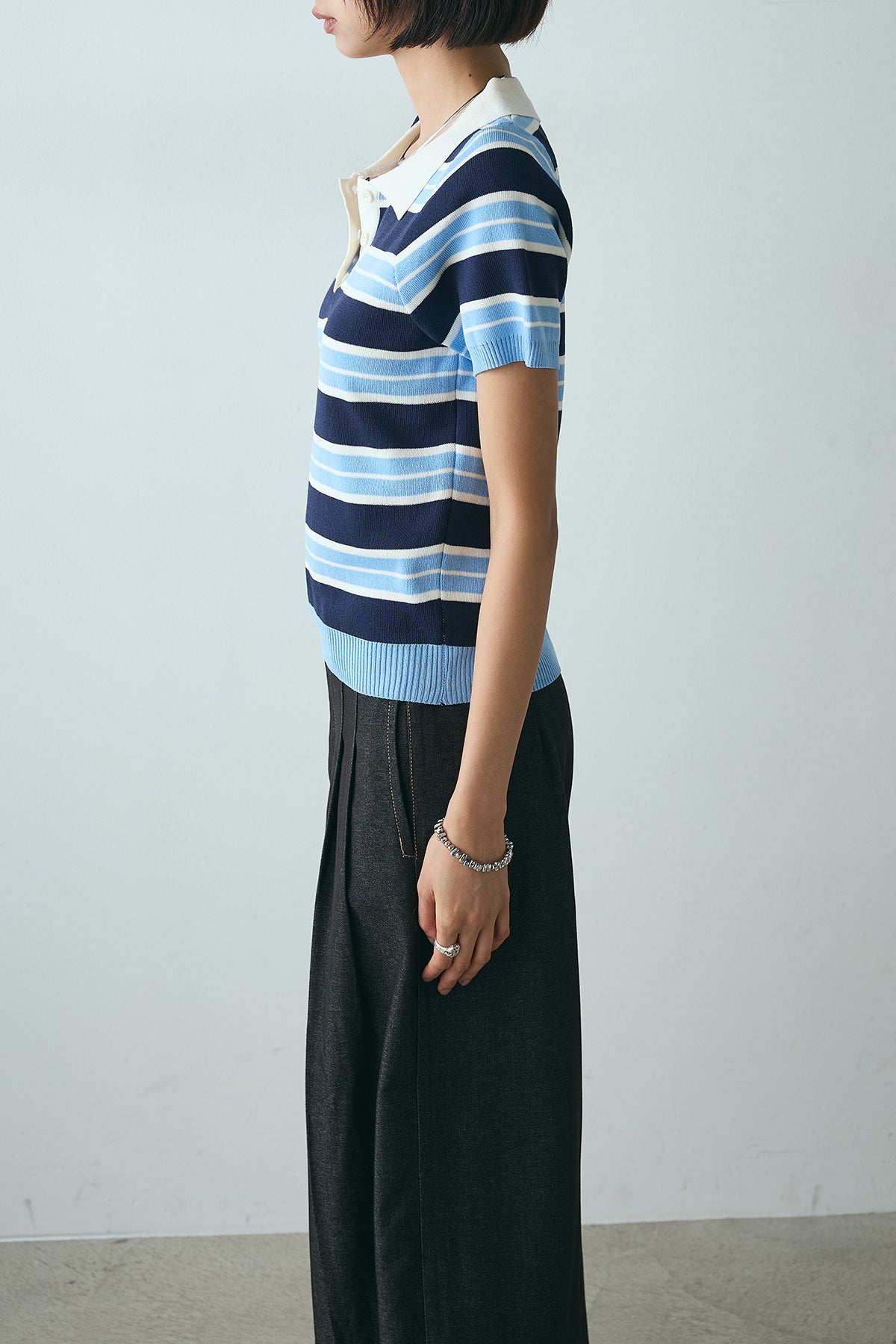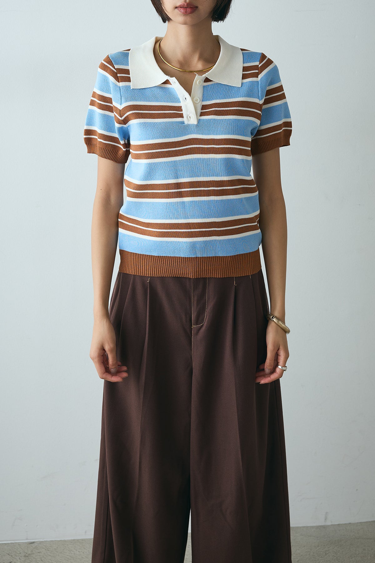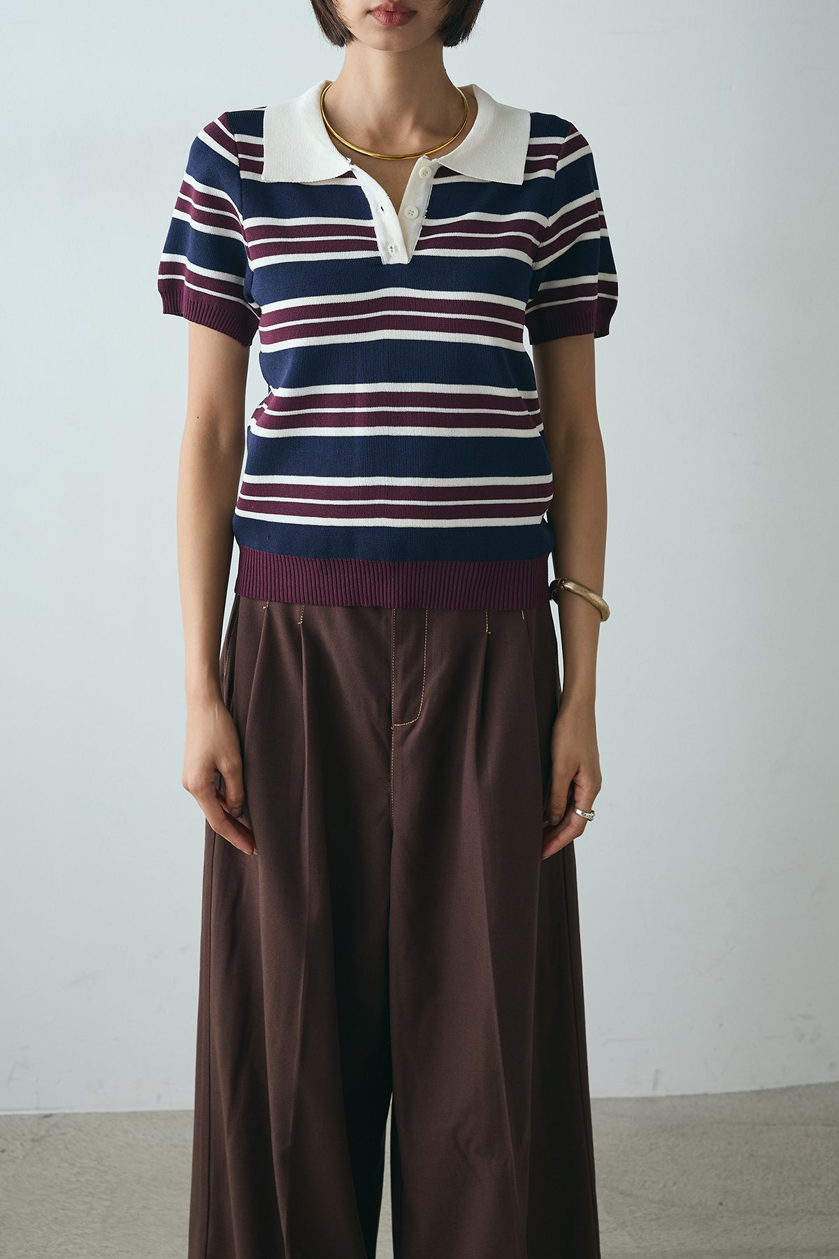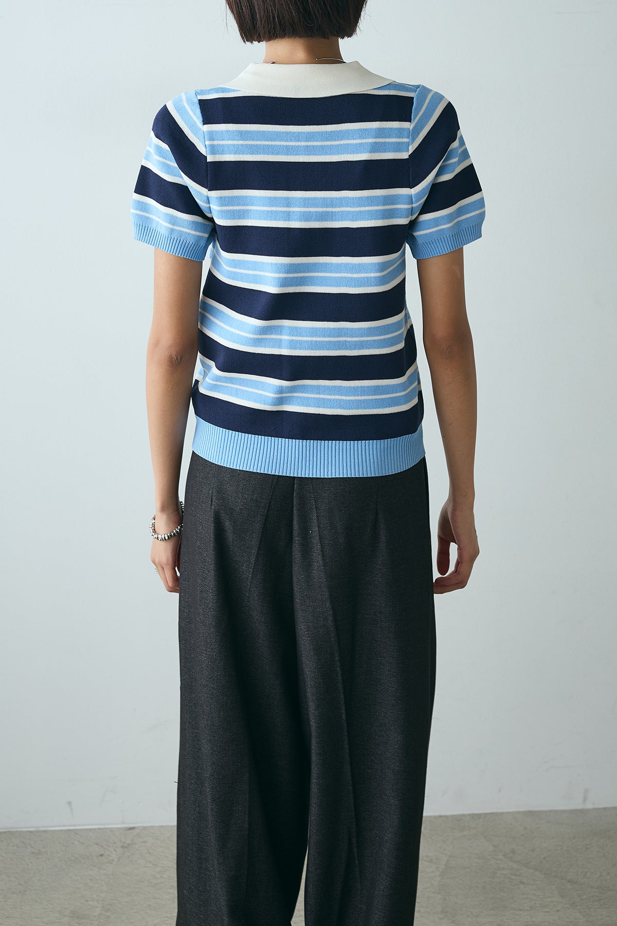 カラフルなマルチボーダーが爽やかな印象を与えるニットポロ。