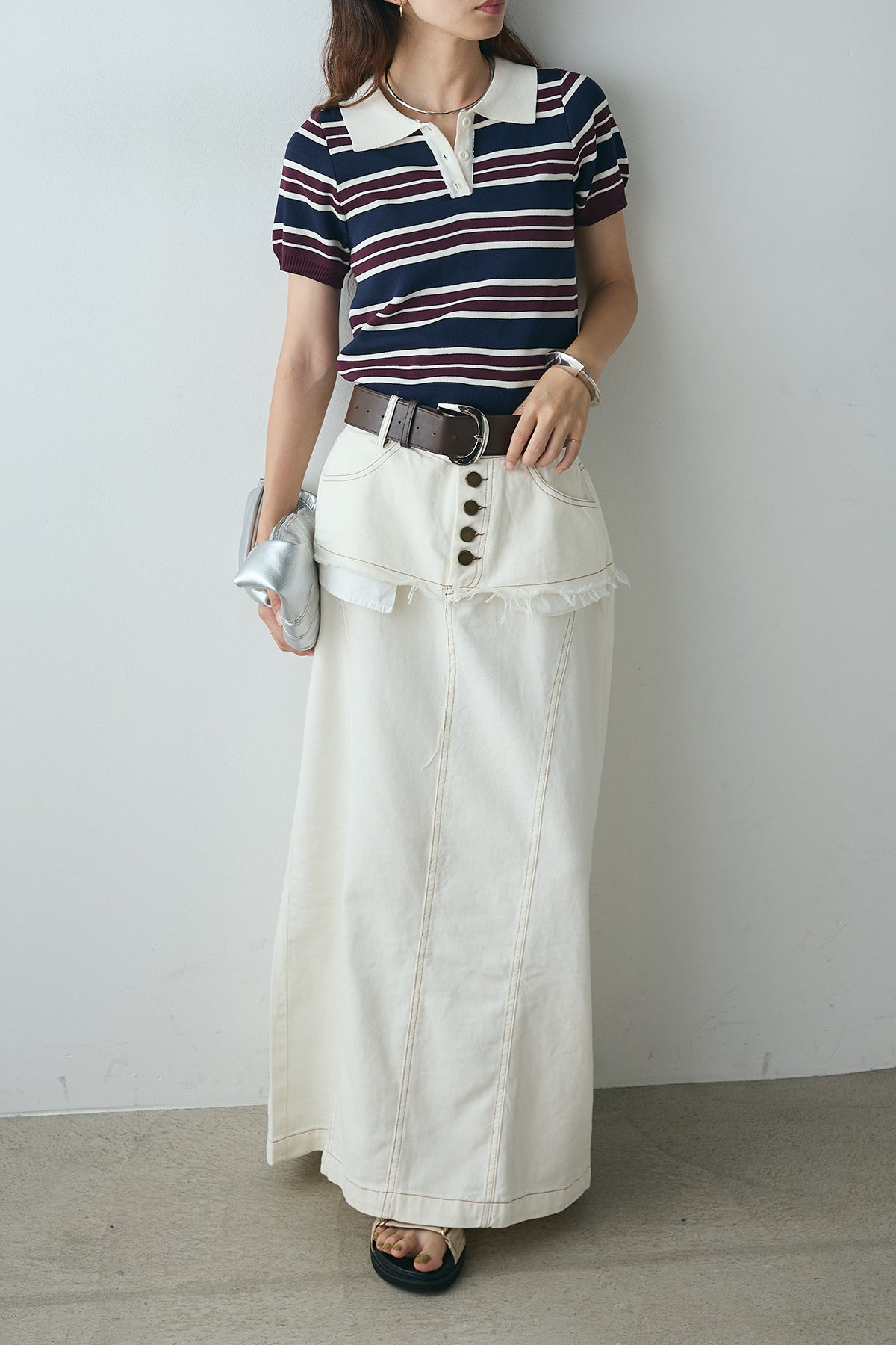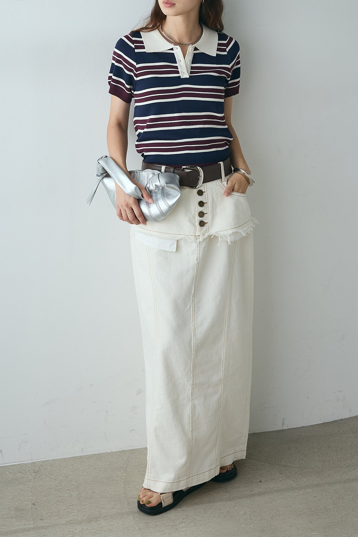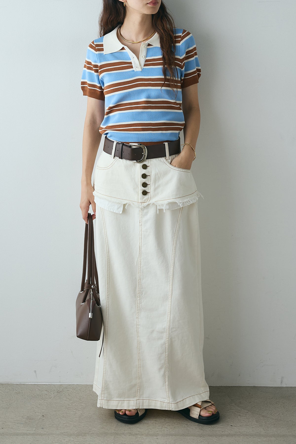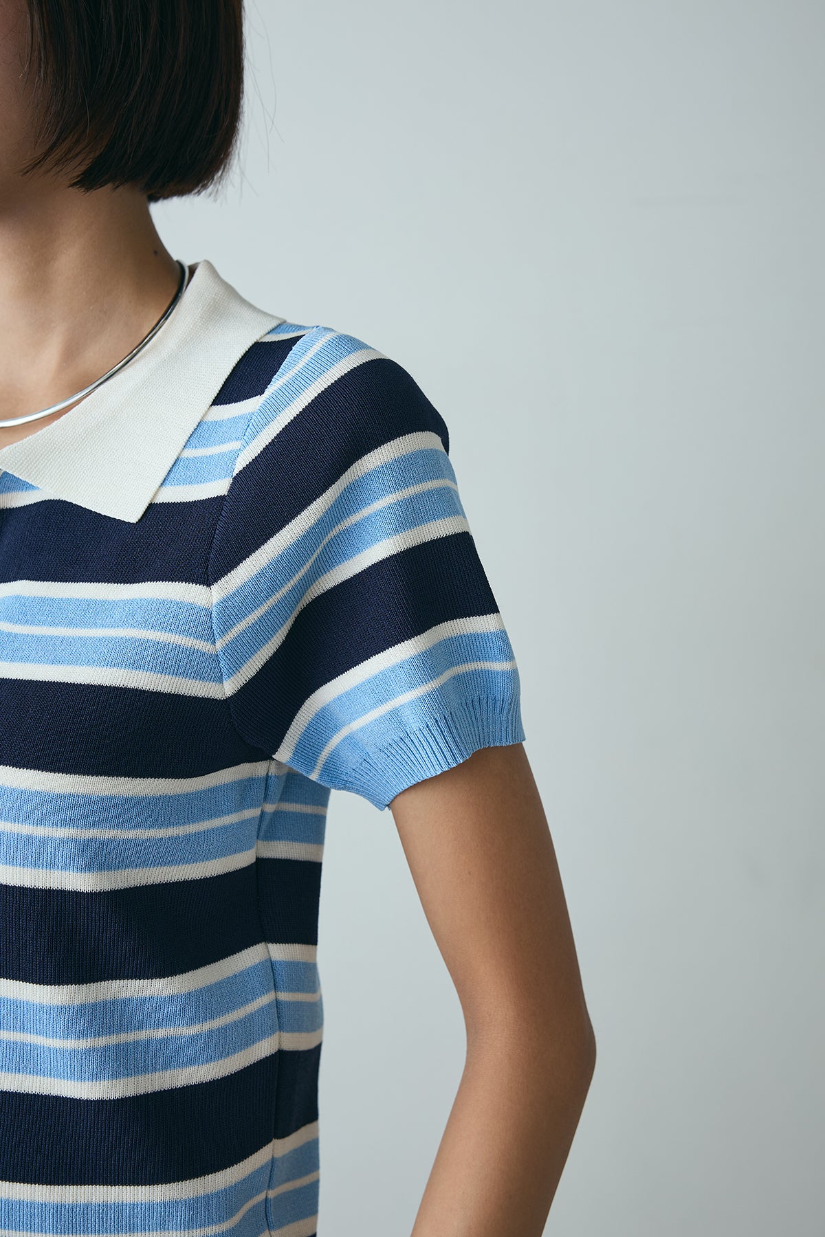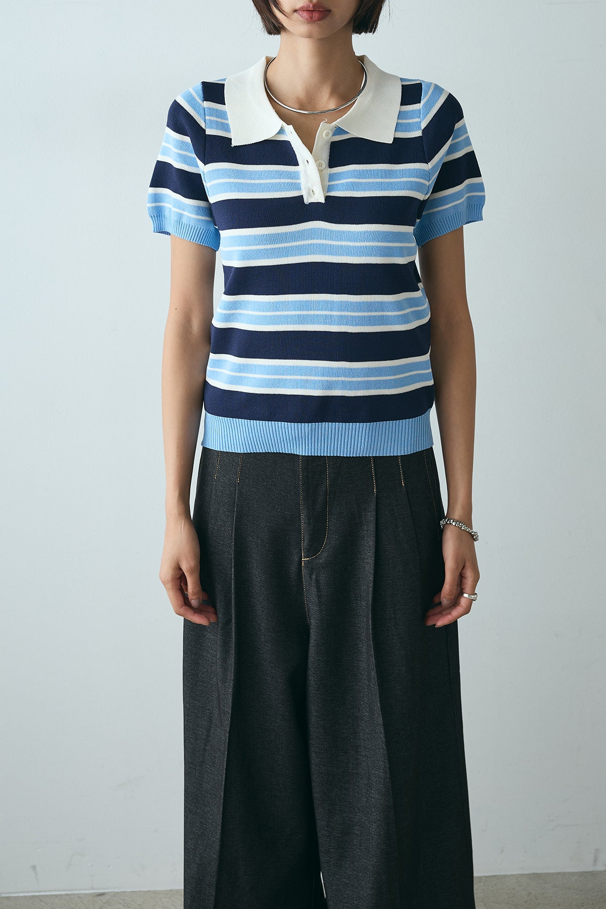 カラフルなマルチボーダーが爽やかな印象を与えるニットポロ。
