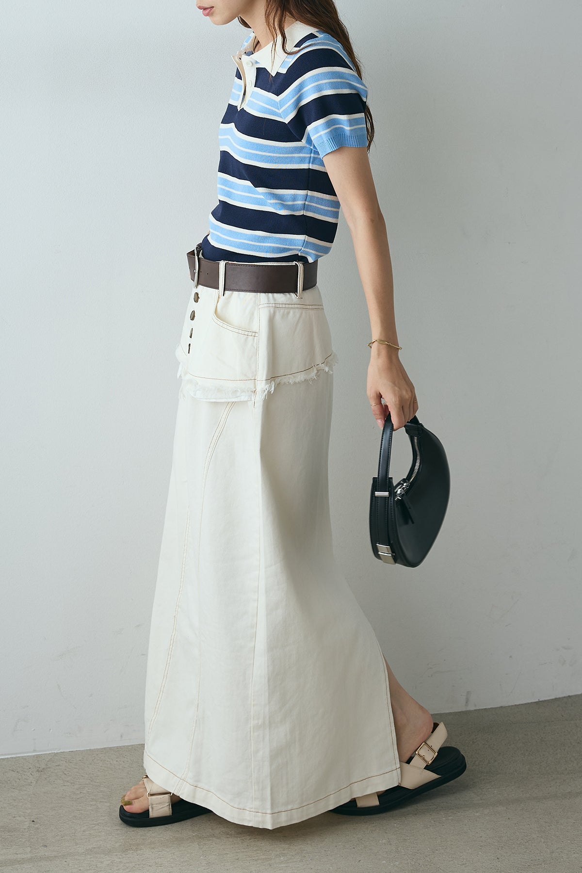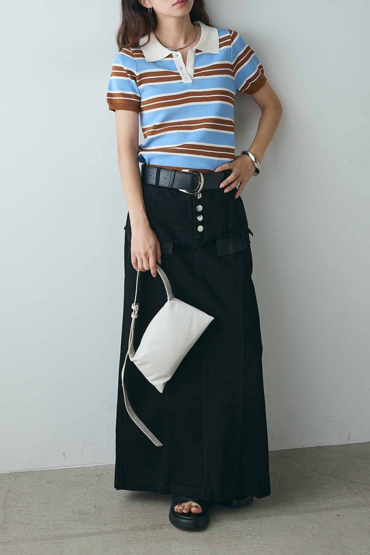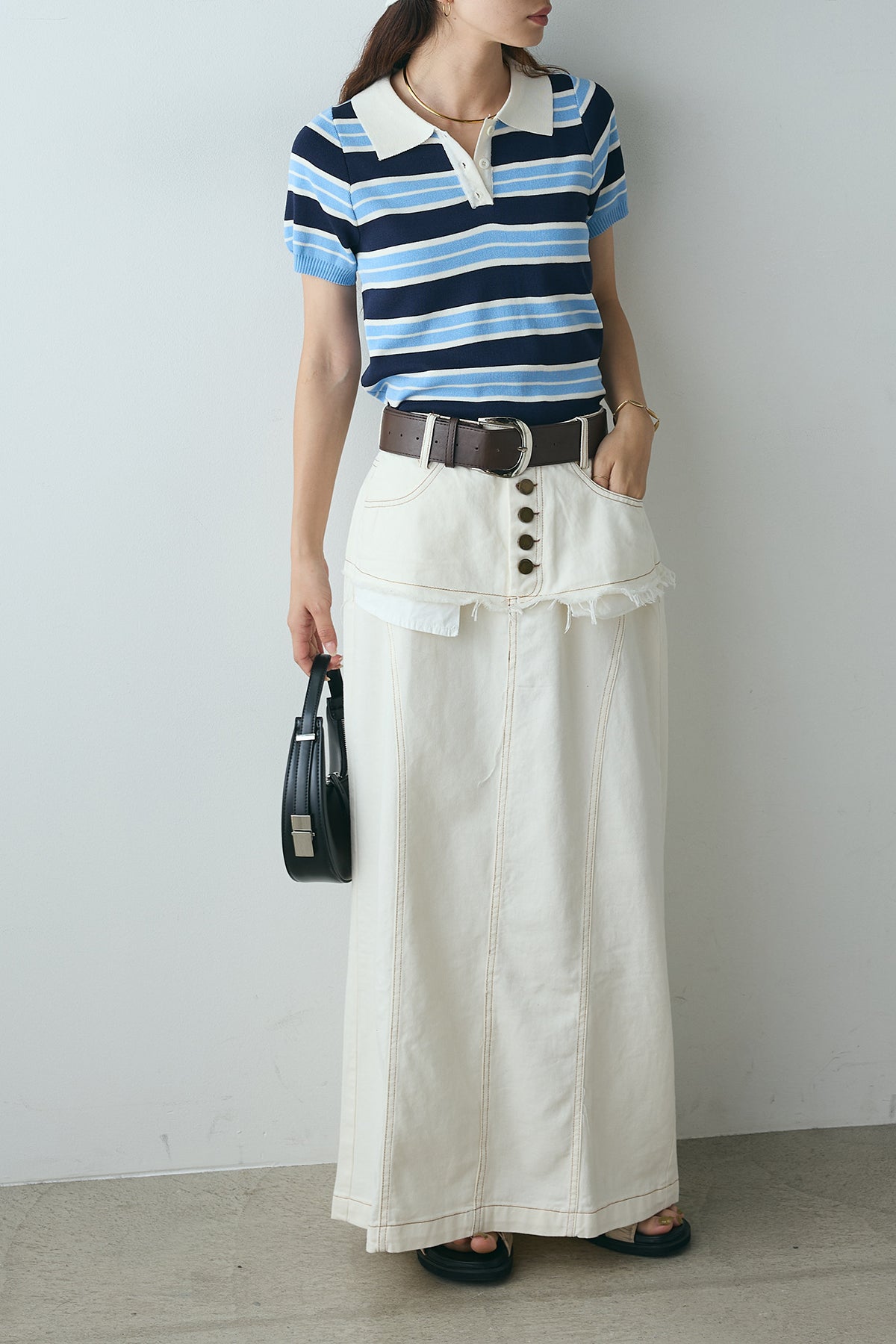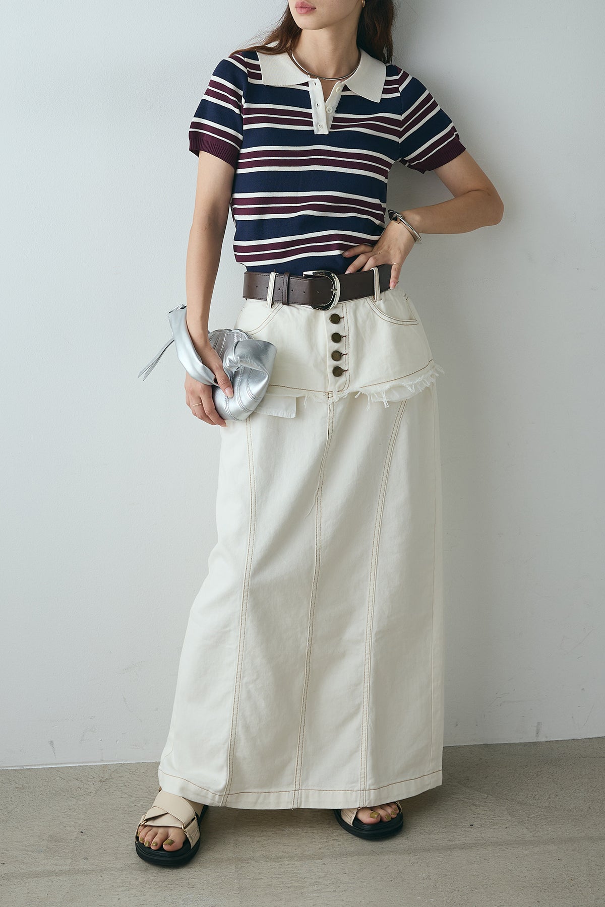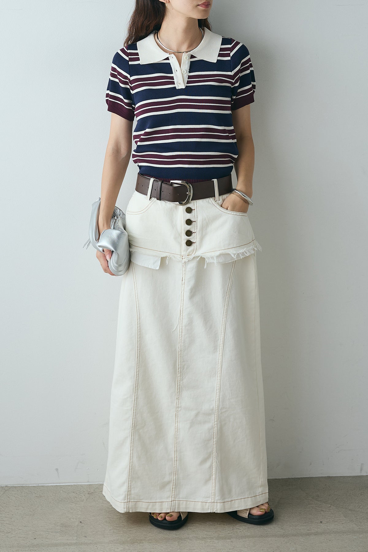 カラフルなマルチボーダーが爽やかな印象を与えるニットポロ。