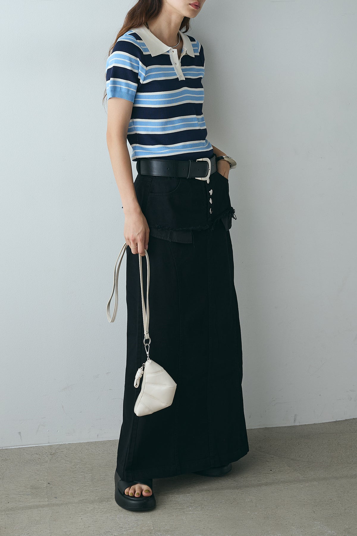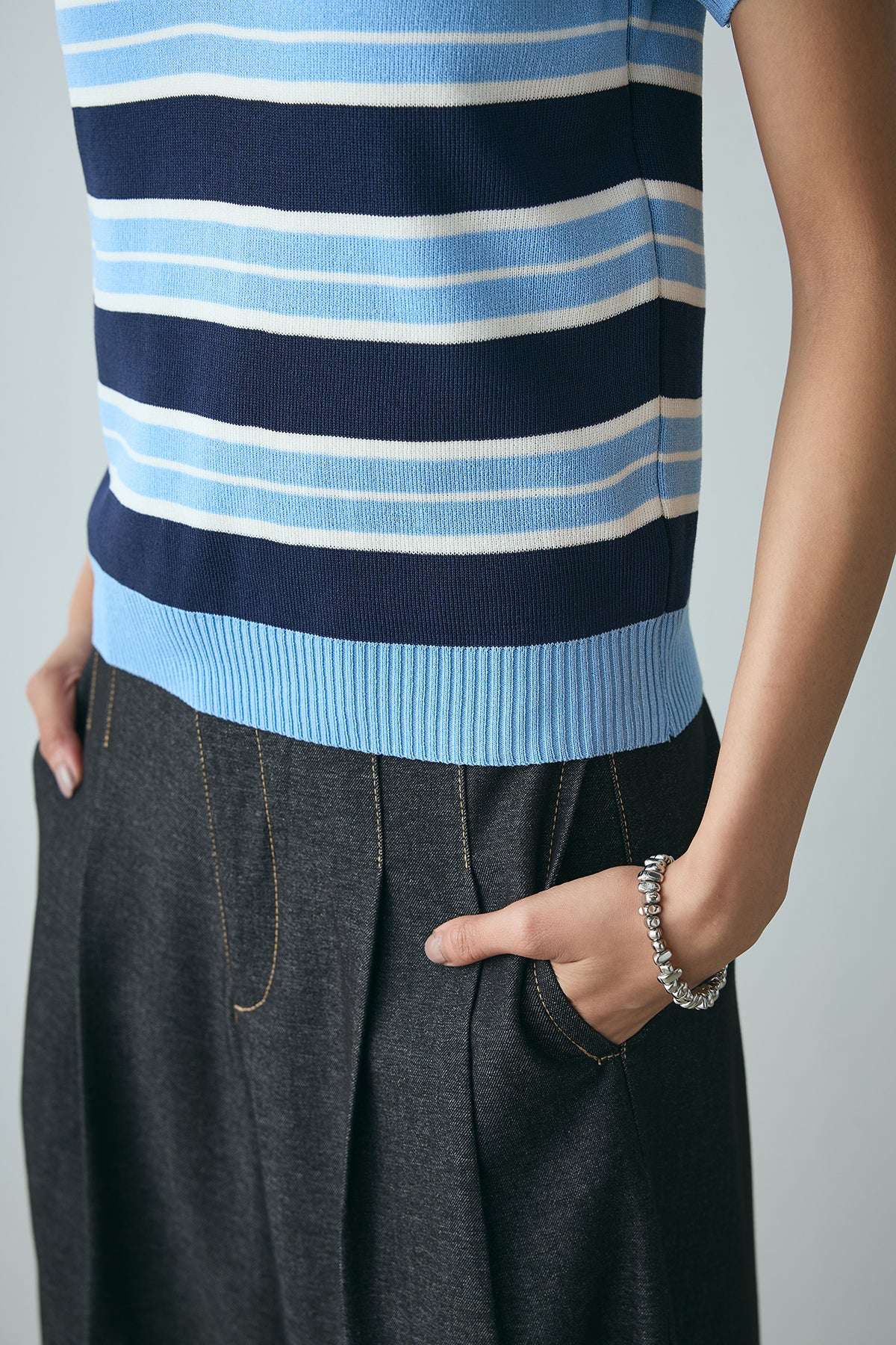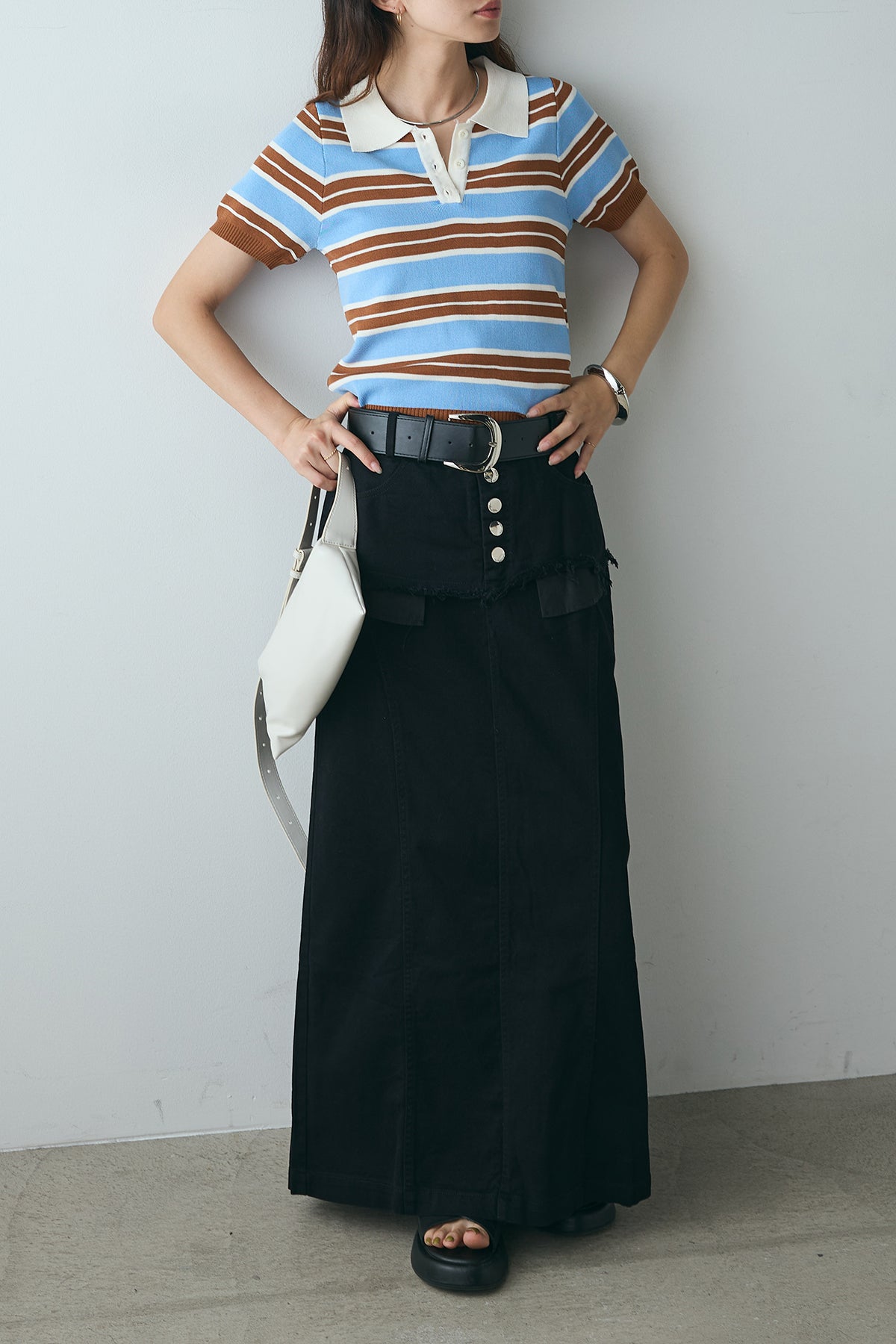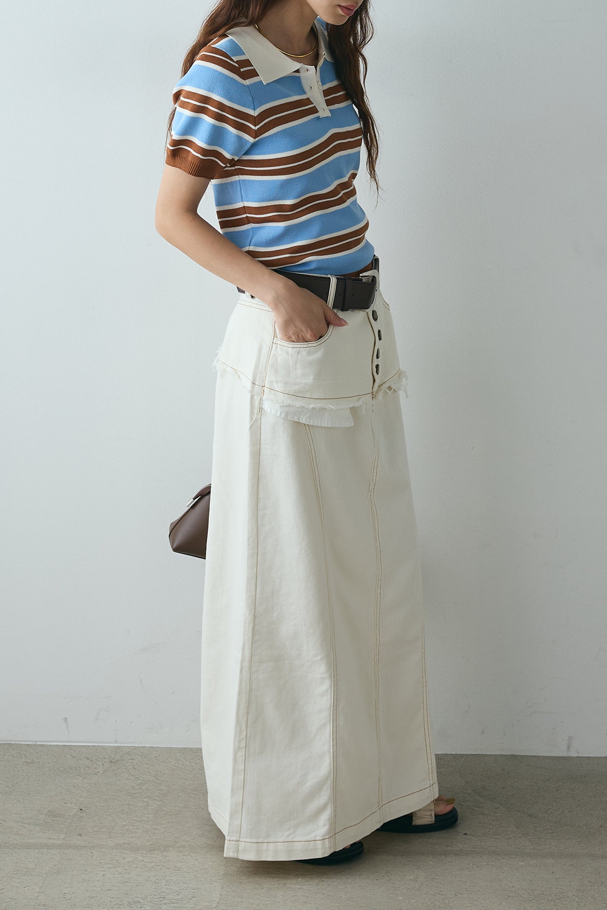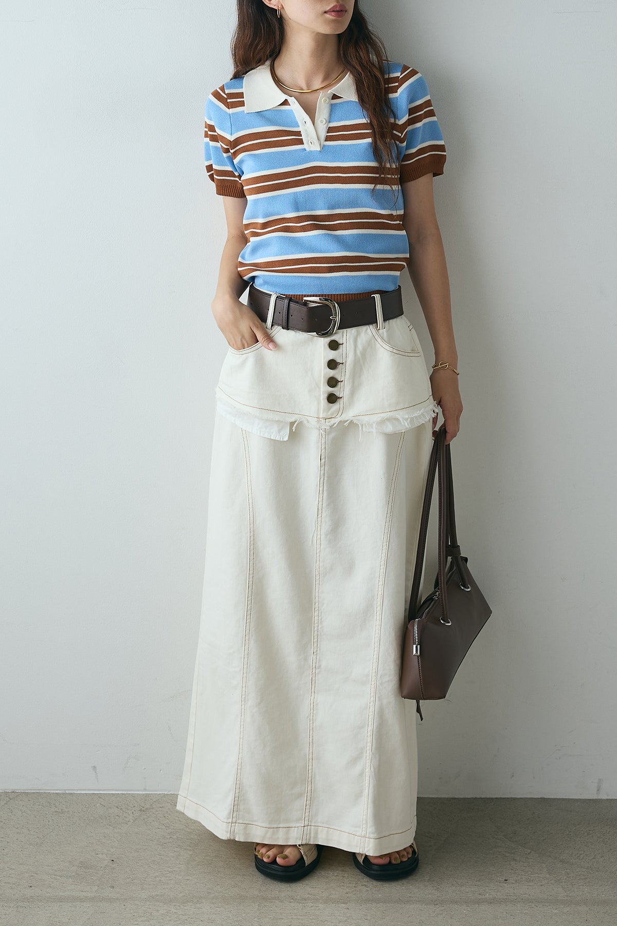 カラフルなマルチボーダーが爽やかな印象を与えるニットポロ。