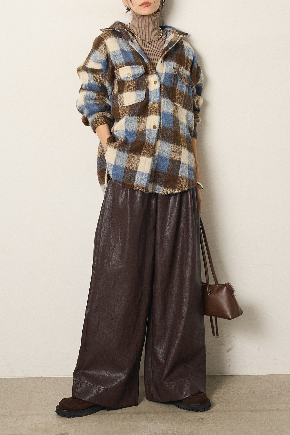 [SET]起毛チェック柄ポケットアウター+ベルト付きレザーライクタックパンツ+リブニットシームレスタートルプルオーバー(3set)