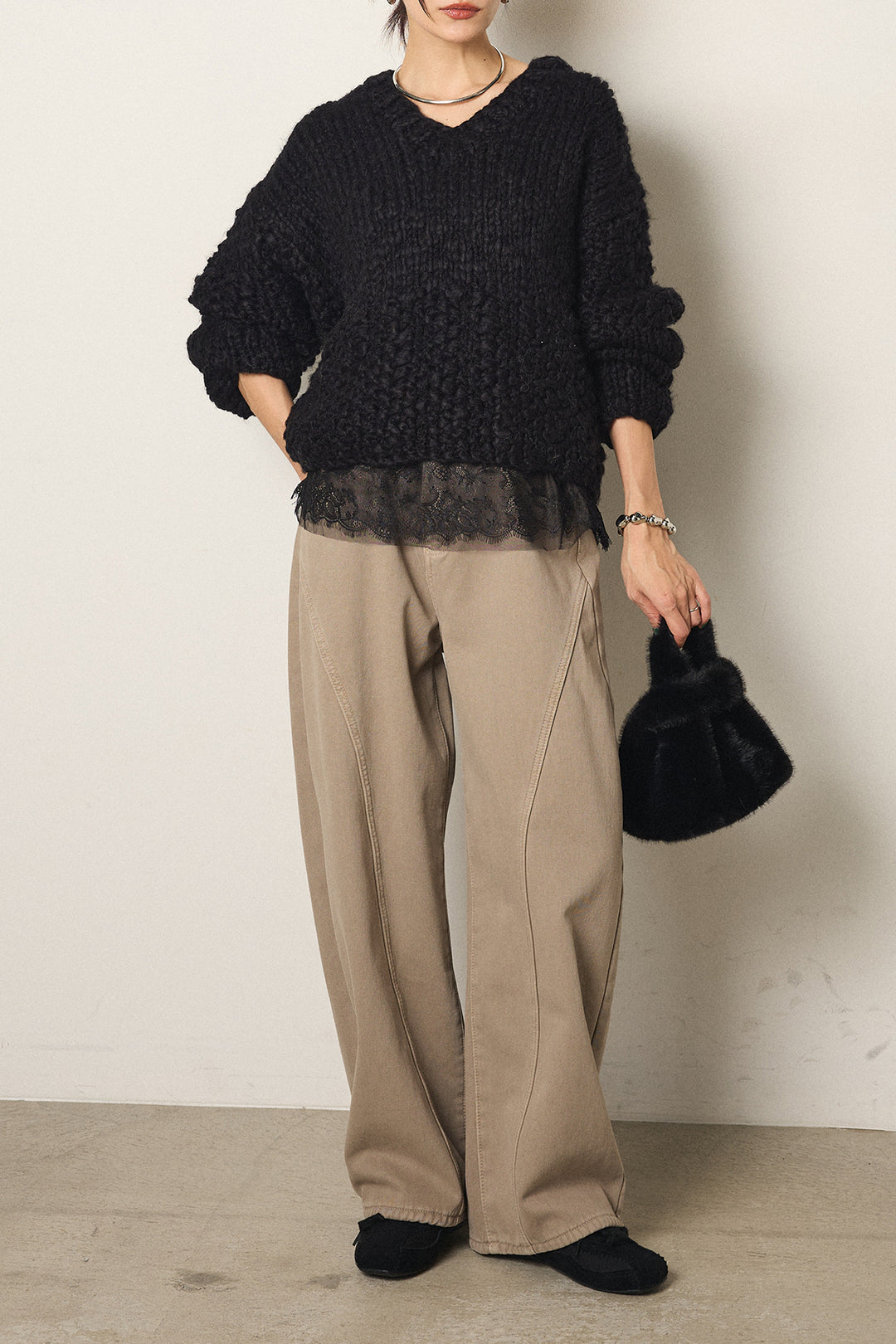 [SET]Vネックハンド編みニットトップス+ベルト付きカジュアルカーブワイドパンツ(2set)