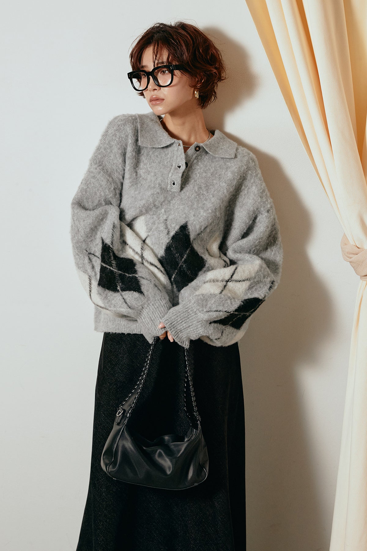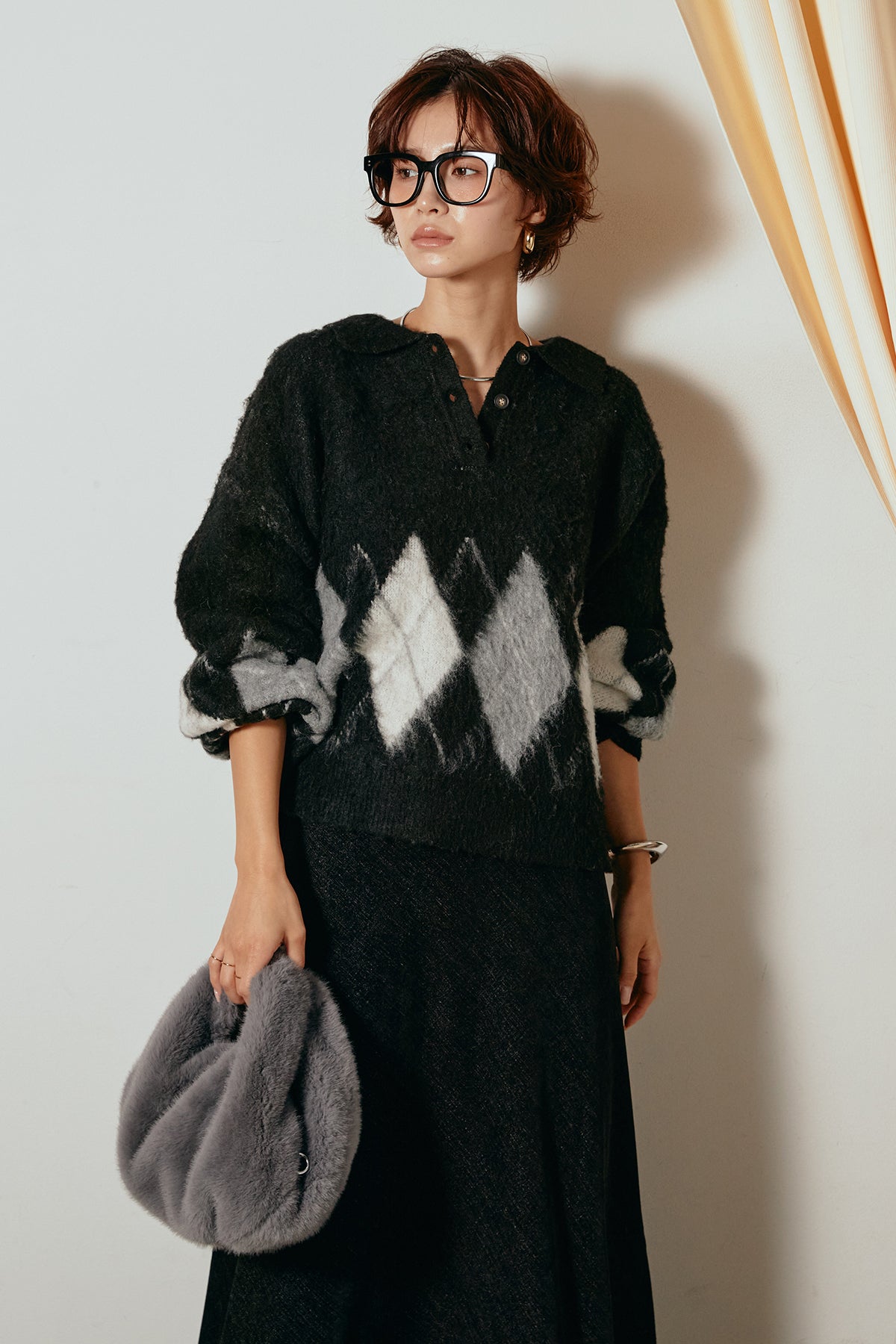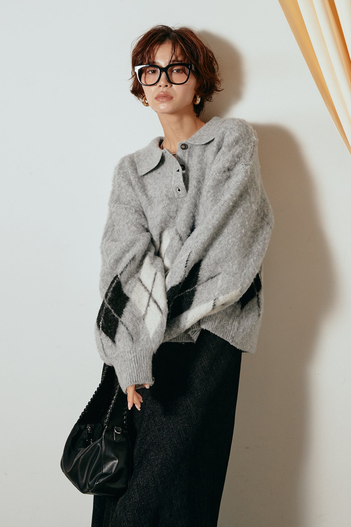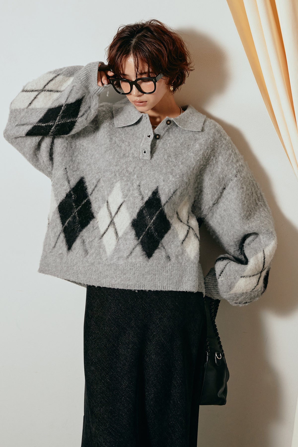 ふんわりとした素材感が魅力のアーガイル柄ポロニットトップス。クラシックな柄を大きめに配置し、シンプルながらも存在感のある一枚に仕上げました。襟付きのデザインが程よいきちんと感をプラスし、カジュアルからモードなスタイリングまで幅広く活躍。柔らかく軽い着心地で、シーズンムードを高めながらデイリーに取り入れやすいアイテムです。