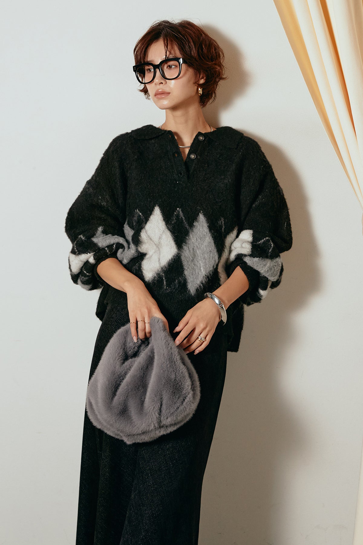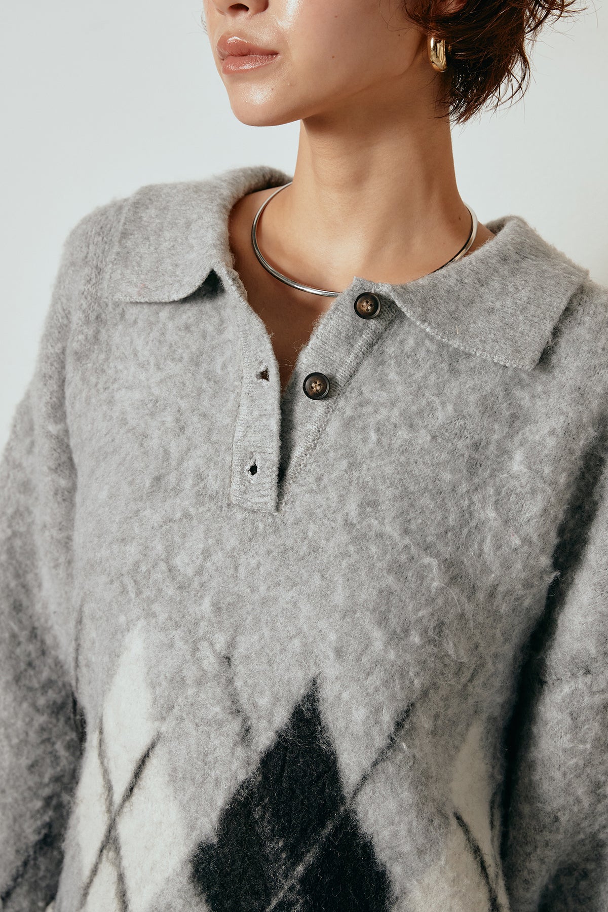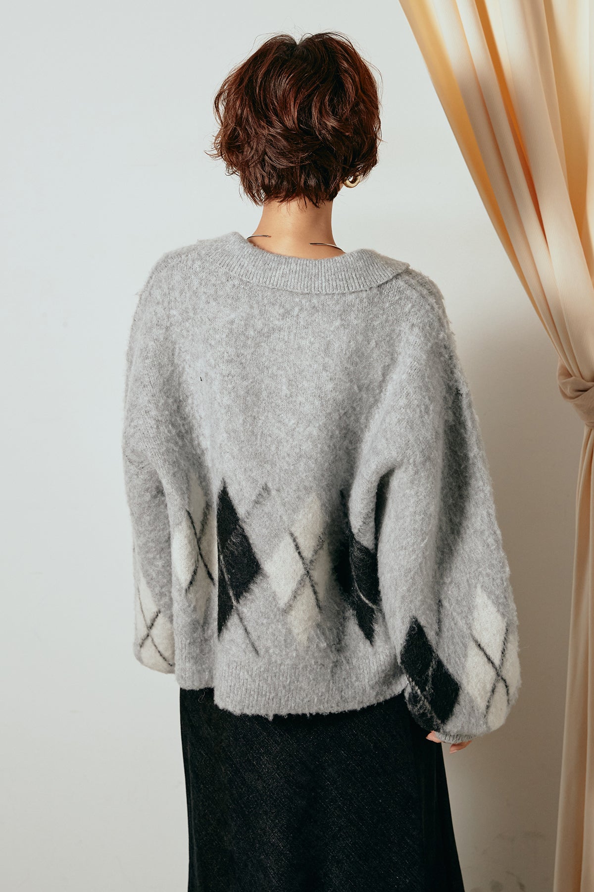 ふんわりとした素材感が魅力のアーガイル柄ポロニットトップス。クラシックな柄を大きめに配置し、シンプルながらも存在感のある一枚に仕上げました。襟付きのデザインが程よいきちんと感をプラスし、カジュアルからモードなスタイリングまで幅広く活躍。柔らかく軽い着心地で、シーズンムードを高めながらデイリーに取り入れやすいアイテムです。