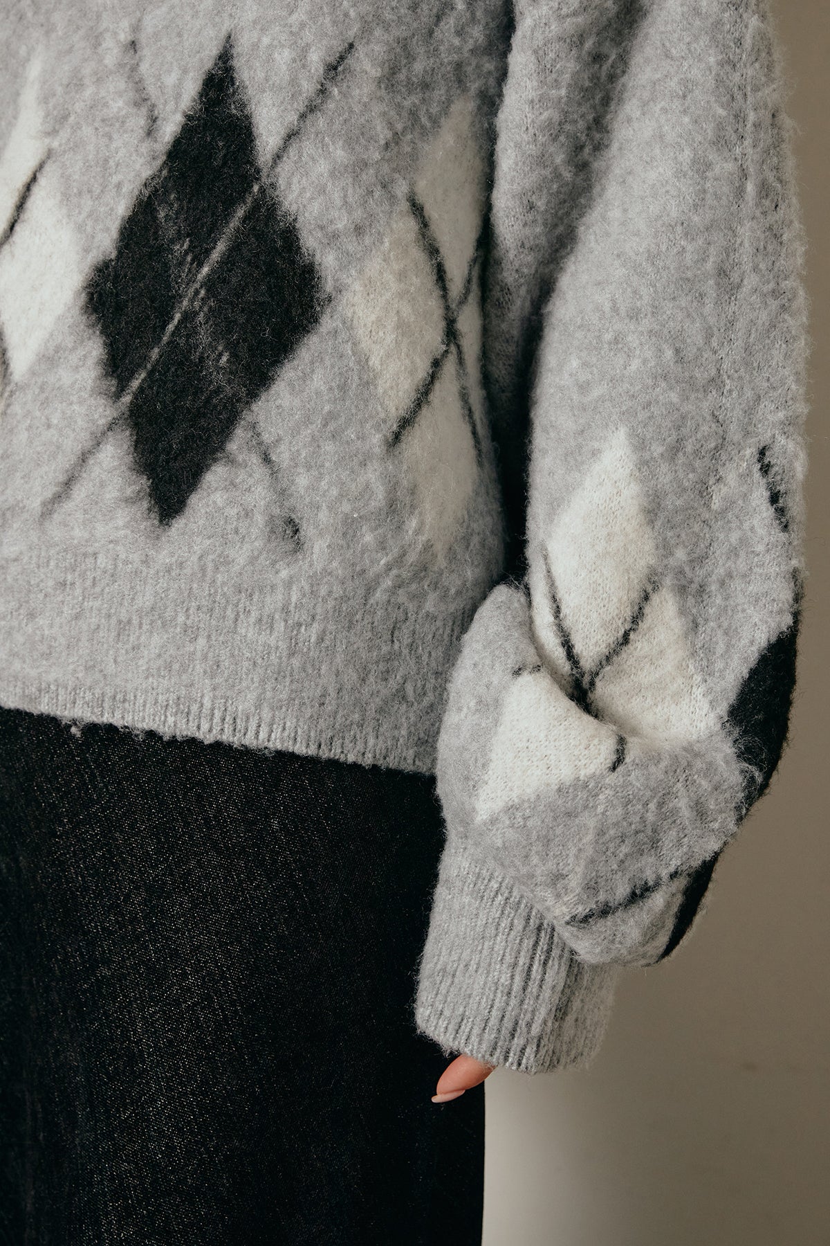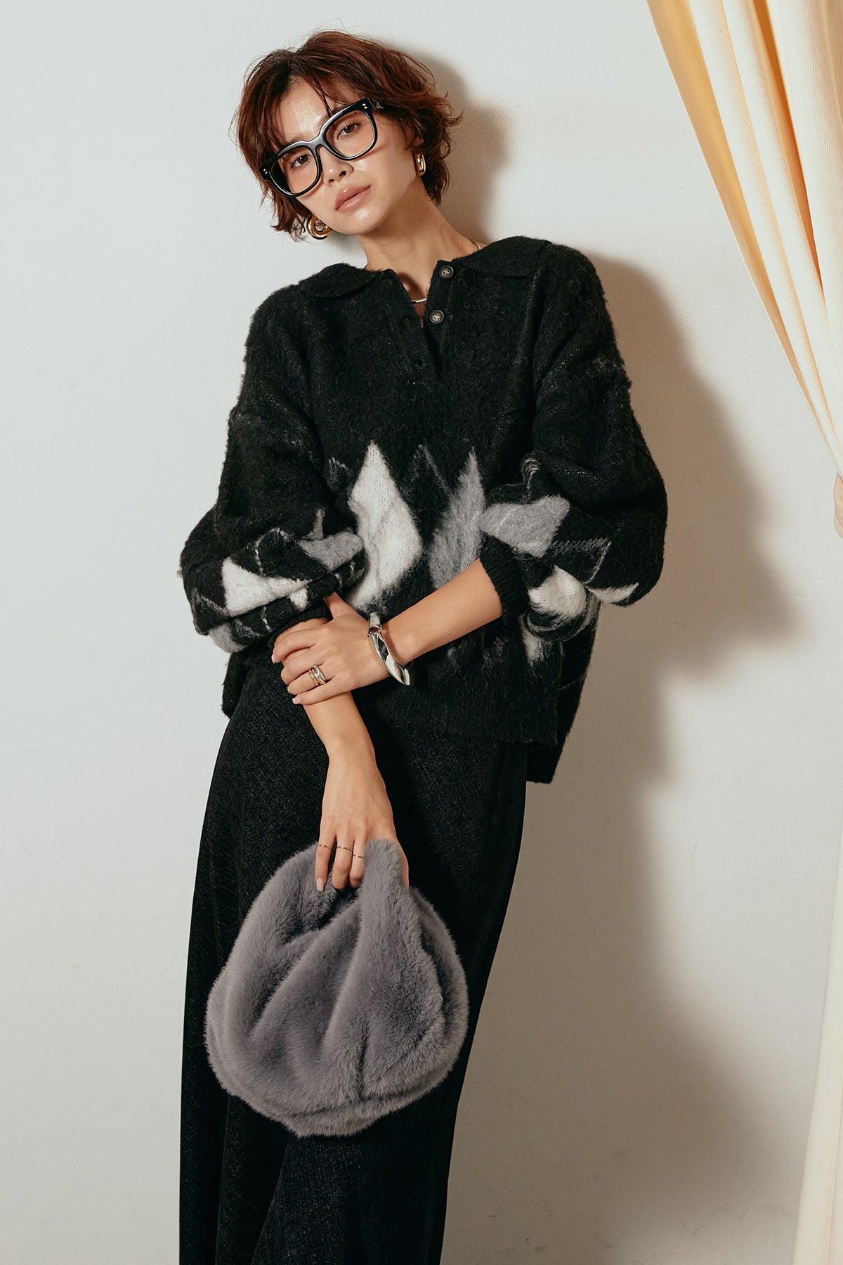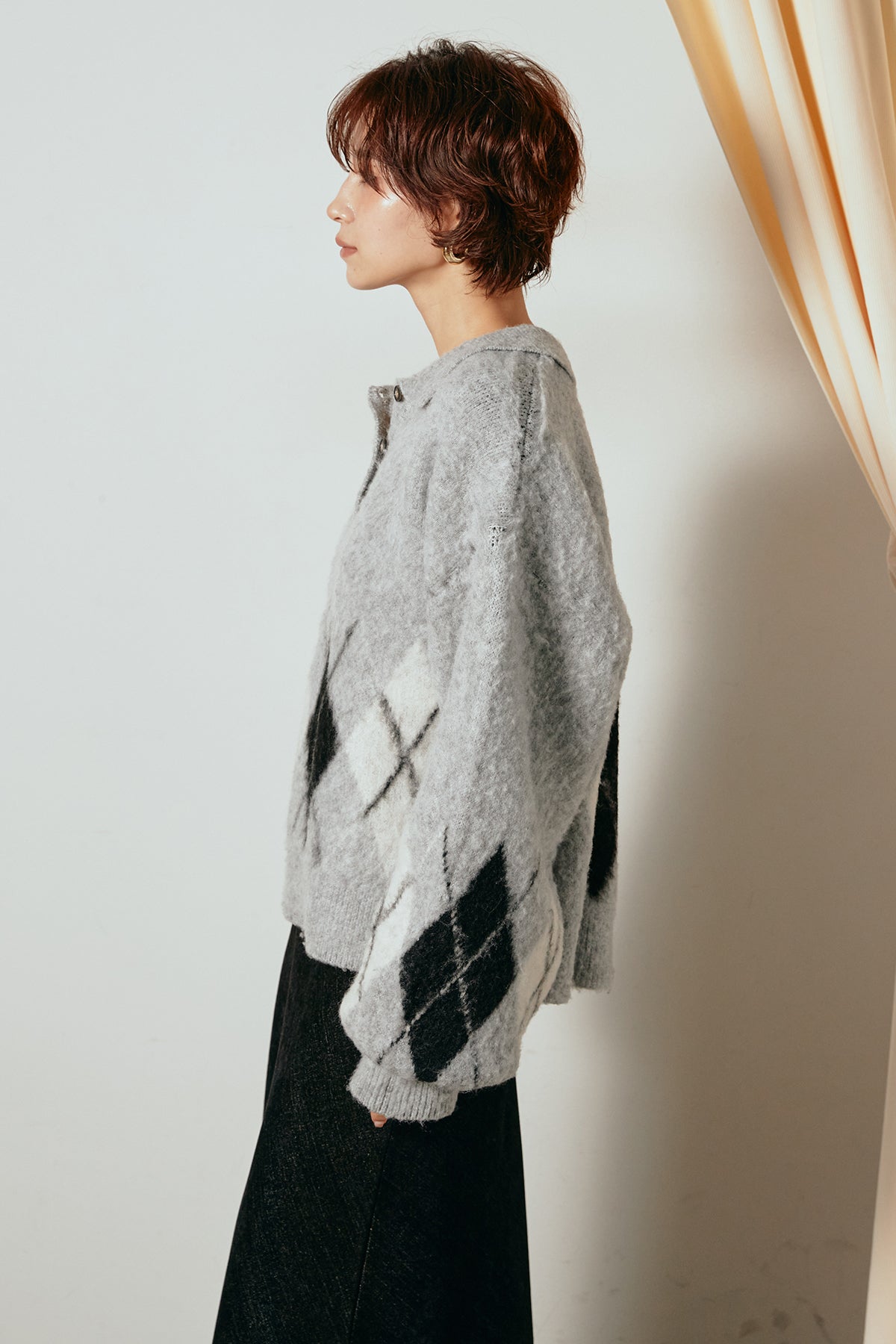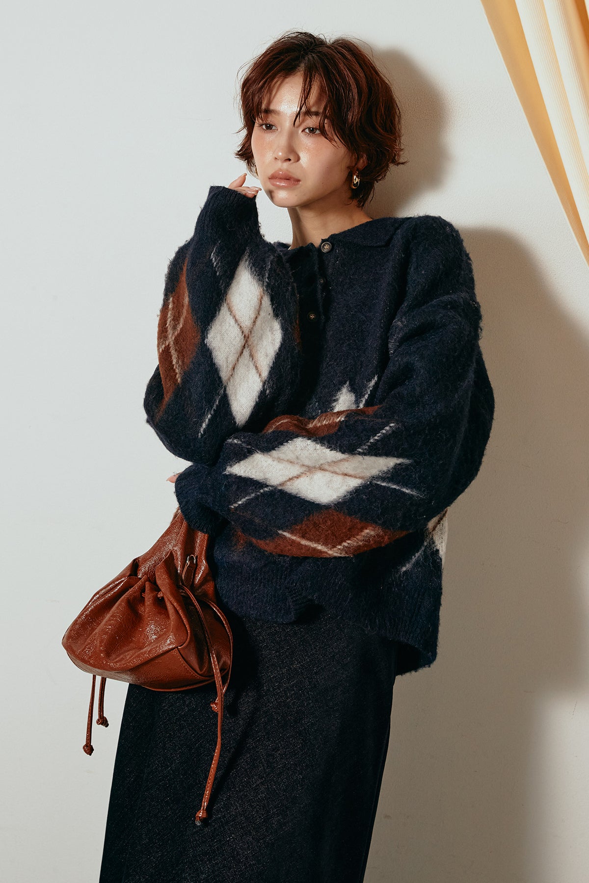 ふんわりとした素材感が魅力のアーガイル柄ポロニットトップス。クラシックな柄を大きめに配置し、シンプルながらも存在感のある一枚に仕上げました。襟付きのデザインが程よいきちんと感をプラスし、カジュアルからモードなスタイリングまで幅広く活躍。柔らかく軽い着心地で、シーズンムードを高めながらデイリーに取り入れやすいアイテムです。