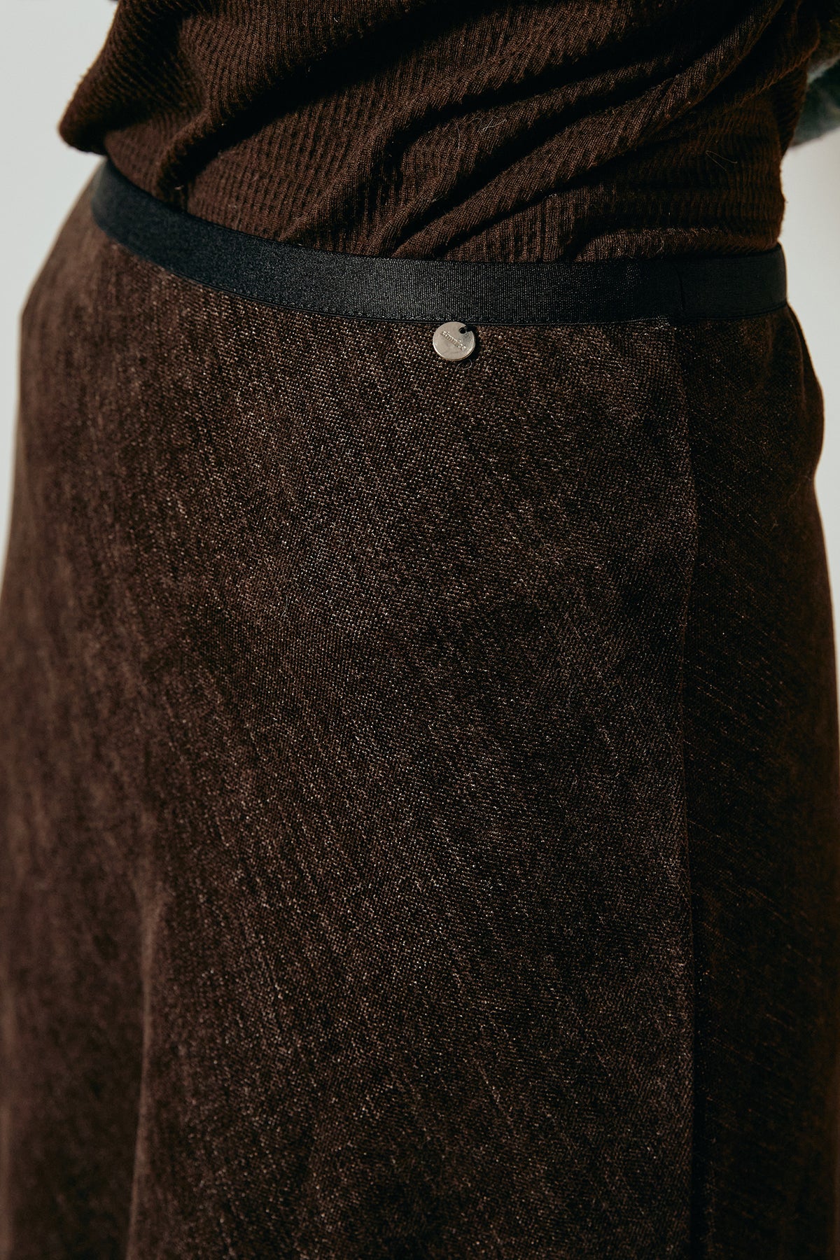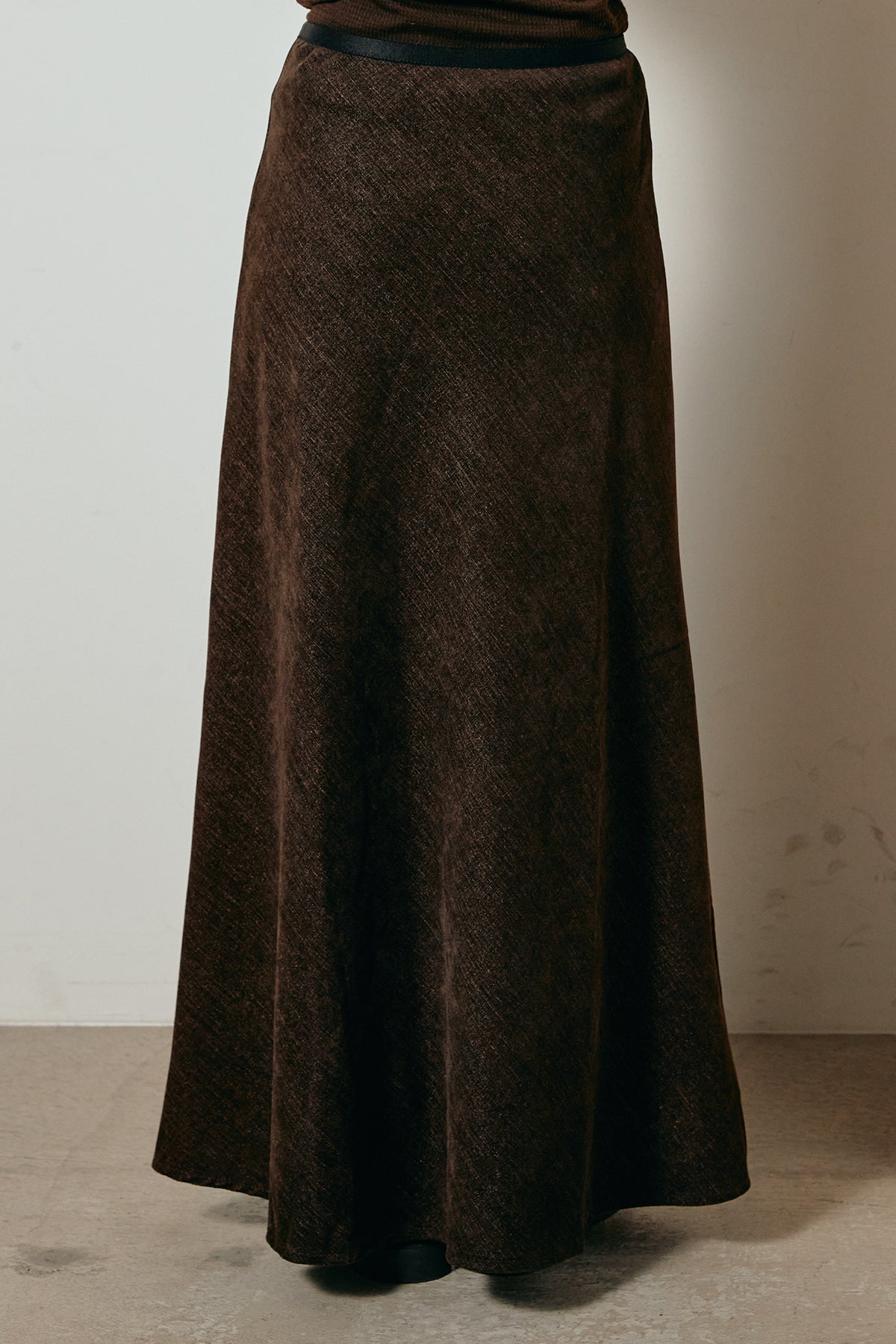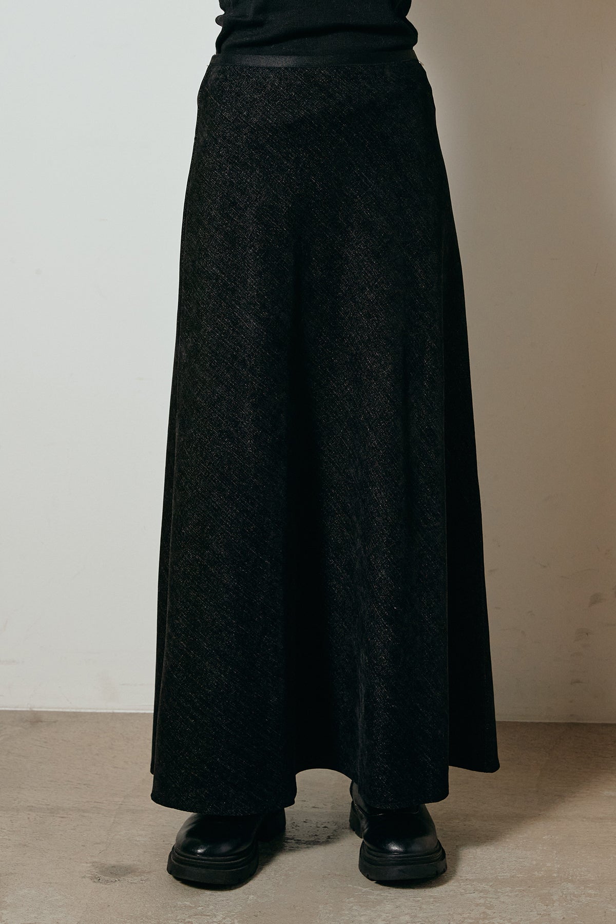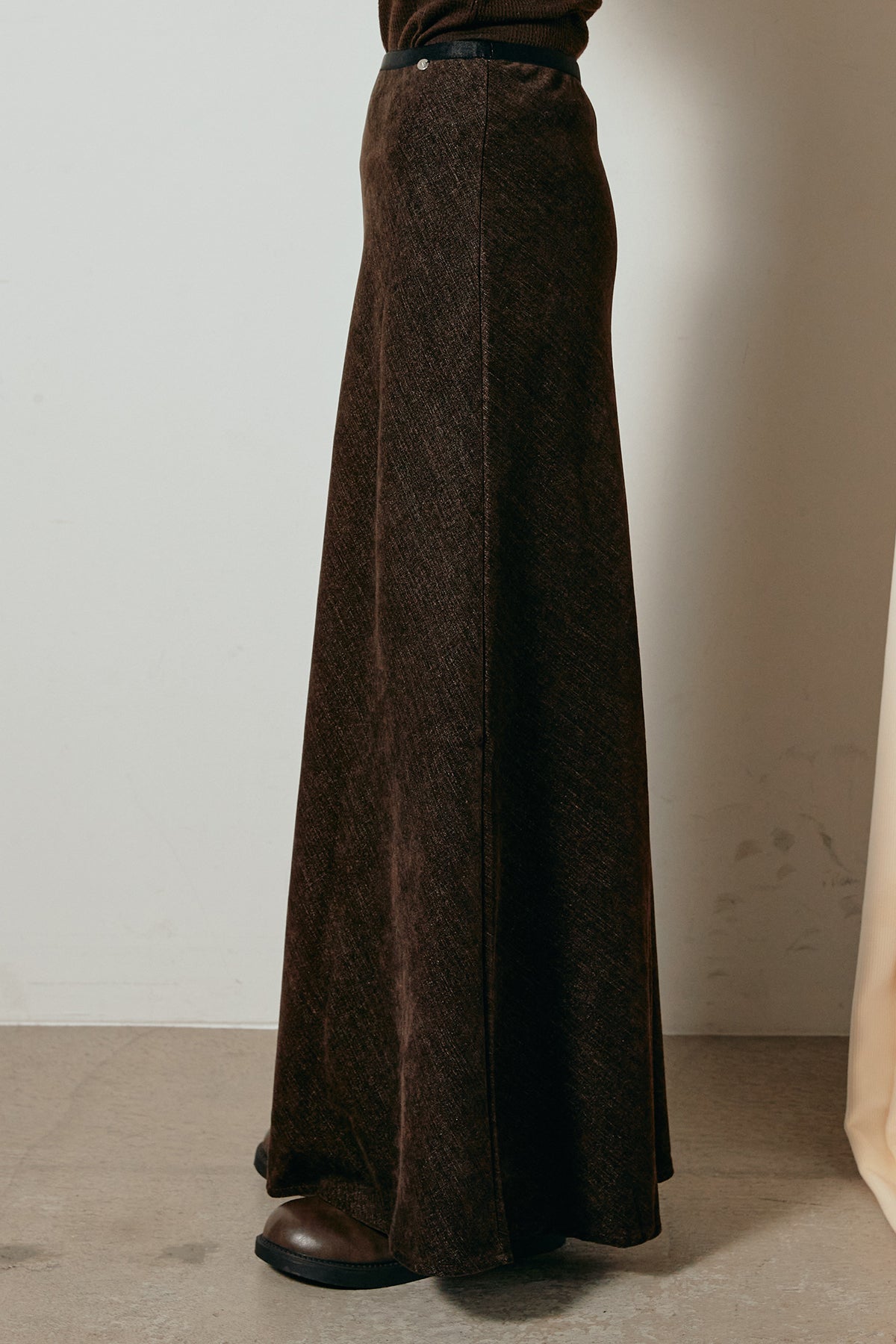 柔らかなスウェードライク素材で仕立てたロングスカート。程よい光沢感と落ち感があり、歩くたびに上品なニュアンスをプラスします。すっきりとしたウエストラインから裾に向かって広がるフレアシルエットが美しく、体のラインを拾いすぎない絶妙なバランス。ニットやシャツなど、さまざまなトップスと相性がよく、秋冬のコーディネートを格上げする一枚です。