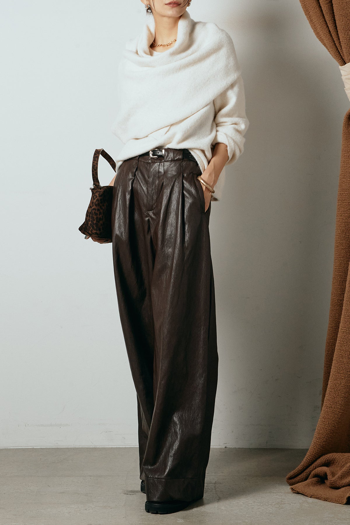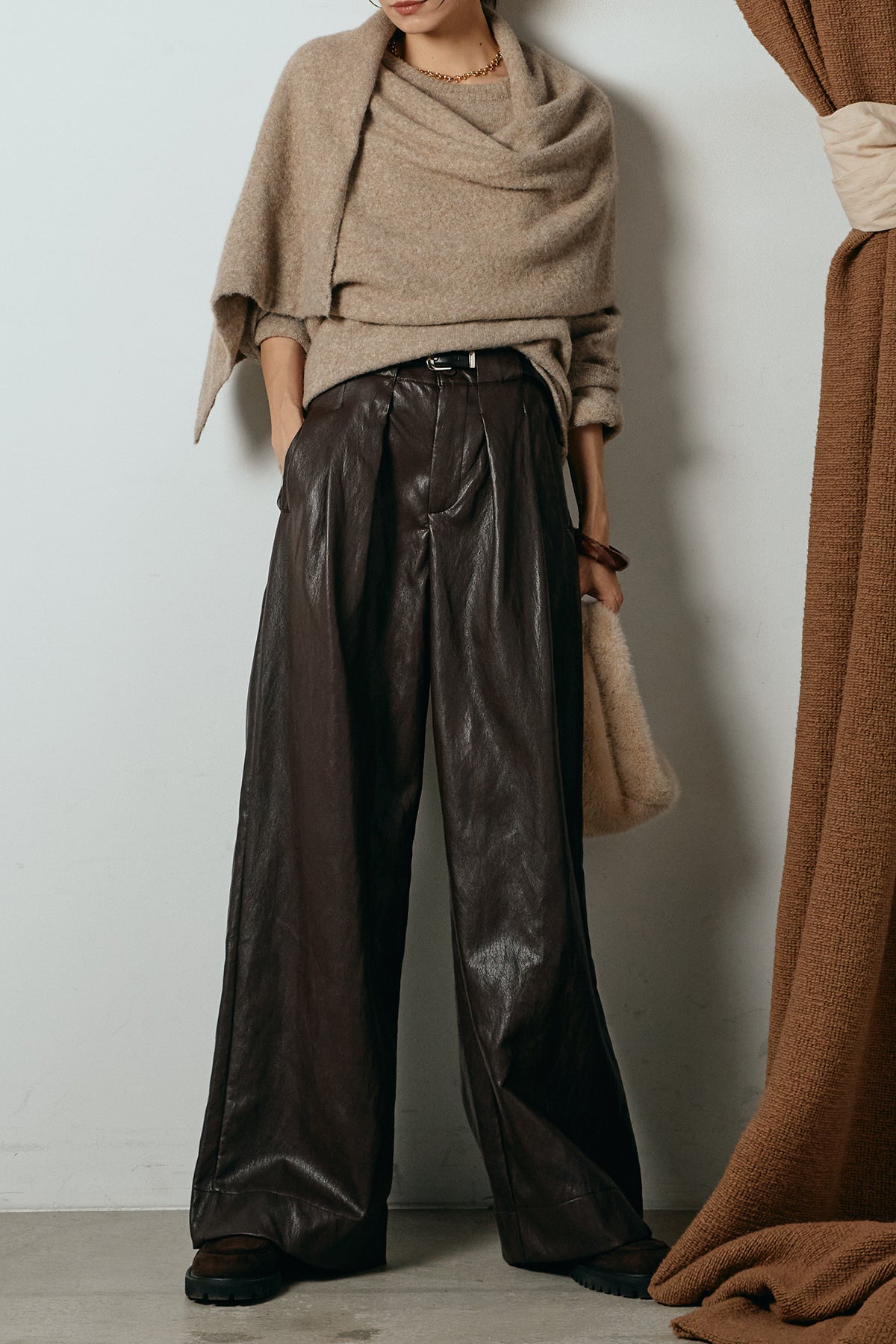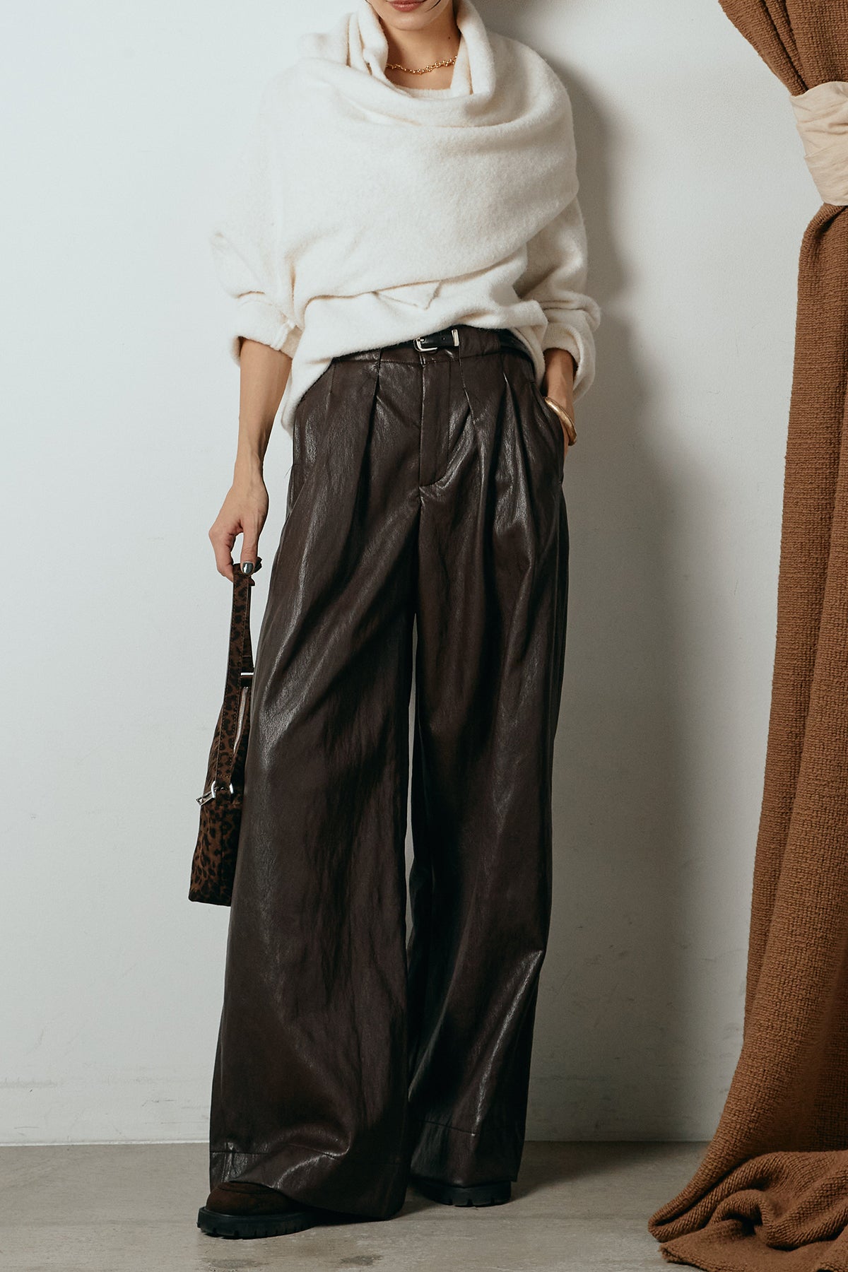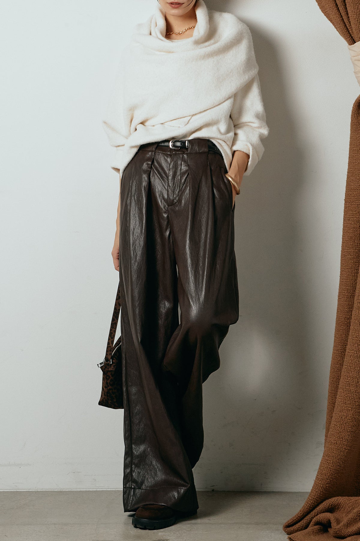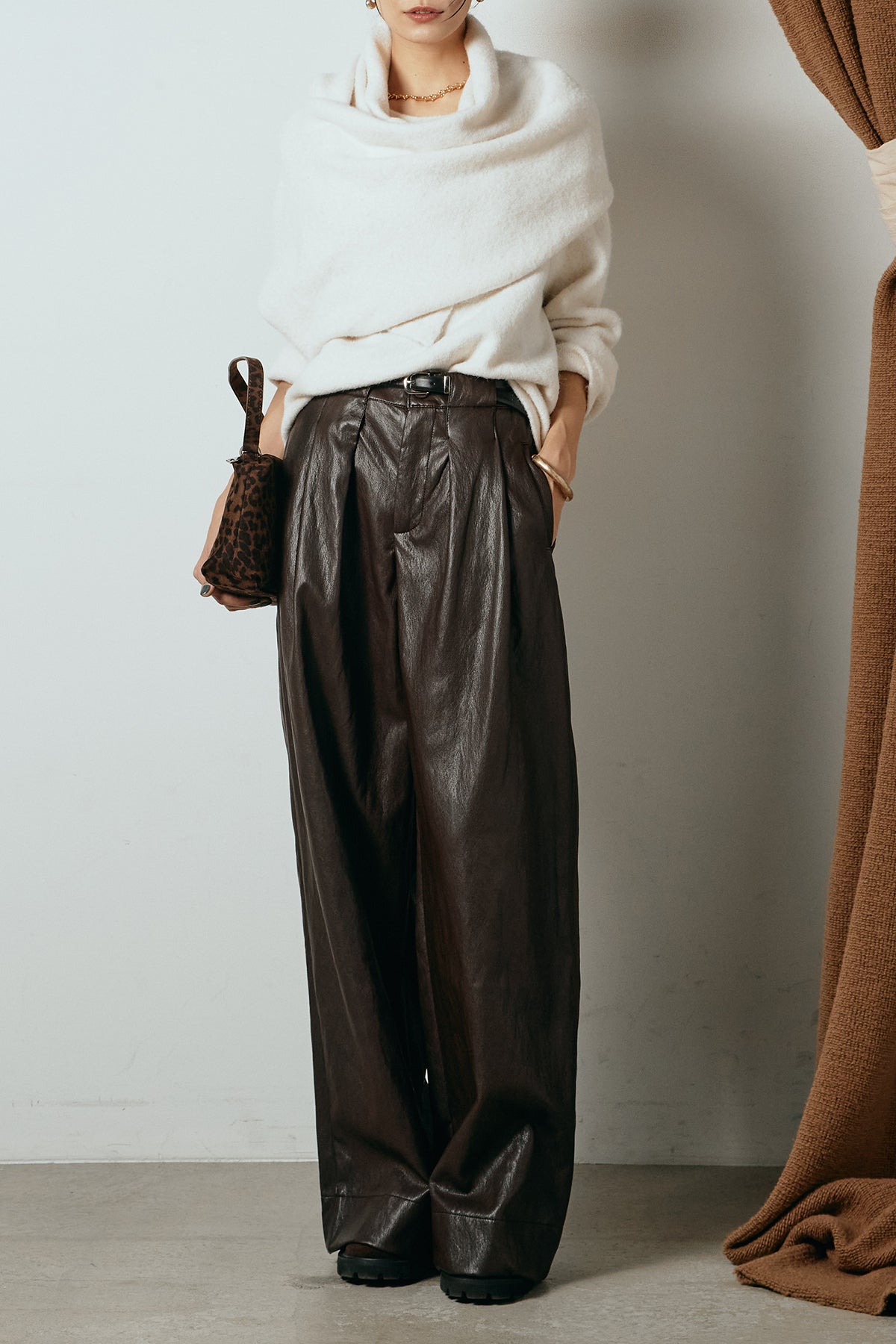 レザーライク素材で仕上げたタック入りパンツ。 ウエストまわりに程よいゆとりがあり、すっきりとしたバランスで着用できます。 付属ベルト付きで、トップスをインしたスタイルもまとまりやすい一本。 シンプルな合わせでもコーデに表情が出やすく、普段使いから外出まで幅広く活躍します。