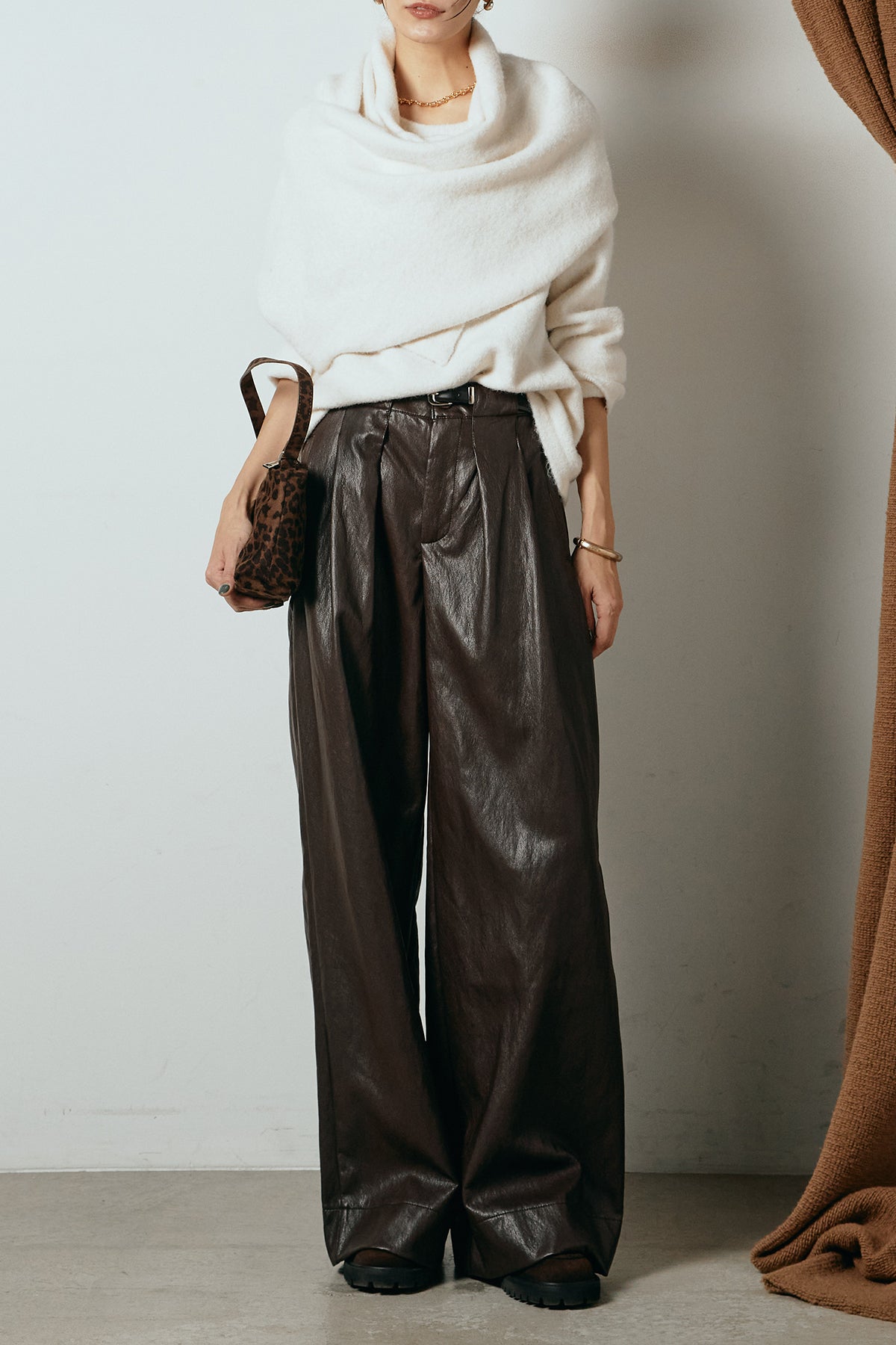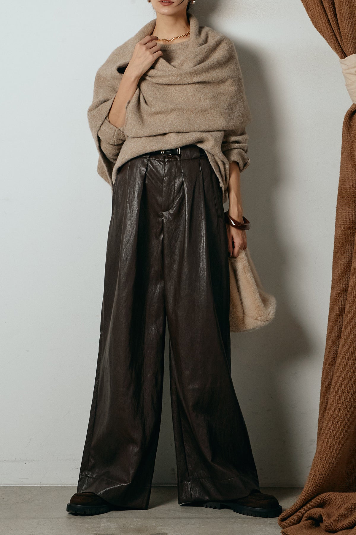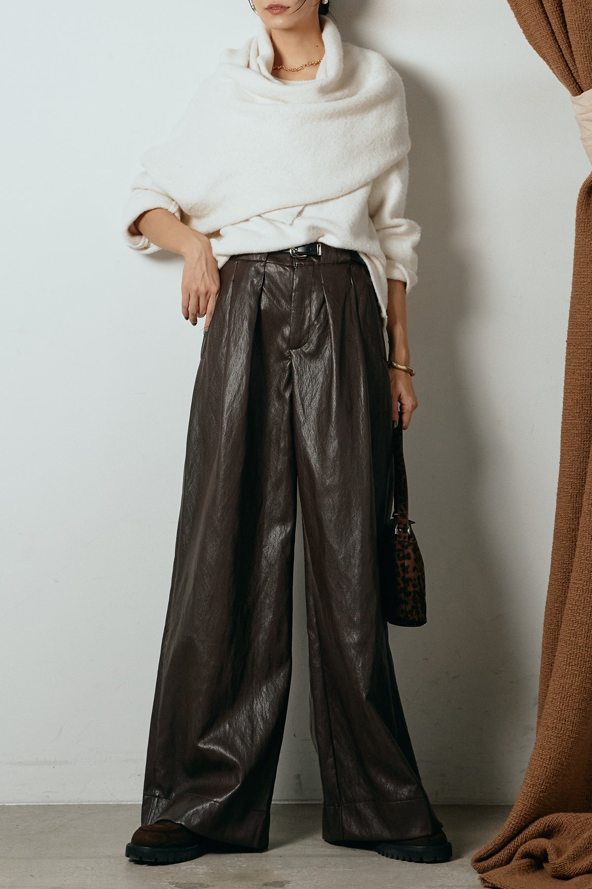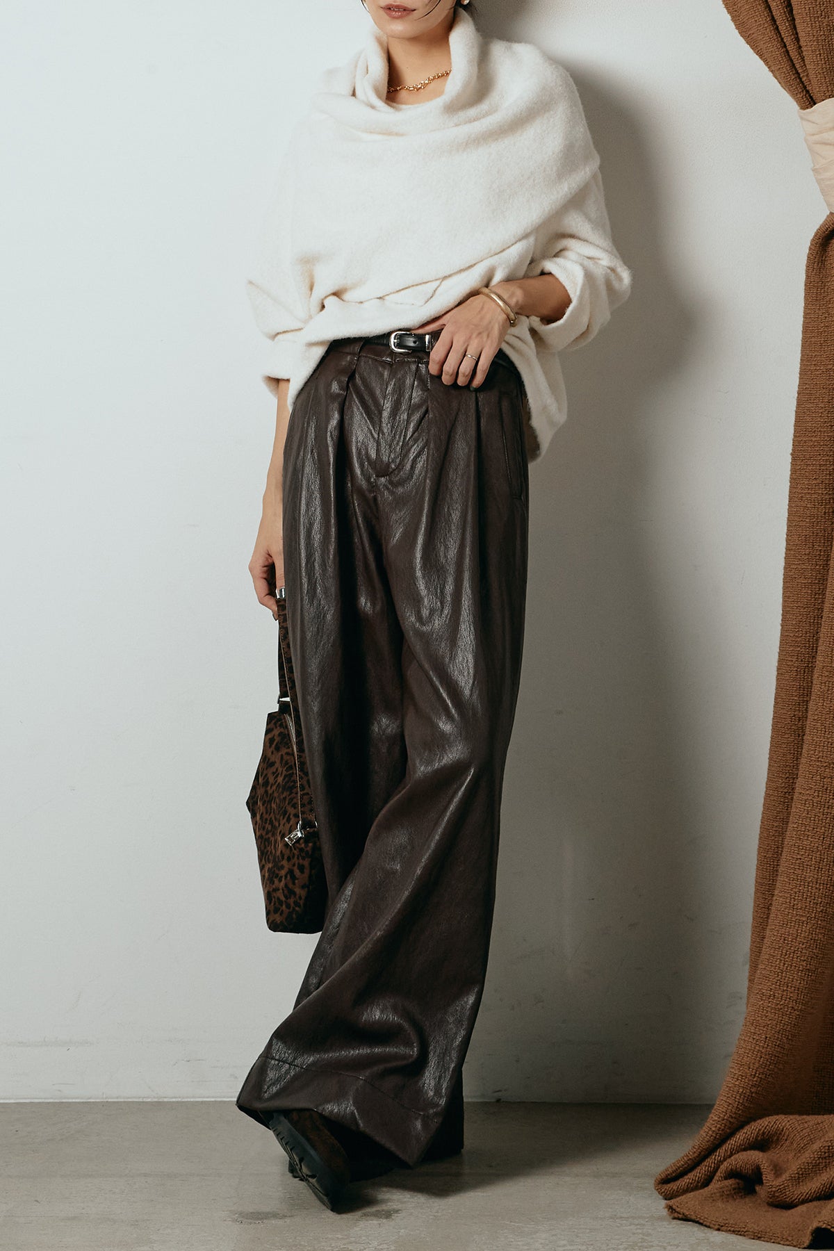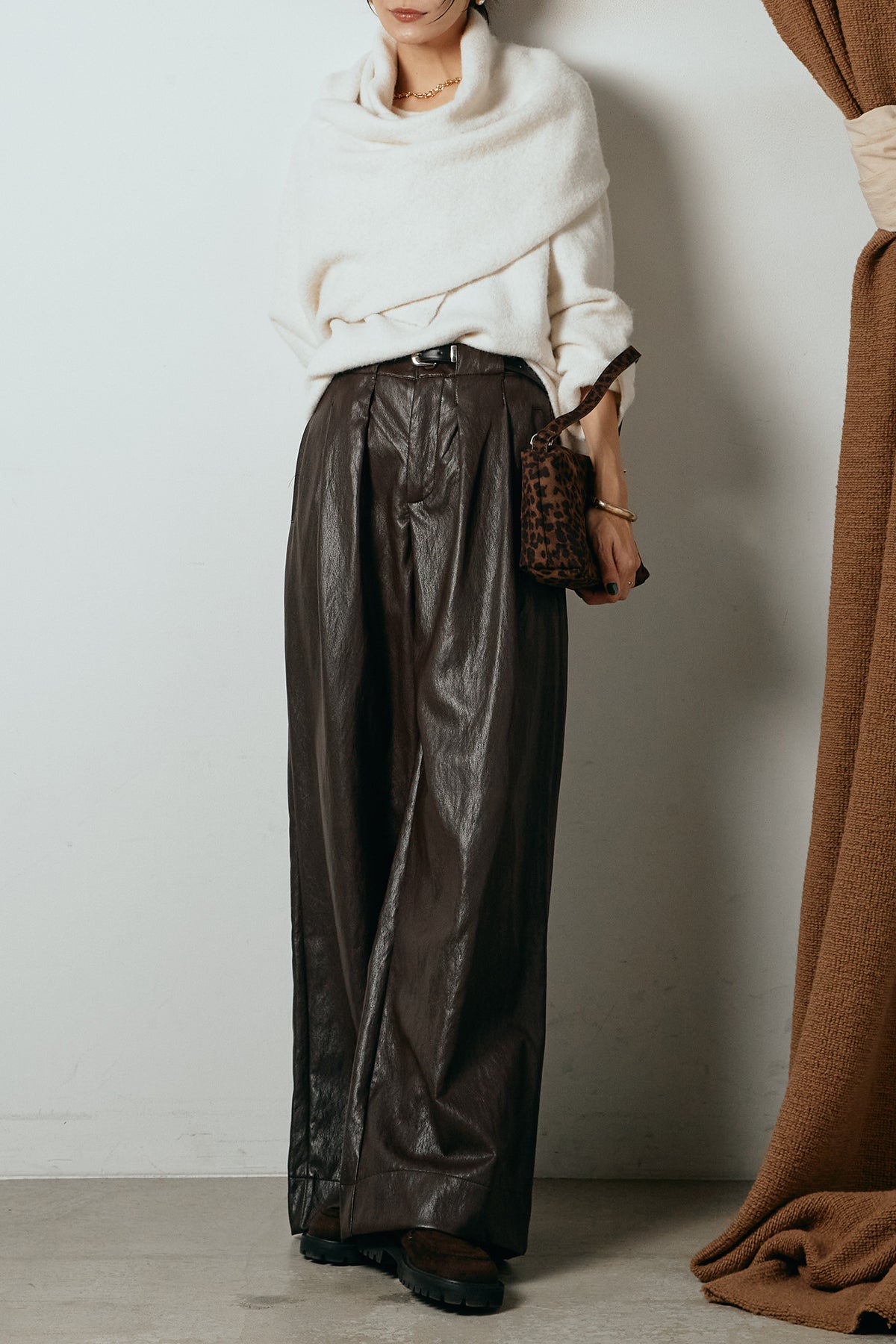 レザーライク素材で仕上げたタック入りパンツ。 ウエストまわりに程よいゆとりがあり、すっきりとしたバランスで着用できます。 付属ベルト付きで、トップスをインしたスタイルもまとまりやすい一本。 シンプルな合わせでもコーデに表情が出やすく、普段使いから外出まで幅広く活躍します。