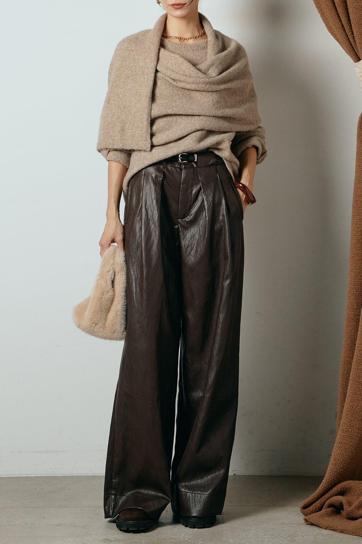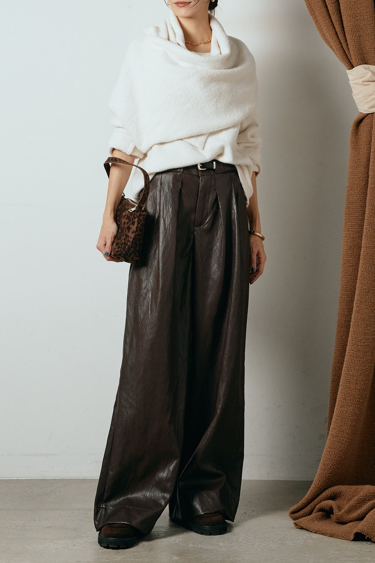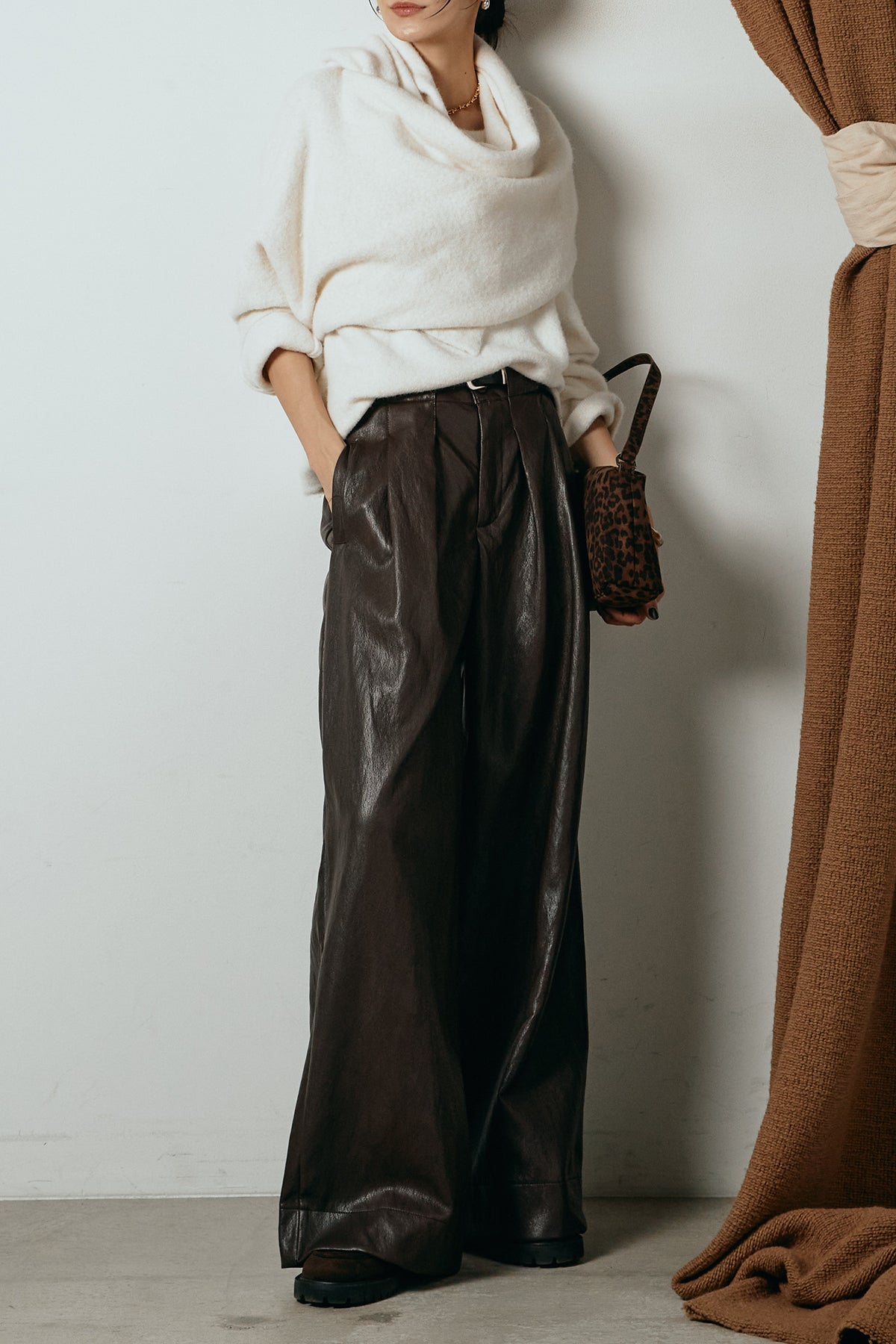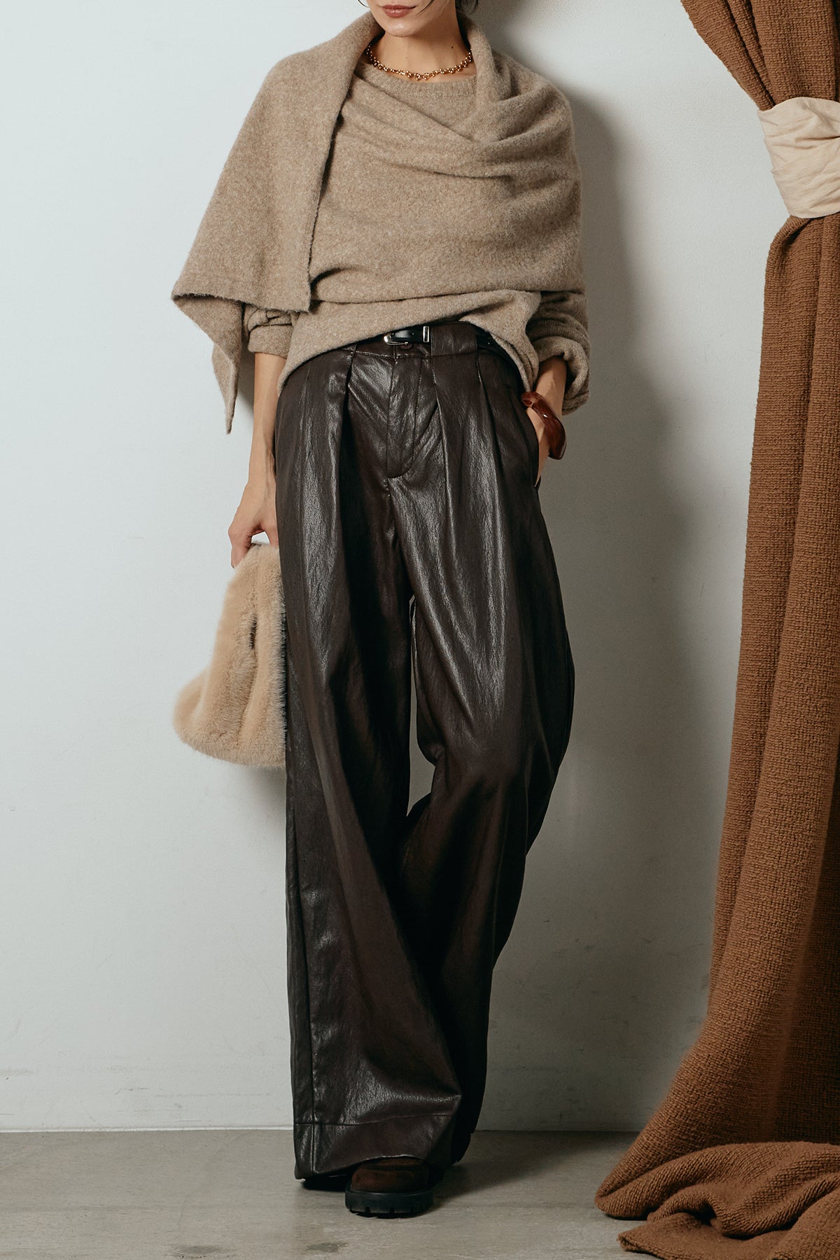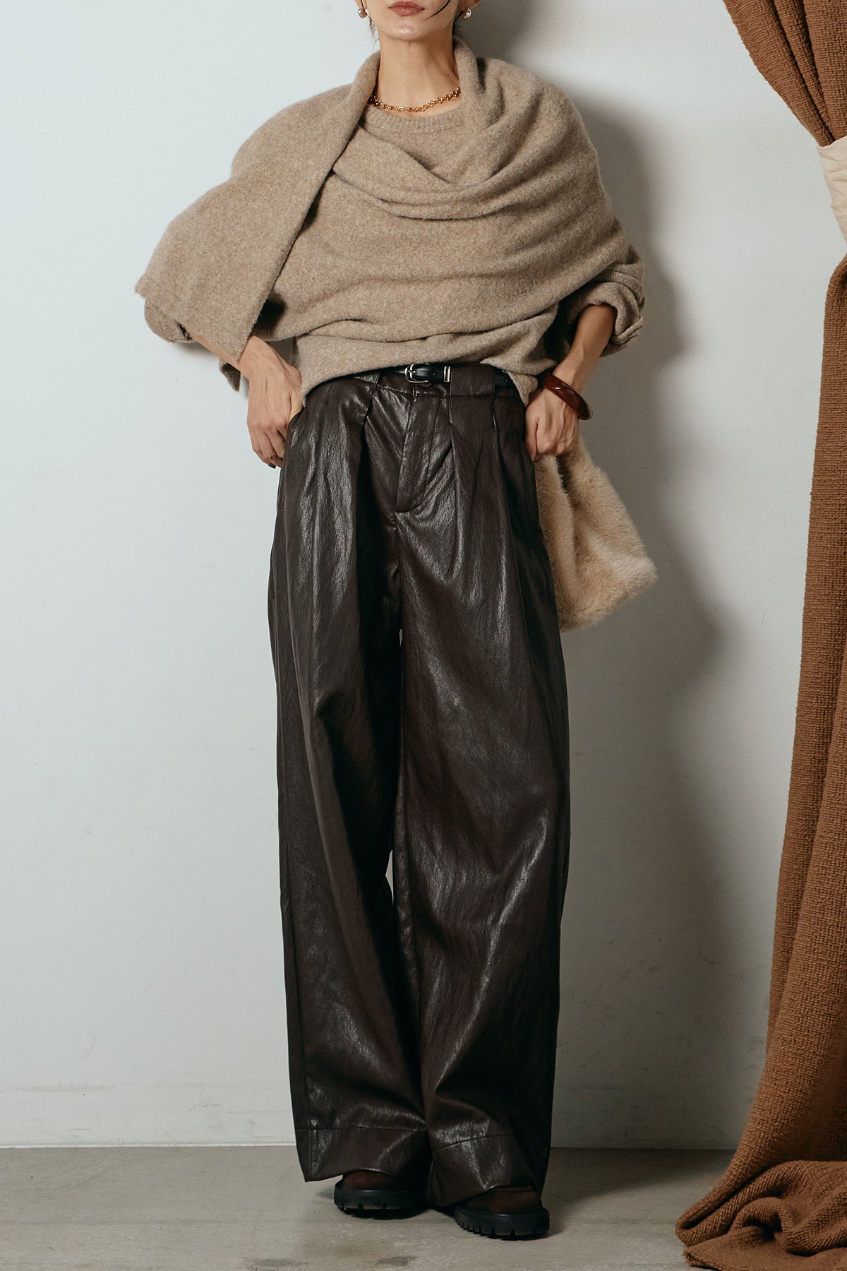 レザーライク素材で仕上げたタック入りパンツ。 ウエストまわりに程よいゆとりがあり、すっきりとしたバランスで着用できます。 付属ベルト付きで、トップスをインしたスタイルもまとまりやすい一本。 シンプルな合わせでもコーデに表情が出やすく、普段使いから外出まで幅広く活躍します。