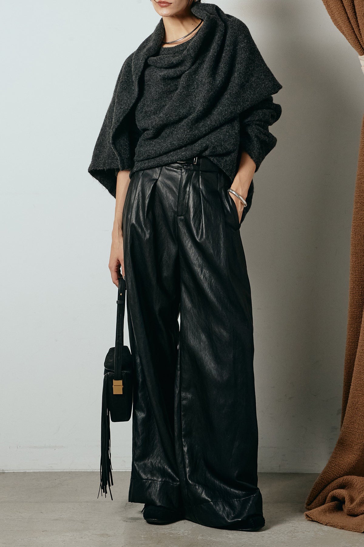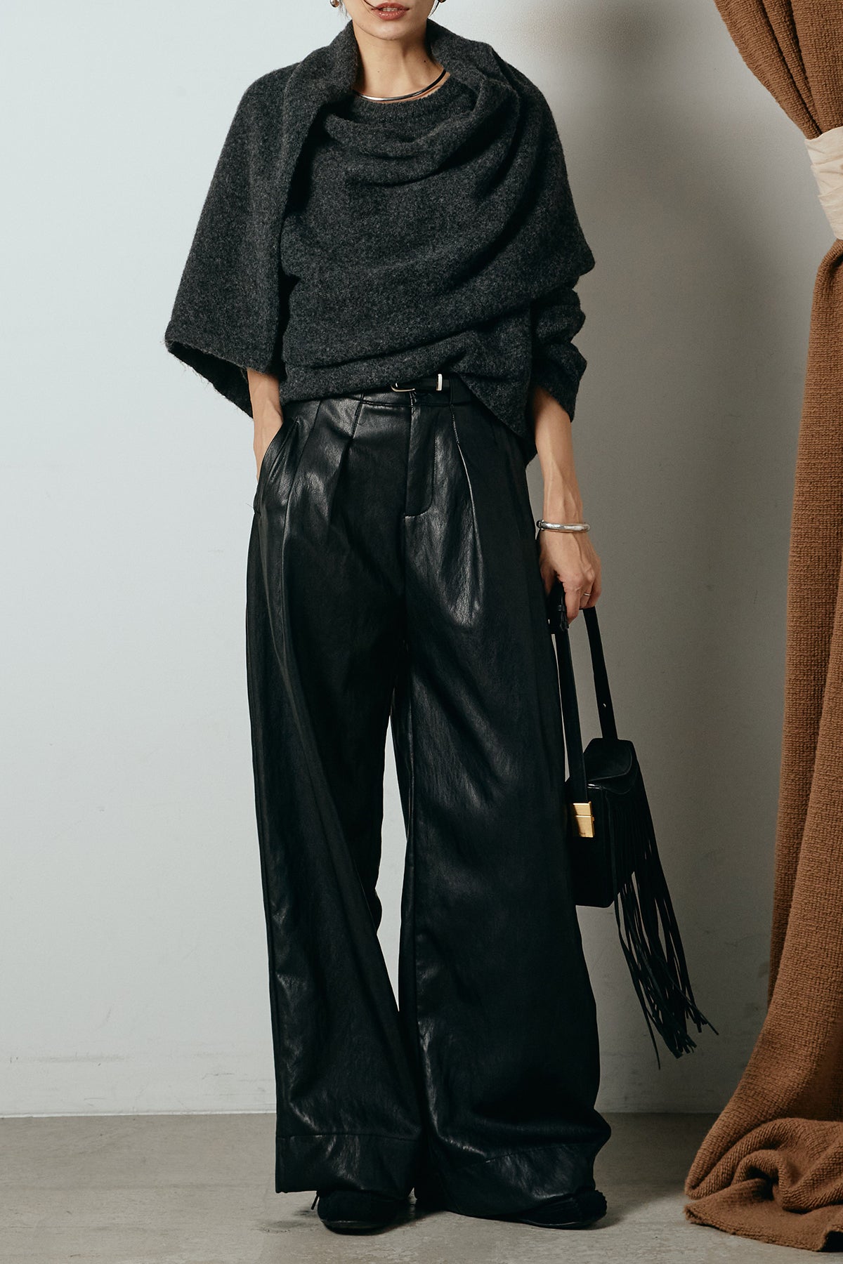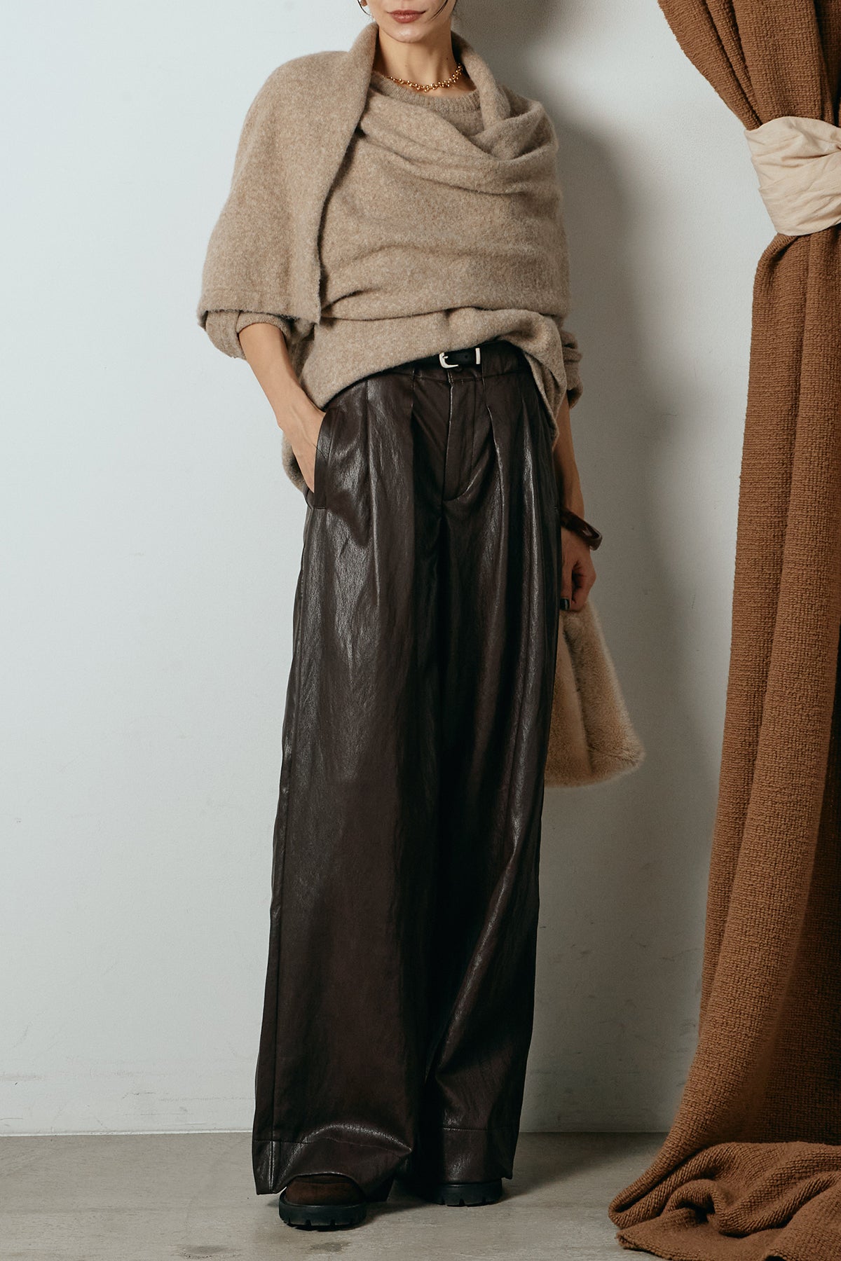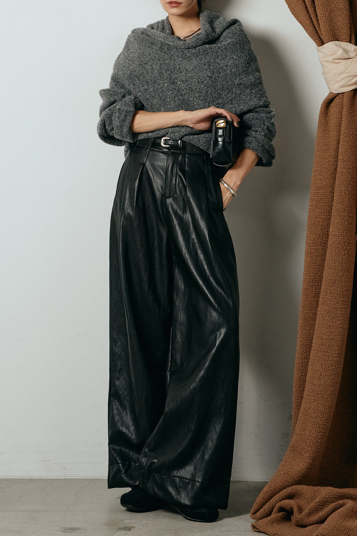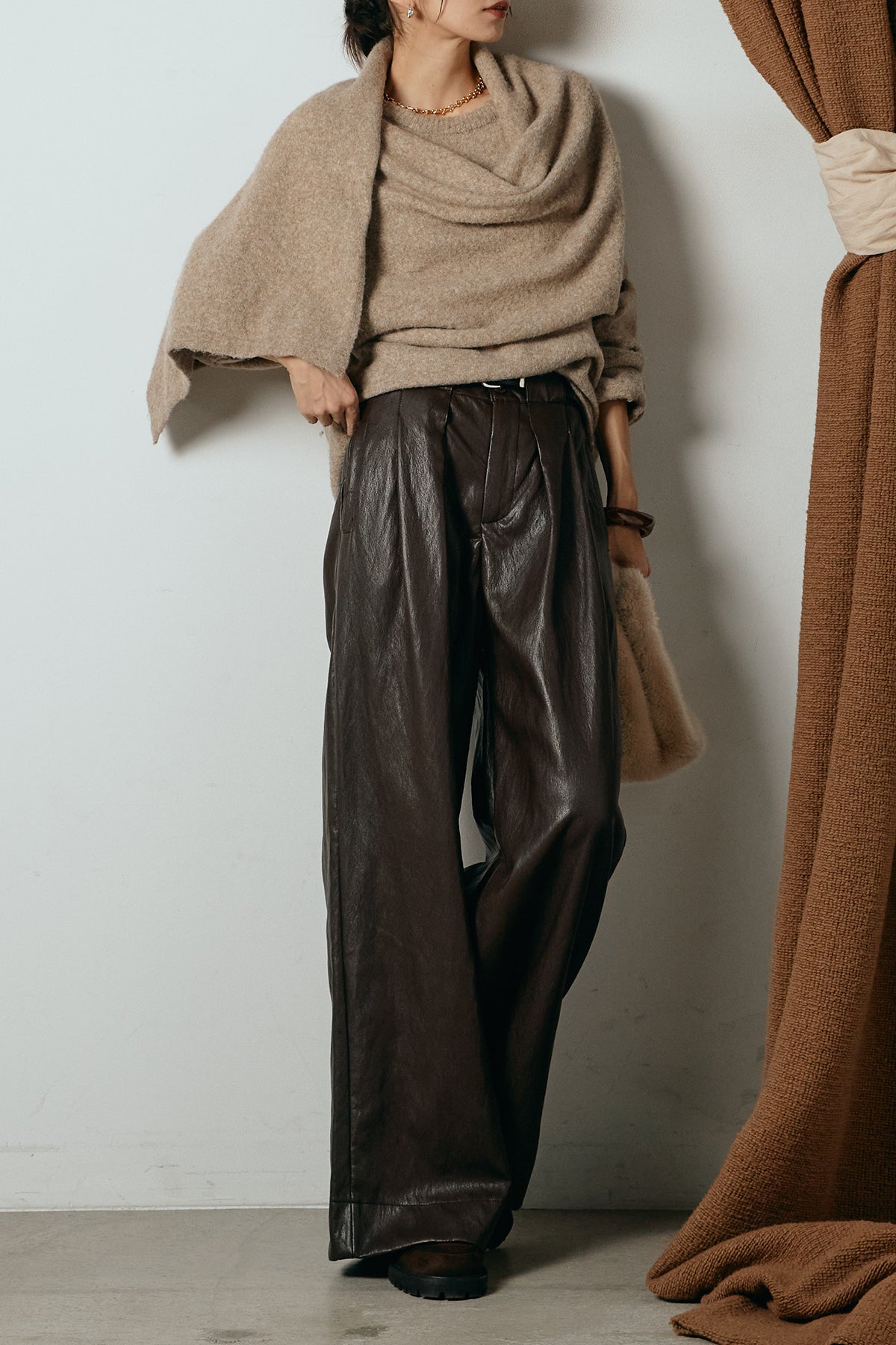 レザーライク素材で仕上げたタック入りパンツ。 ウエストまわりに程よいゆとりがあり、すっきりとしたバランスで着用できます。 付属ベルト付きで、トップスをインしたスタイルもまとまりやすい一本。 シンプルな合わせでもコーデに表情が出やすく、普段使いから外出まで幅広く活躍します。