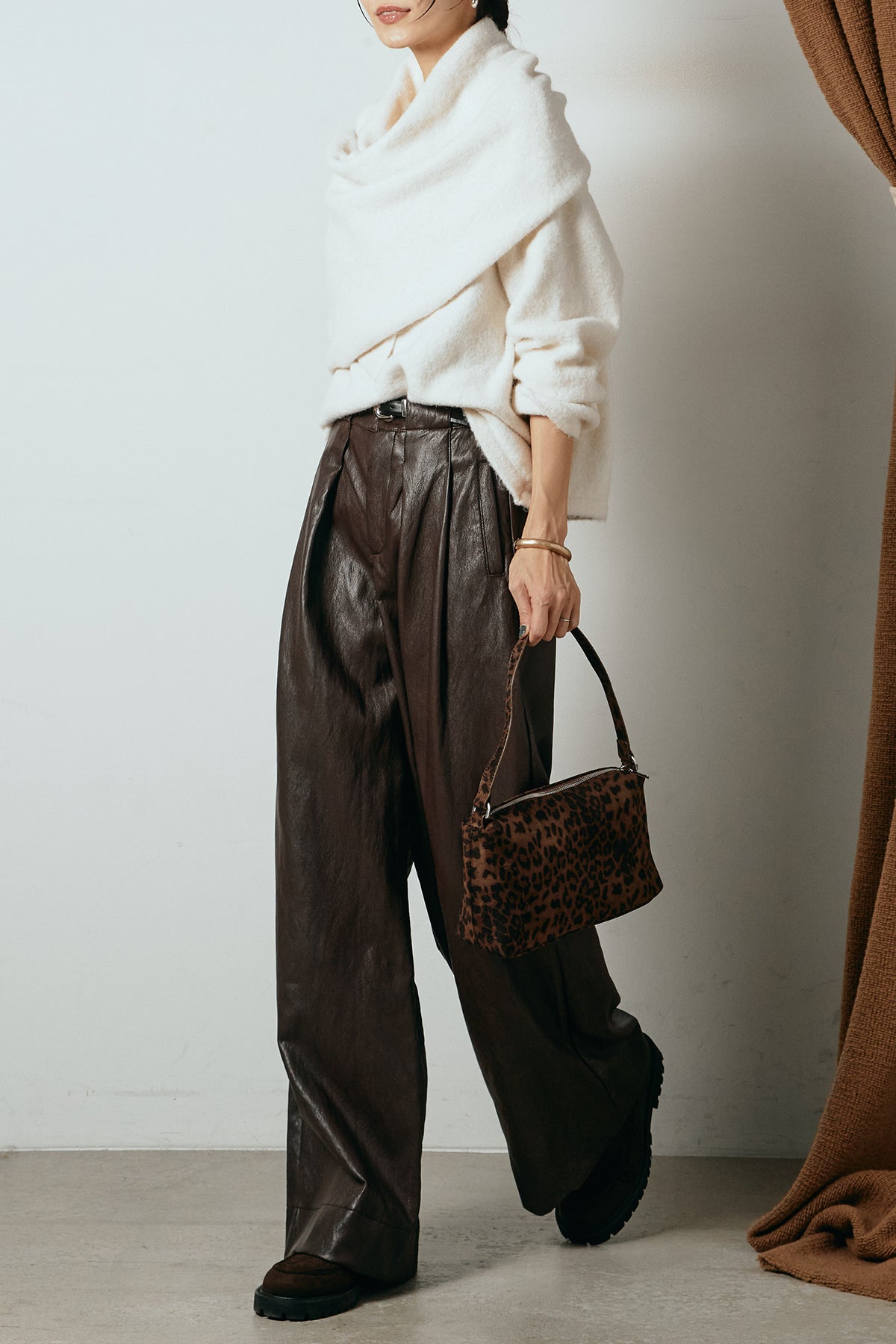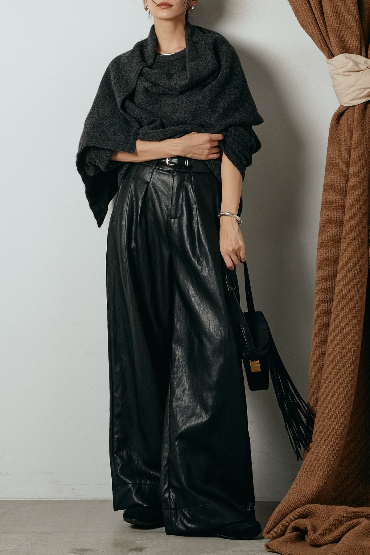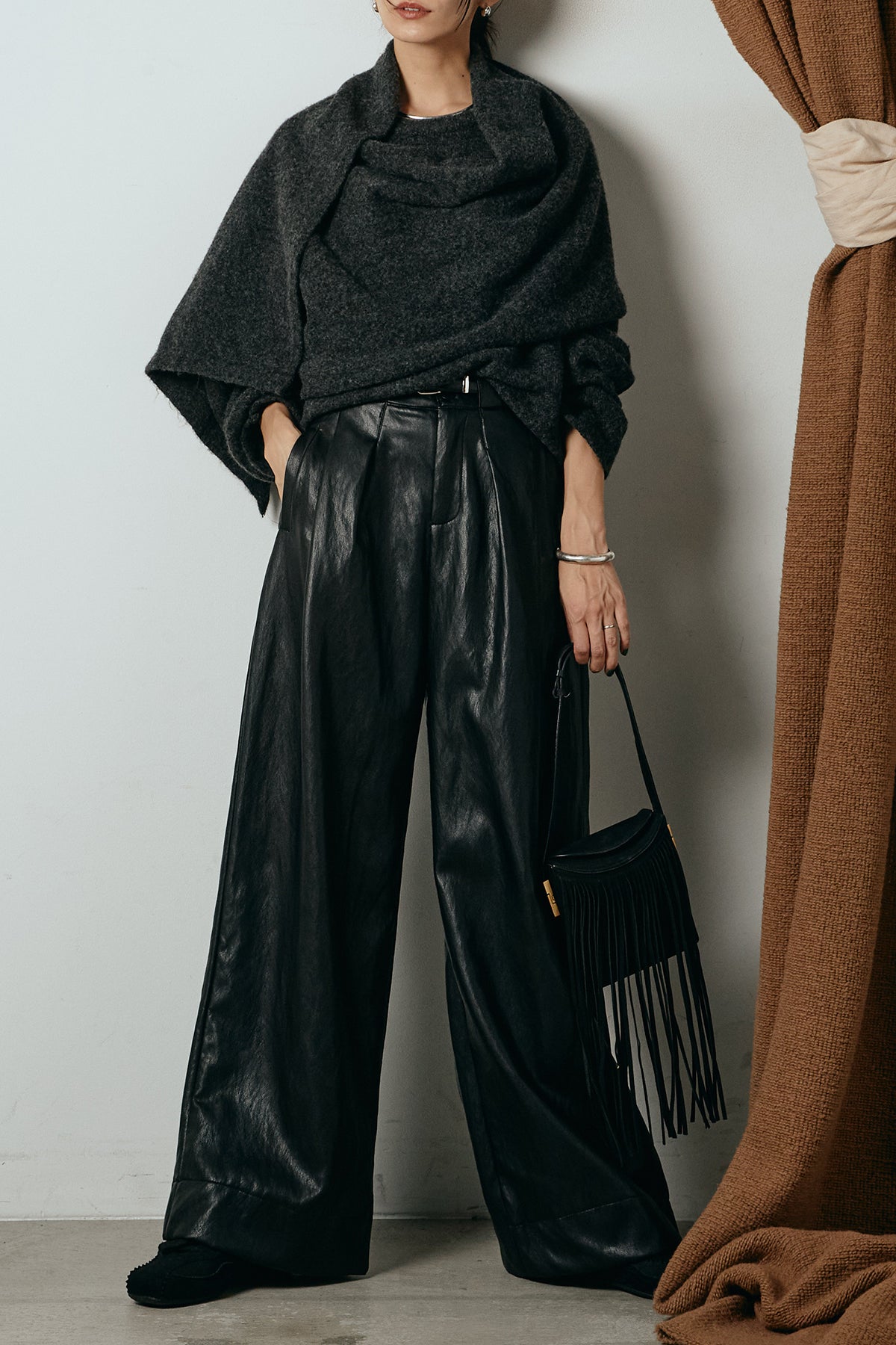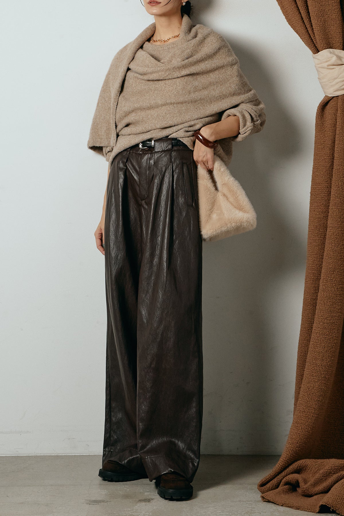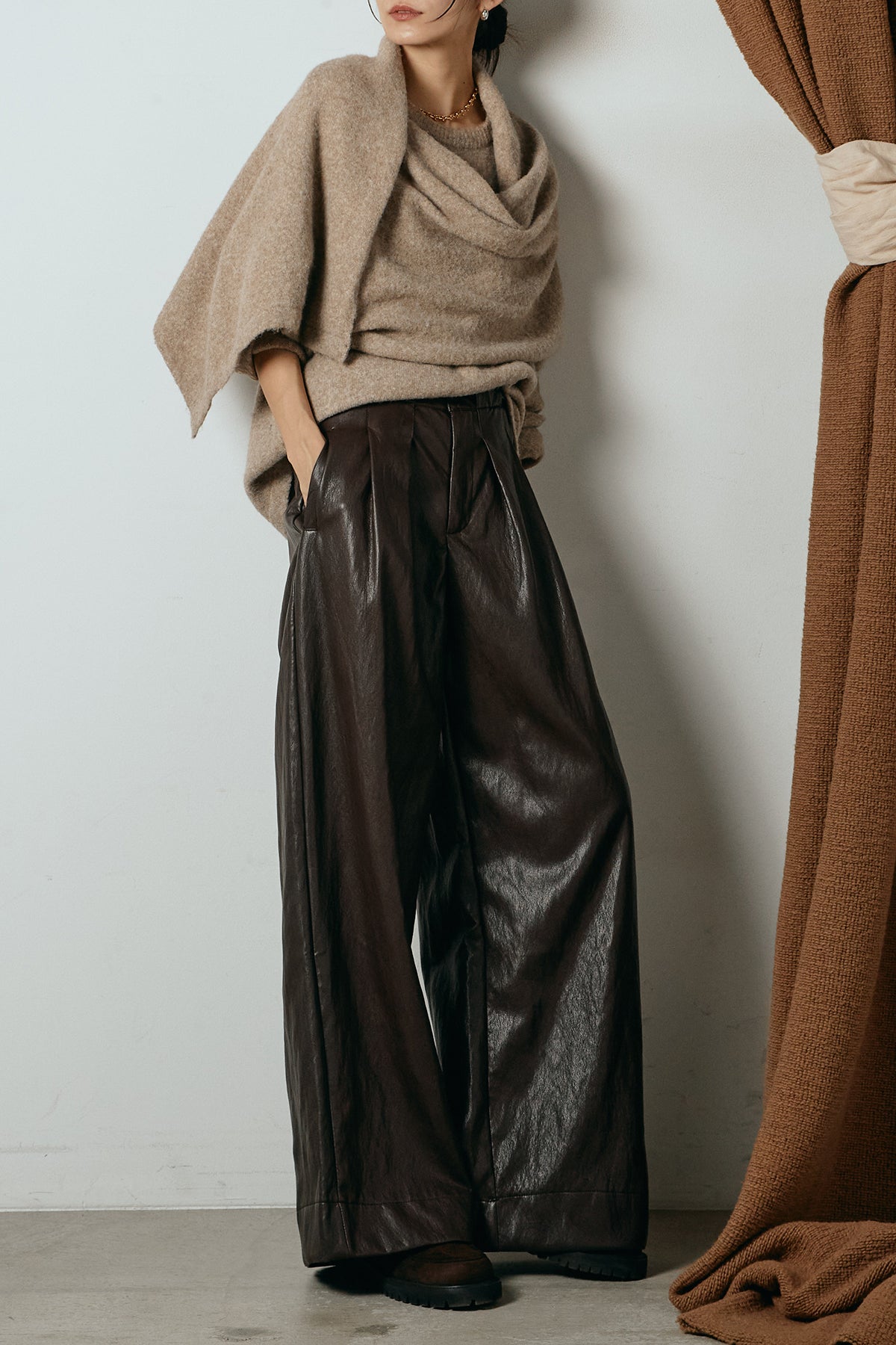 レザーライク素材で仕上げたタック入りパンツ。 ウエストまわりに程よいゆとりがあり、すっきりとしたバランスで着用できます。 付属ベルト付きで、トップスをインしたスタイルもまとまりやすい一本。 シンプルな合わせでもコーデに表情が出やすく、普段使いから外出まで幅広く活躍します。