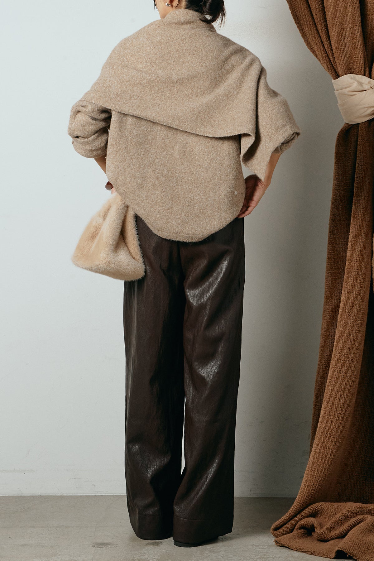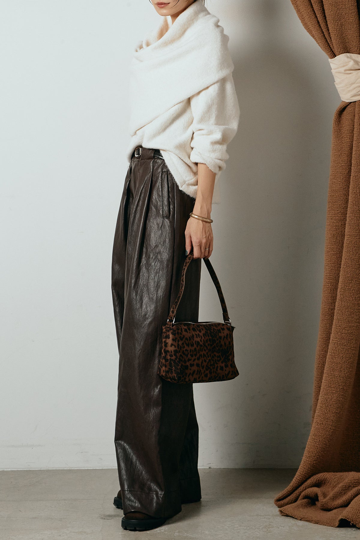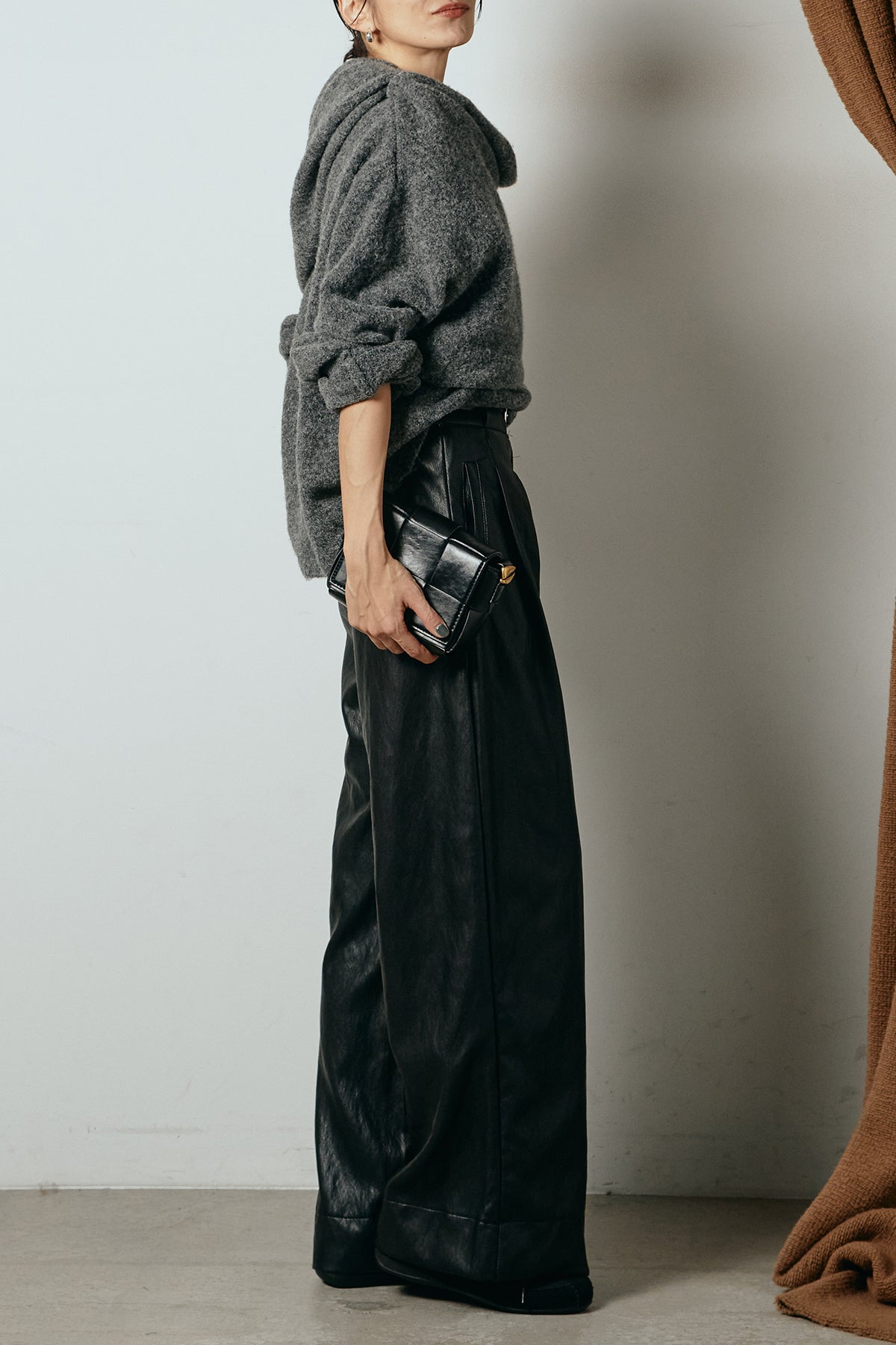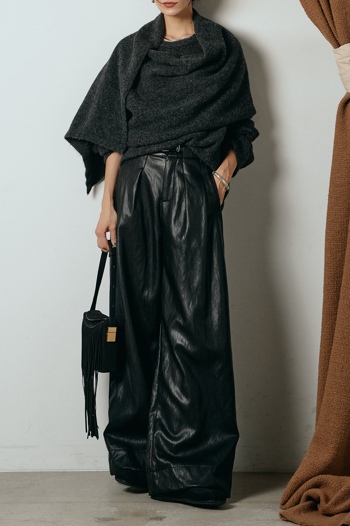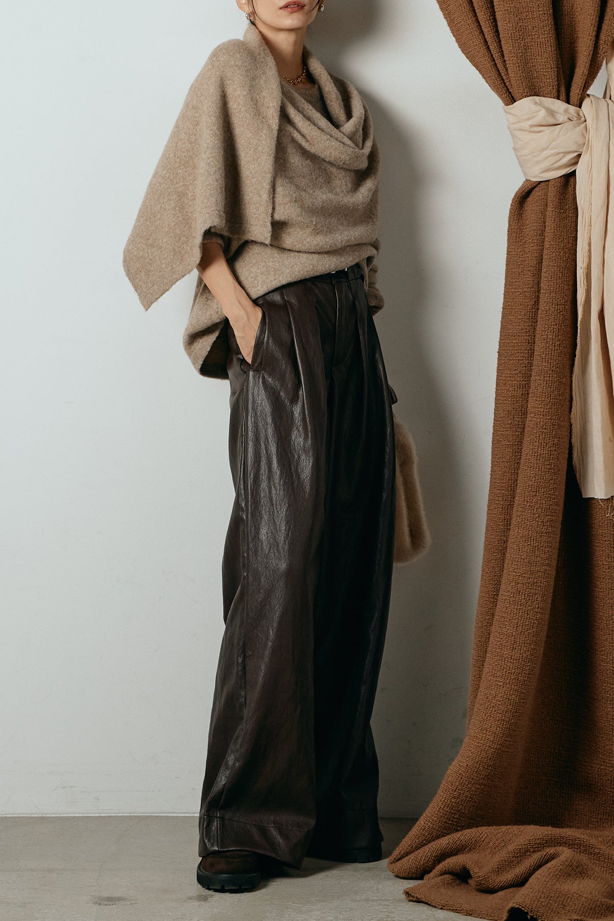 レザーライク素材で仕上げたタック入りパンツ。 ウエストまわりに程よいゆとりがあり、すっきりとしたバランスで着用できます。 付属ベルト付きで、トップスをインしたスタイルもまとまりやすい一本。 シンプルな合わせでもコーデに表情が出やすく、普段使いから外出まで幅広く活躍します。