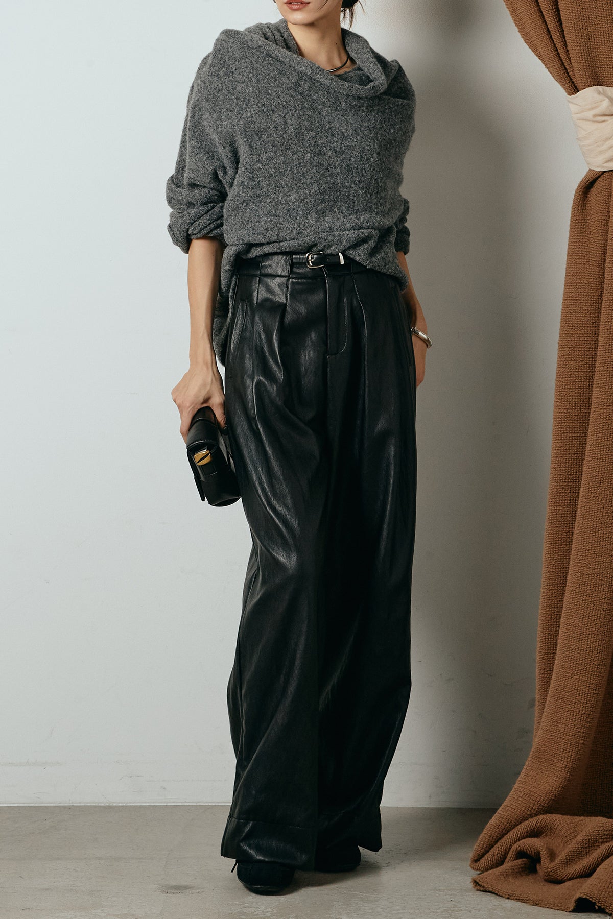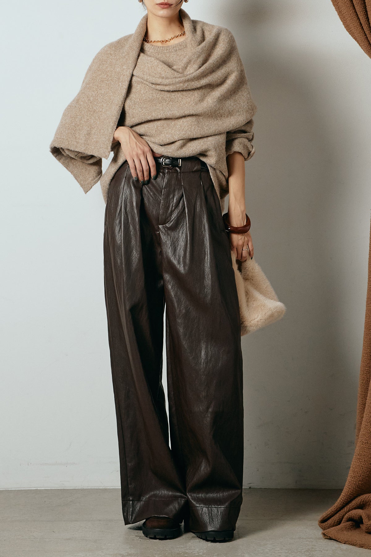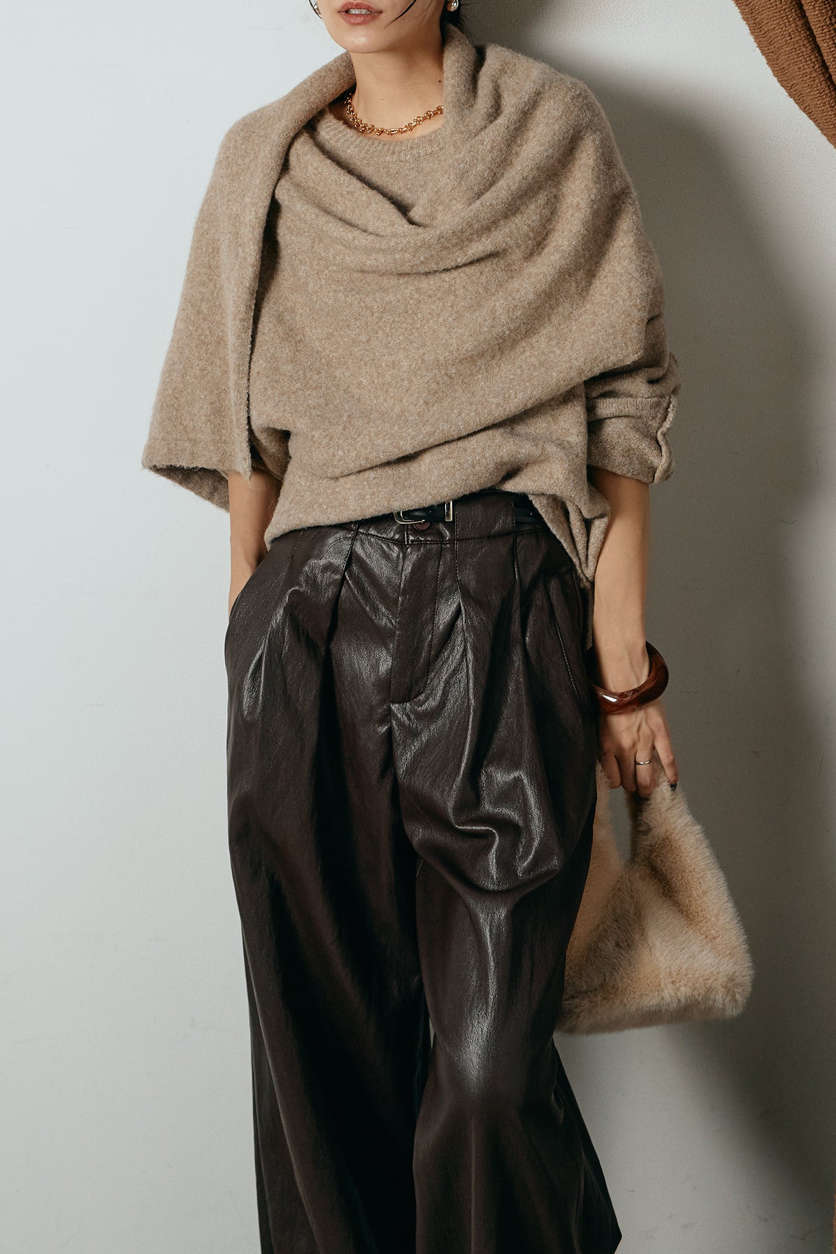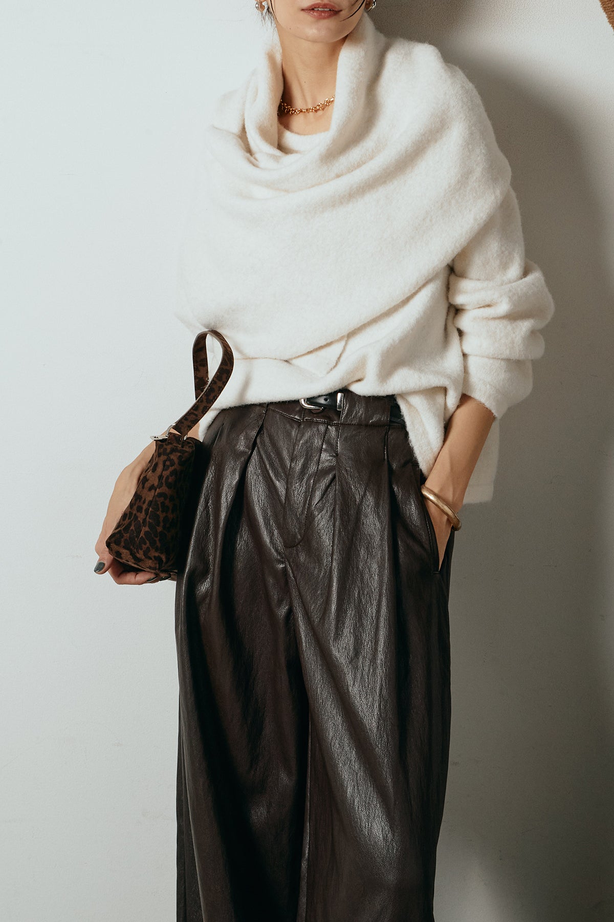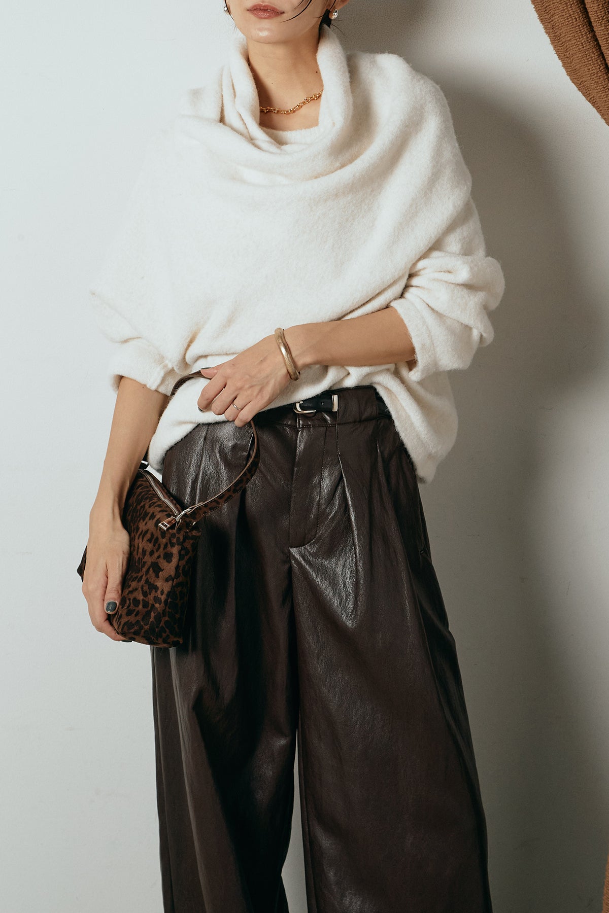 [SET]ネック巻きデザインニットトップス+ベルト付きレザーライクタックパンツ(2set)