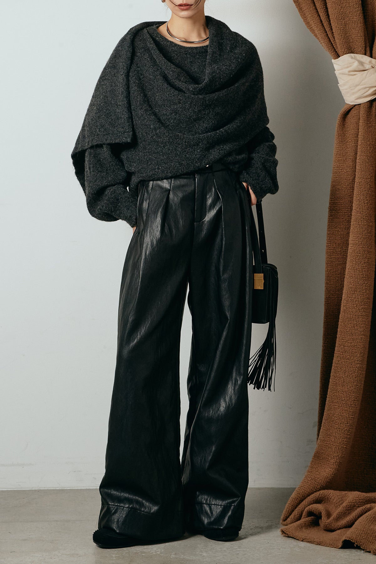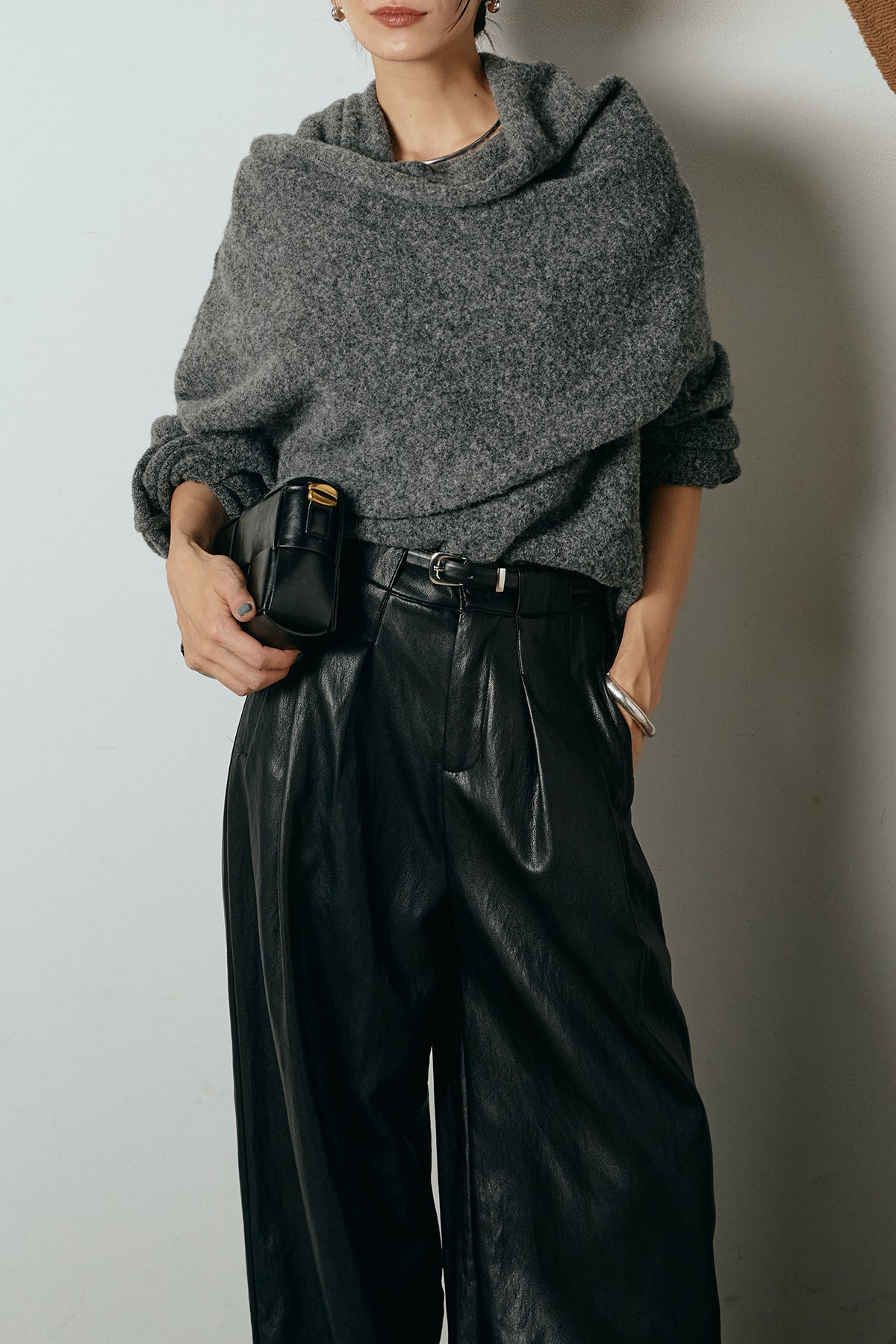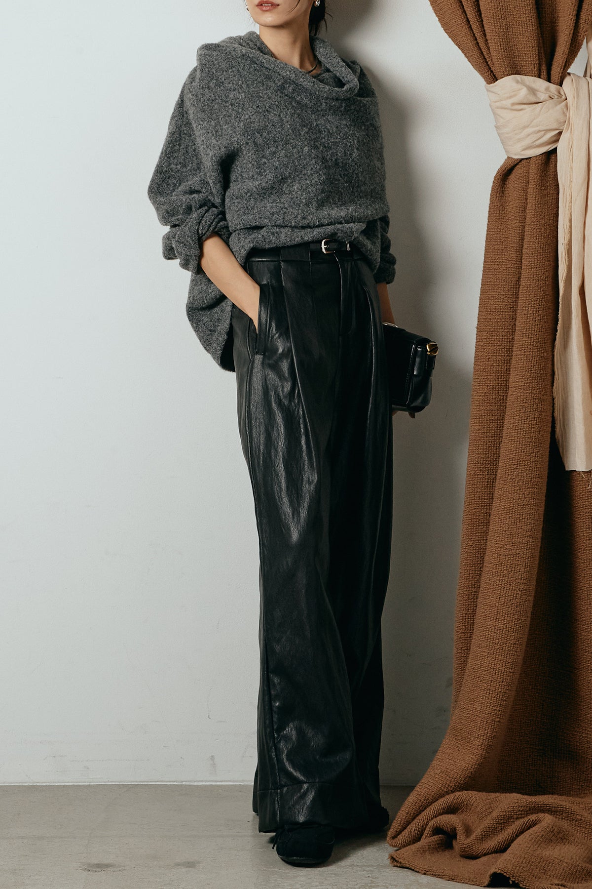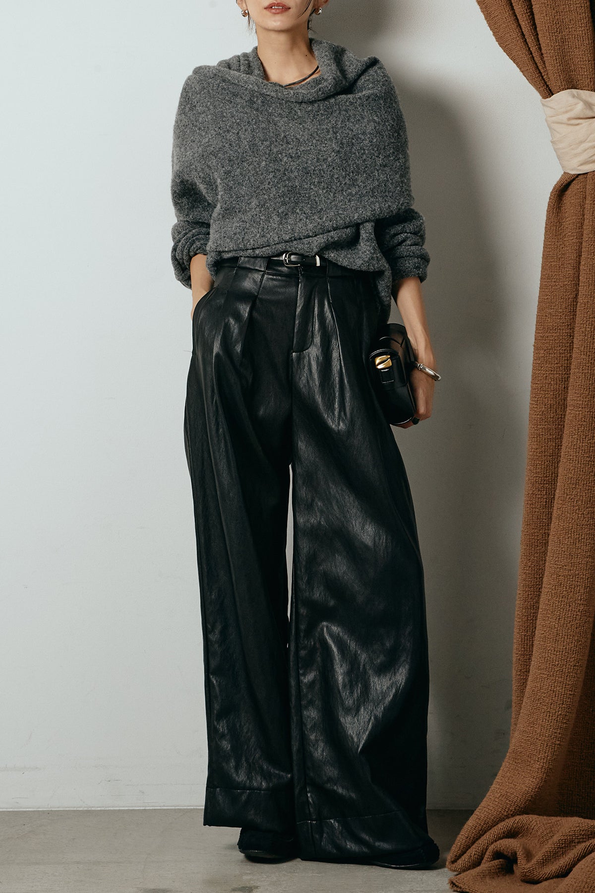 [SET]ネック巻きデザインニットトップス+ベルト付きレザーライクタックパンツ(2set)