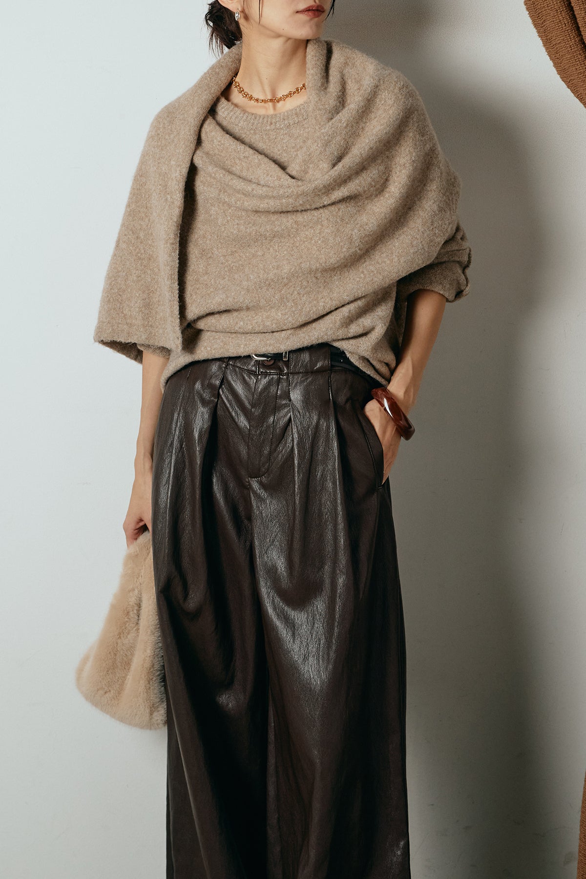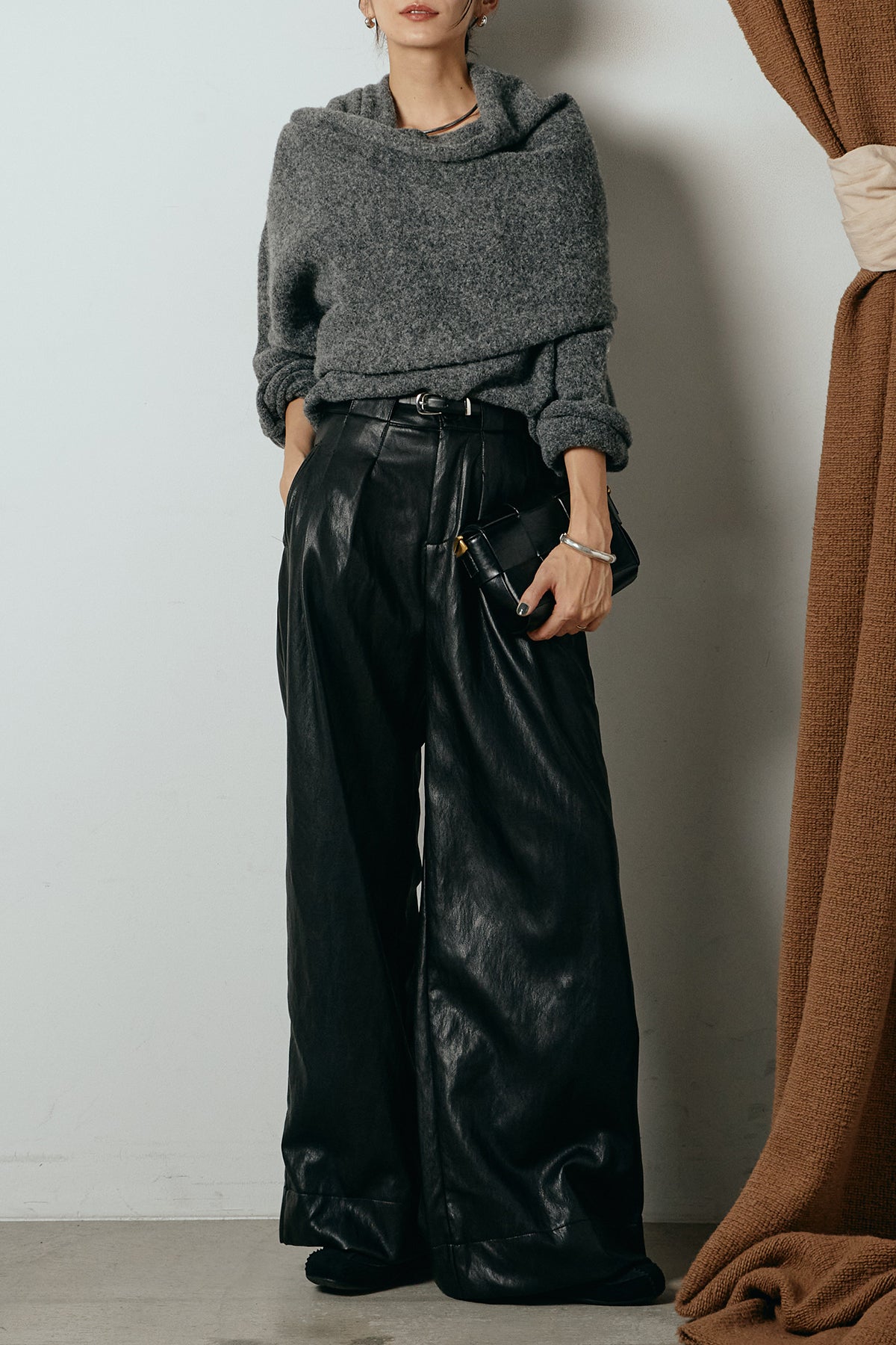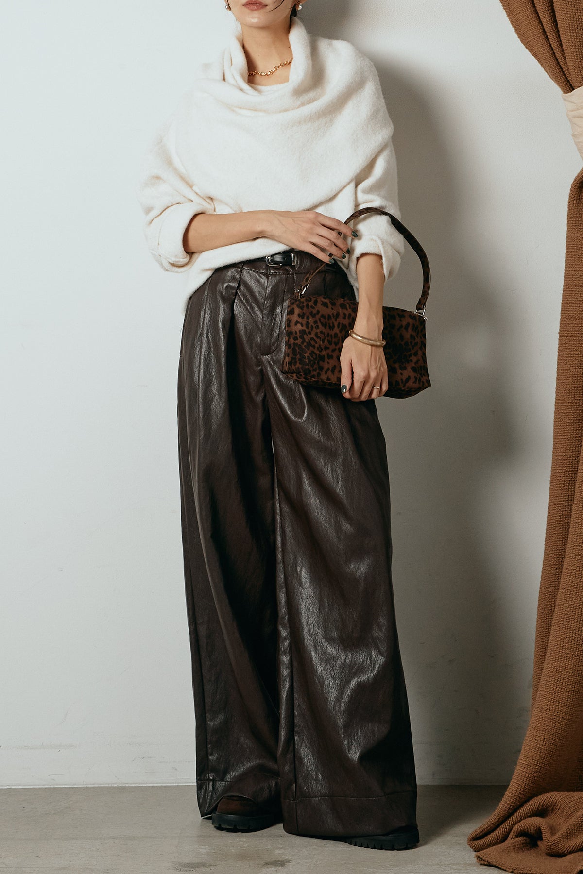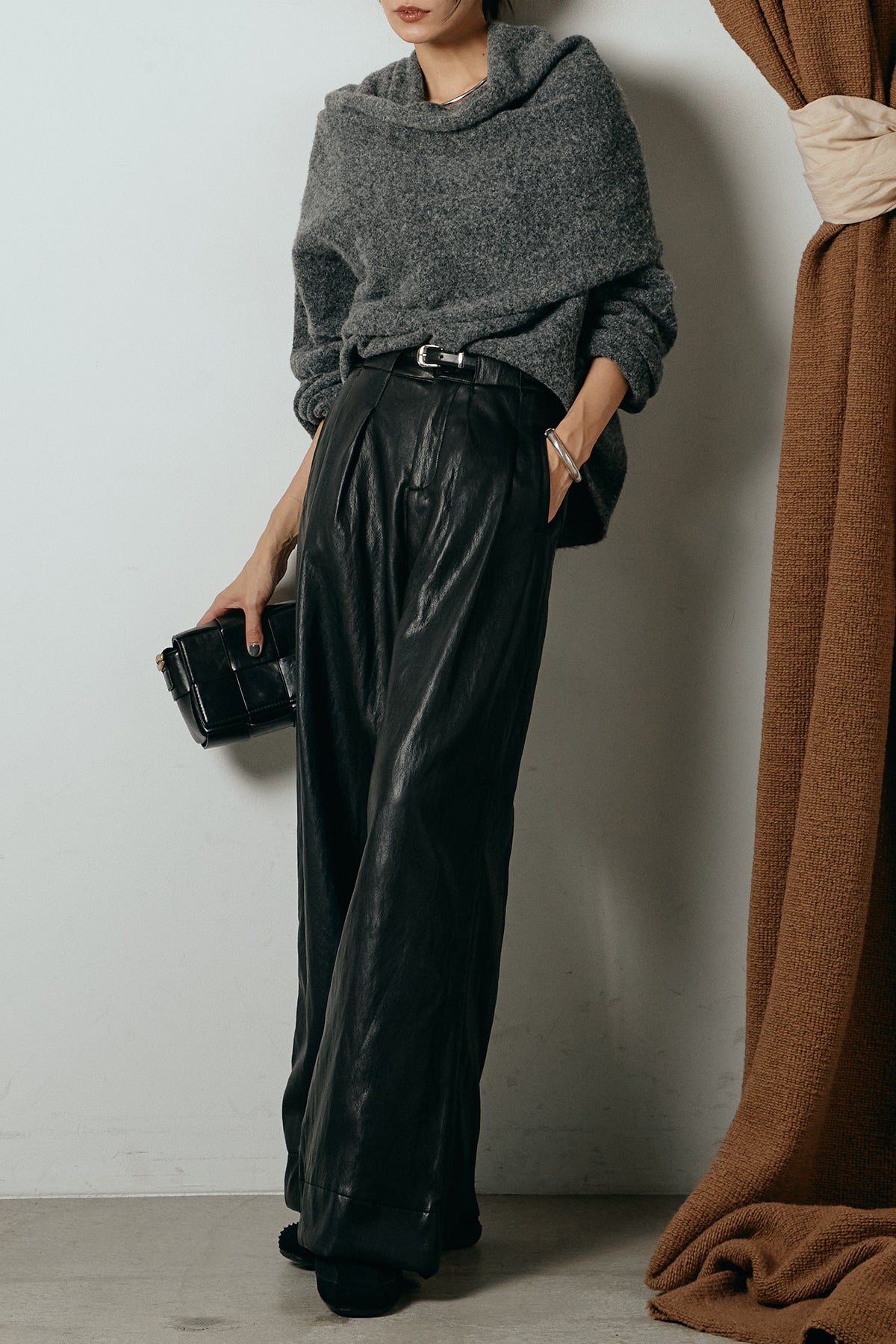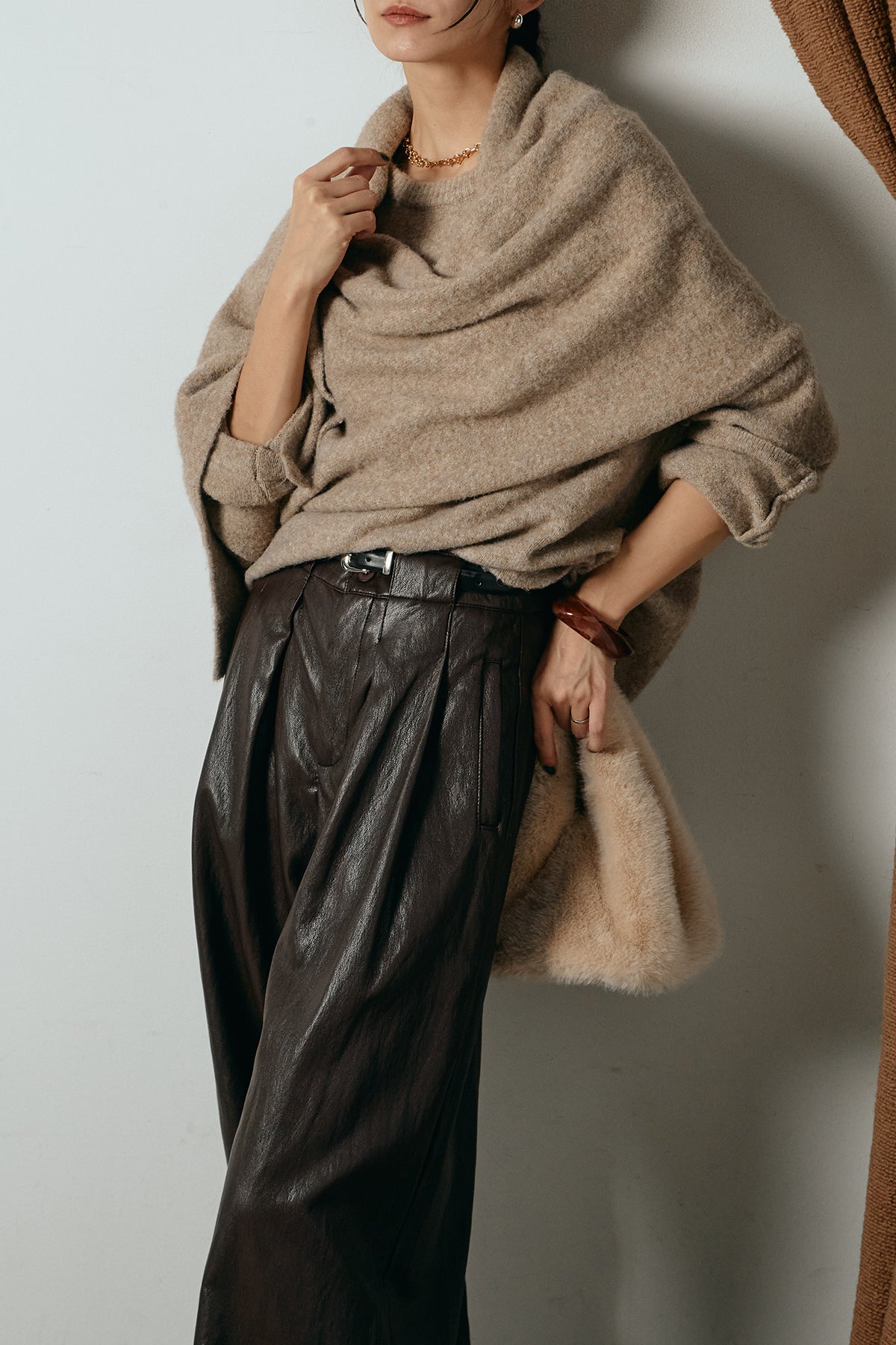 [SET]ネック巻きデザインニットトップス+ベルト付きレザーライクタックパンツ(2set)