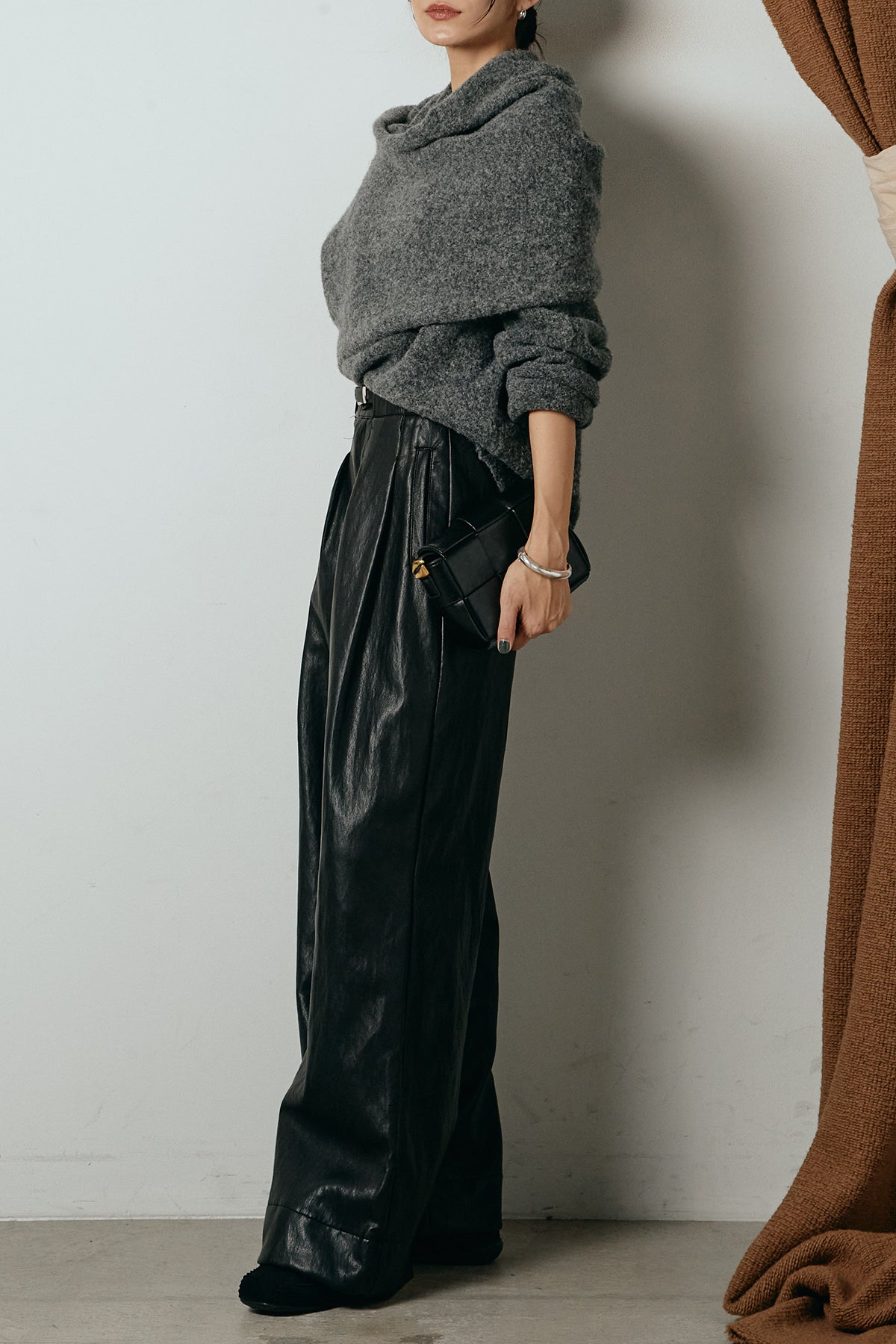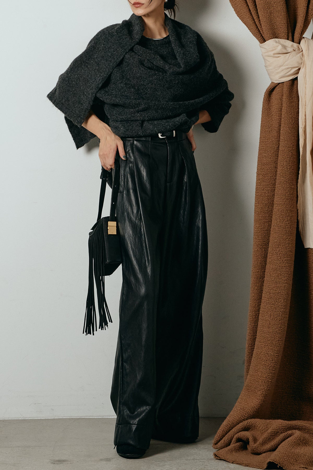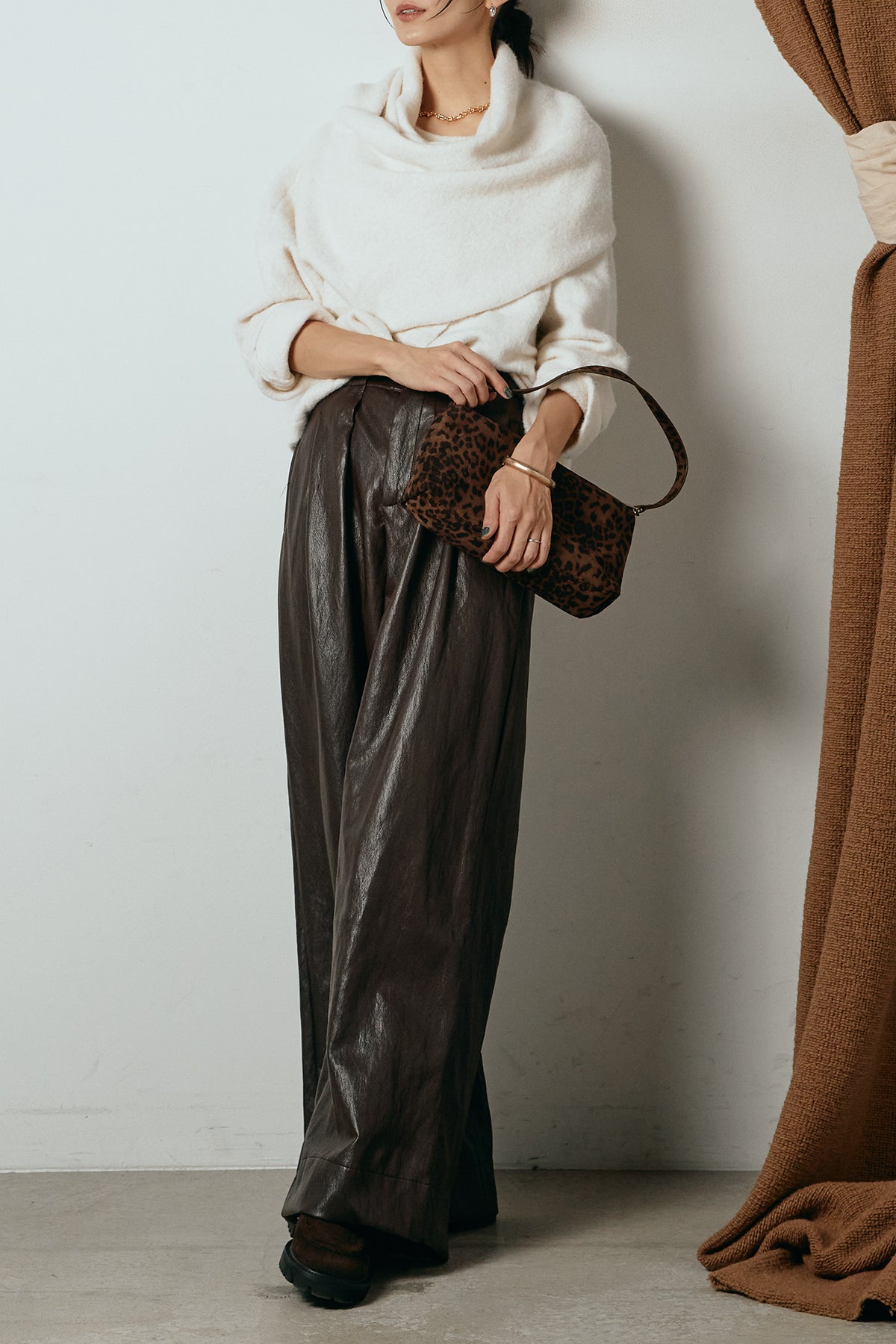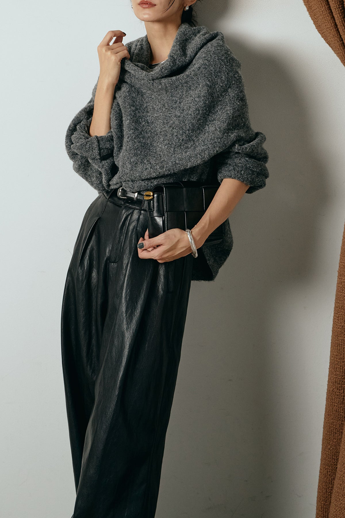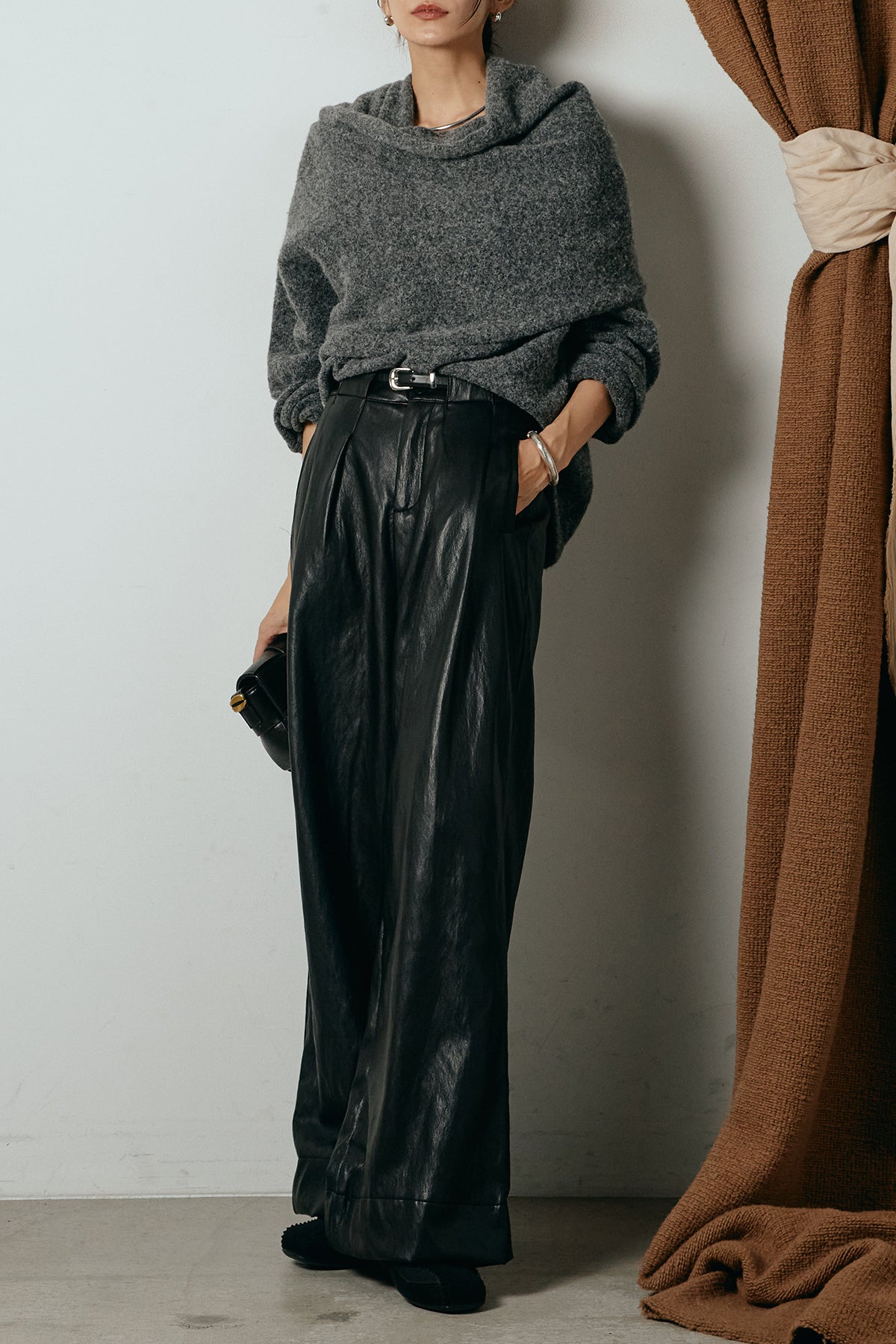 [SET]ネック巻きデザインニットトップス+ベルト付きレザーライクタックパンツ(2set)