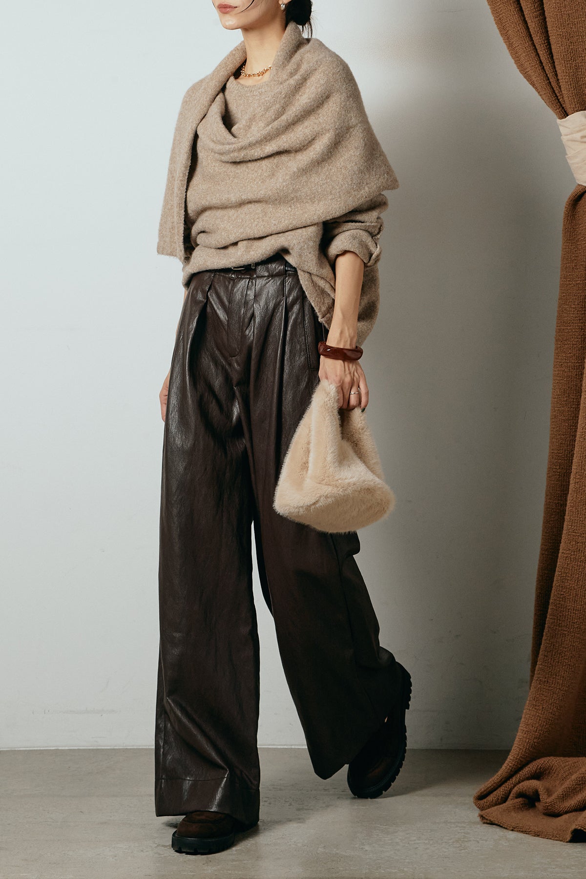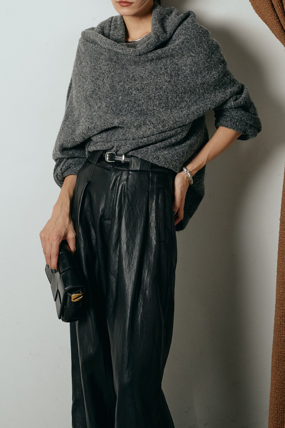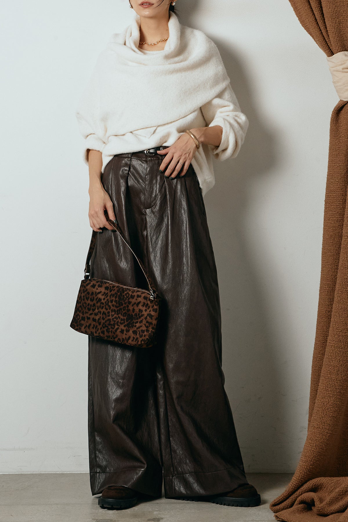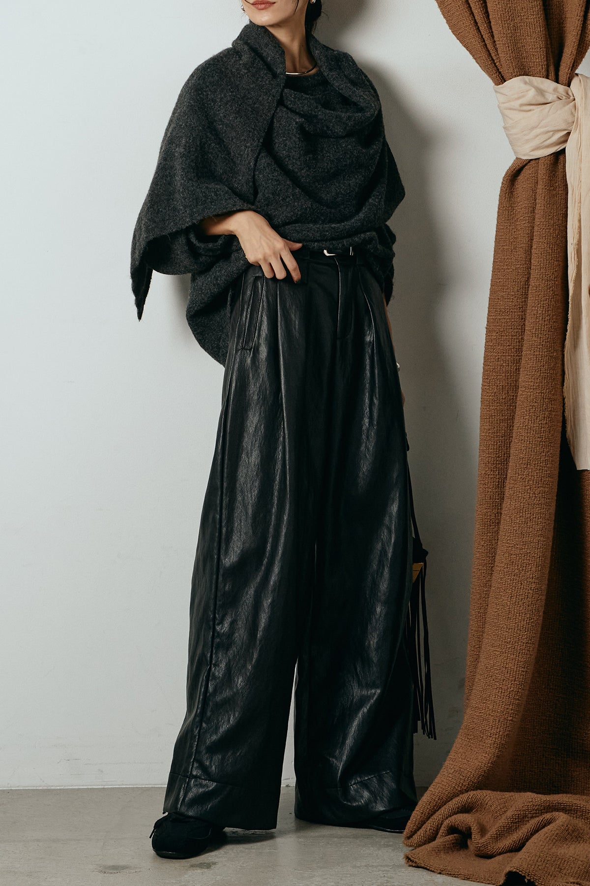 [SET]ネック巻きデザインニットトップス+ベルト付きレザーライクタックパンツ(2set)