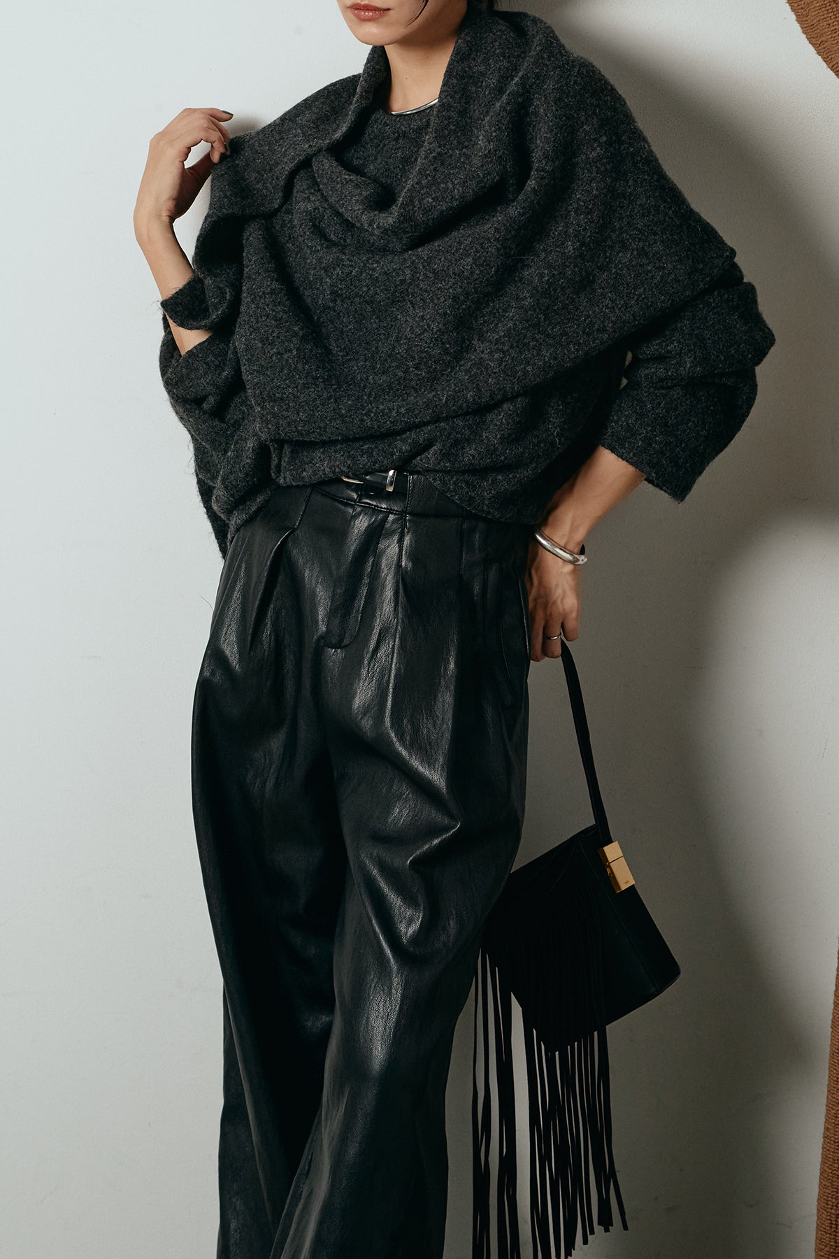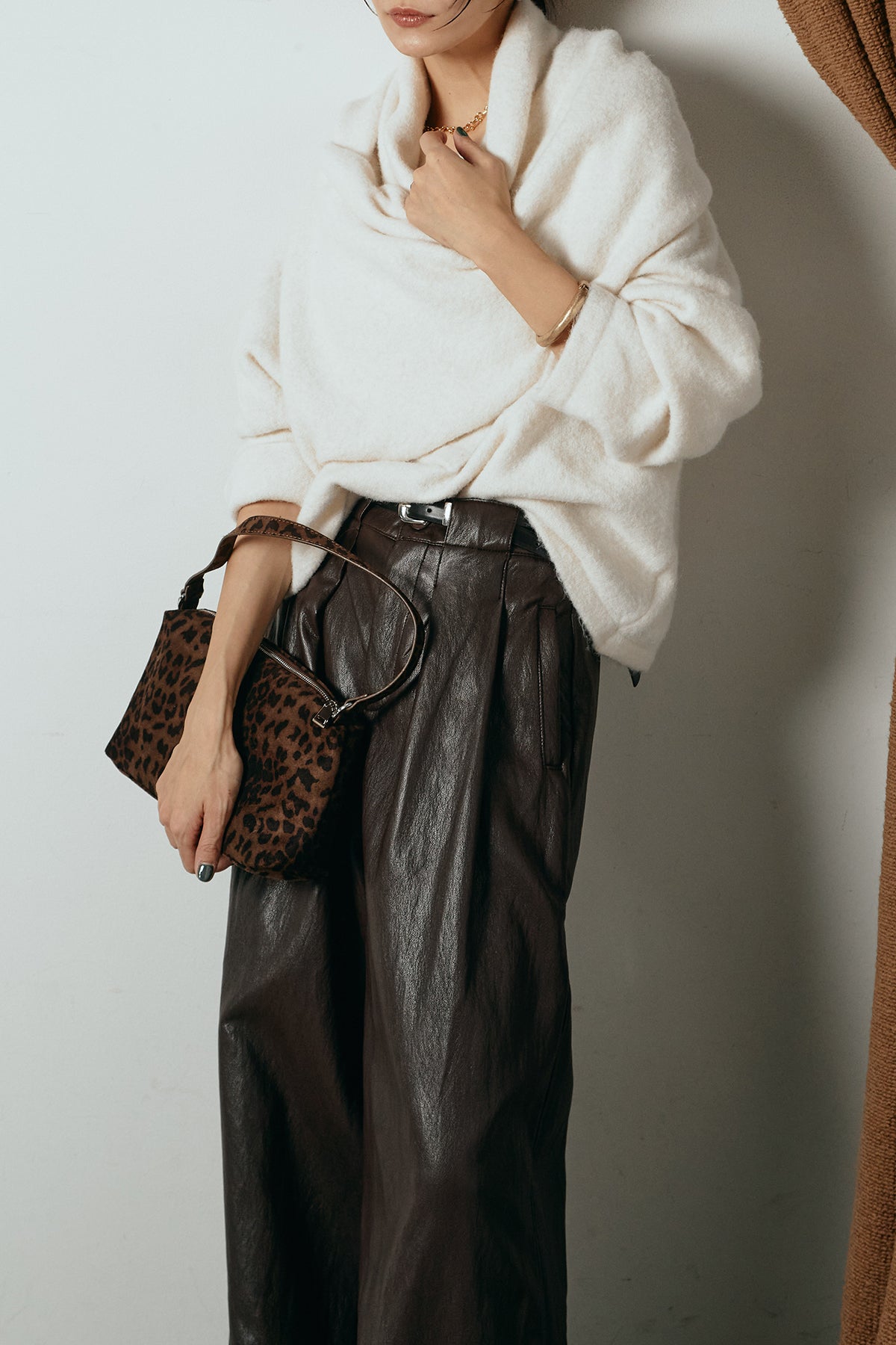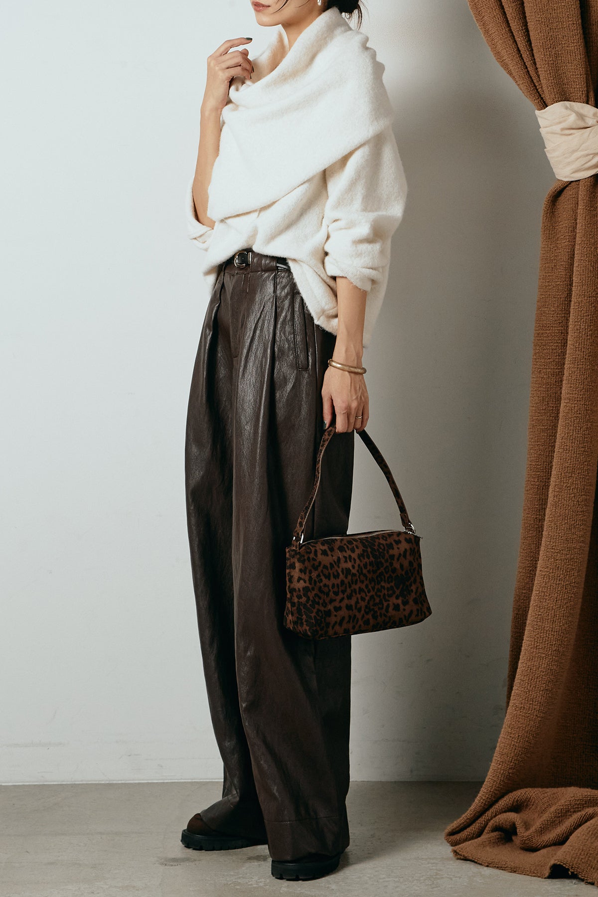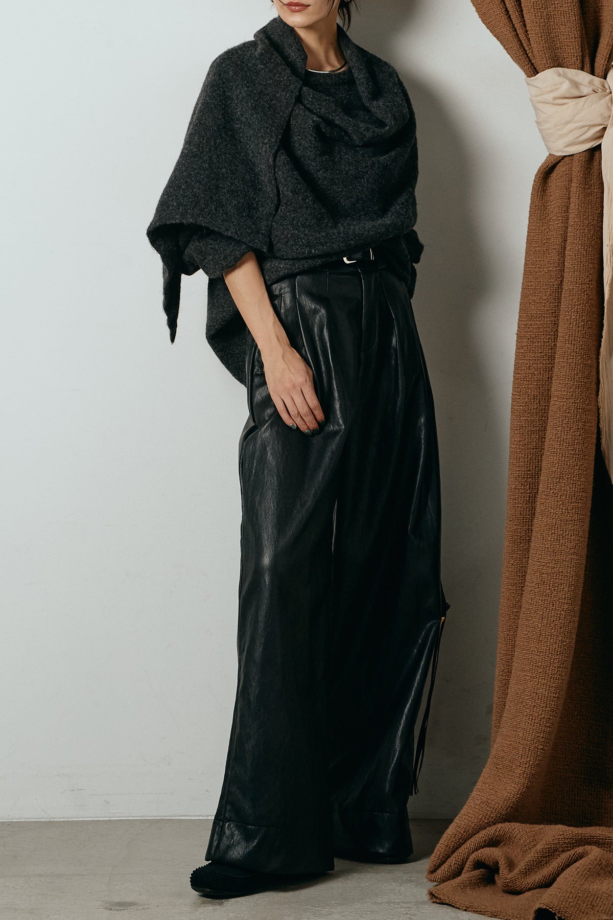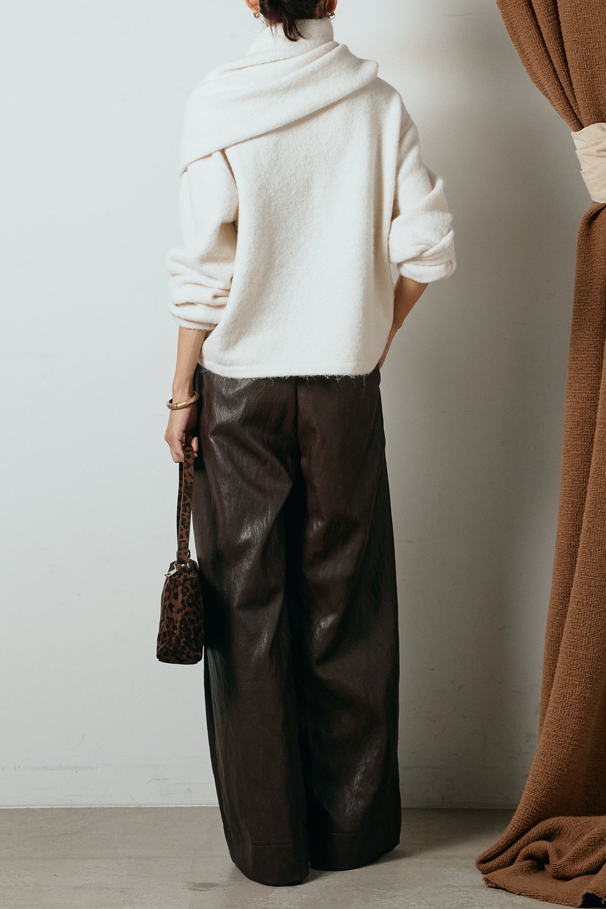 [SET]ネック巻きデザインニットトップス+ベルト付きレザーライクタックパンツ(2set)