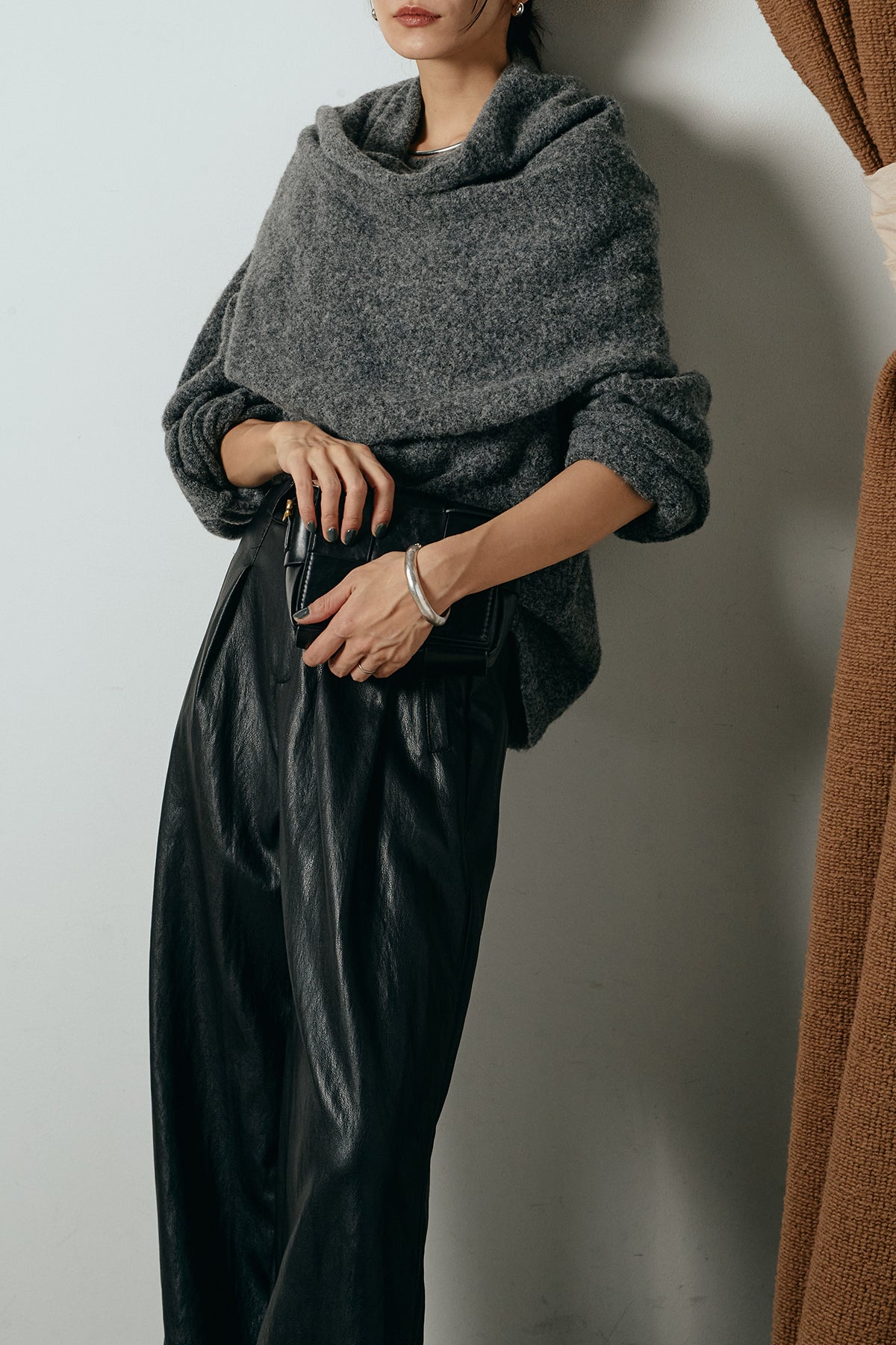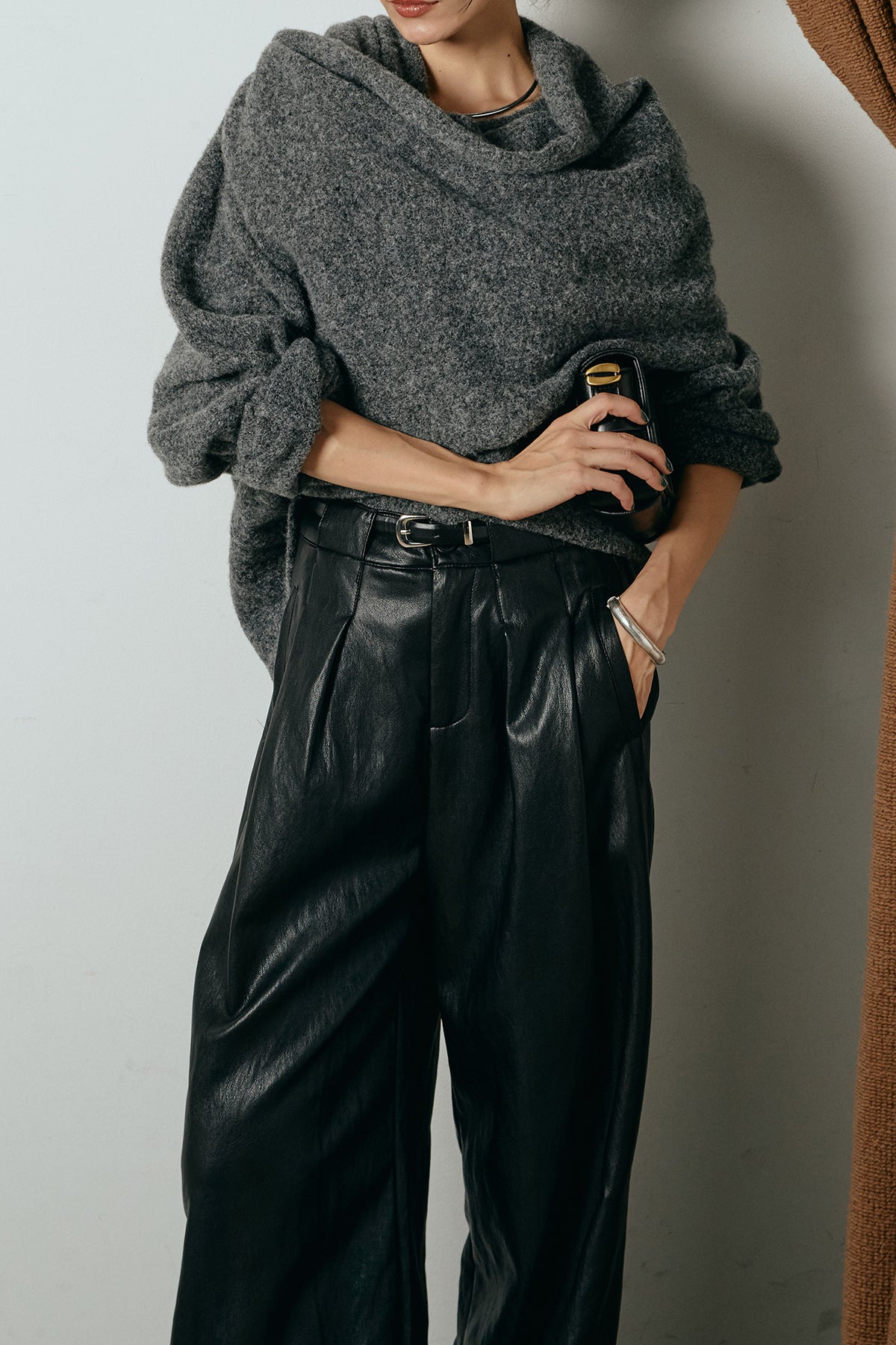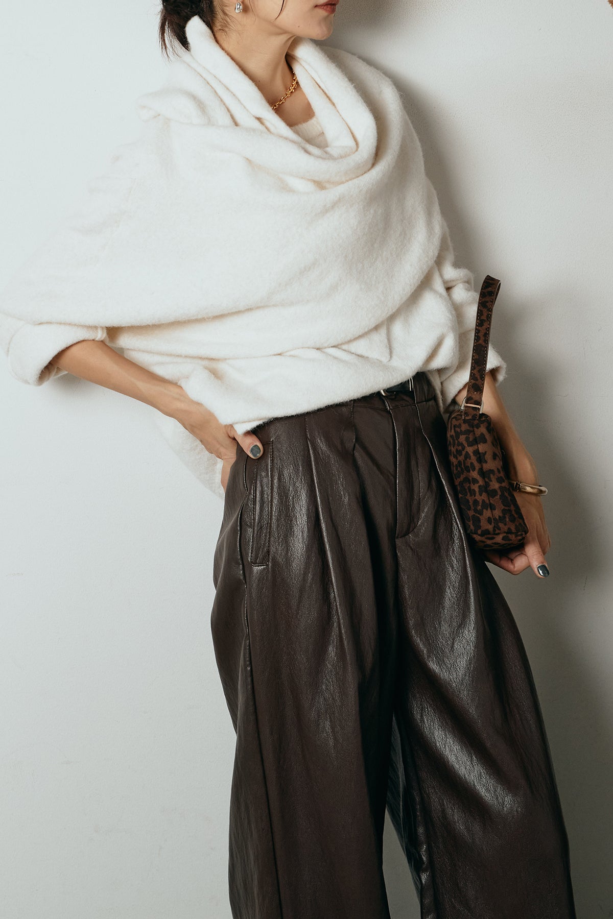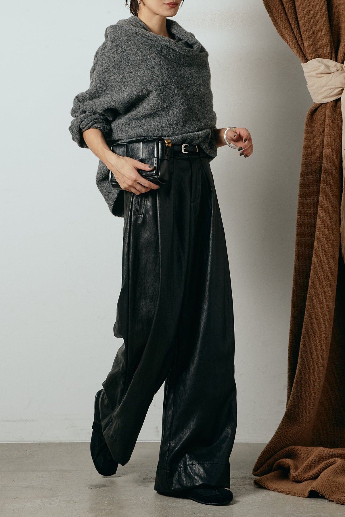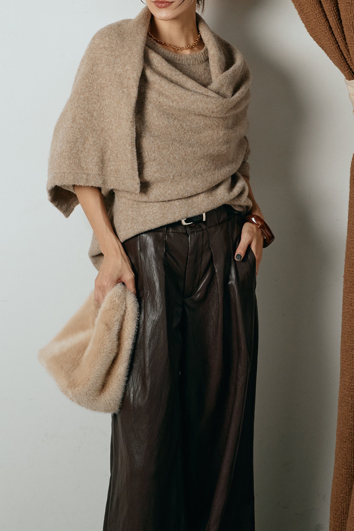 [SET]ネック巻きデザインニットトップス+ベルト付きレザーライクタックパンツ(2set)