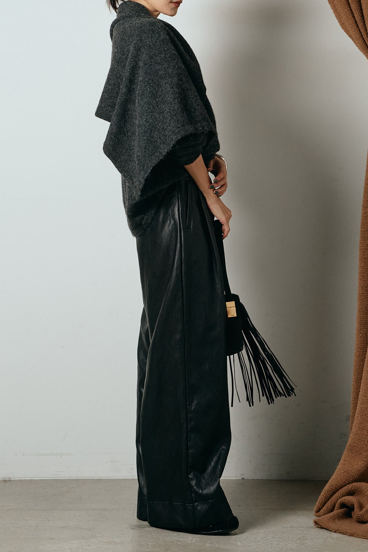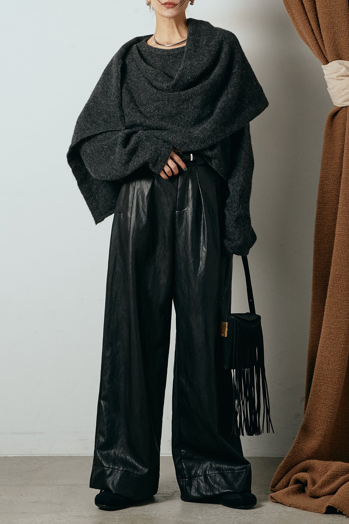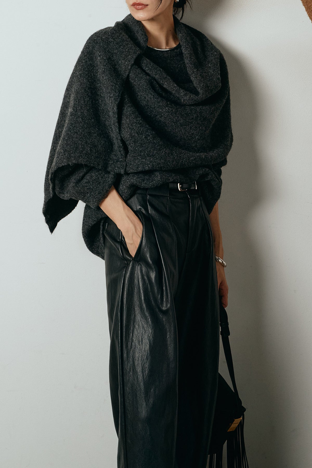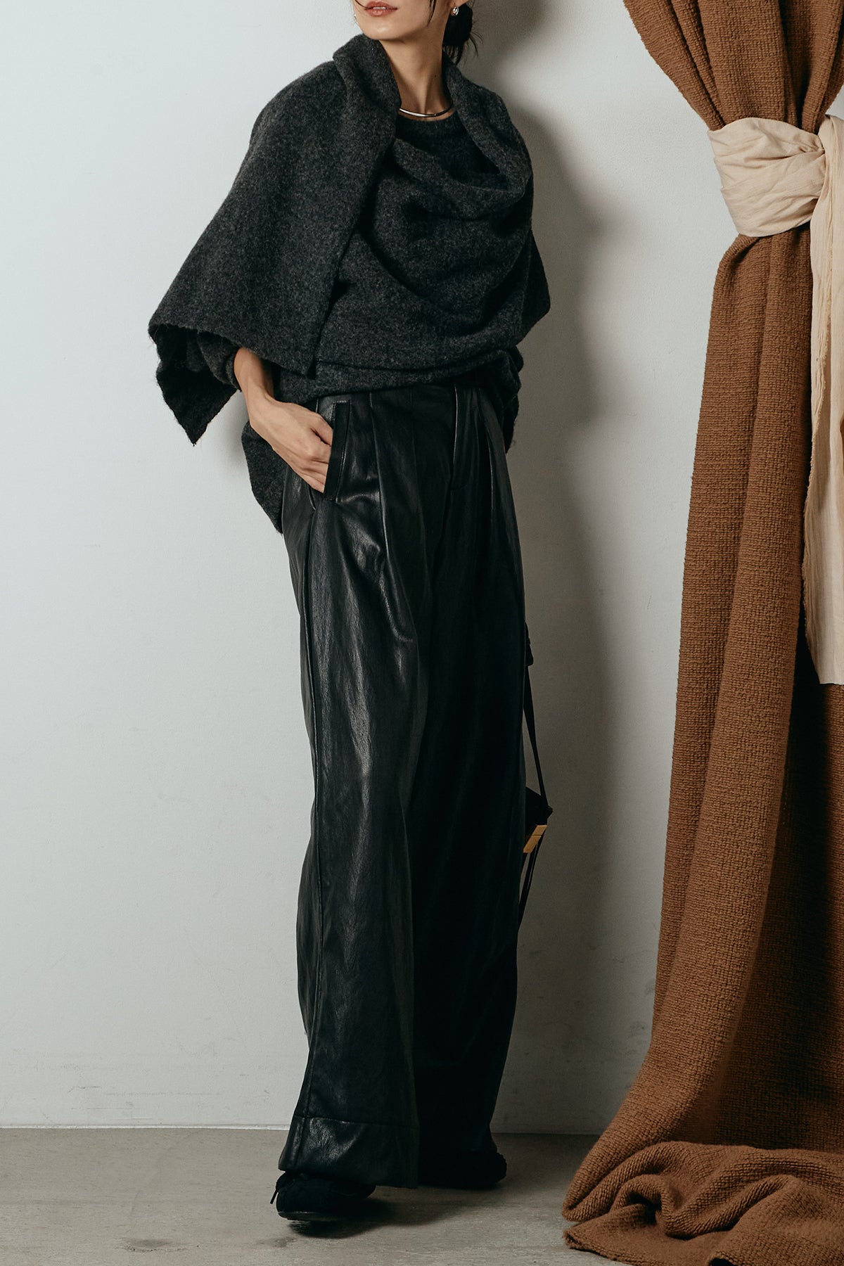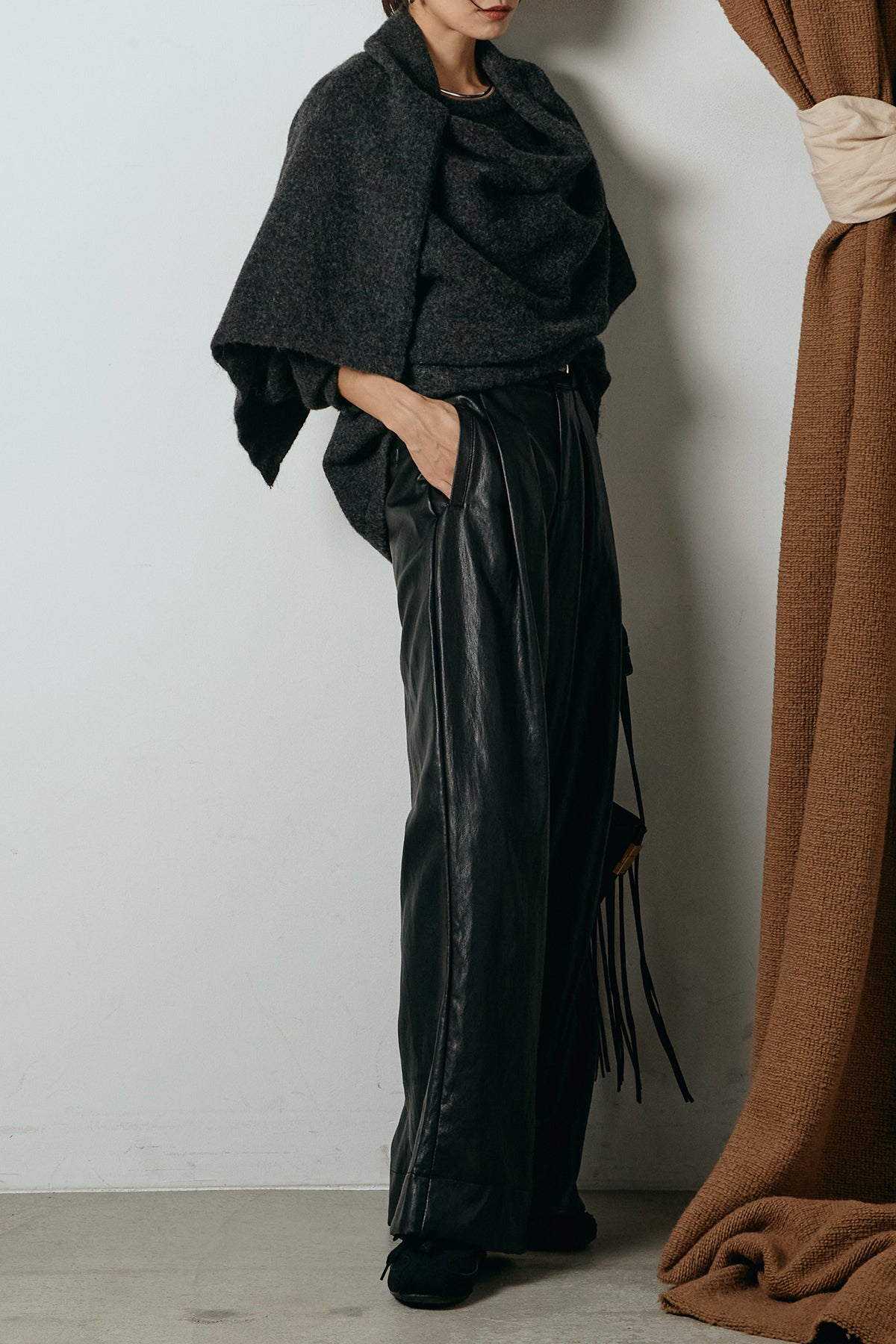 [SET]ネック巻きデザインニットトップス+ベルト付きレザーライクタックパンツ(2set)
