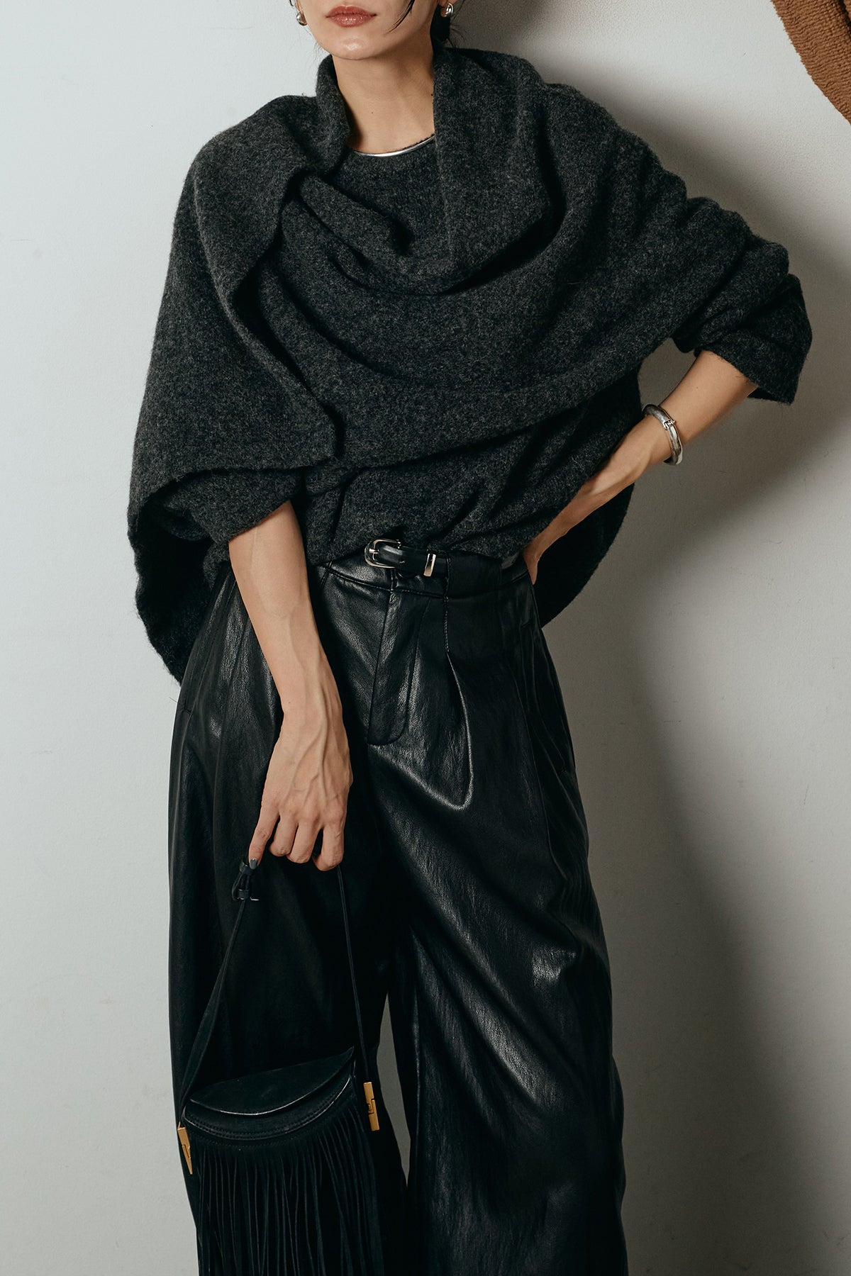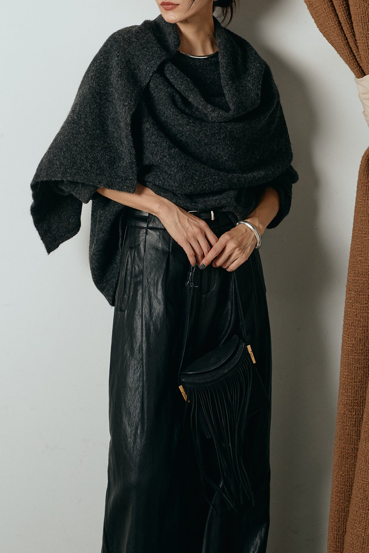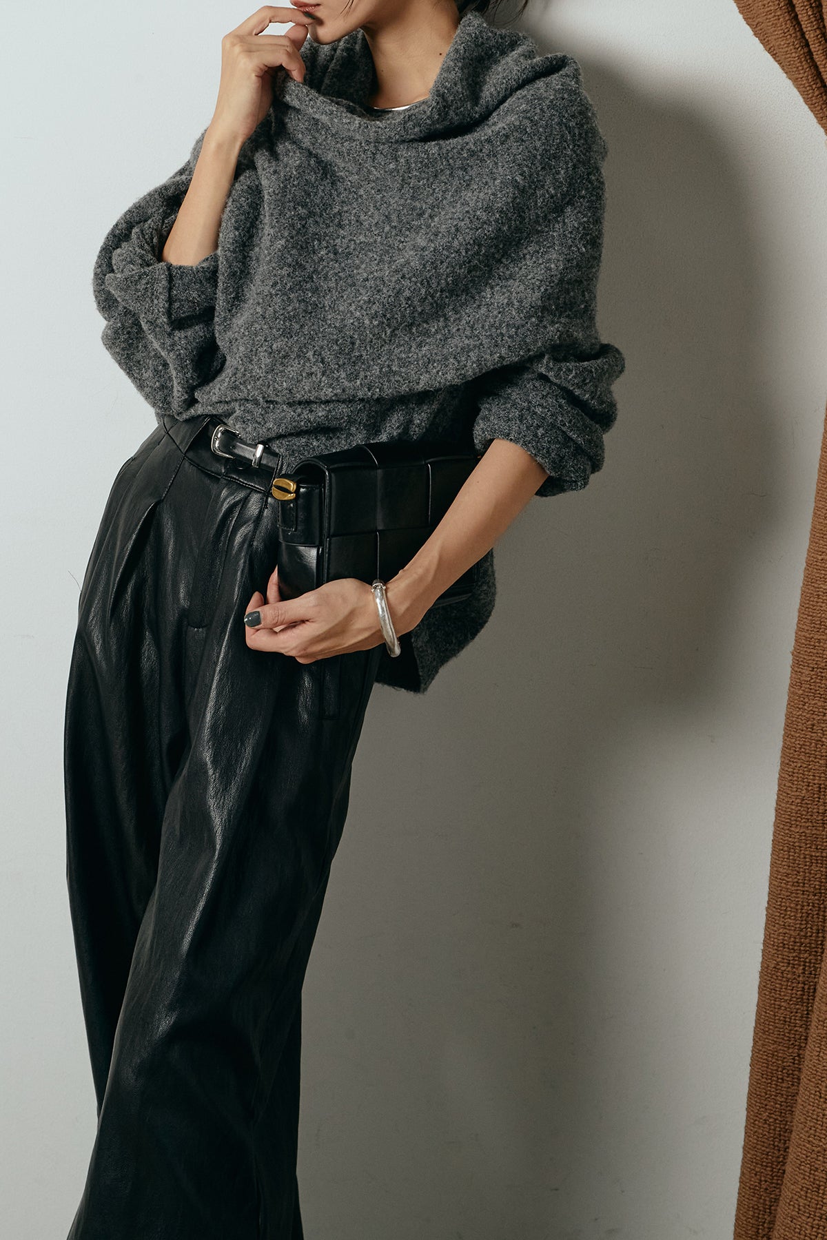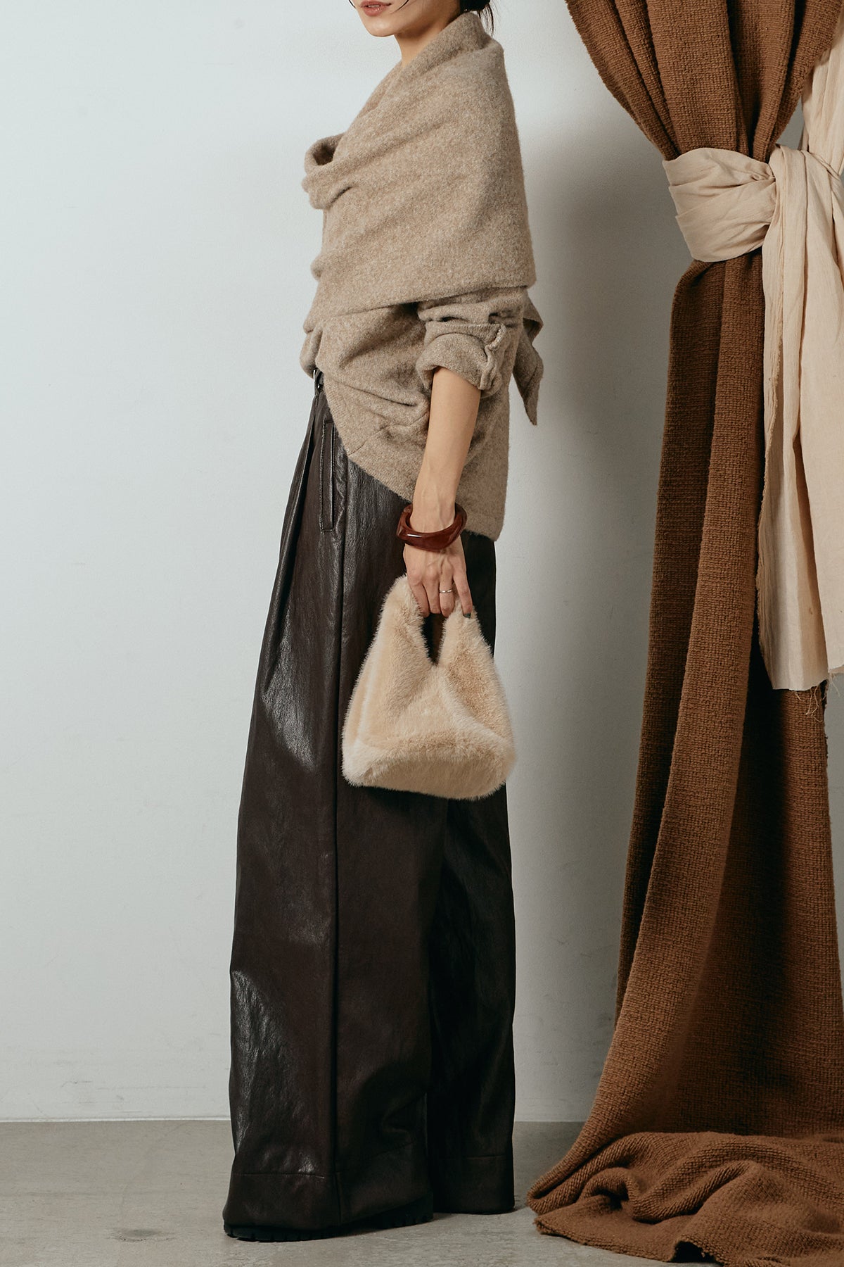 [SET]ネック巻きデザインニットトップス+ベルト付きレザーライクタックパンツ(2set)