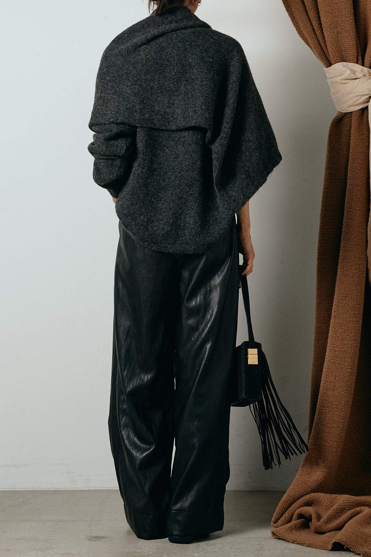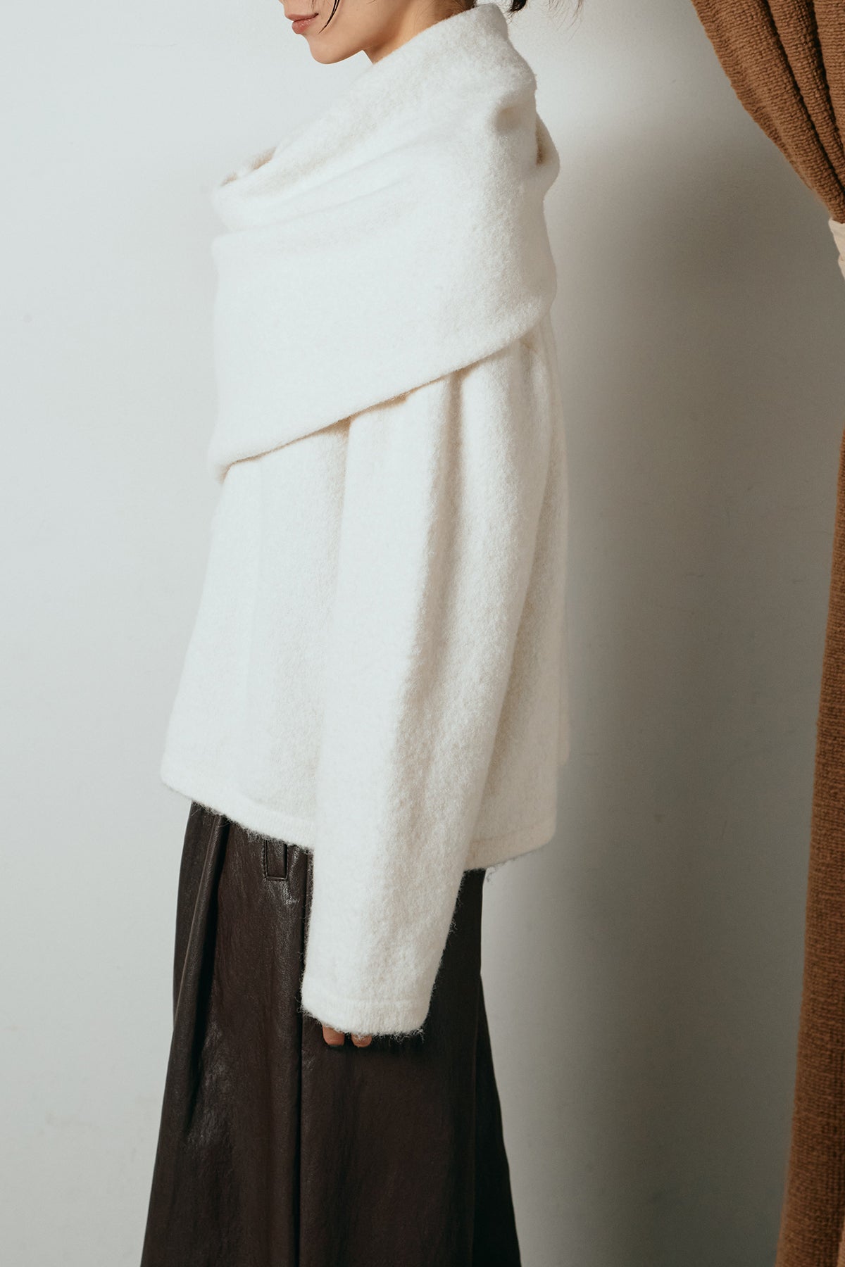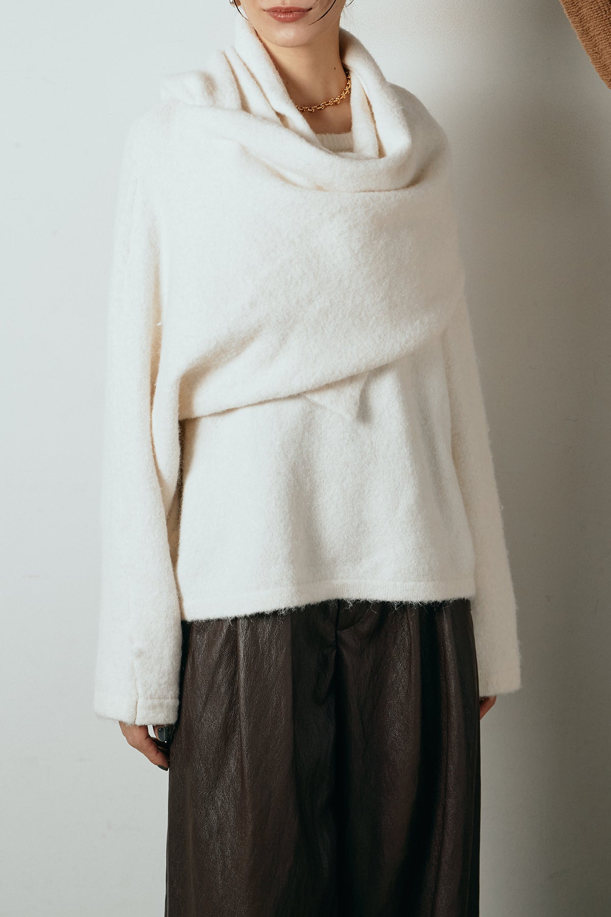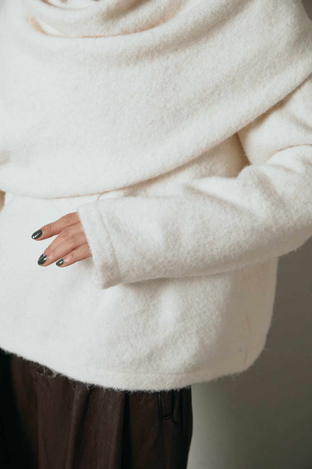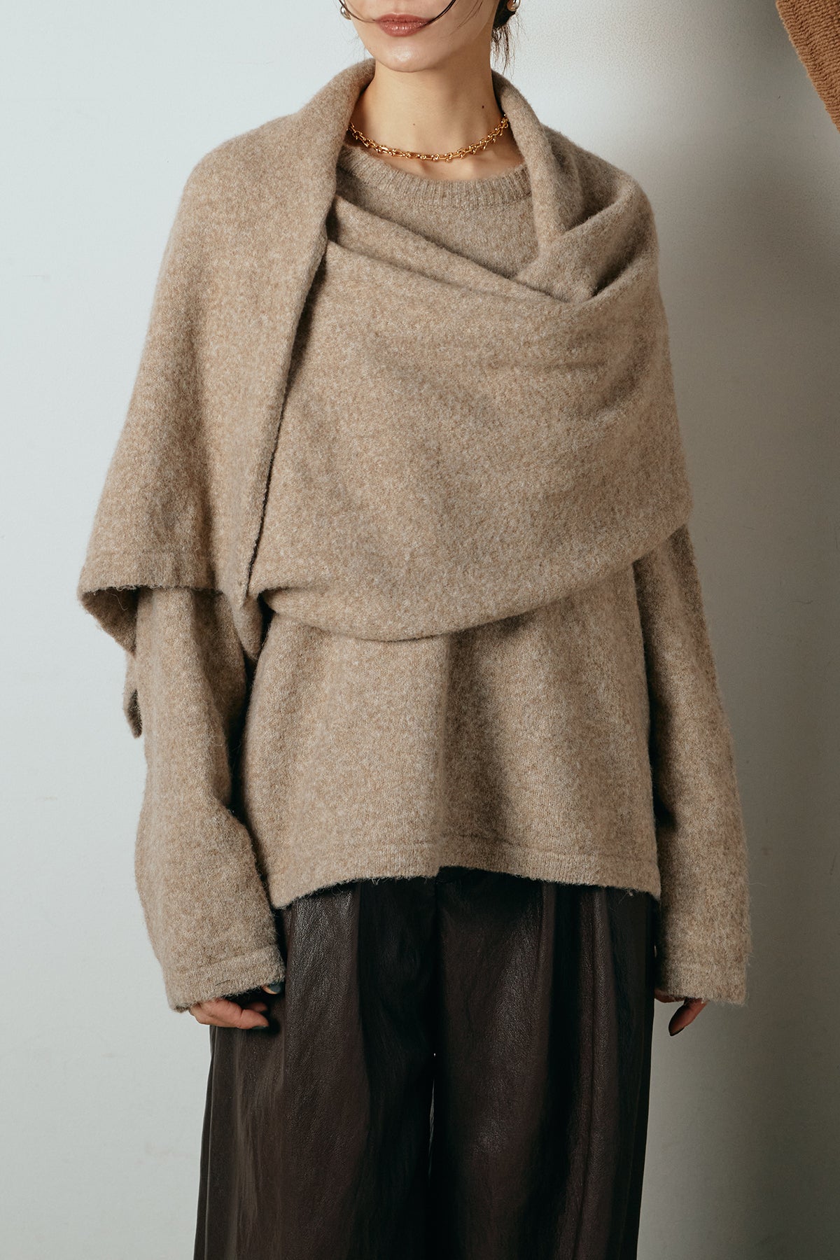 首元に巻いたようなデザインが印象的なニットトップス。柔らかな素材感と立体的なネックラインが、シンプルな中にも動きを生み出します。ほどよくゆとりのあるシルエットでリラックス感がありつつ、自然に体に沿うバランスに。パンツにもスカートにも合わせやすく、着るだけでスタイリングにニュアンスを添える一枚です。
