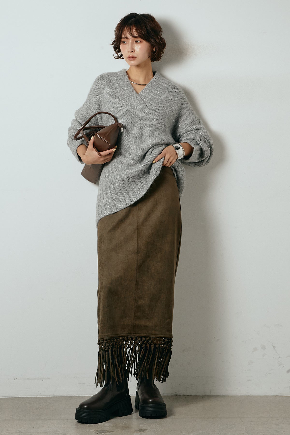 ボリューム感のあるフリンジを裾に施したスウェード調スカート。すとんと落ちるIラインに揺れ感を加え、足元に存在感をプラスする一本です。シンプルなトップスでも華やぎが生まれ、ブーツ合わせで季節感のある着こなしに。質感のある素材がコーデを引き締め、普段使いから特別な日まで幅広く楽しめます。