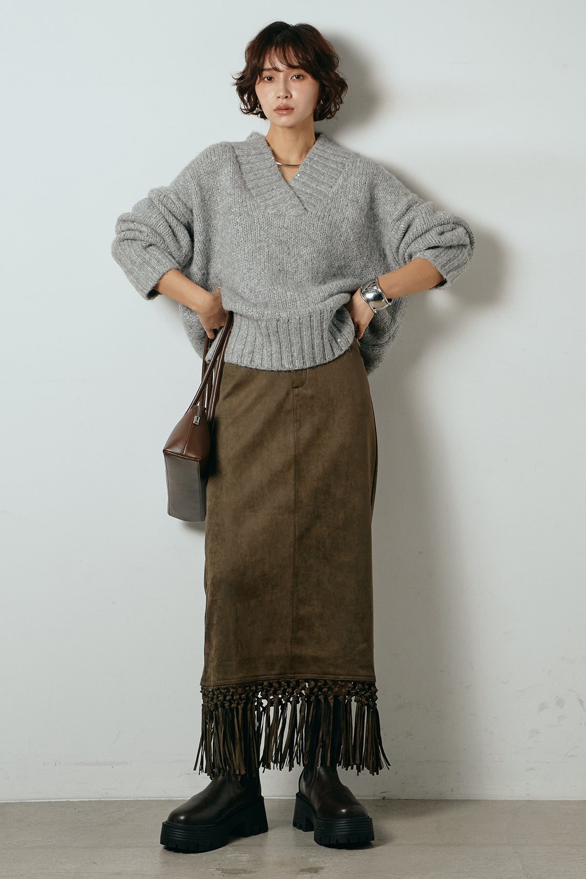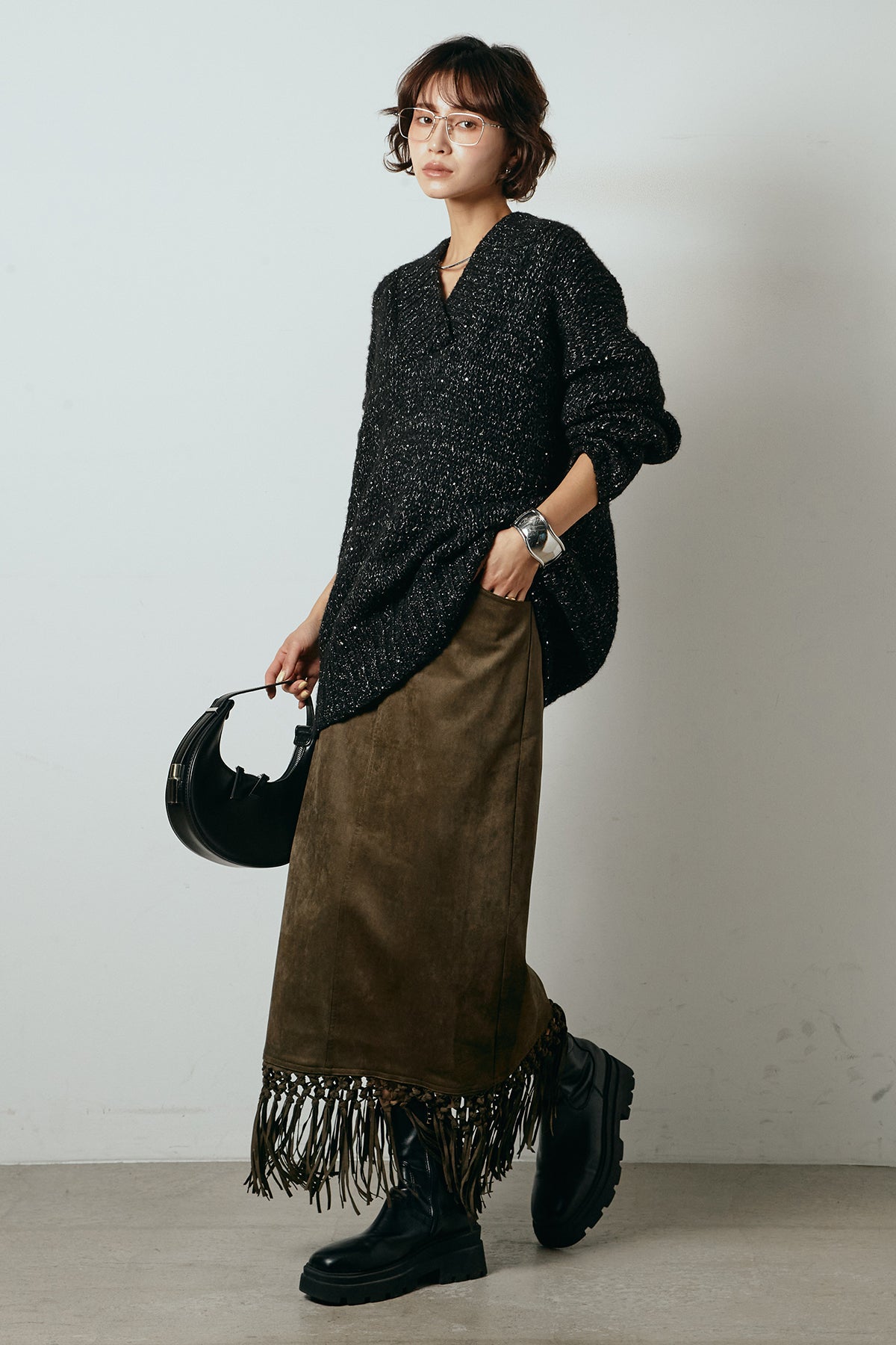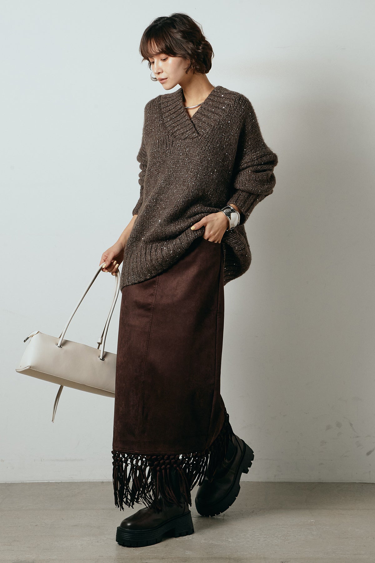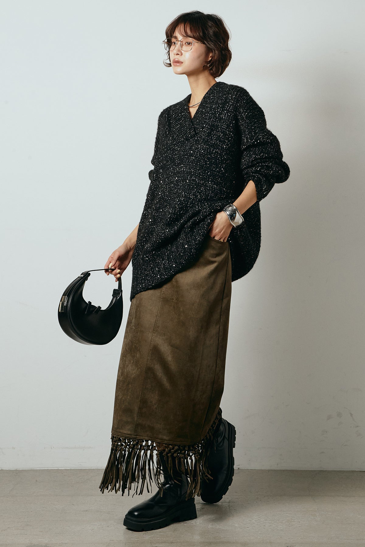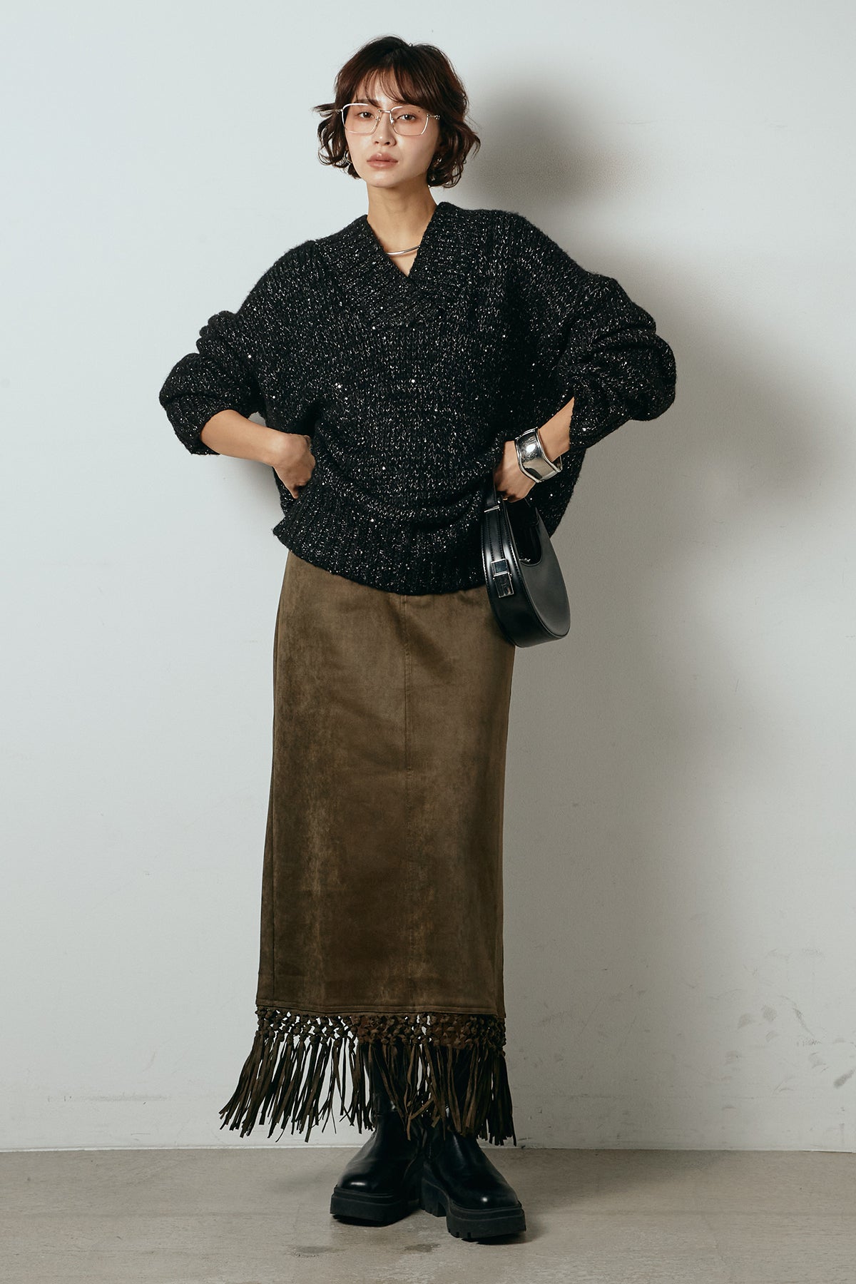 [SET]Vネックラメニットトップス+スウェードライク裾フリンジスカート(2set)