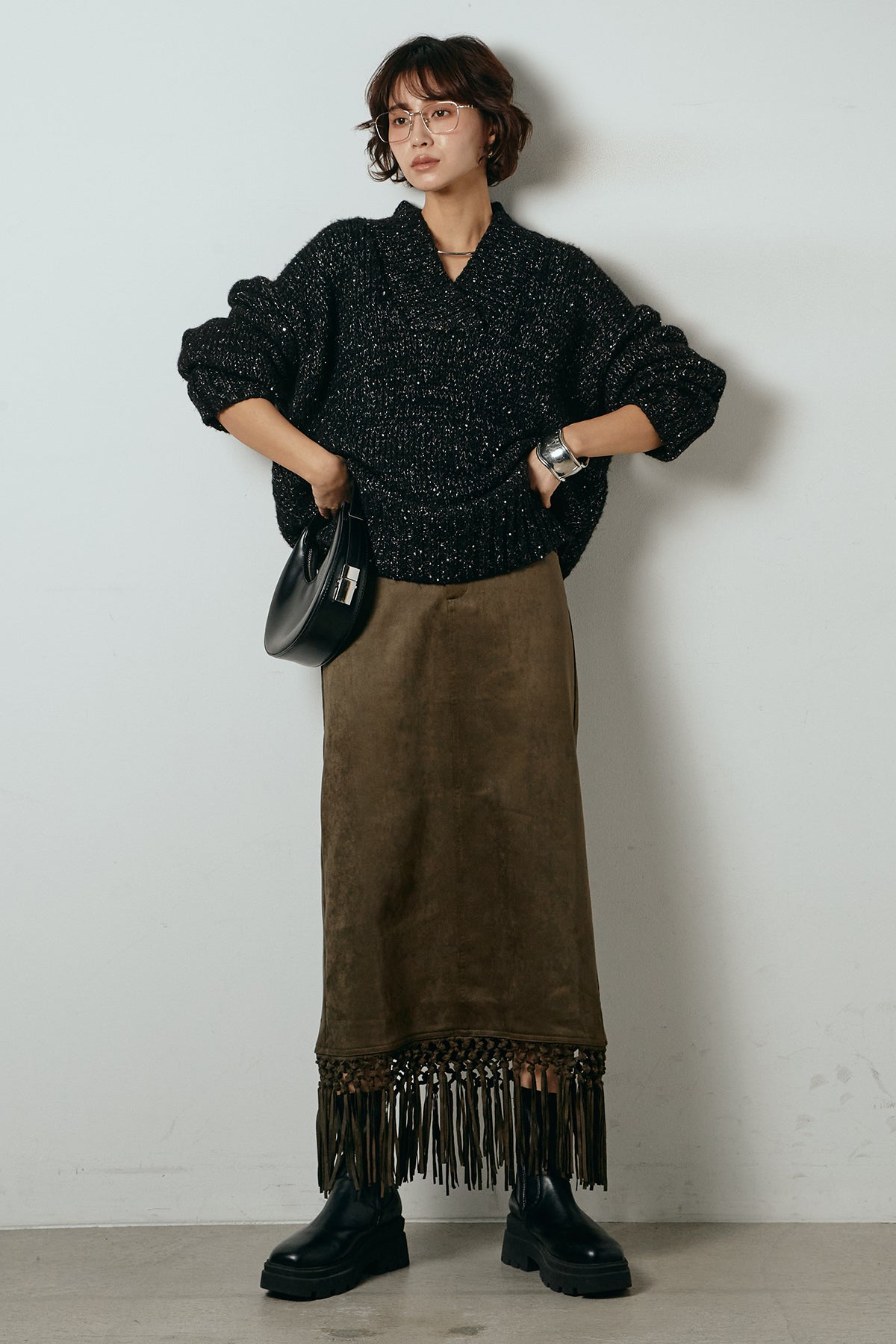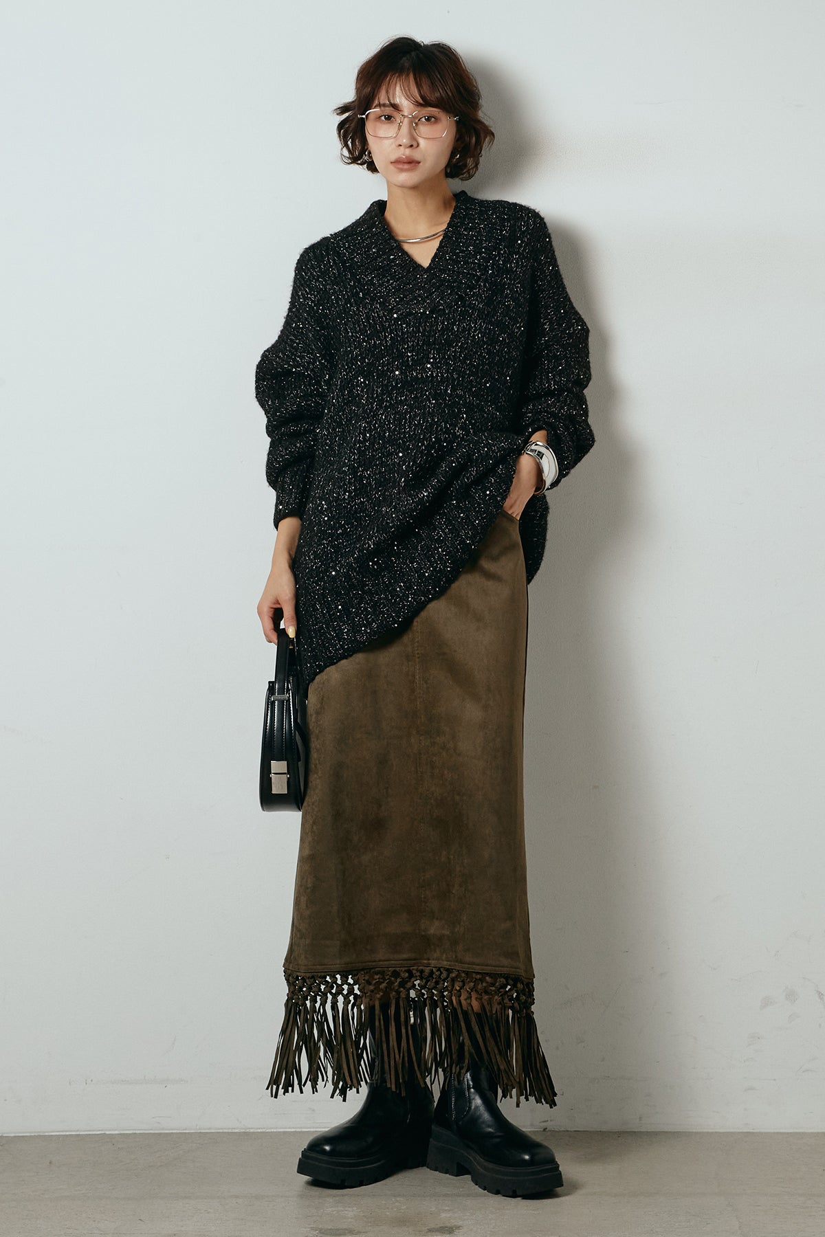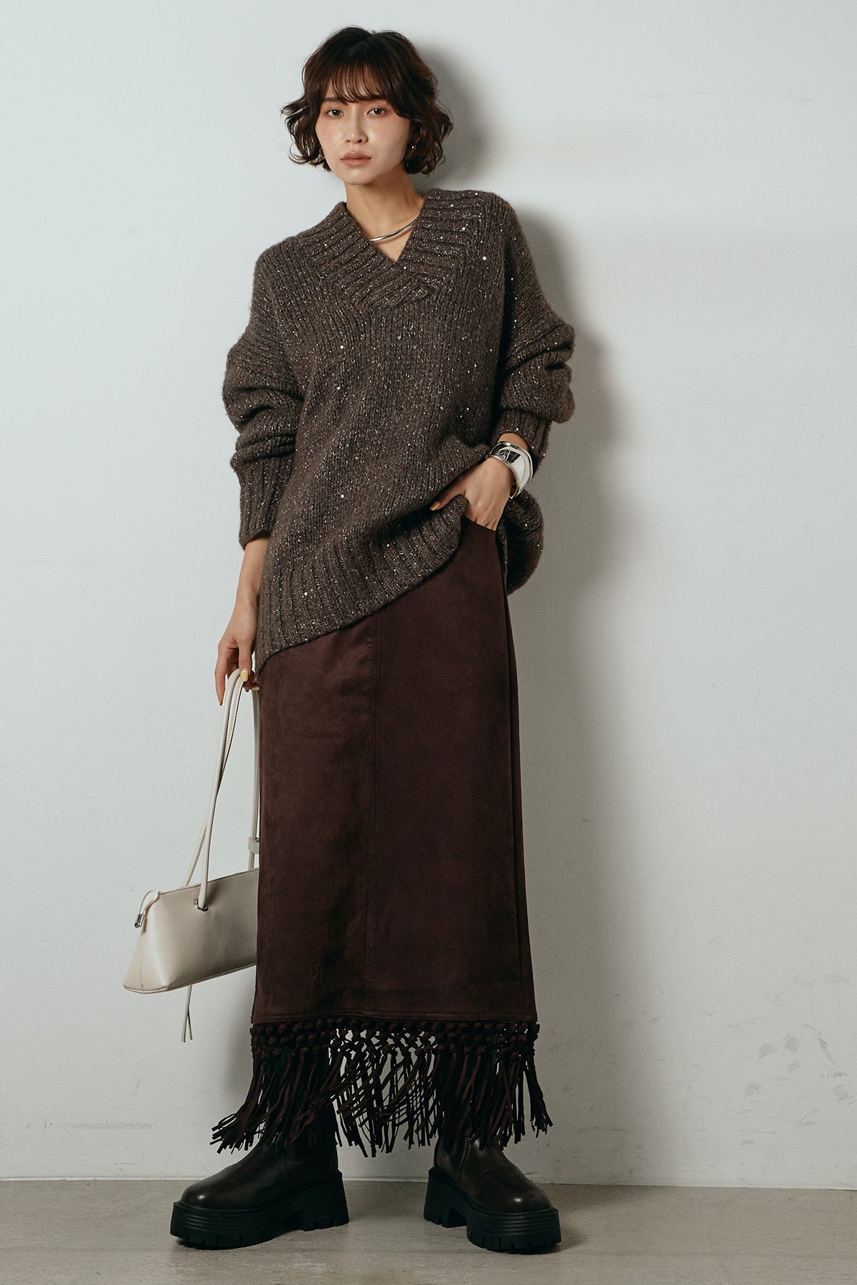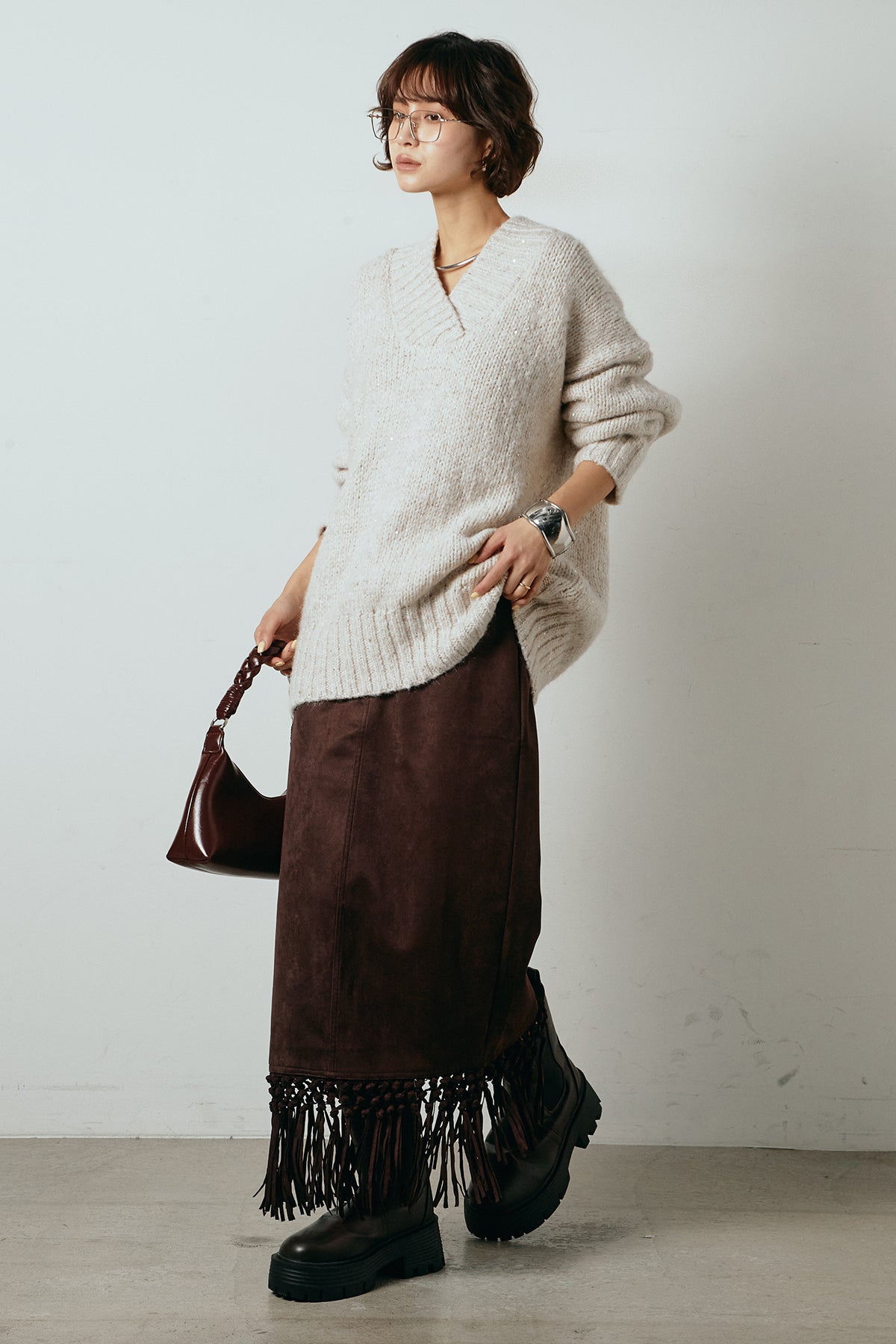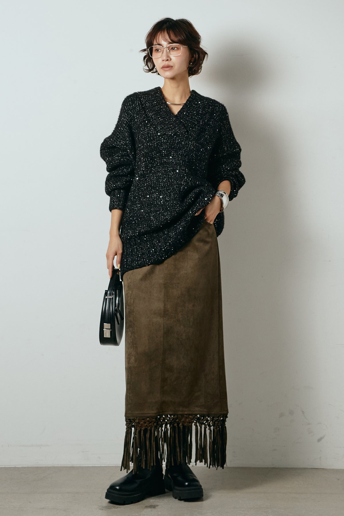 [SET]Vネックラメニットトップス+スウェードライク裾フリンジスカート(2set)