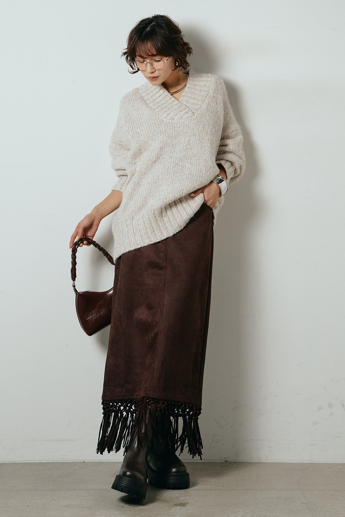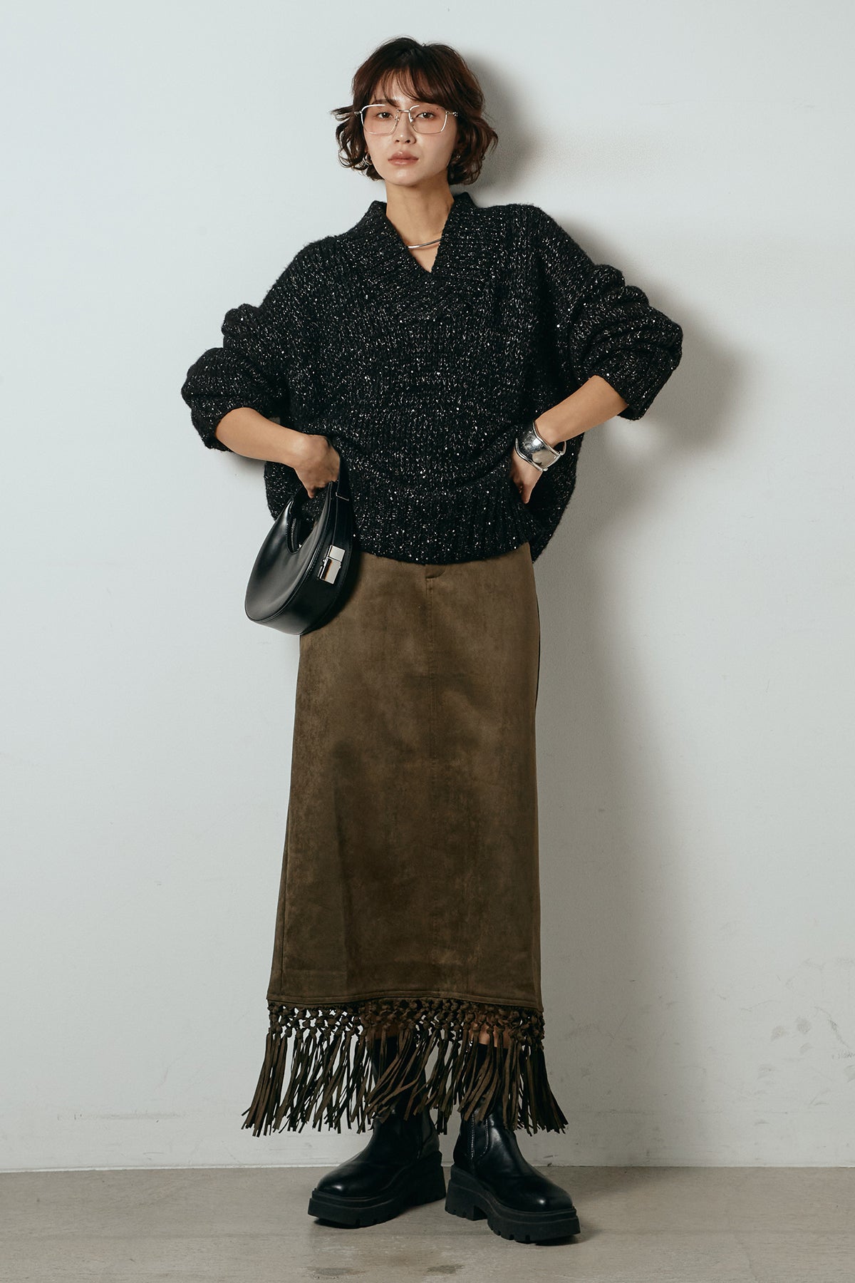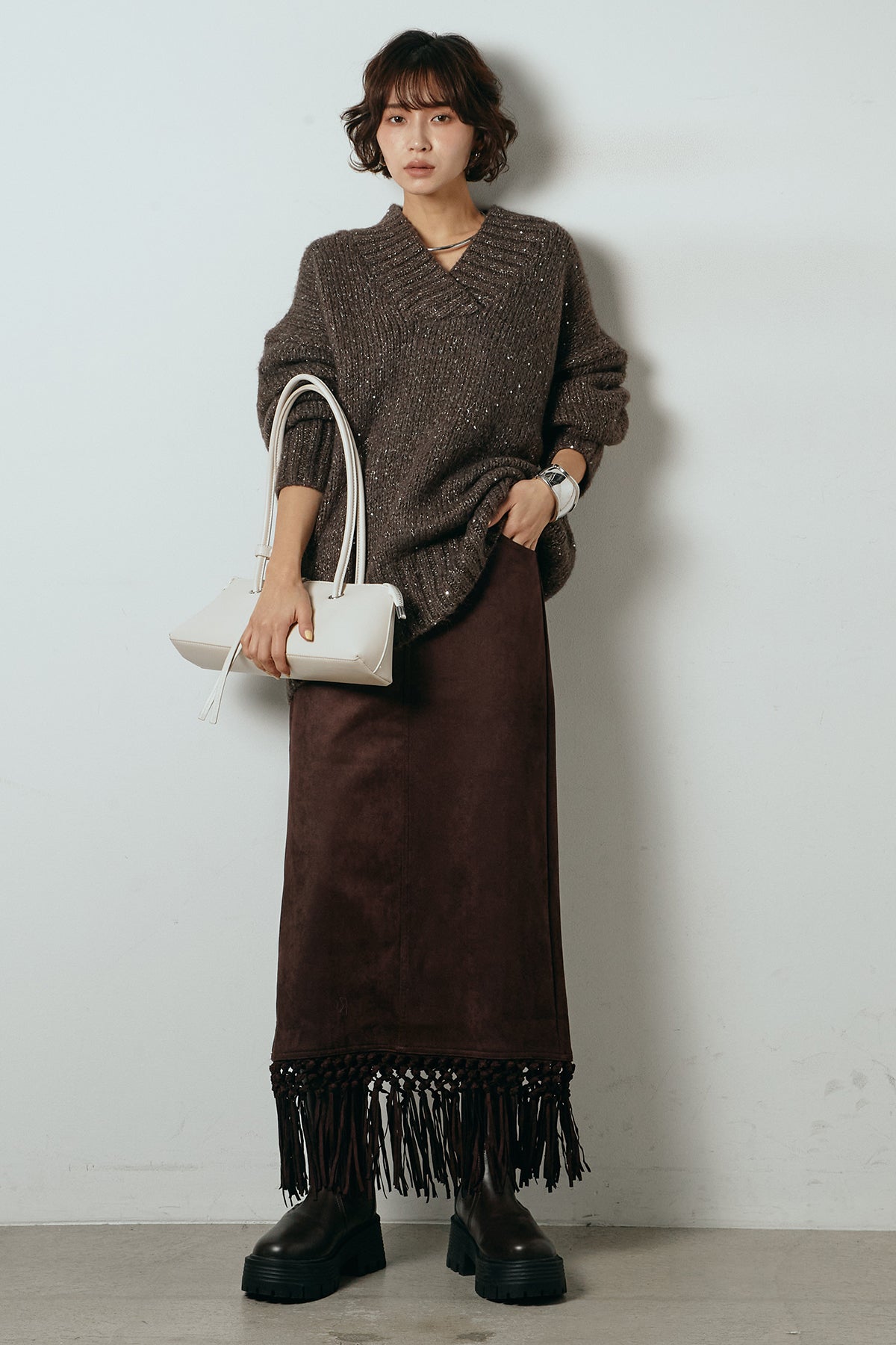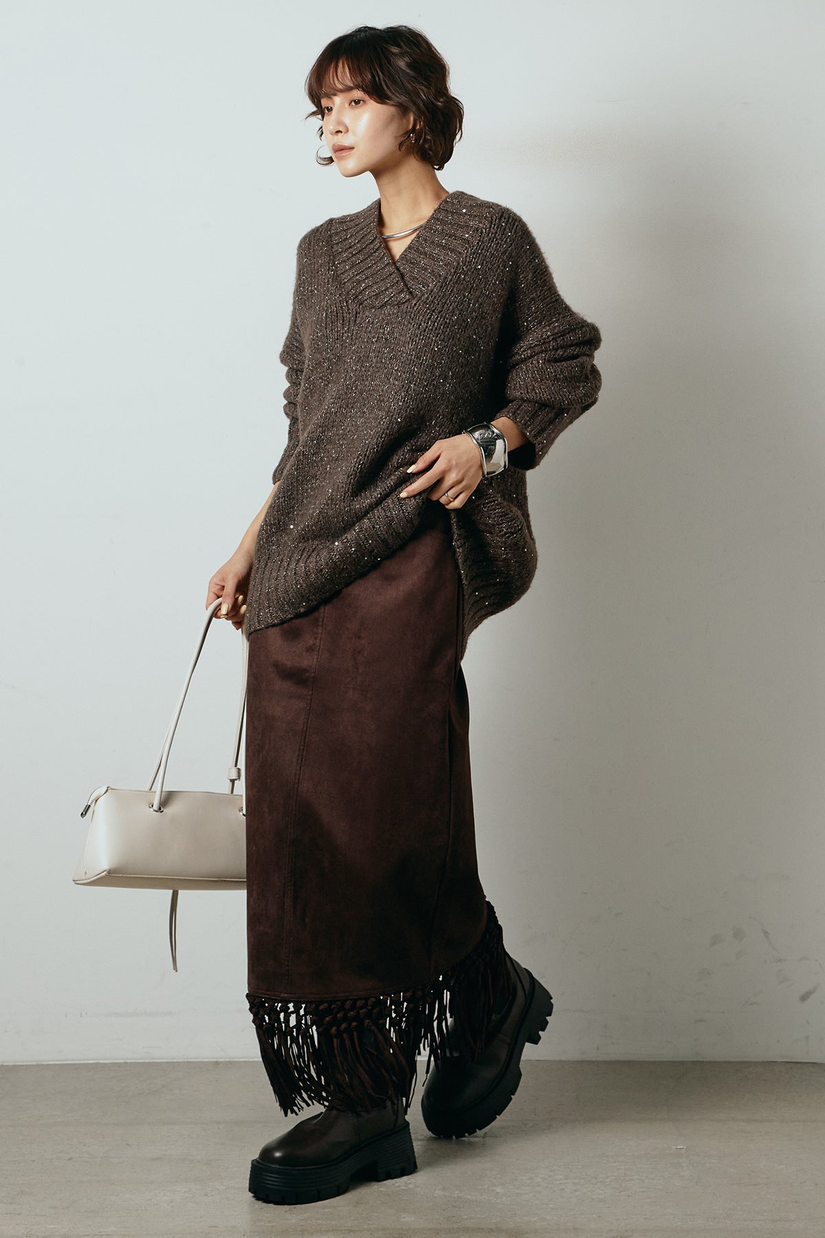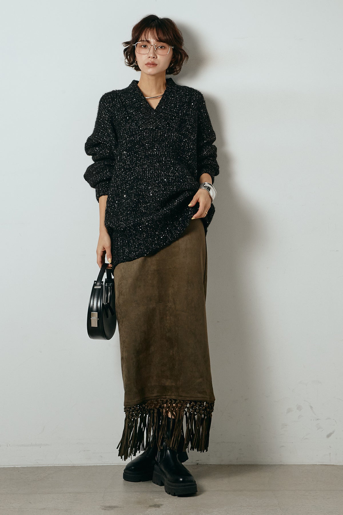 [SET]Vネックラメニットトップス+スウェードライク裾フリンジスカート(2set)