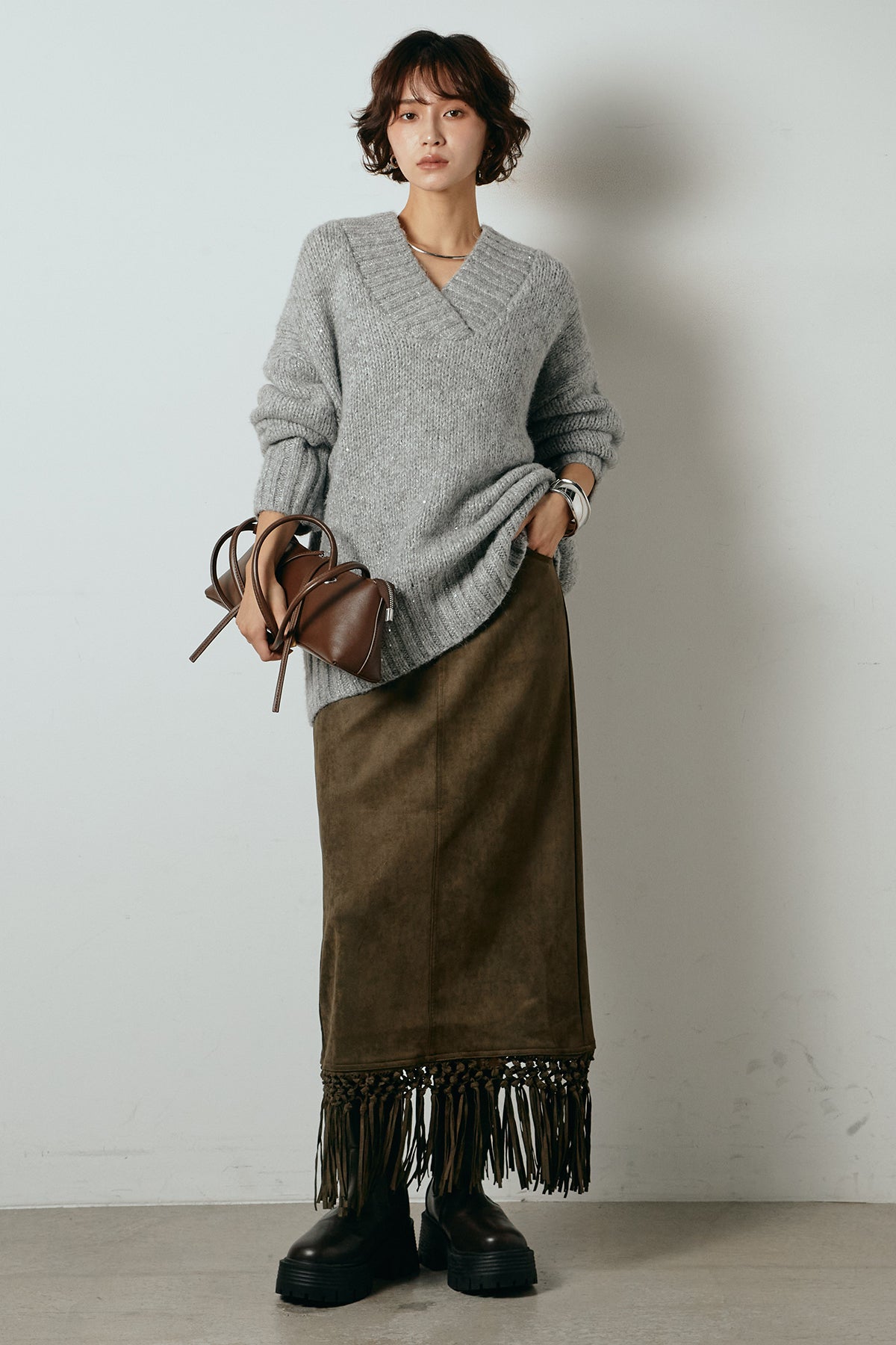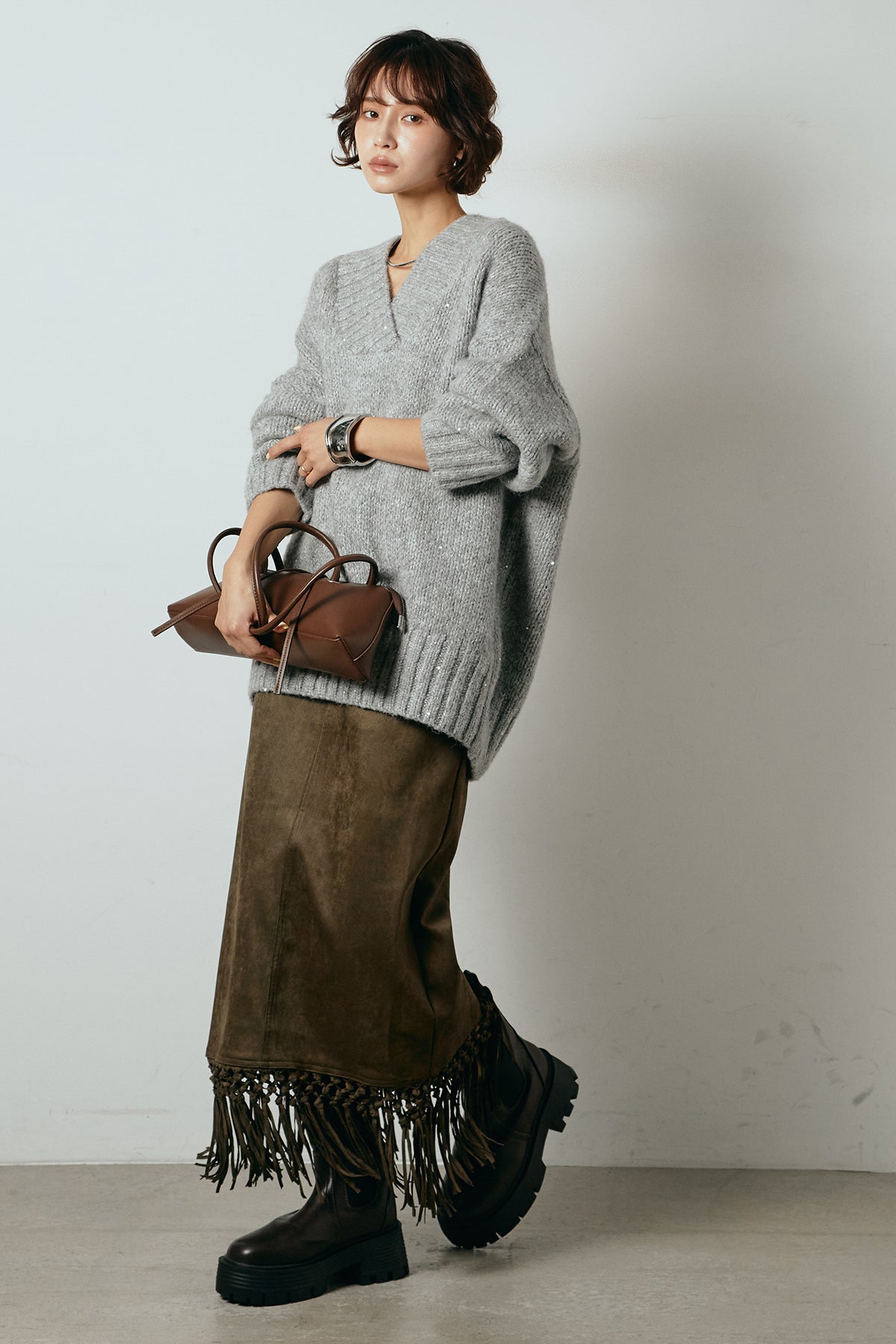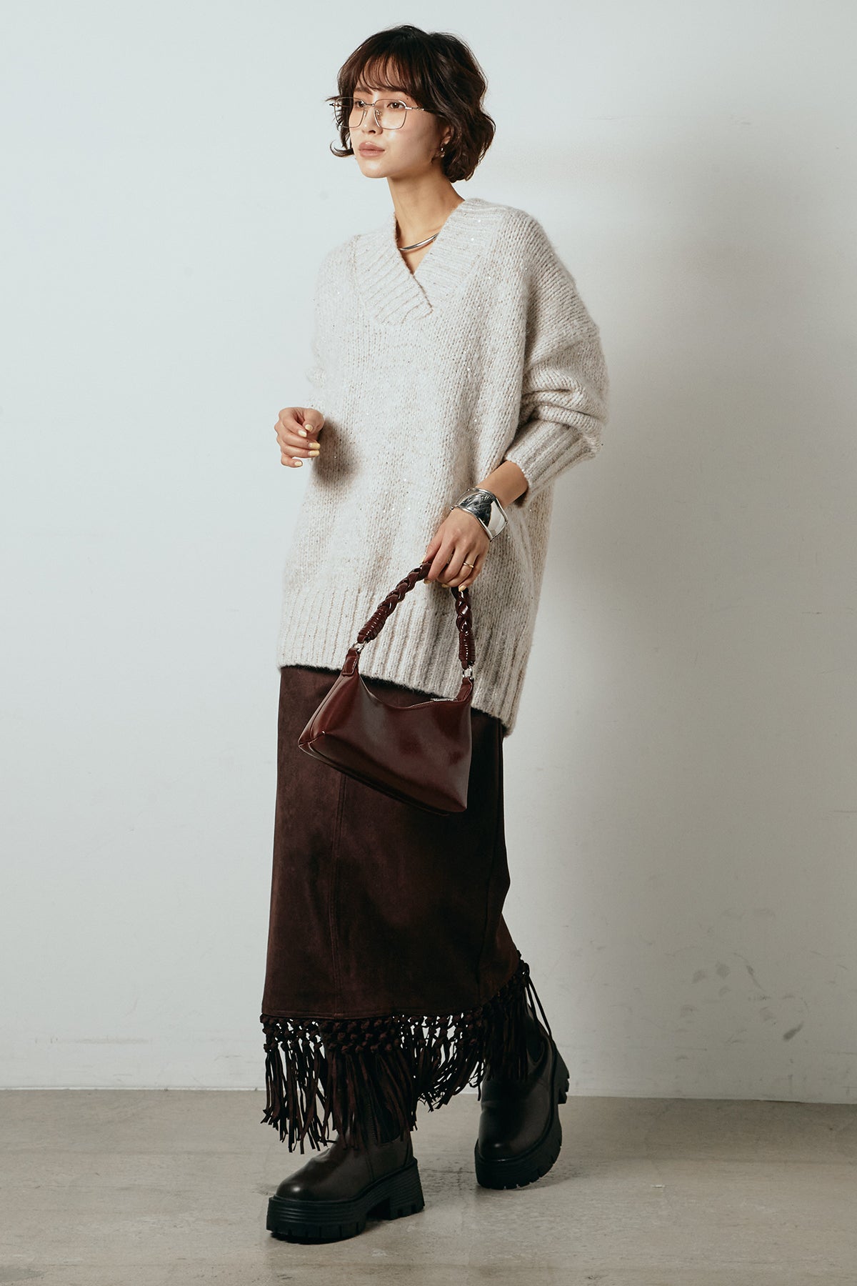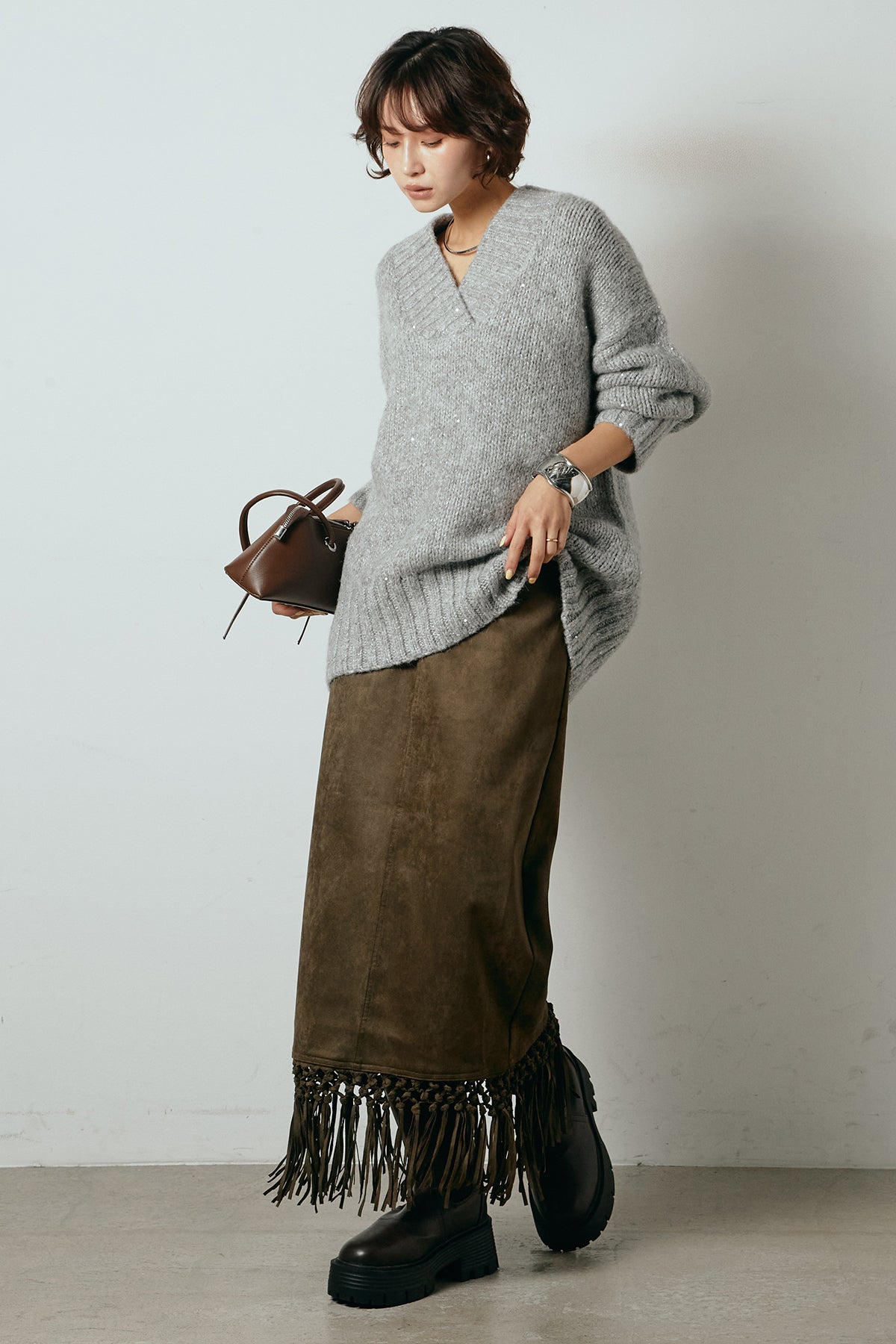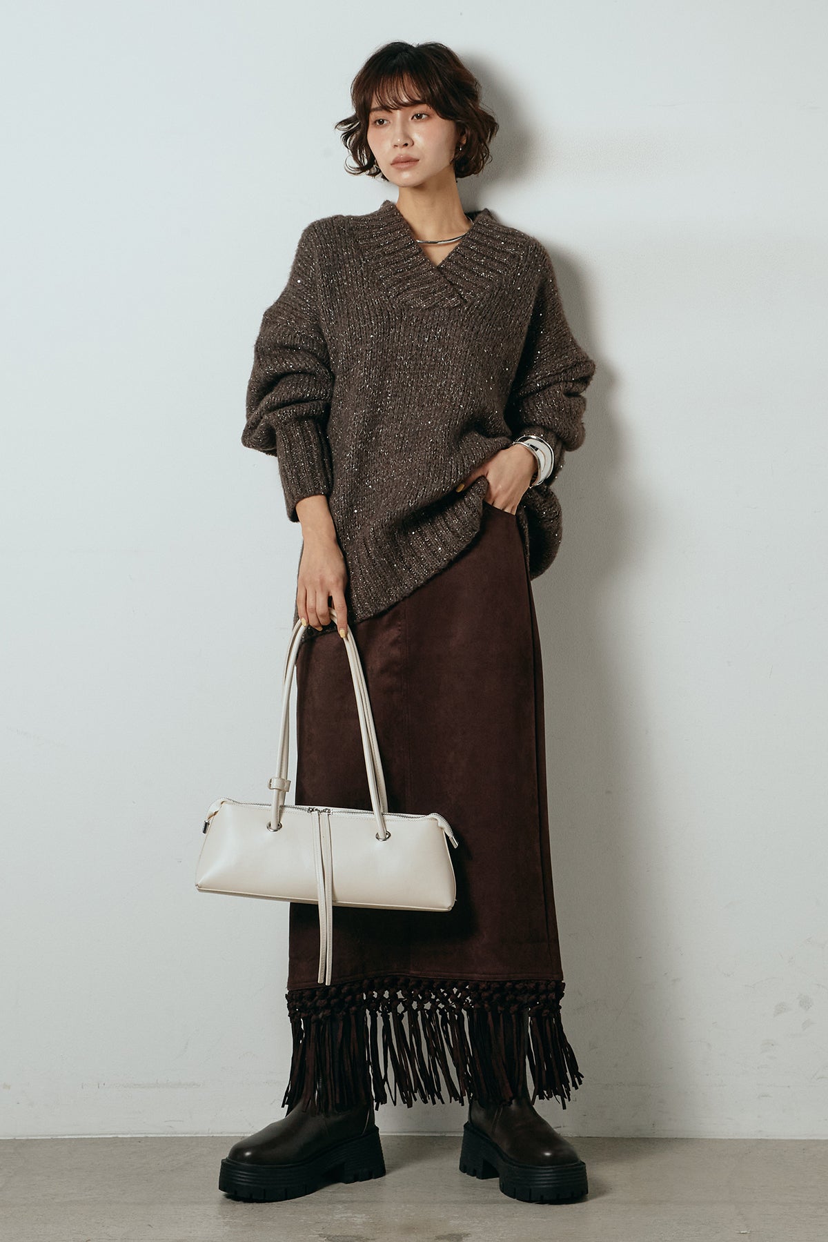 [SET]Vネックラメニットトップス+スウェードライク裾フリンジスカート(2set)