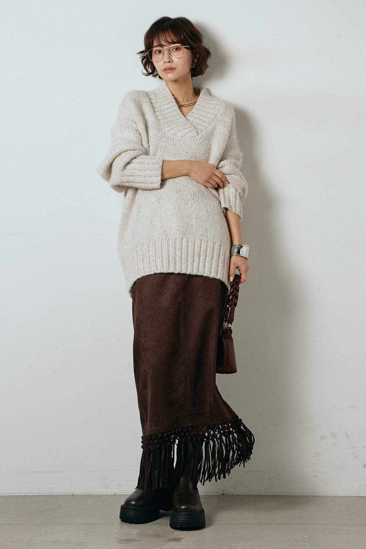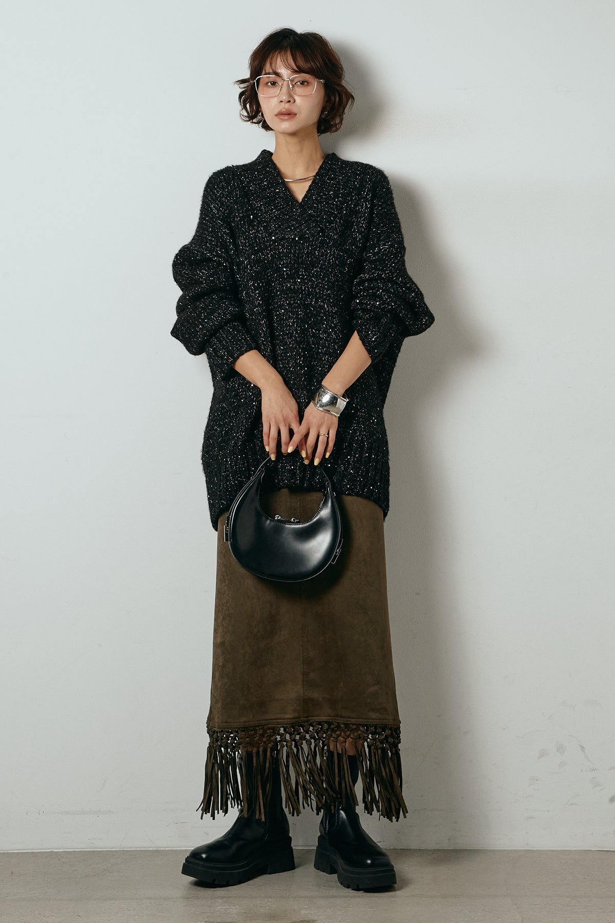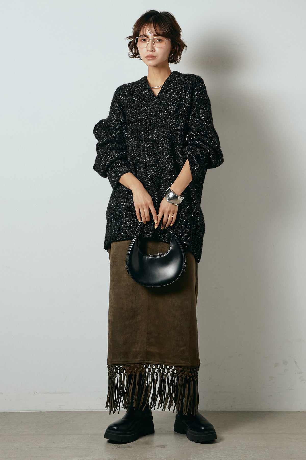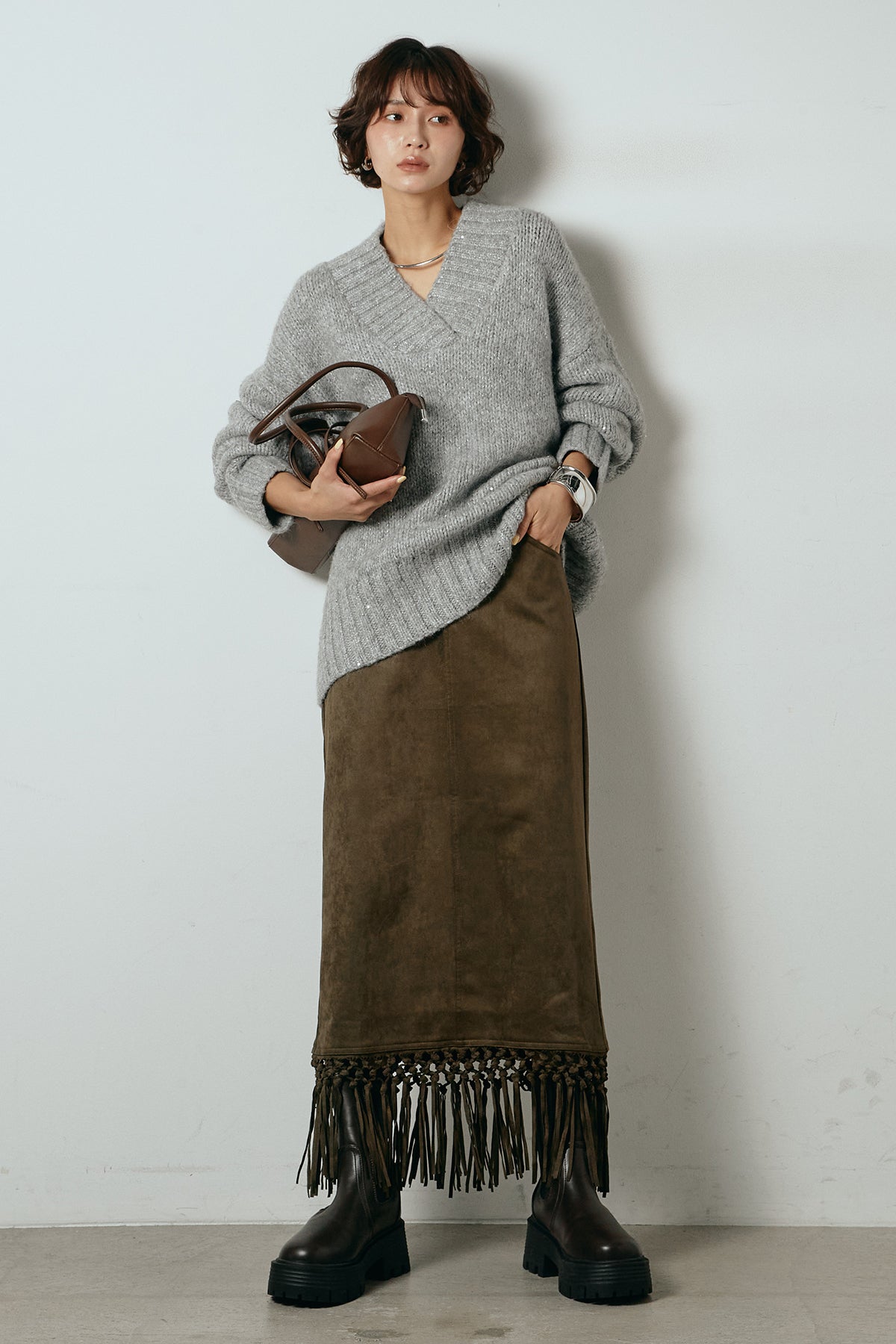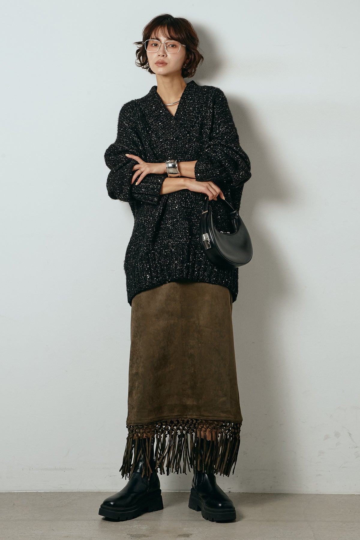 [SET]Vネックラメニットトップス+スウェードライク裾フリンジスカート(2set)