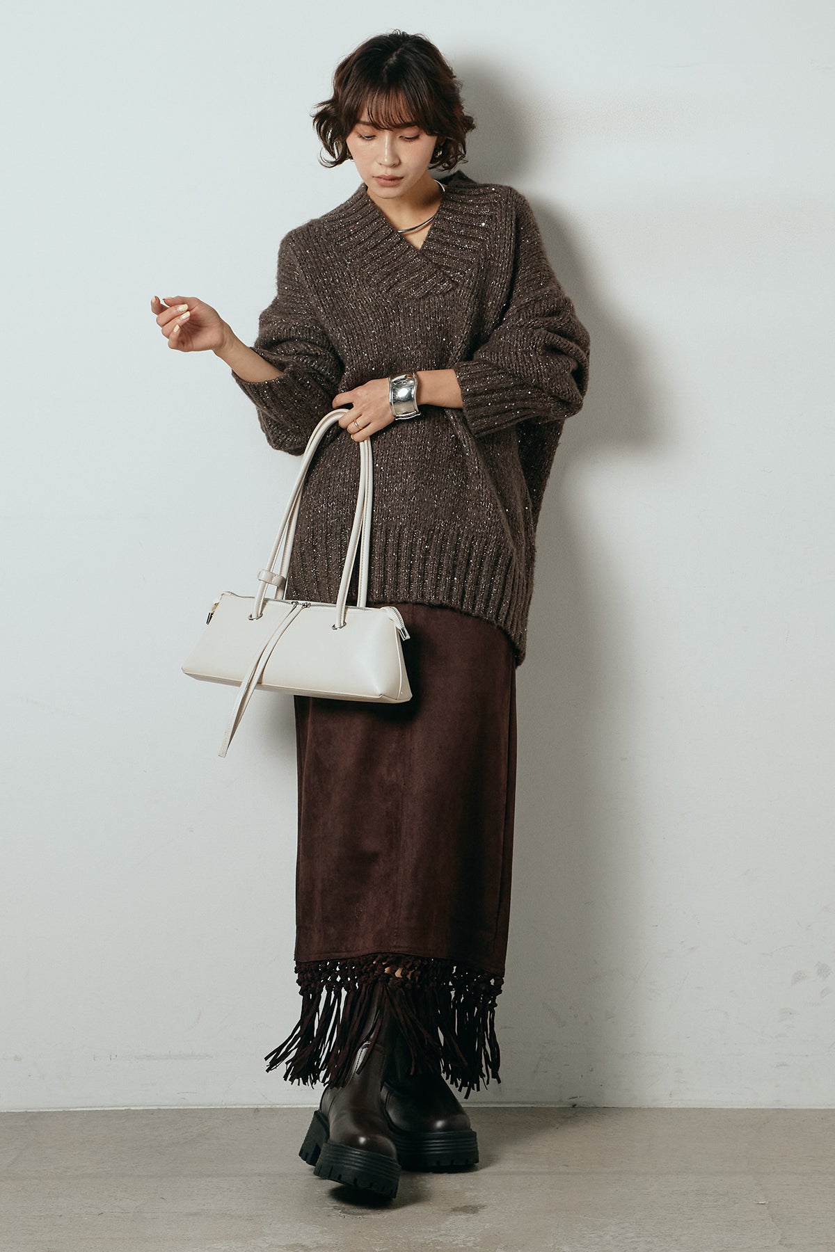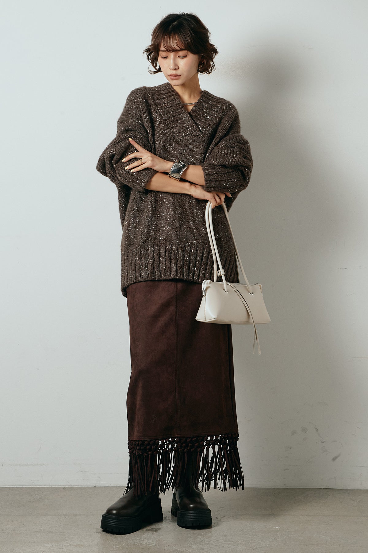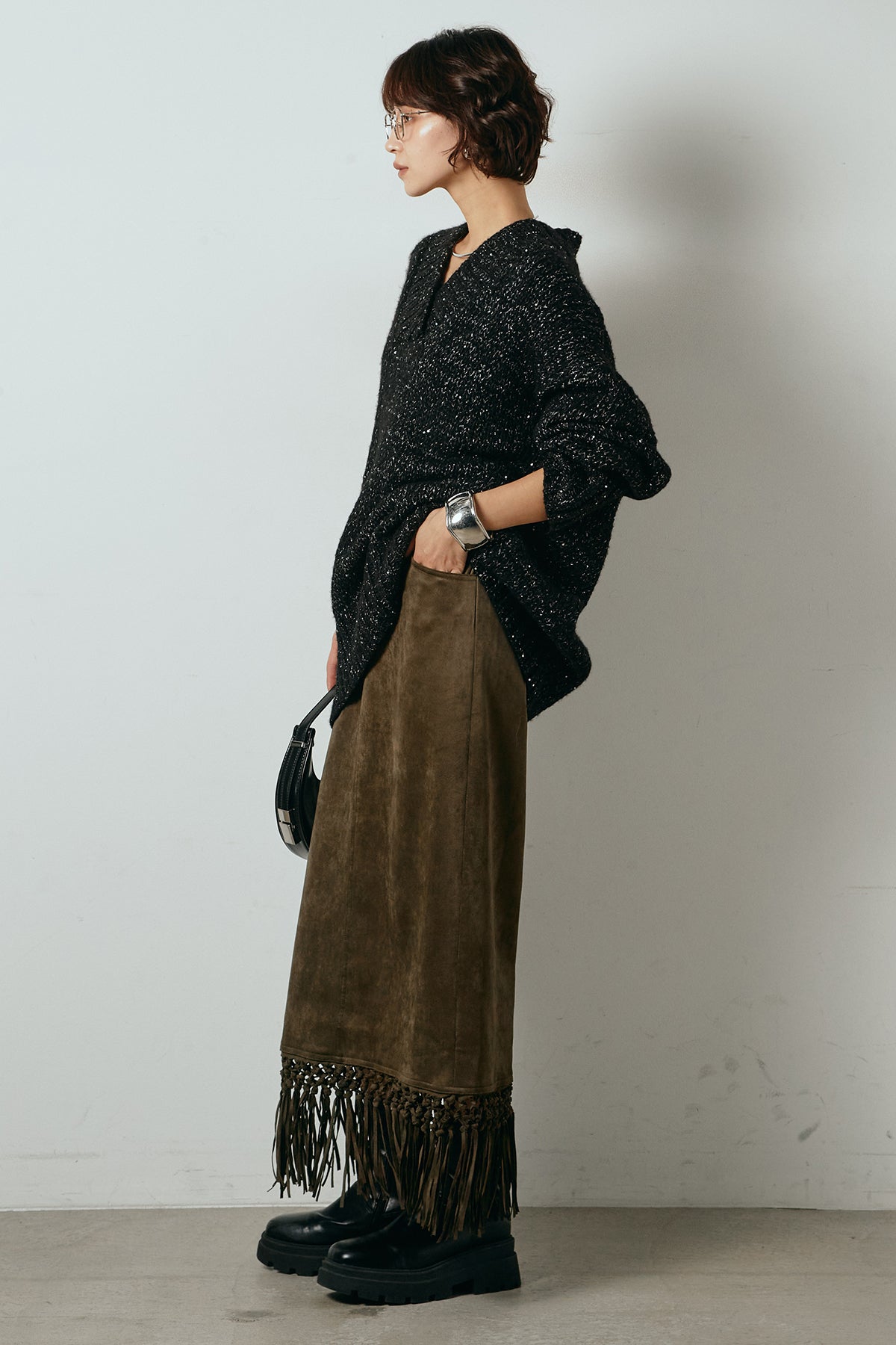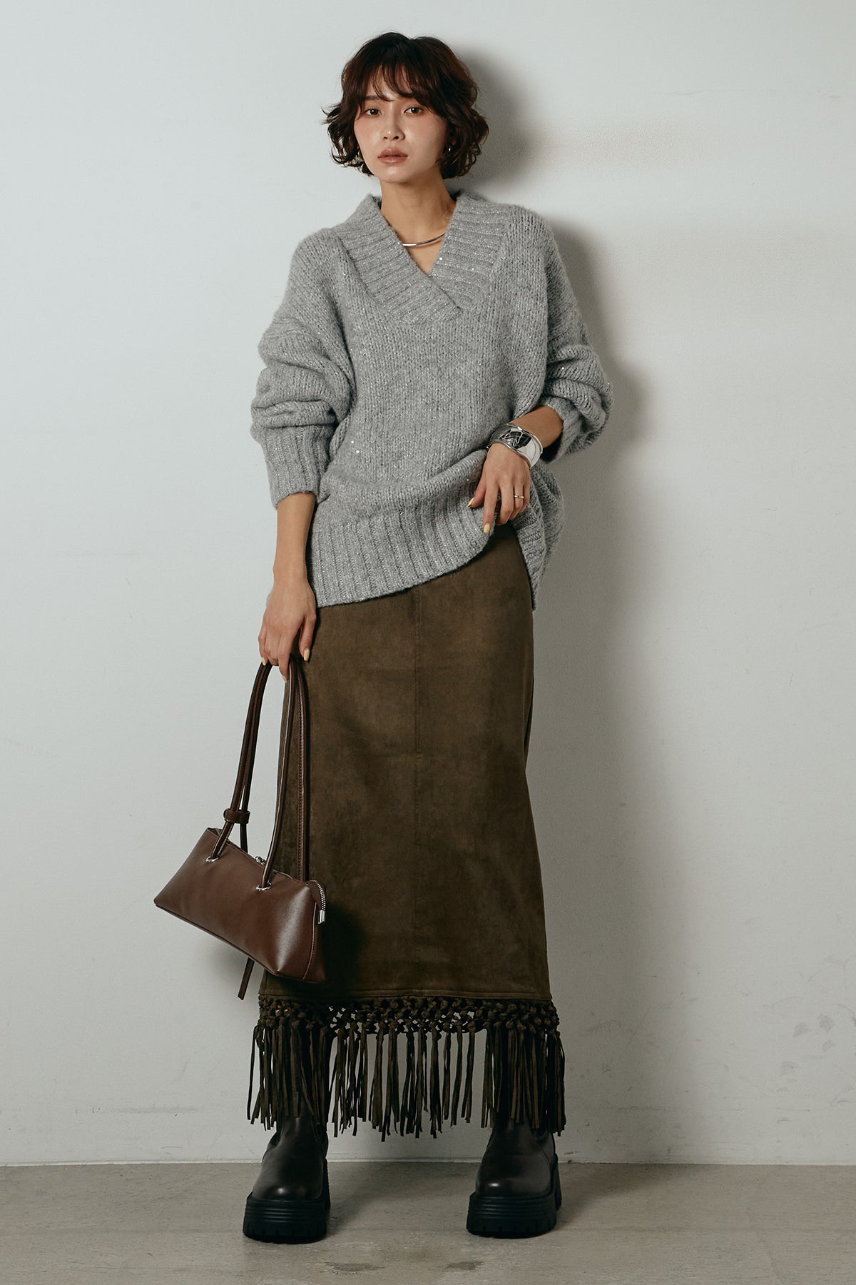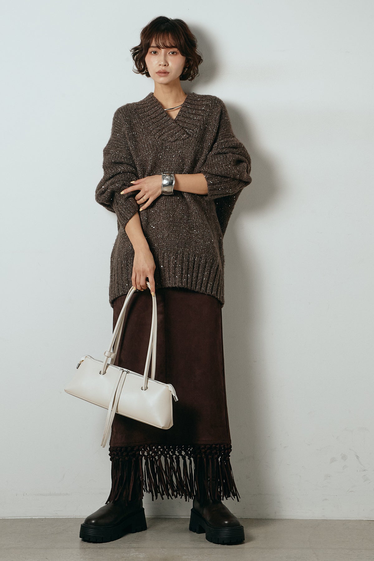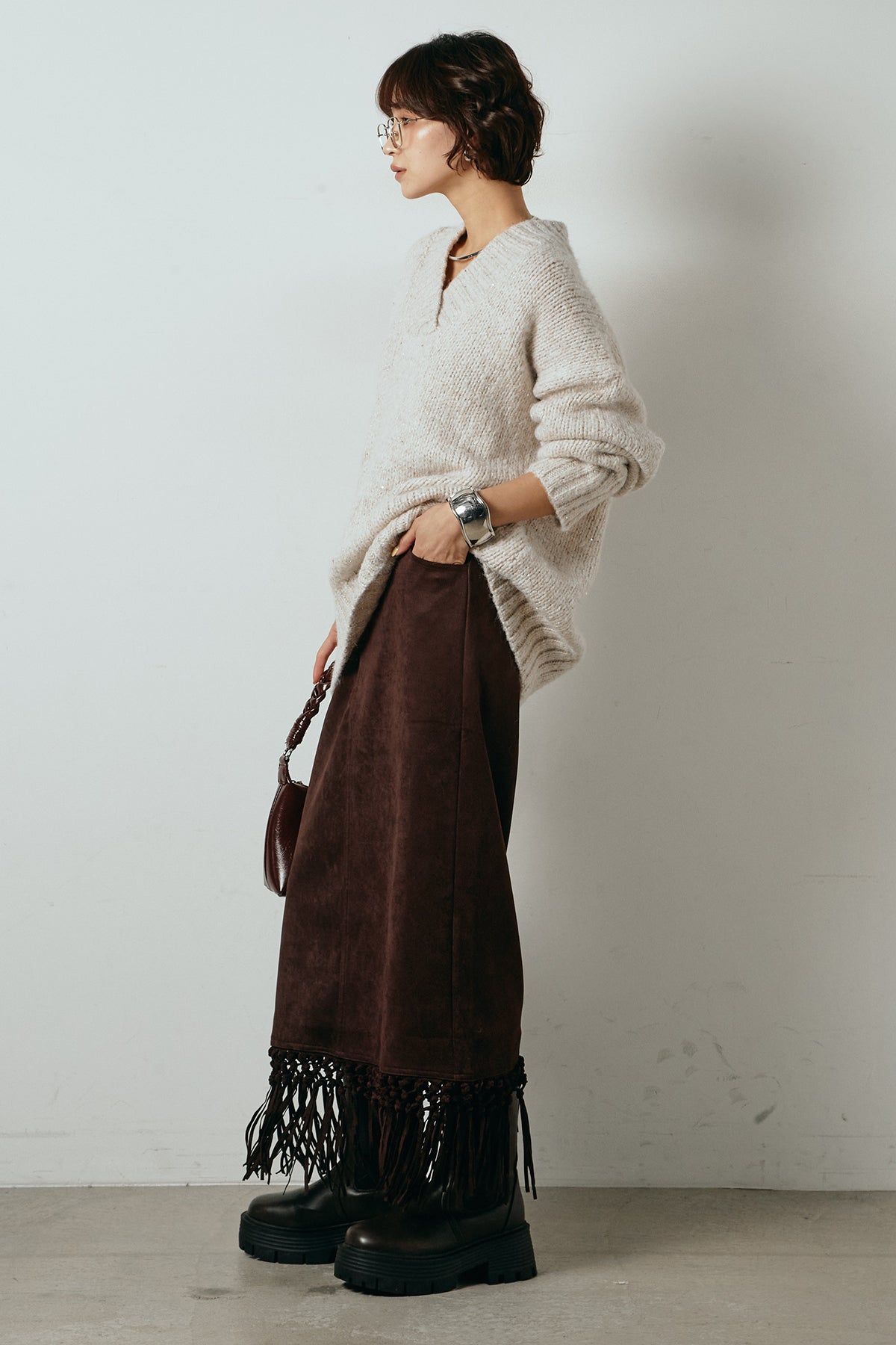 [SET]Vネックラメニットトップス+スウェードライク裾フリンジスカート(2set)