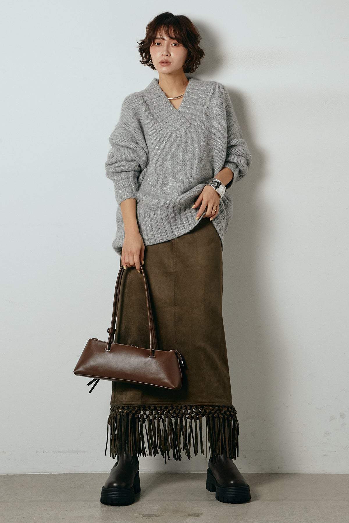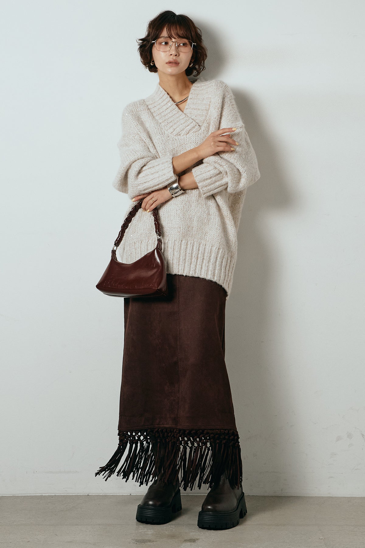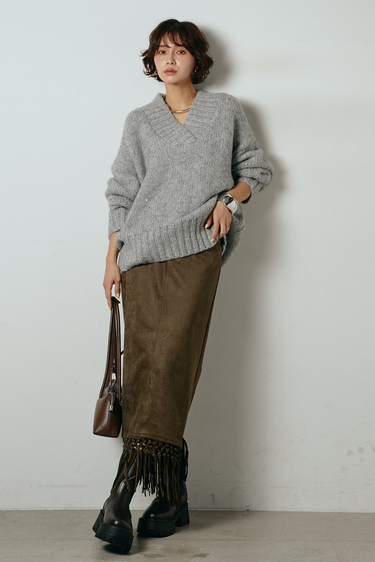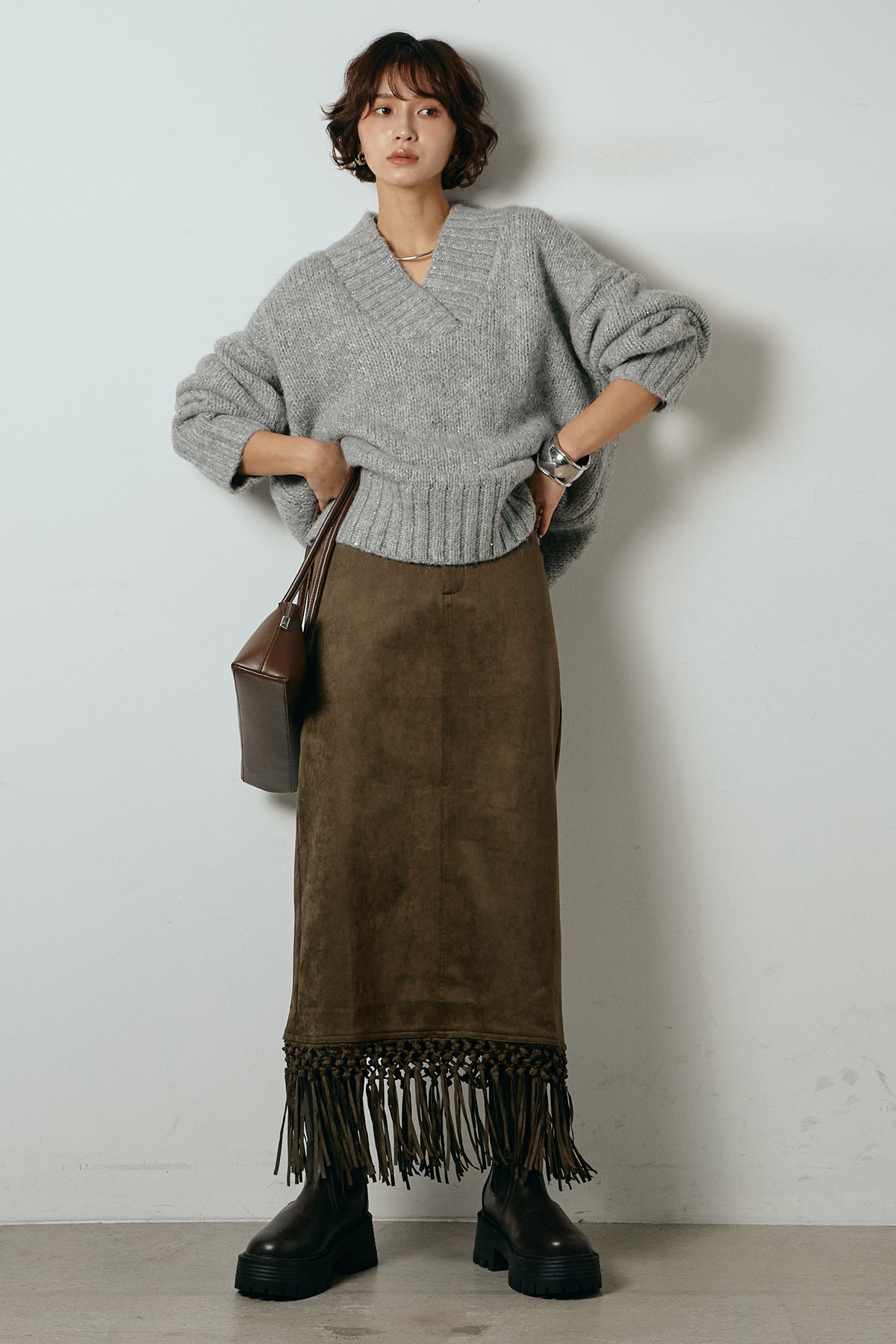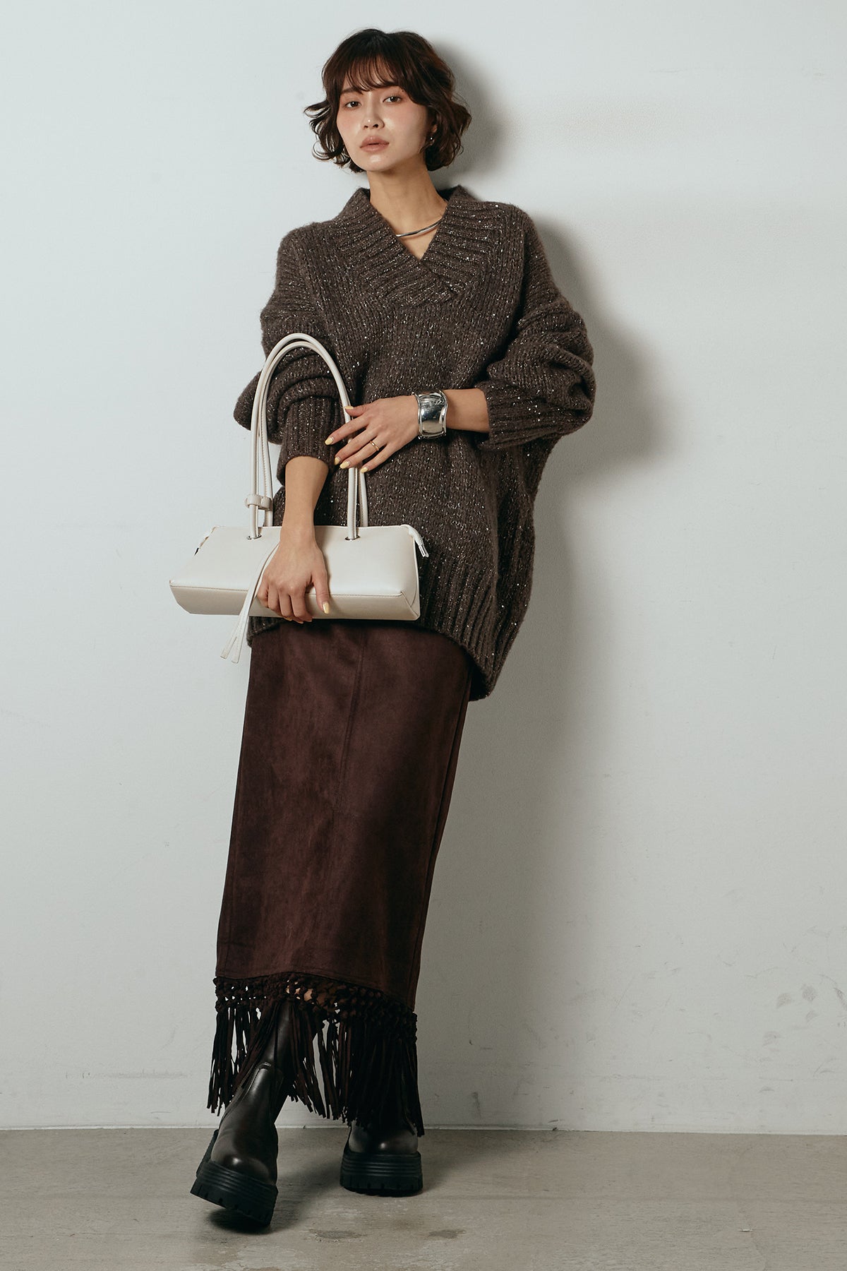 [SET]Vネックラメニットトップス+スウェードライク裾フリンジスカート(2set)