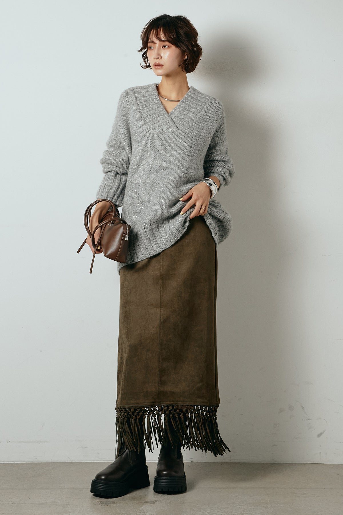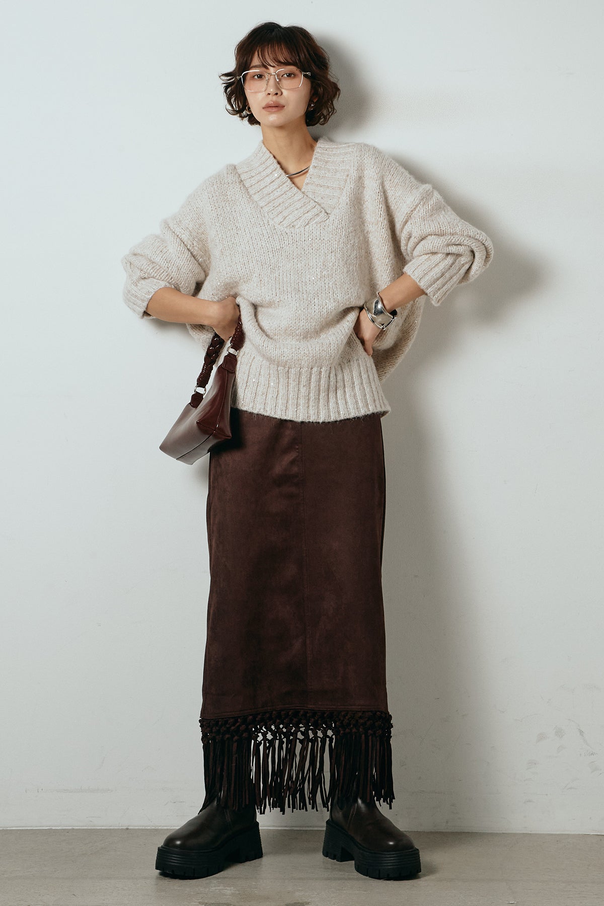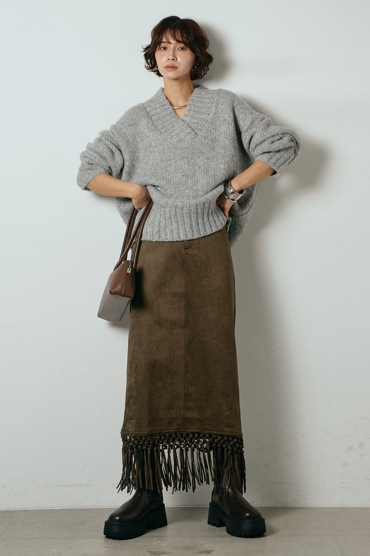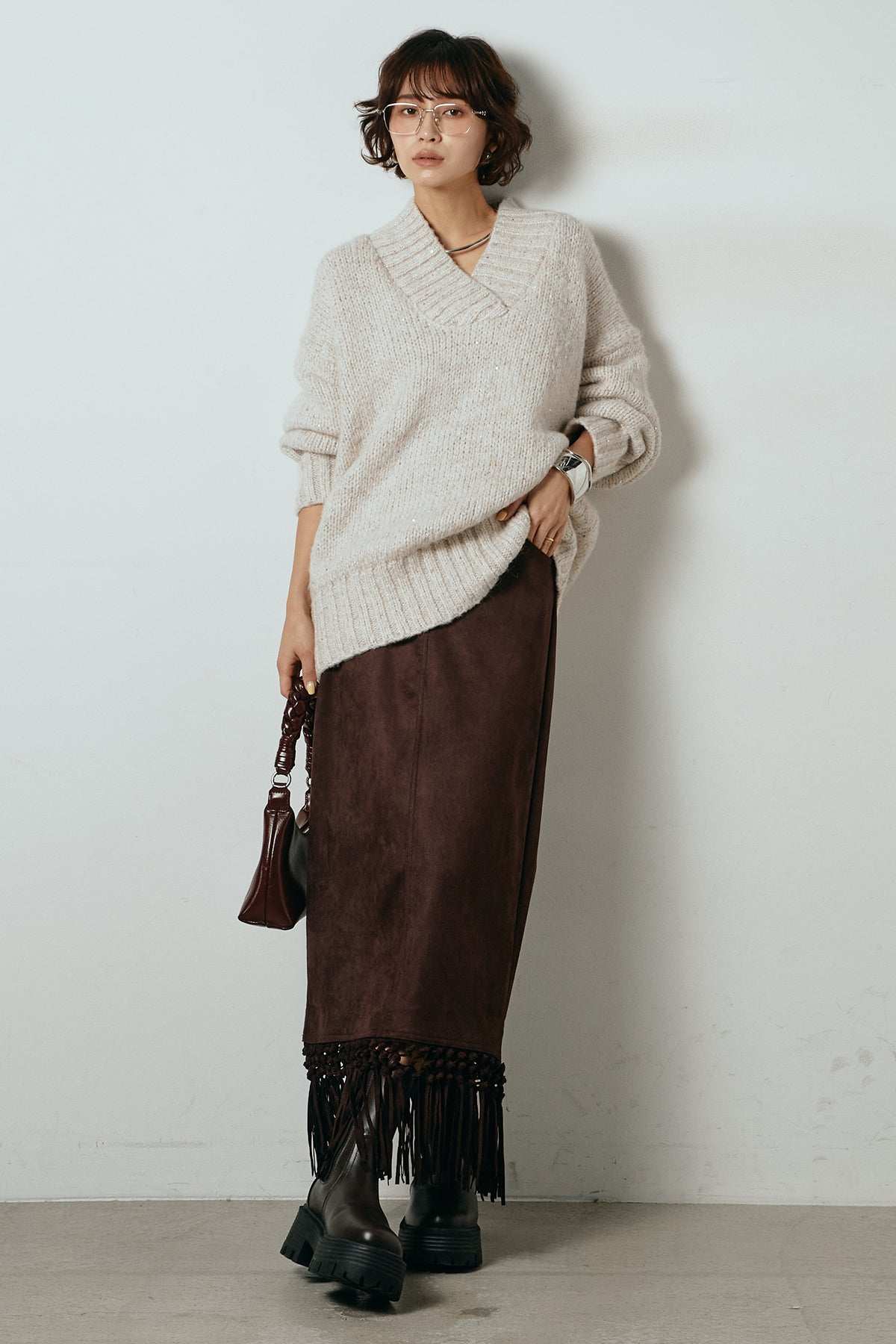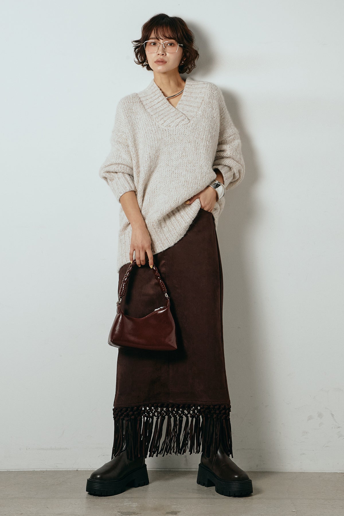 [SET]Vネックラメニットトップス+スウェードライク裾フリンジスカート(2set)