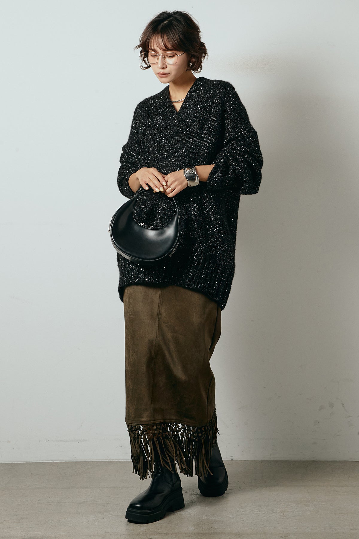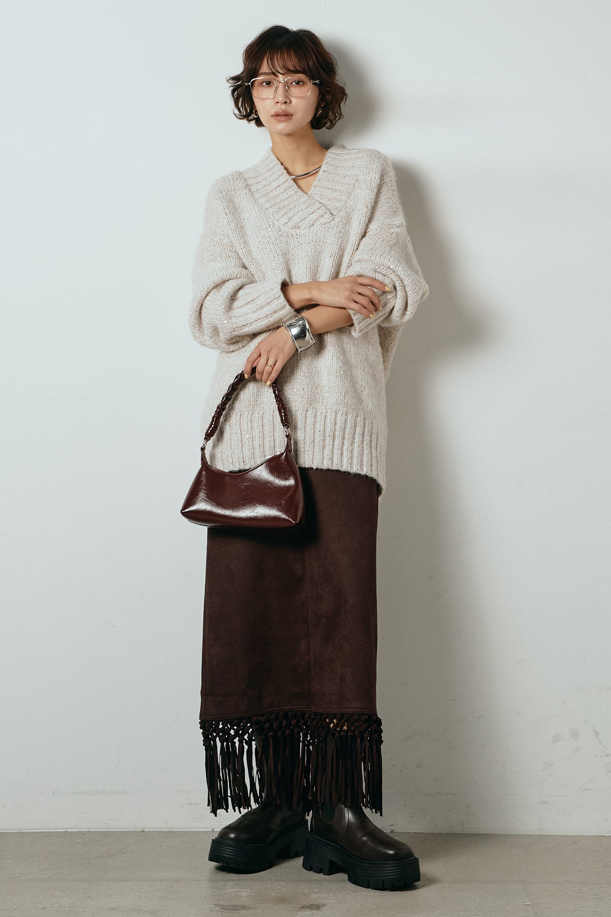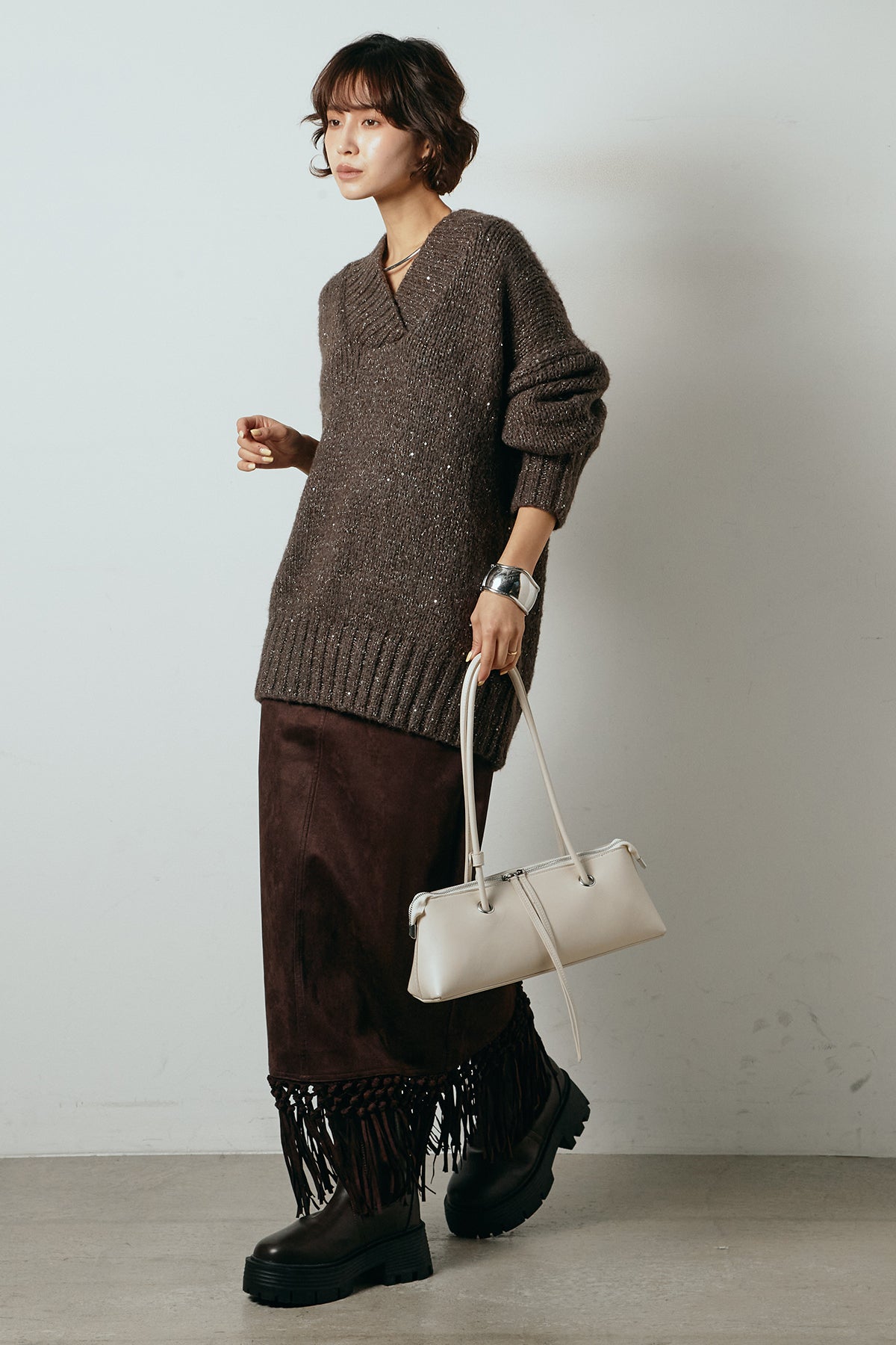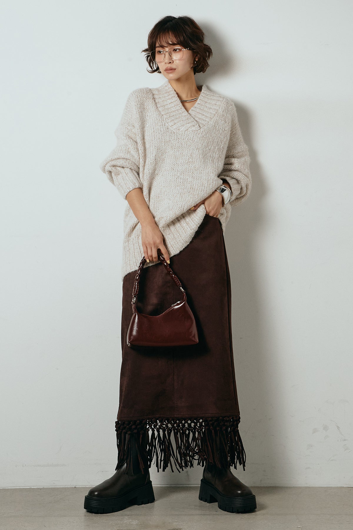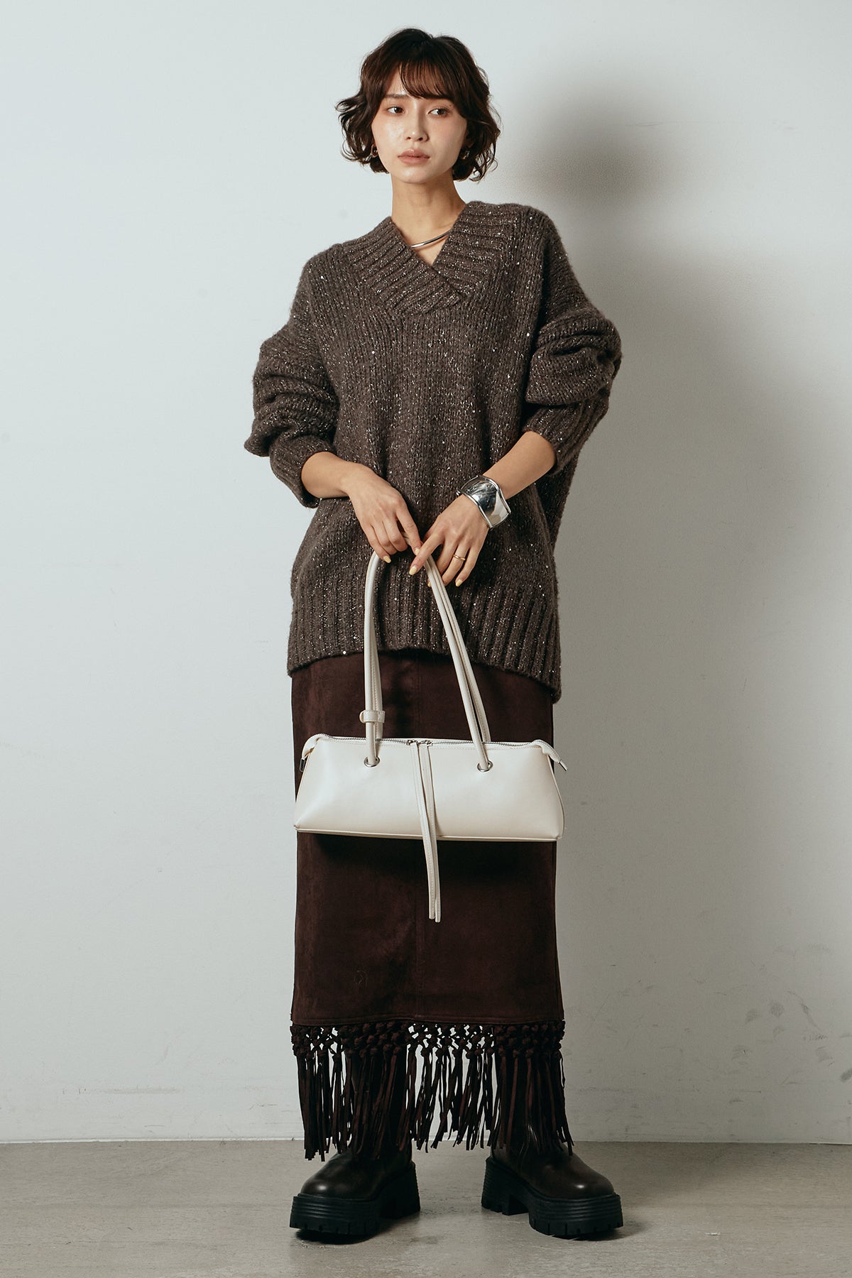 [SET]Vネックラメニットトップス+スウェードライク裾フリンジスカート(2set)