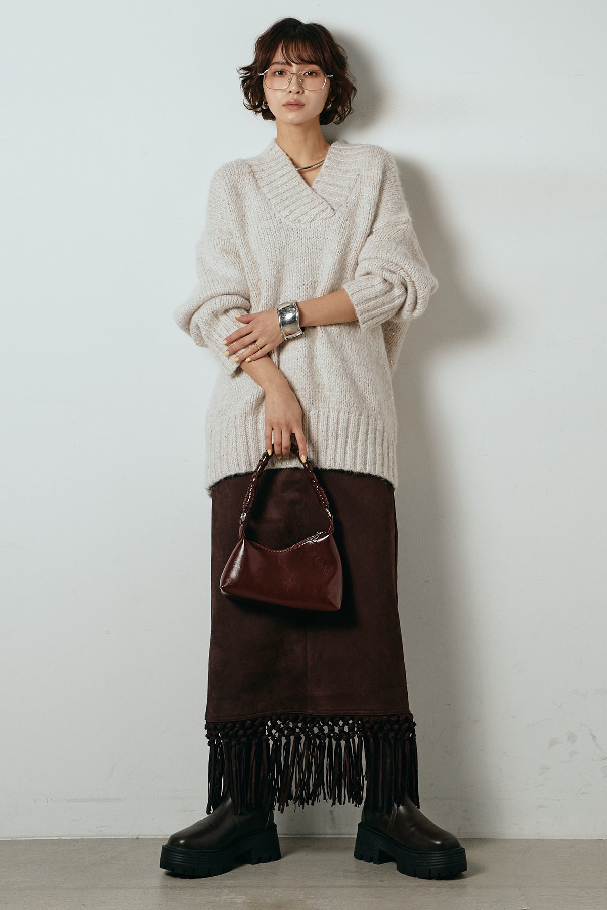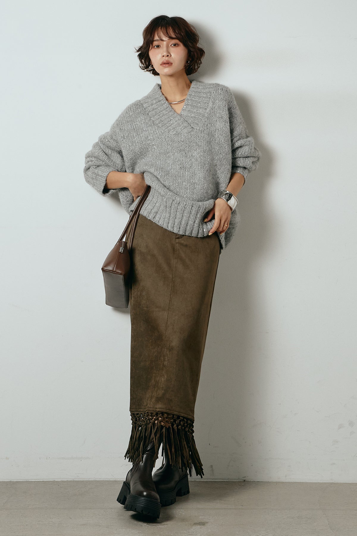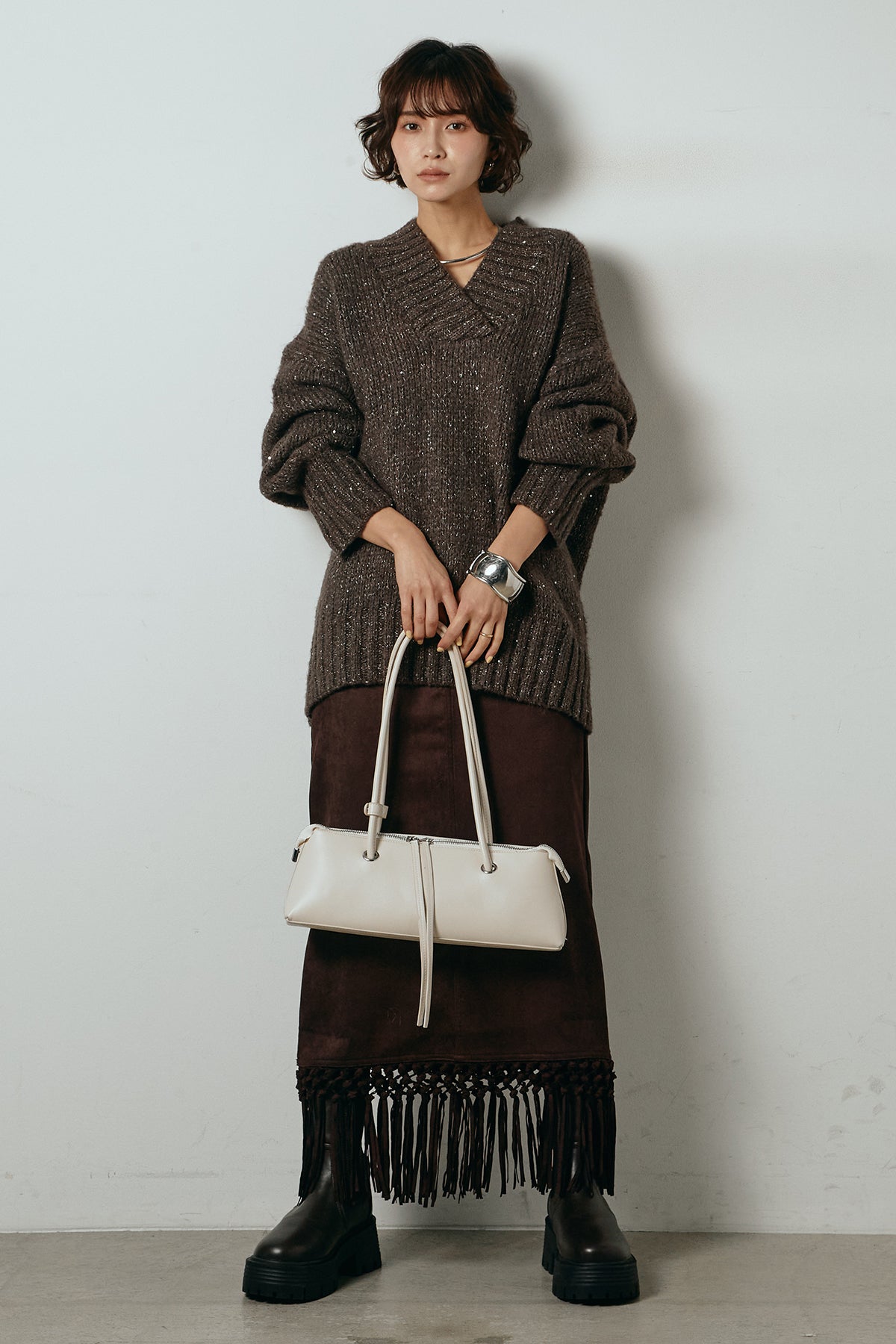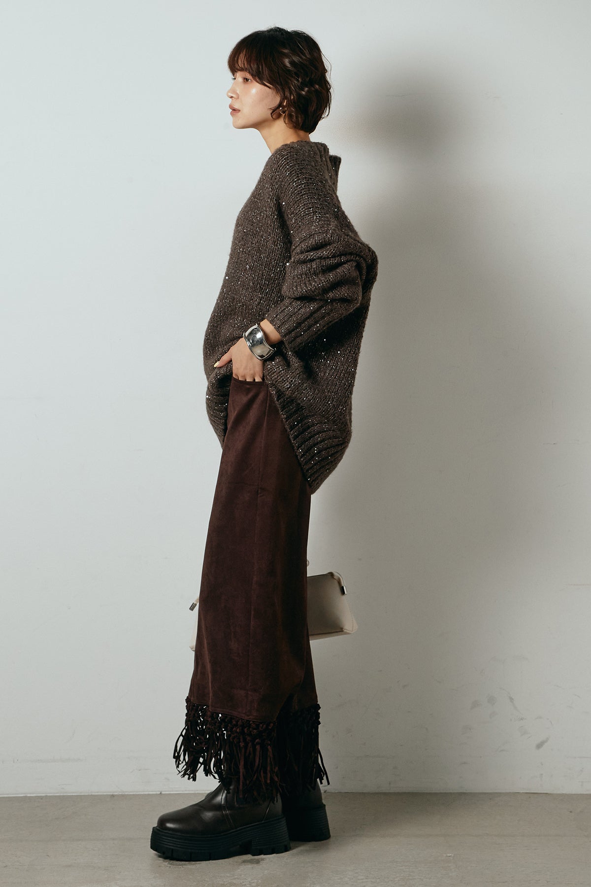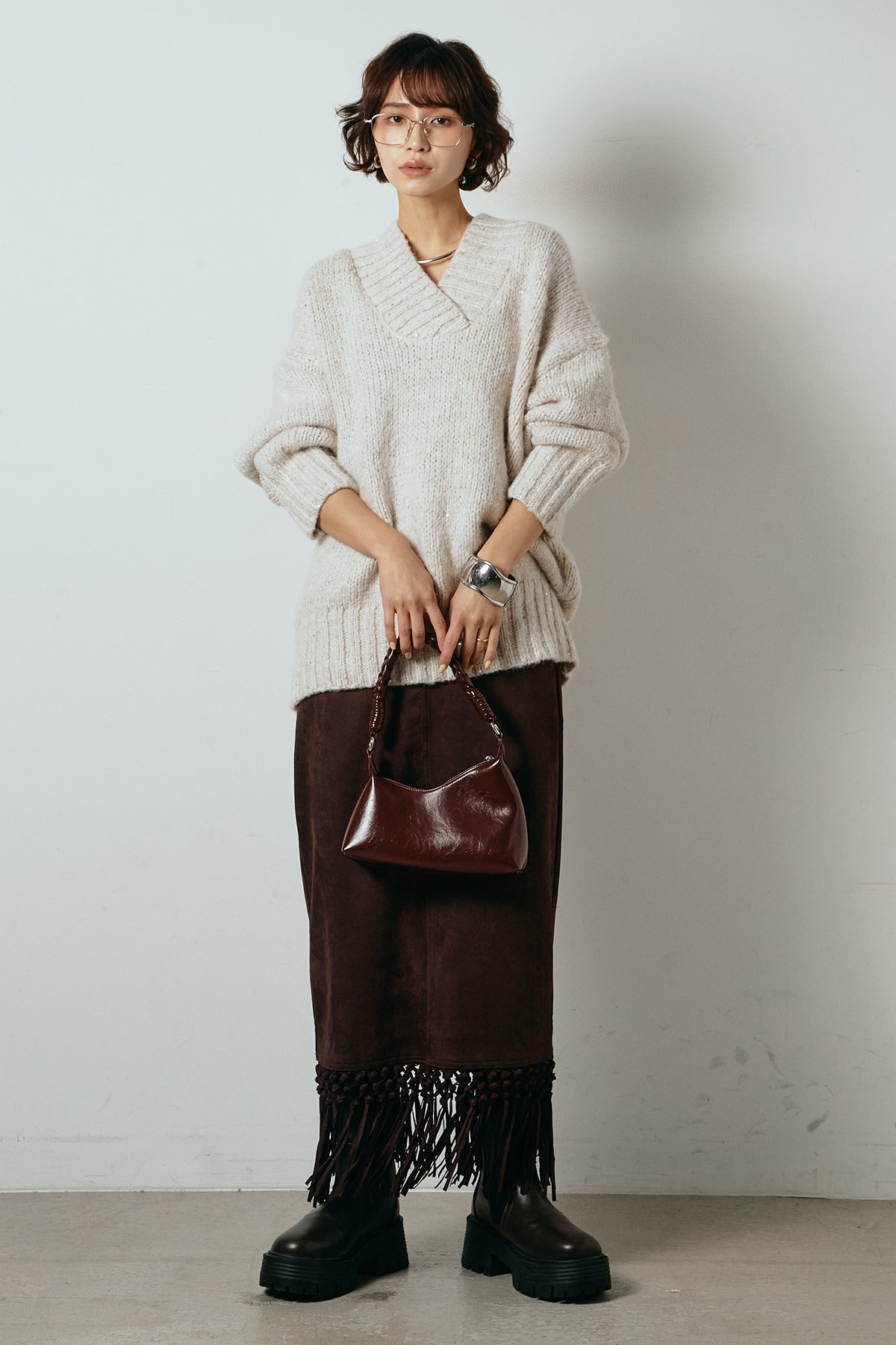 [SET]Vネックラメニットトップス+スウェードライク裾フリンジスカート(2set)