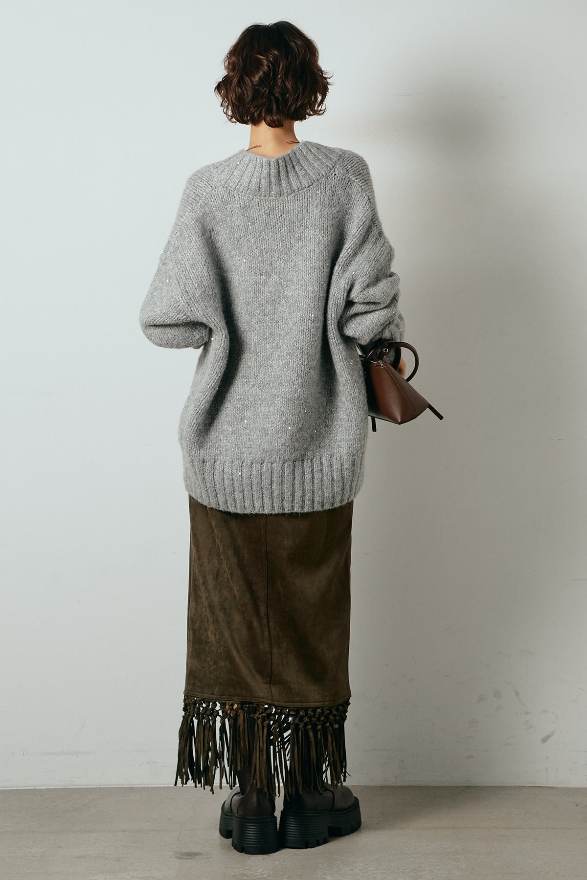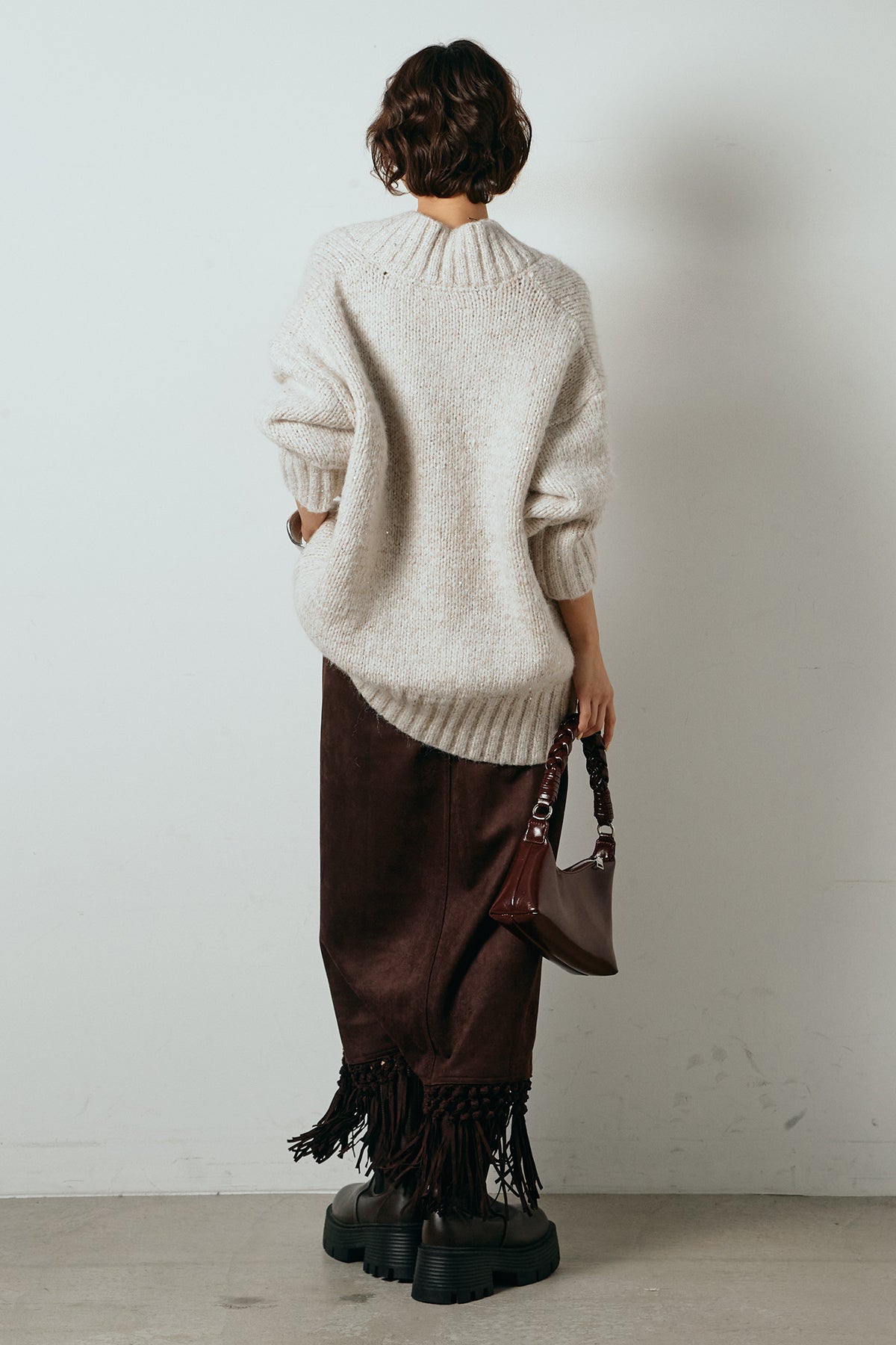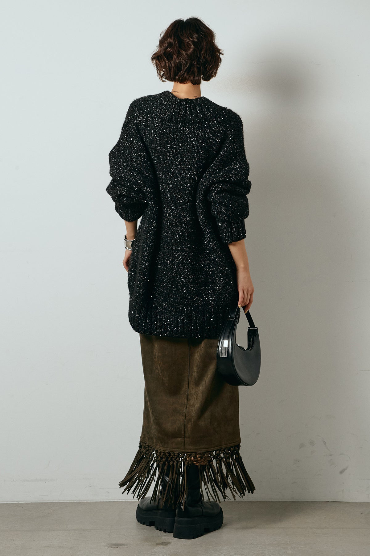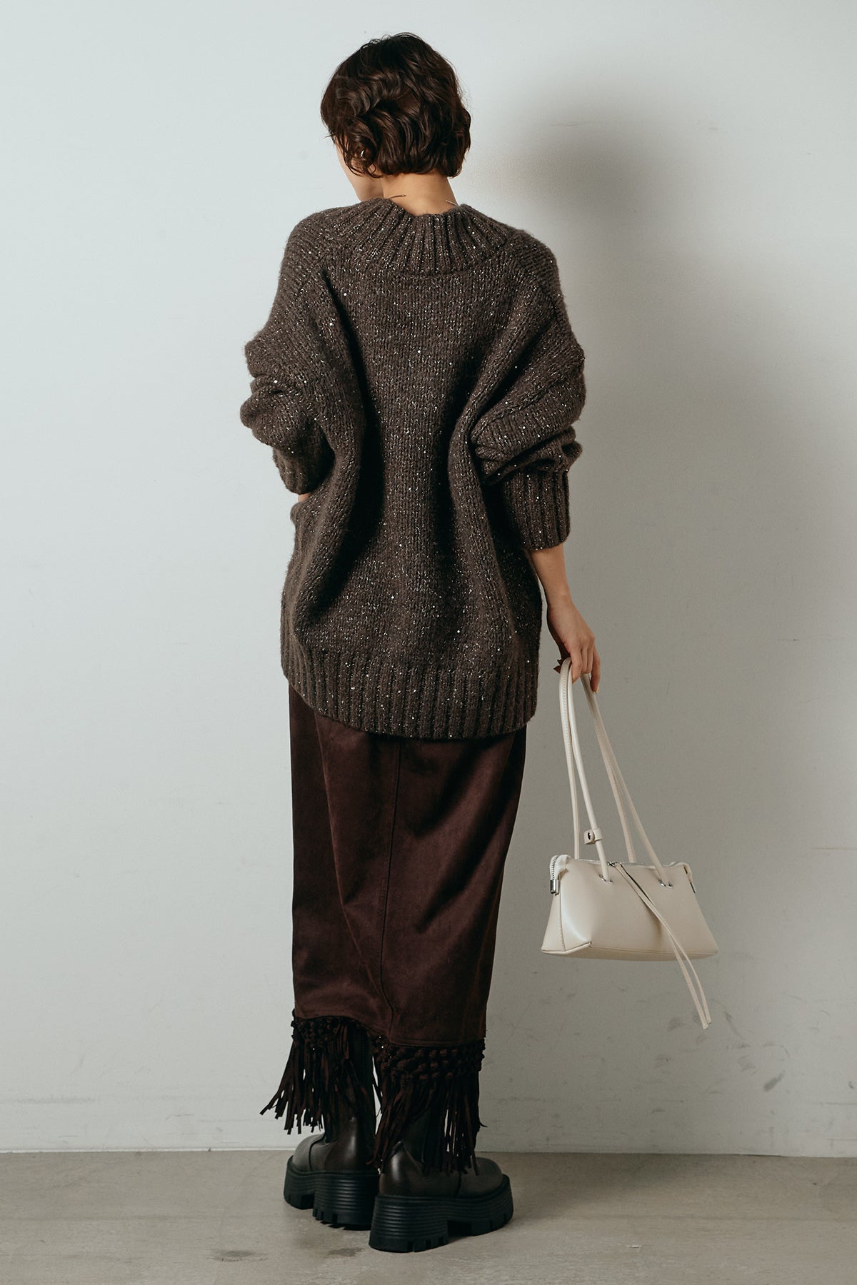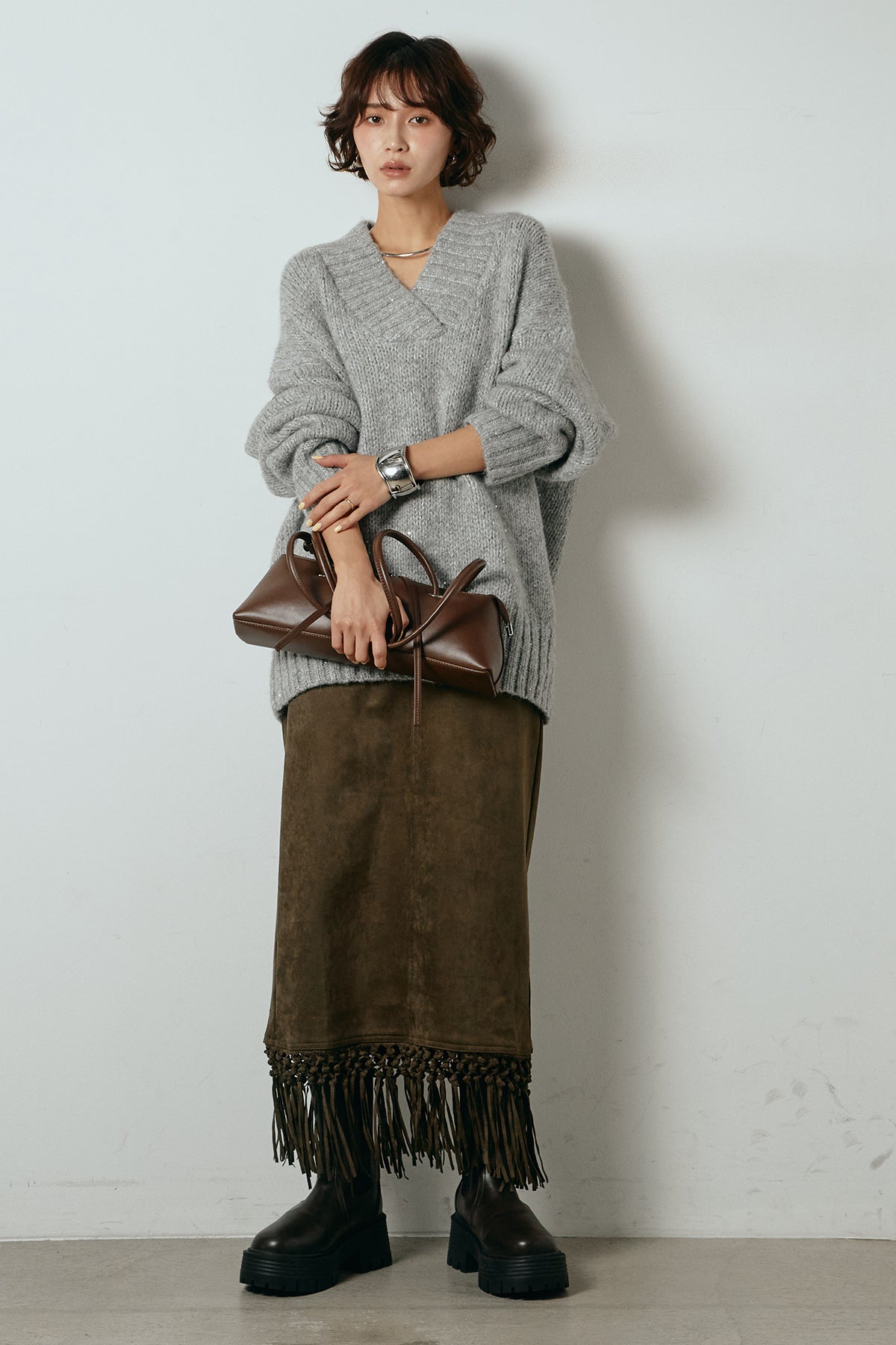[SET]Vネックラメニットトップス+スウェードライク裾フリンジスカート(2set)