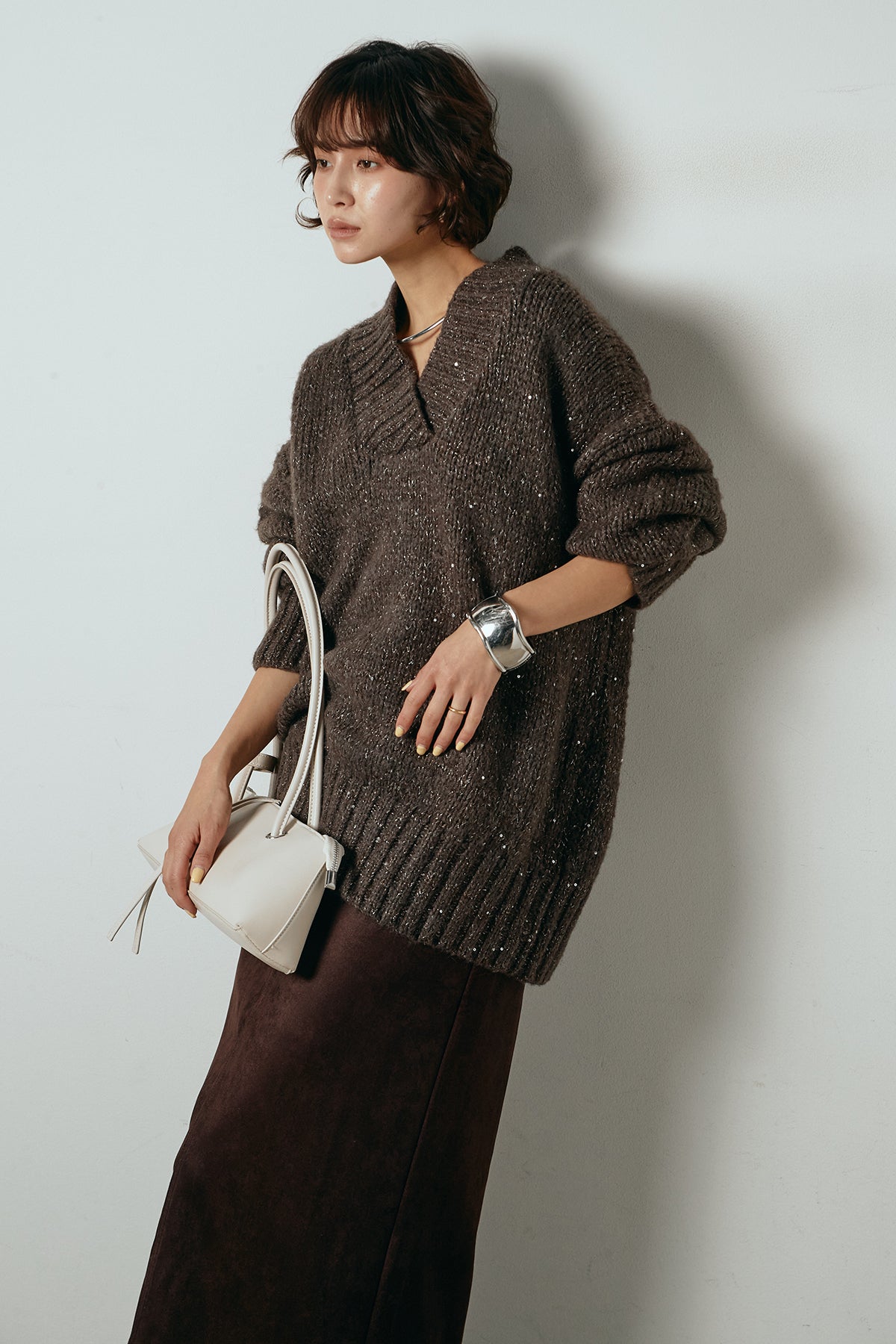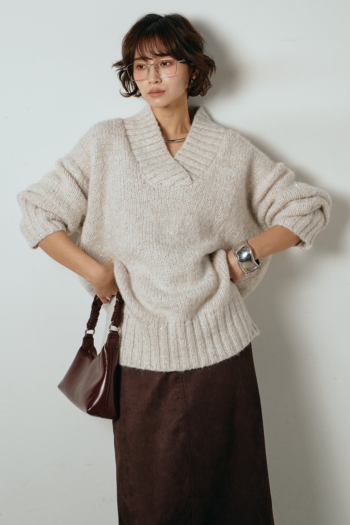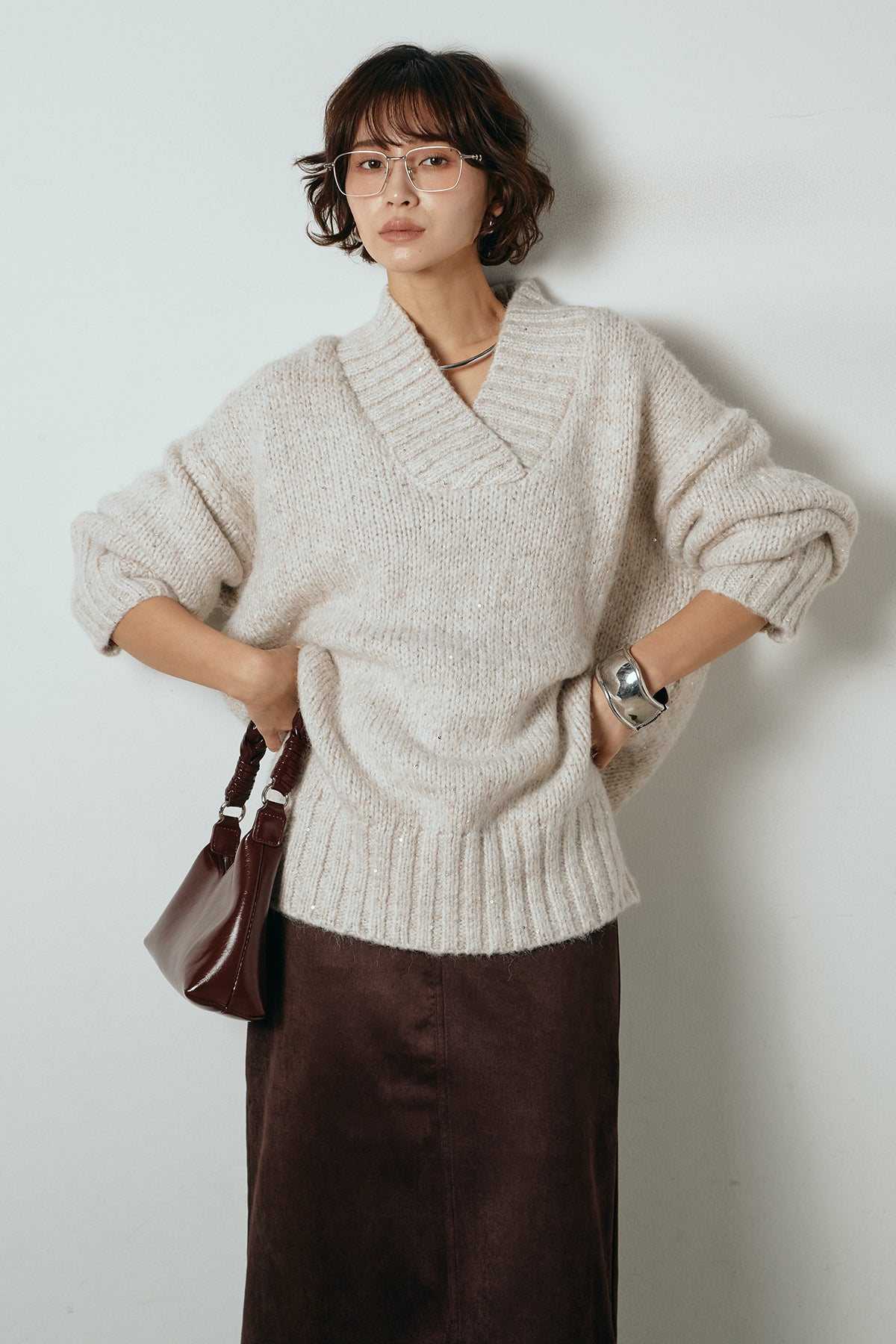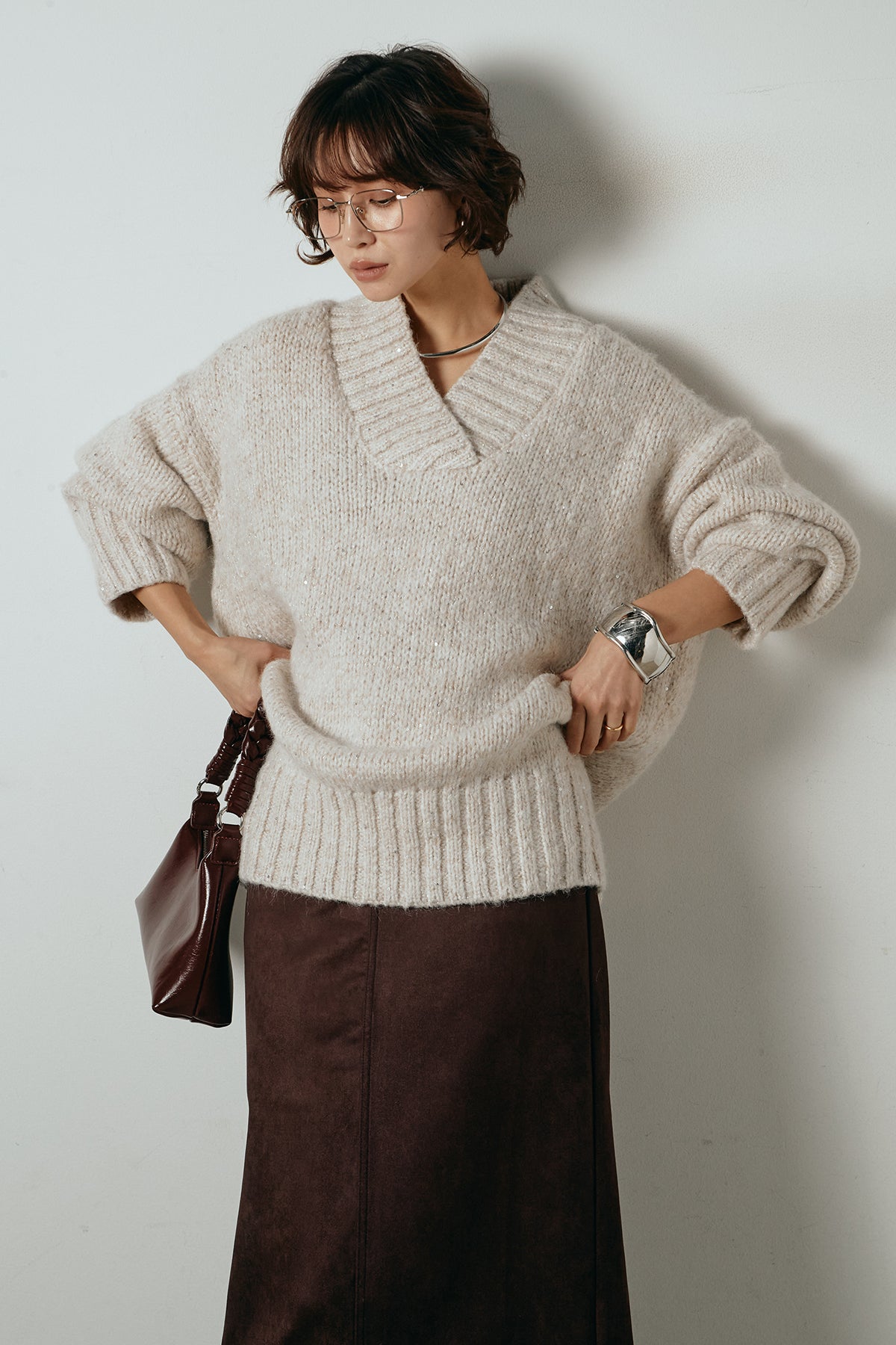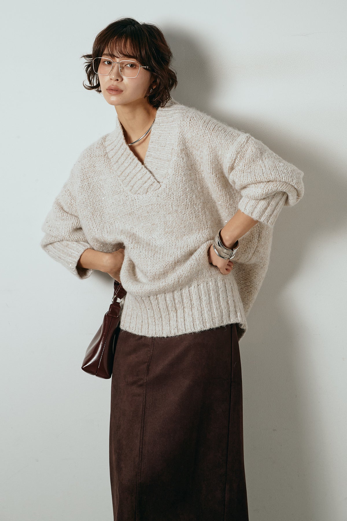 ラメ糸をさりげなく織り込んだ、上品な輝きが魅力のVネックニットトップス。程よくゆとりのあるシルエットと、広めに開いたVネックが顔まわりをすっきりと見せてくれます。リブ編みを効かせたネックラインと袖口が全体を引き締め、ラフになりすぎないバランスに。パンツにもスカートにも合わせやすく、シンプルながら華やかさを添える一枚です。