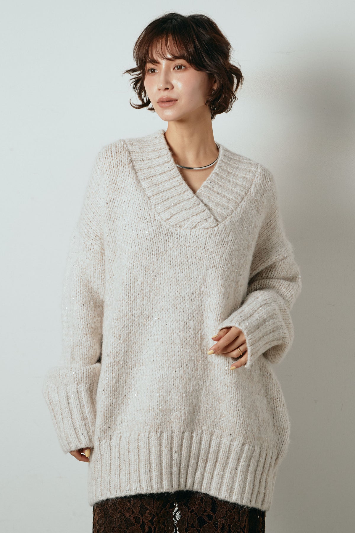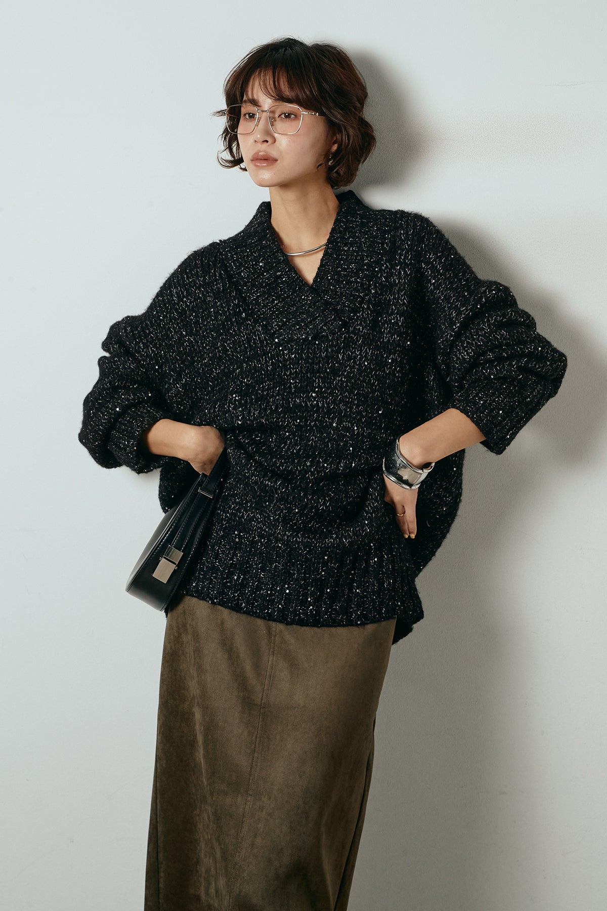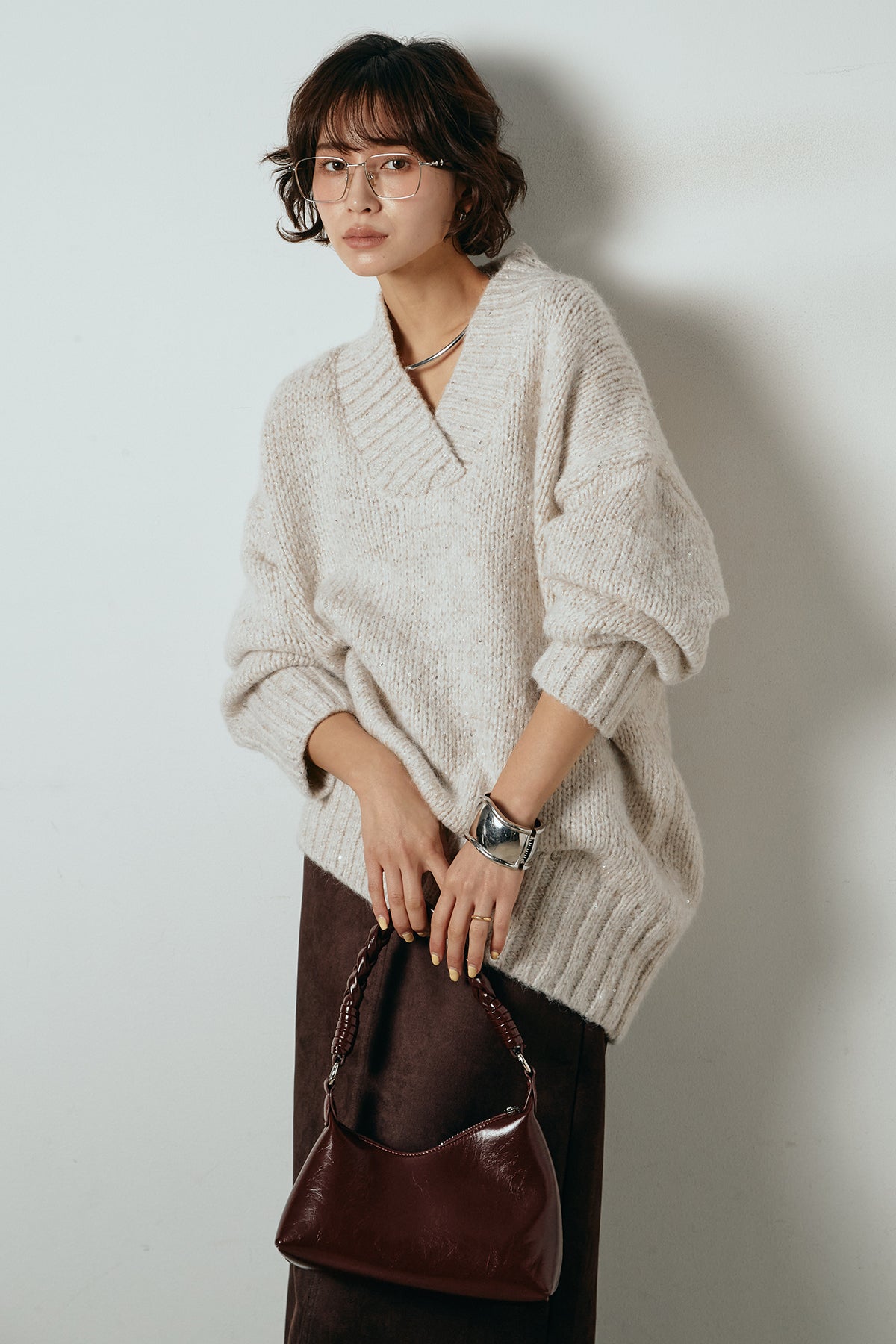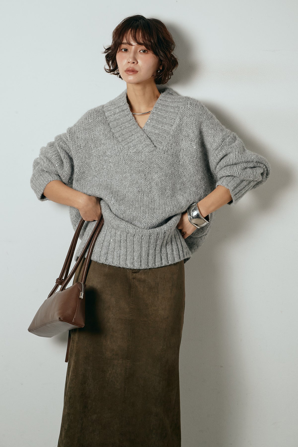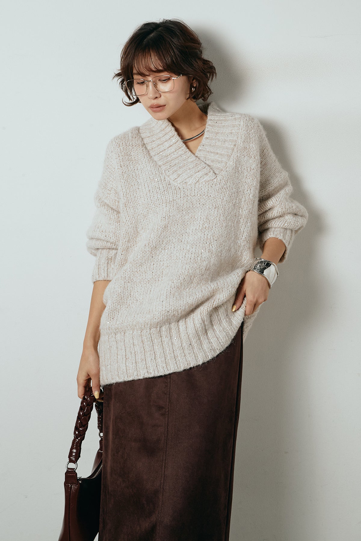 ラメ糸をさりげなく織り込んだ、上品な輝きが魅力のVネックニットトップス。程よくゆとりのあるシルエットと、広めに開いたVネックが顔まわりをすっきりと見せてくれます。リブ編みを効かせたネックラインと袖口が全体を引き締め、ラフになりすぎないバランスに。パンツにもスカートにも合わせやすく、シンプルながら華やかさを添える一枚です。